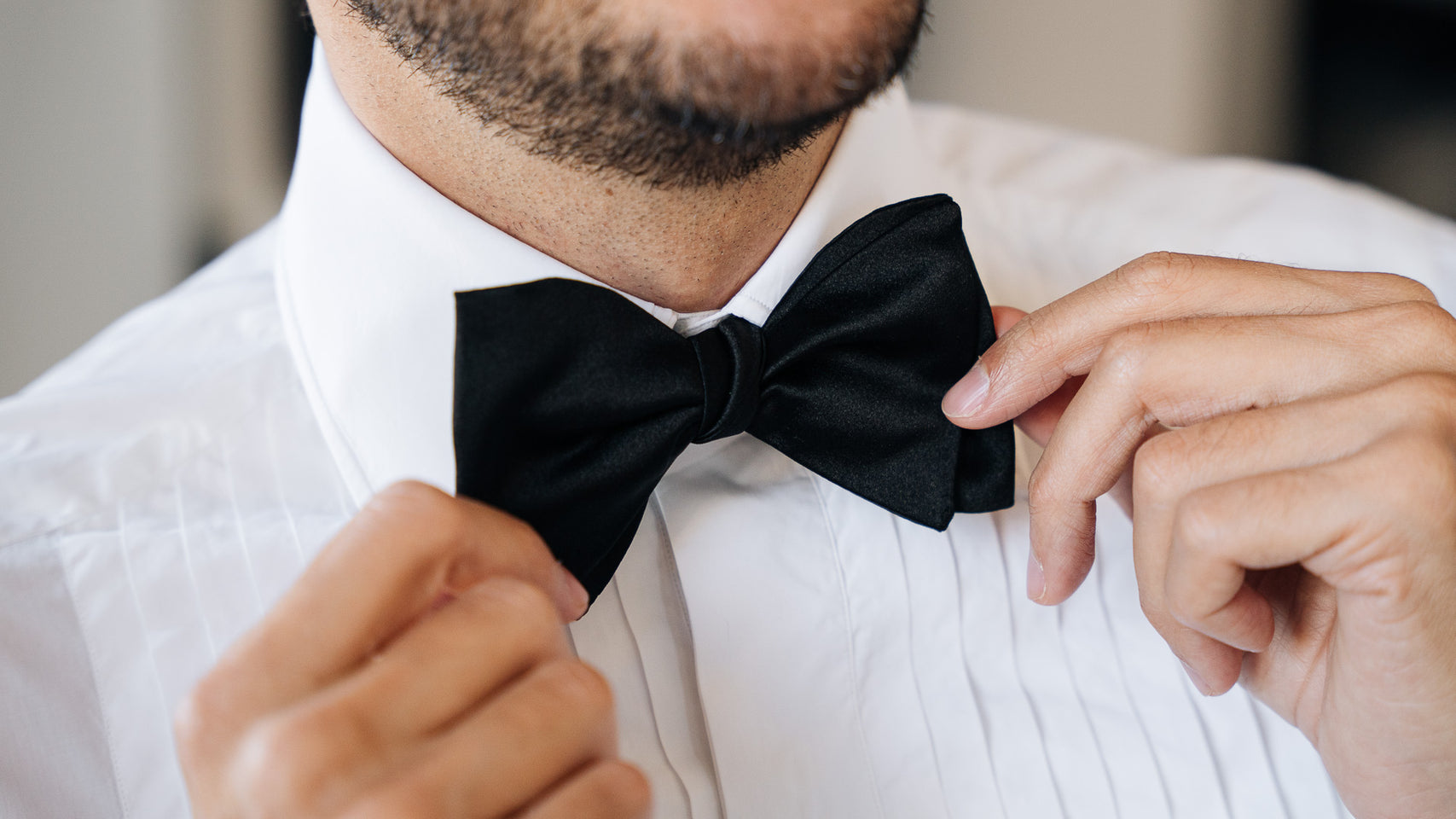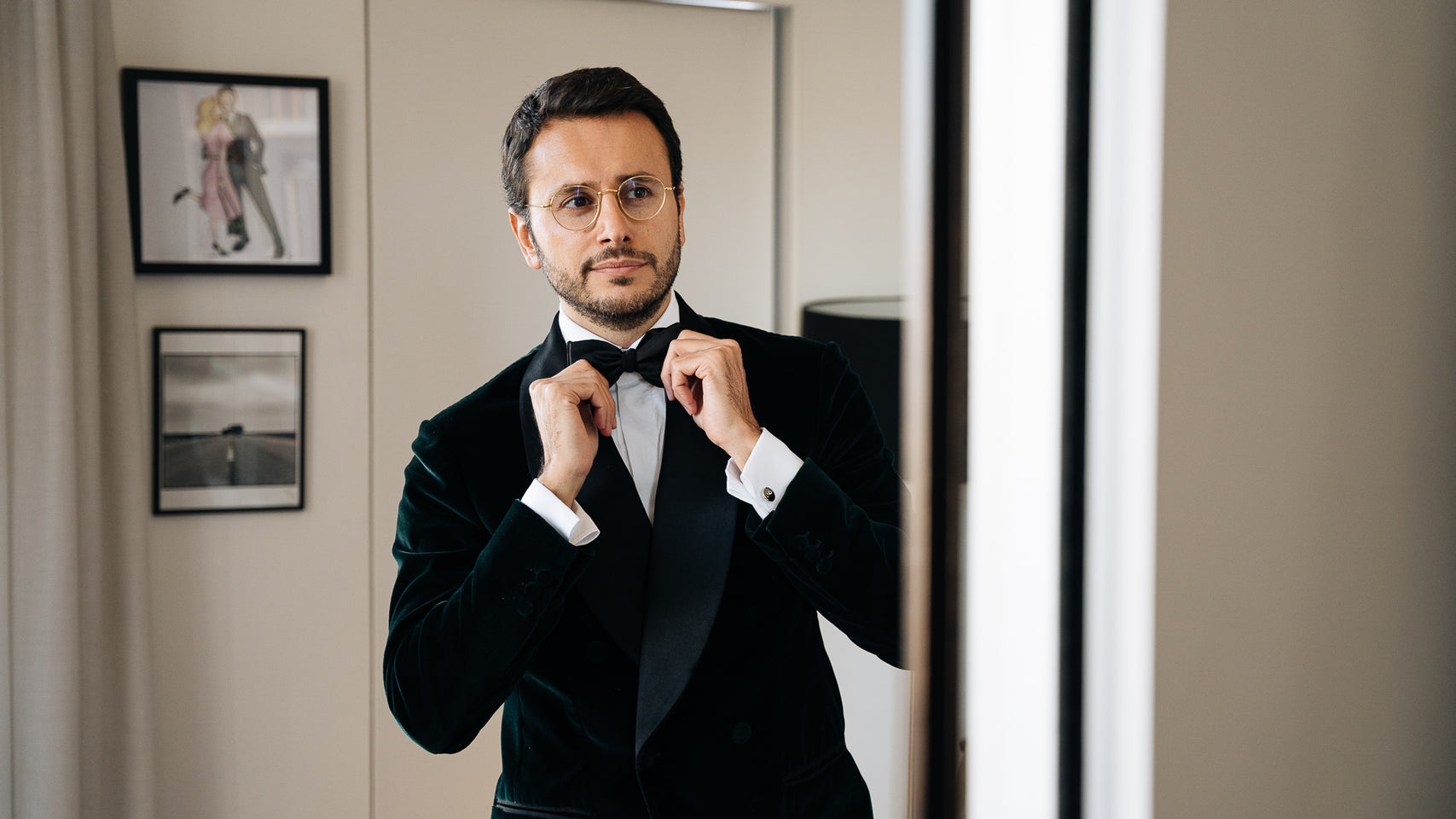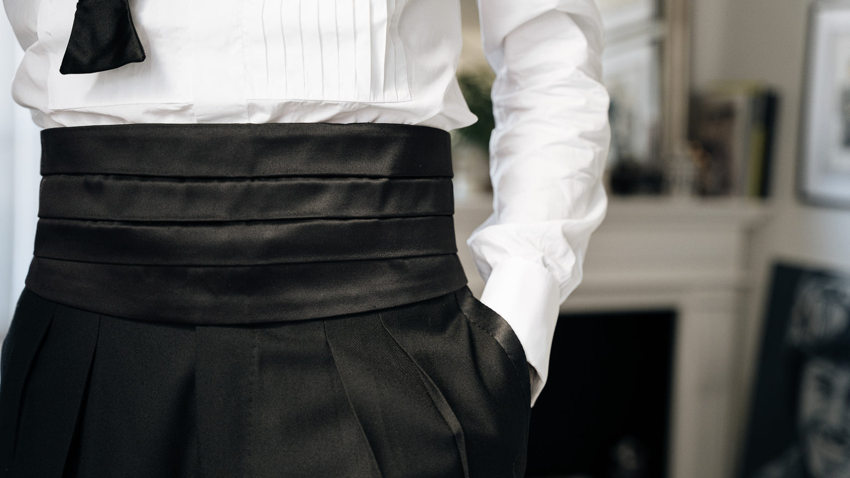 The accessory set, designed together with Fabio Attanasio, to complete a men’s classic dinner jacket. The bow tie and cummerbund are made in pure silk, perfect to wear with a jacket and pair of trousers to a formal event.