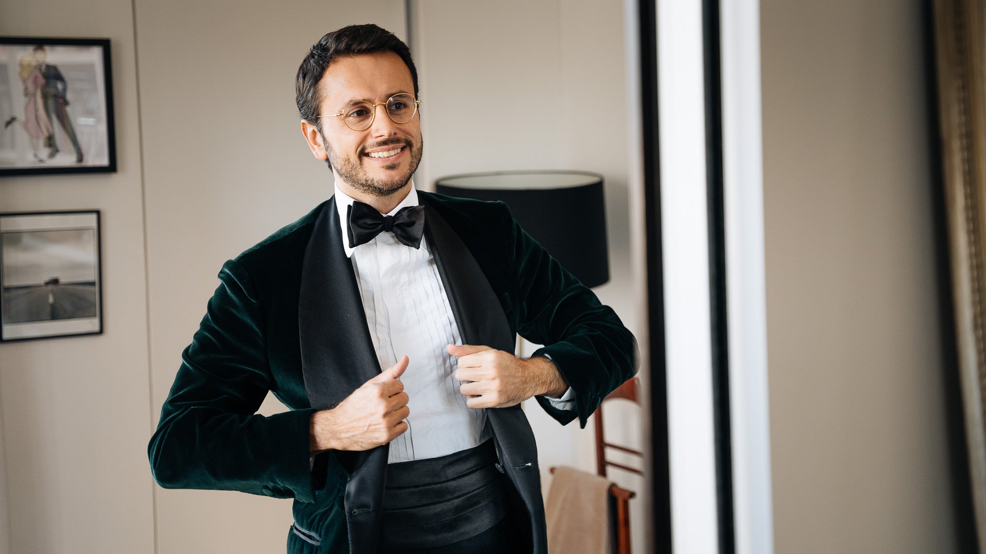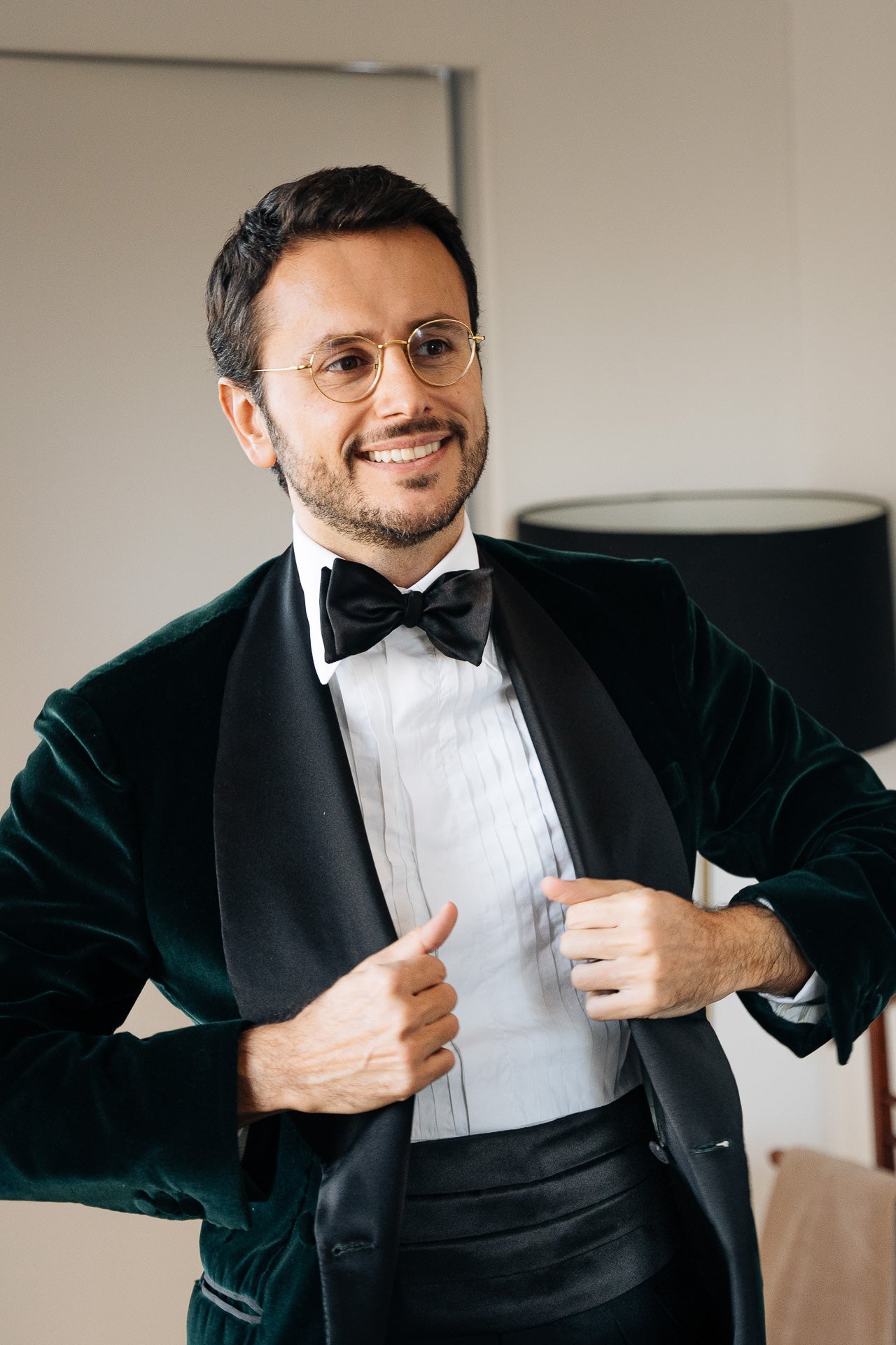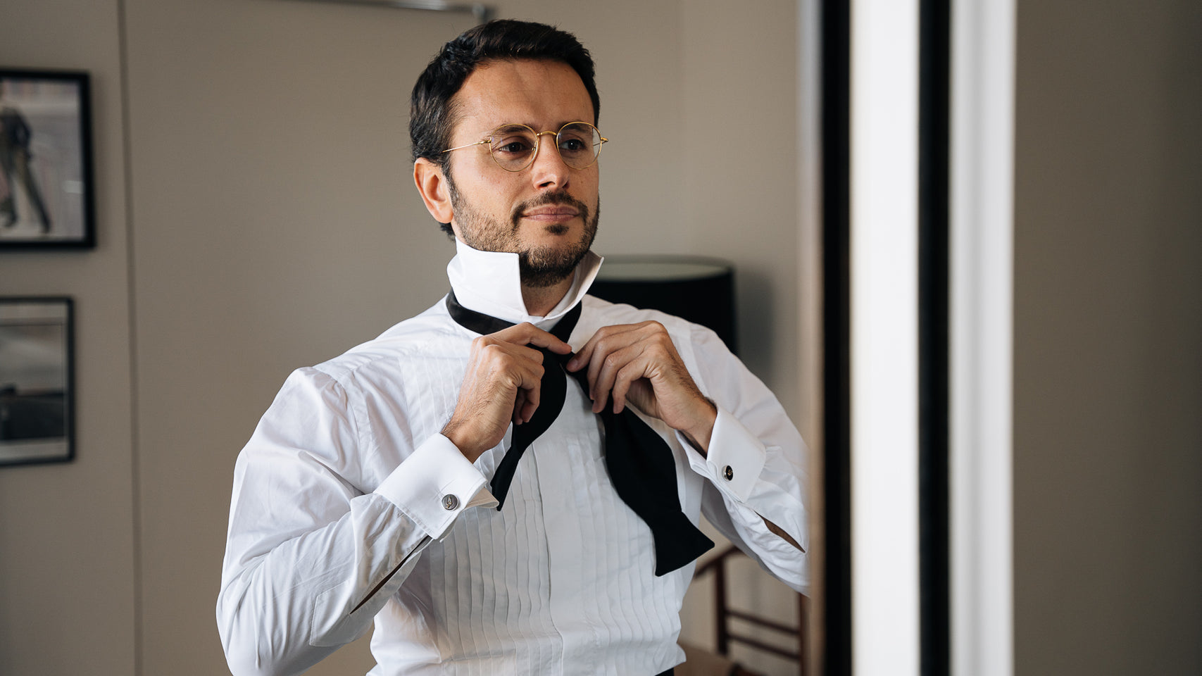 The accessory set, designed together with Fabio Attanasio, to complete a men’s classic dinner jacket. The bow tie and cummerbund are made in pure silk, perfect to wear with a jacket and pair of trousers to a formal event.