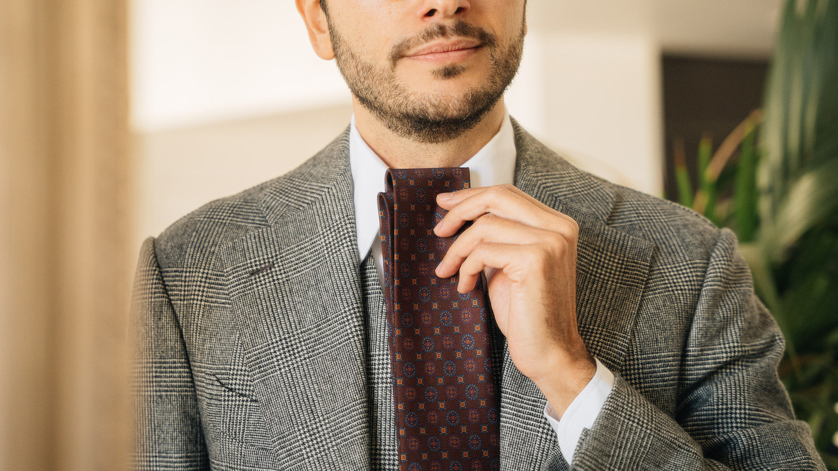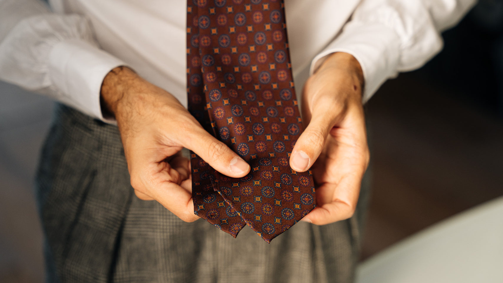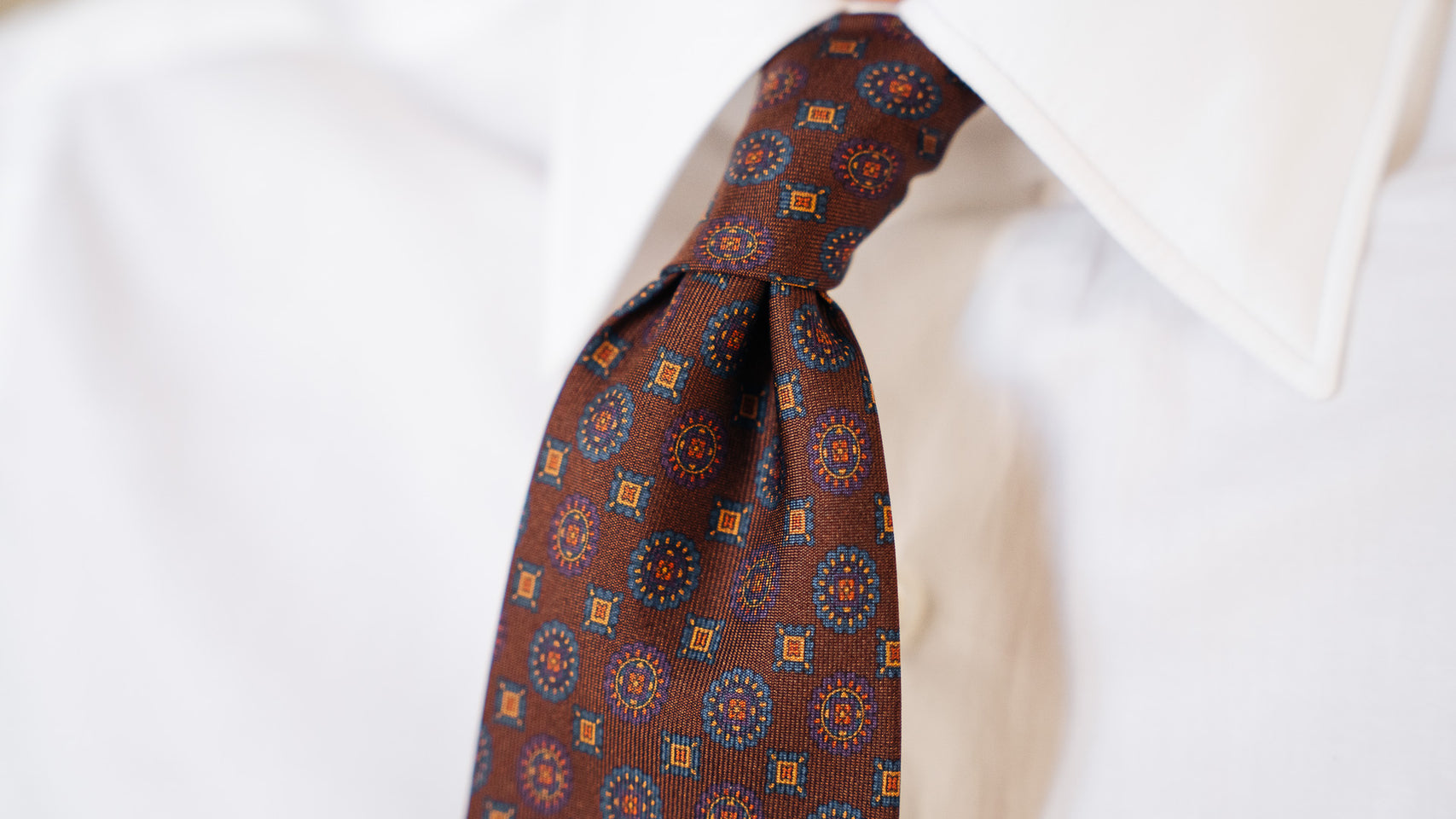 A silk tie printed with an all-over macro circle pattern on a brown background, crafted according to tradition. The white yarns are first worked on classic looms and then the printing process is carried out on the fabric.
