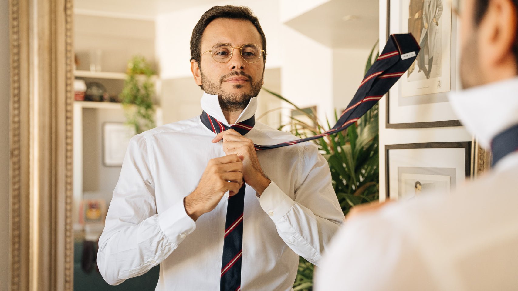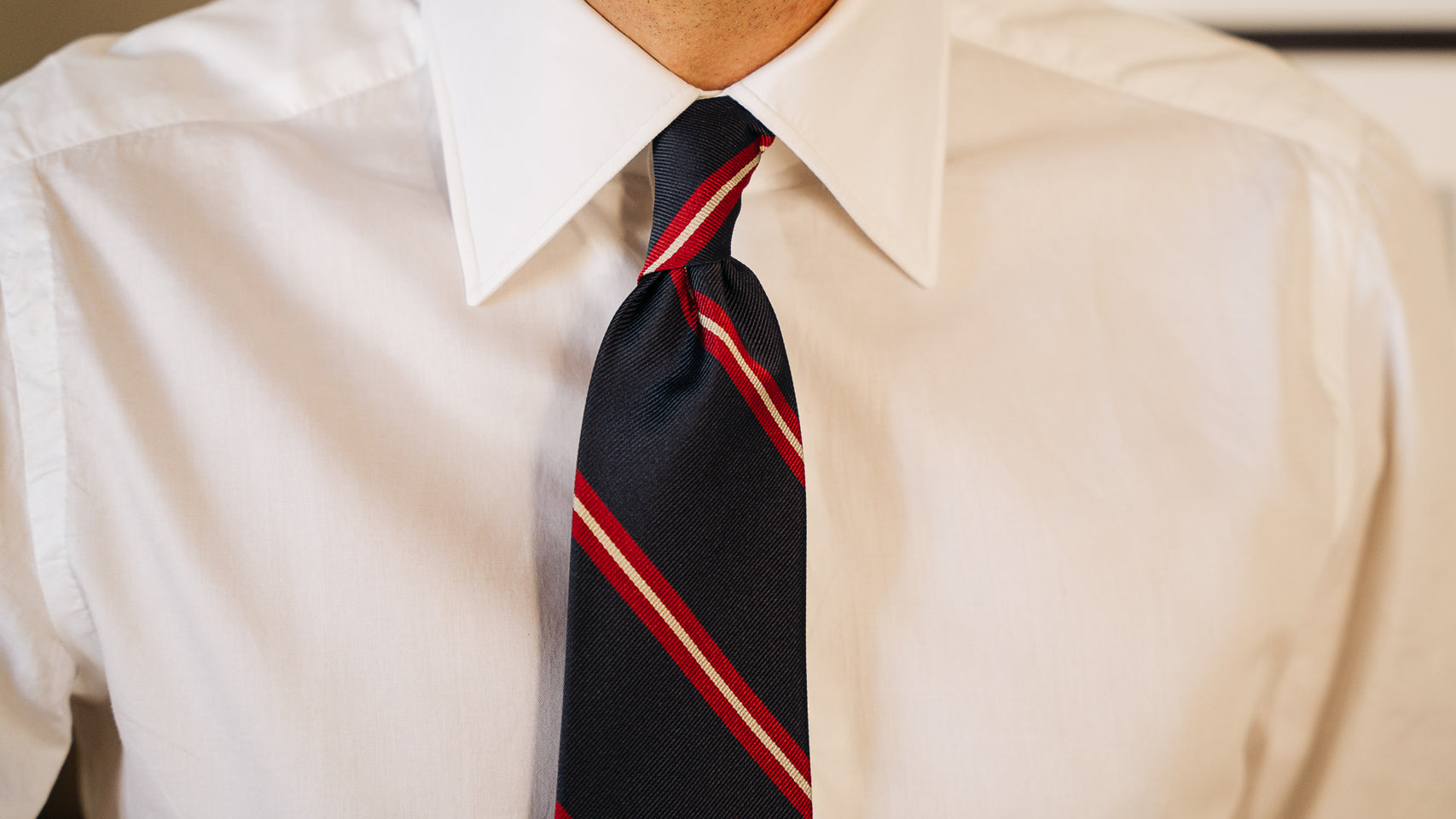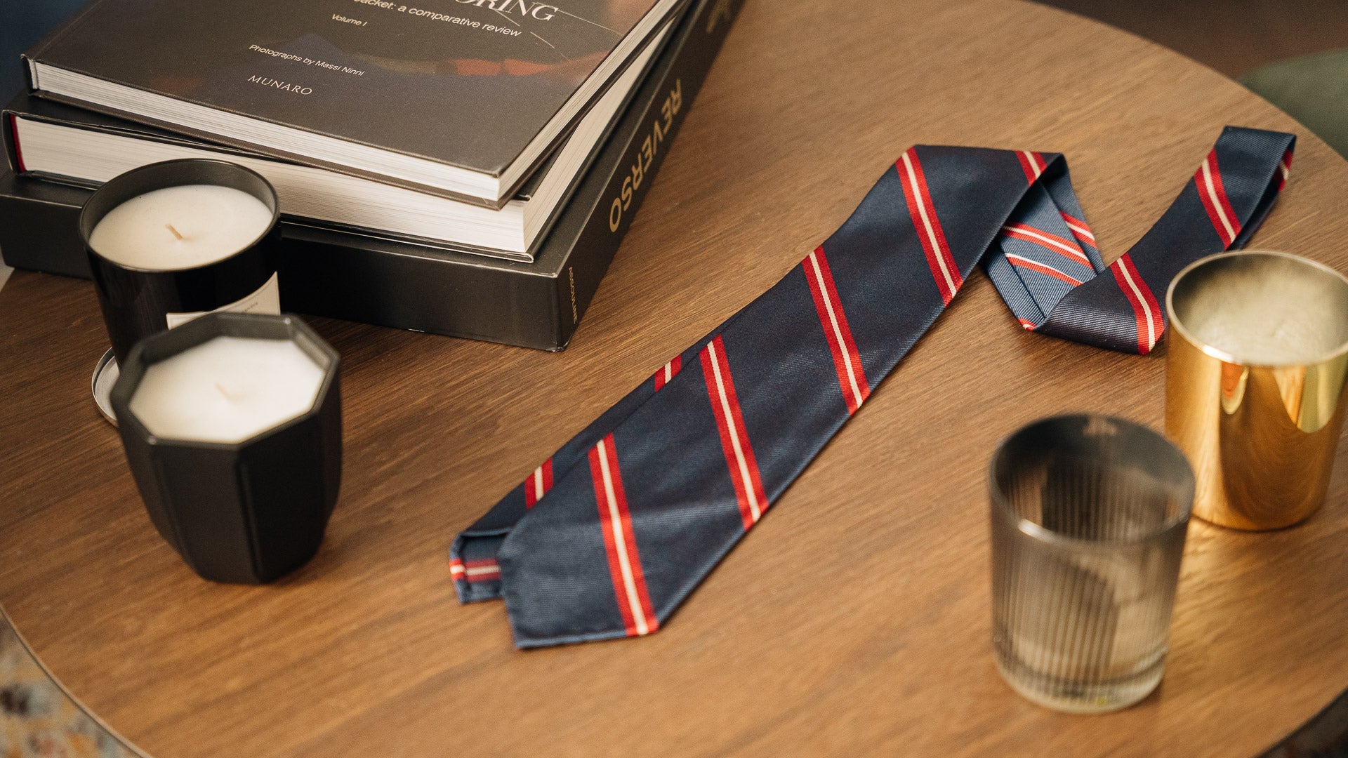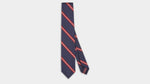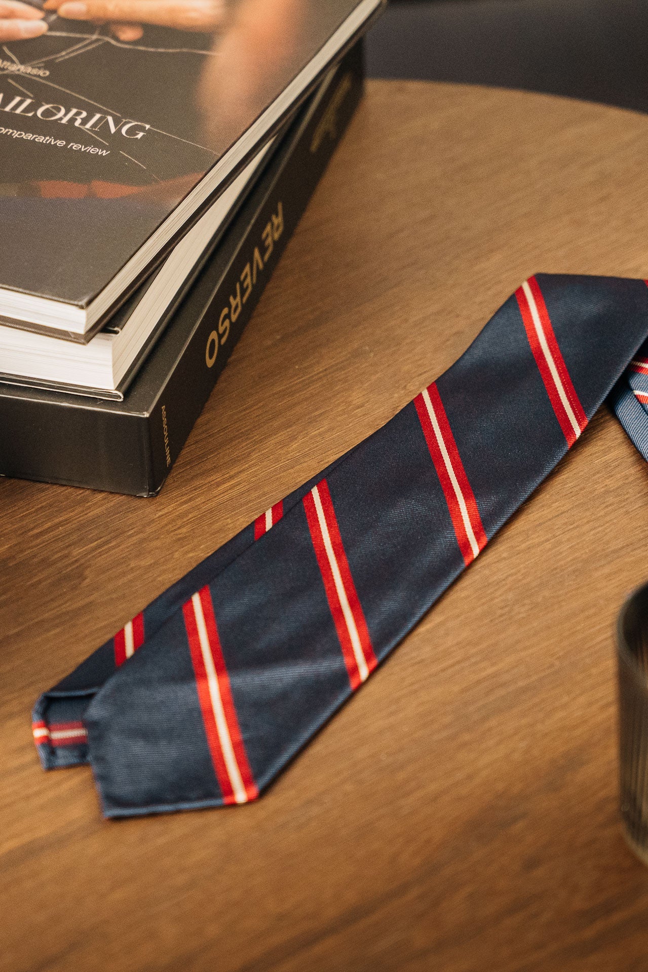 Unlined regimental tie, unlined and in jacquard silk, with red stripes on a blue background. The silk is processed exclusively in the area of Lake Como: the fabric is composed of tightly twisted yarns that are then woven on historical wooden looms, dating back to the early twentieth century.