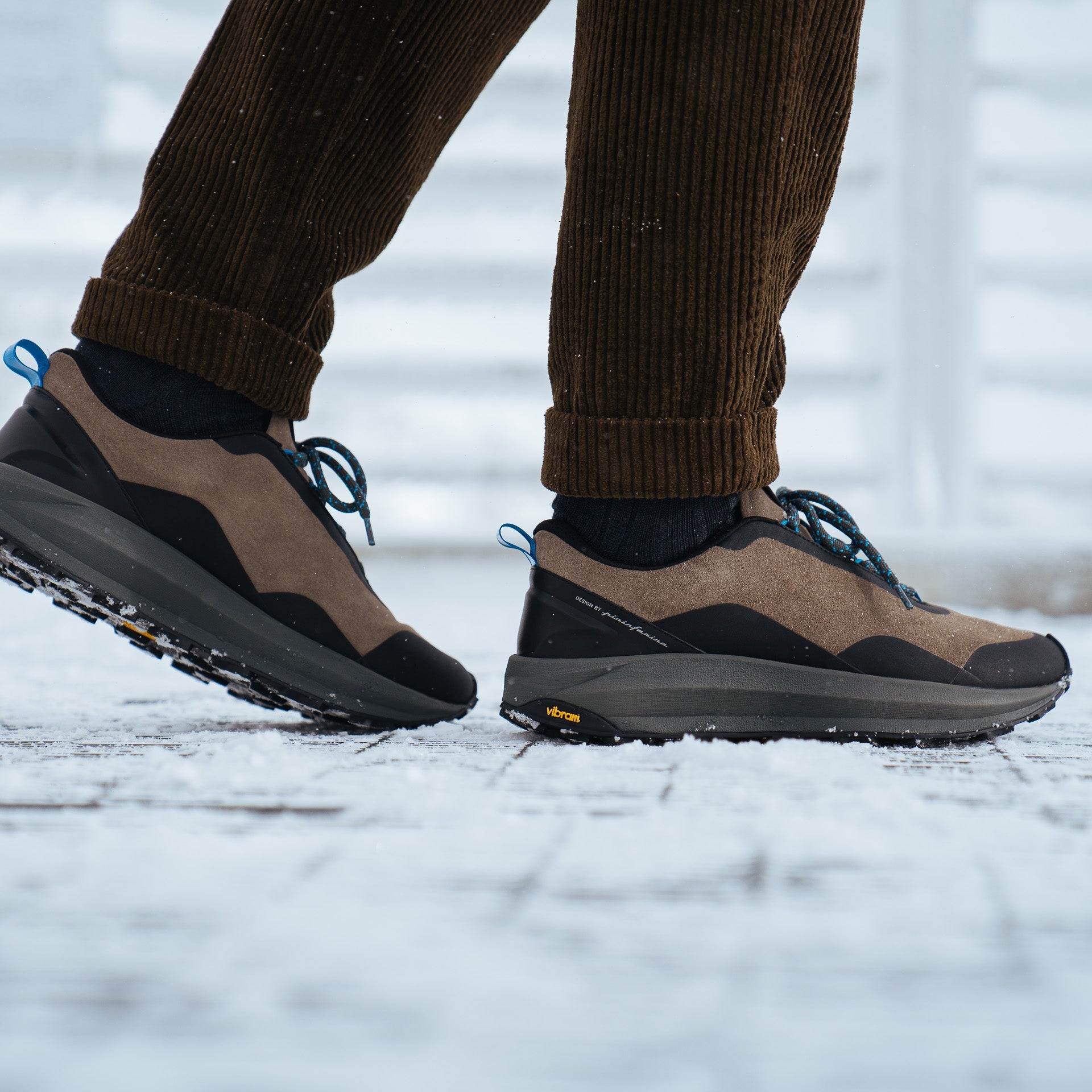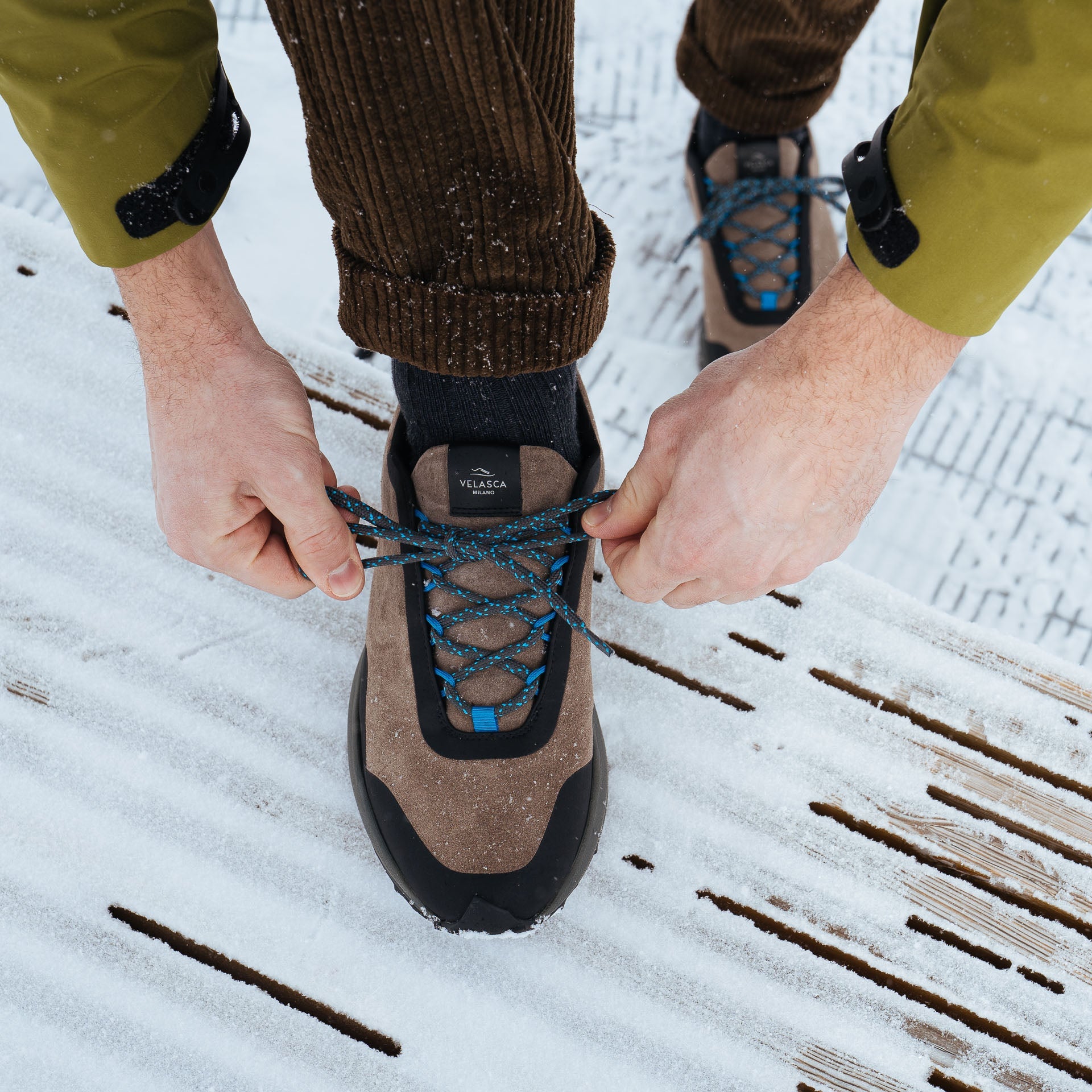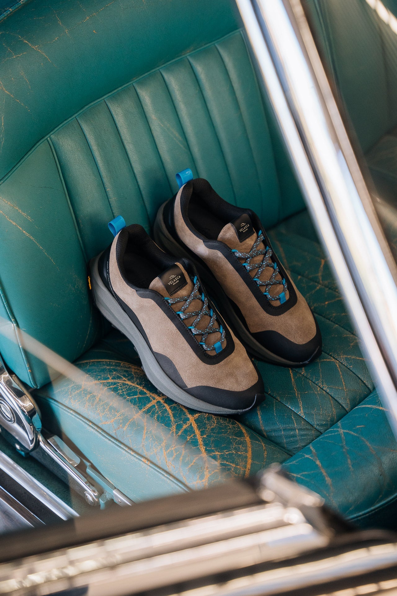 Our sneaker in beige suede leather and with Vibram Trail sole, designed with Pininfarina. The shoe is made of soft, handcrafted leather, but on the back and on the toe we have added stiffer parts to protect you from bumps; on the sides, the lines curve to resemble the shape of the mountains. The insole is removable.