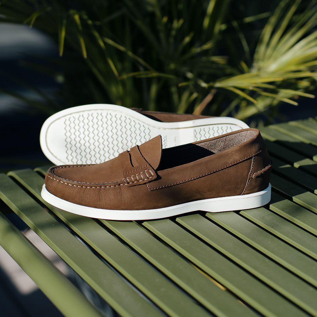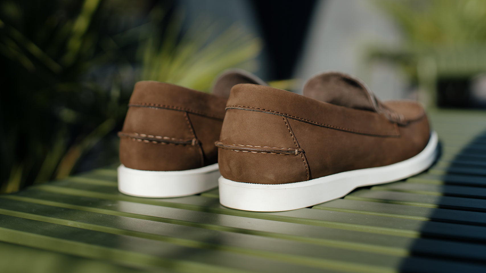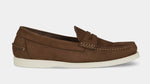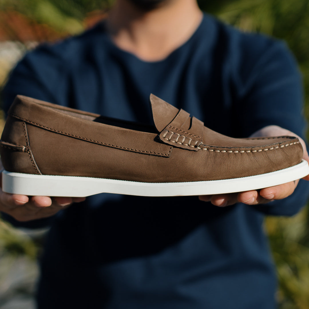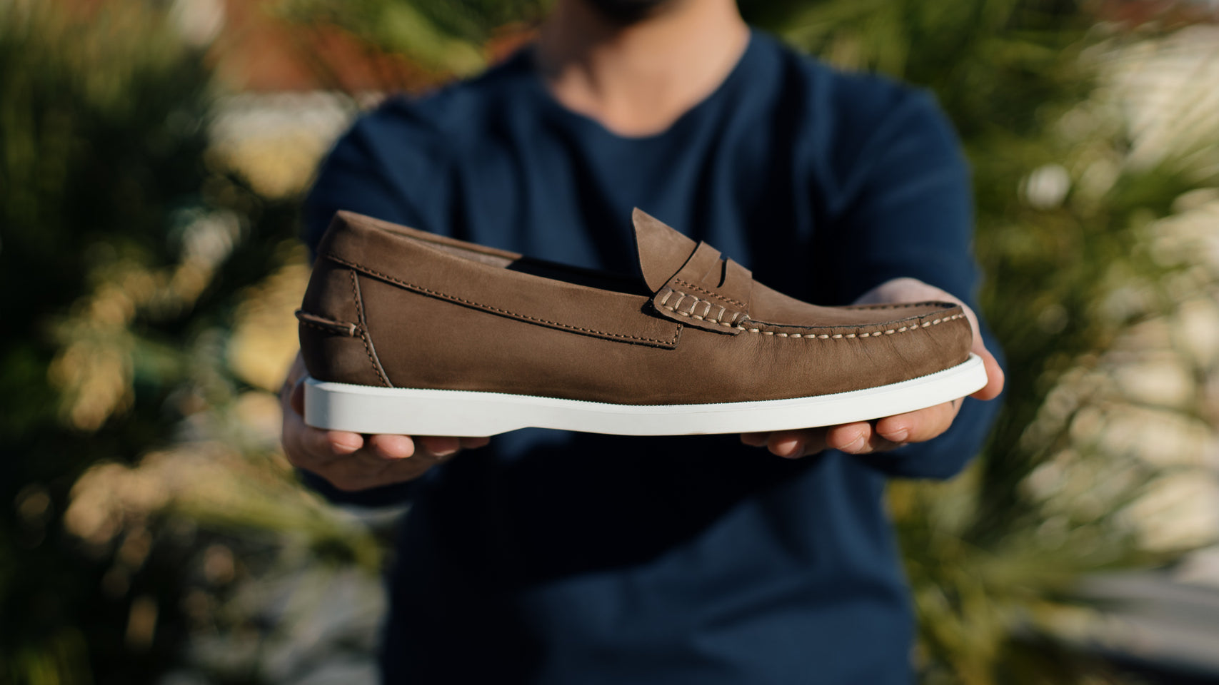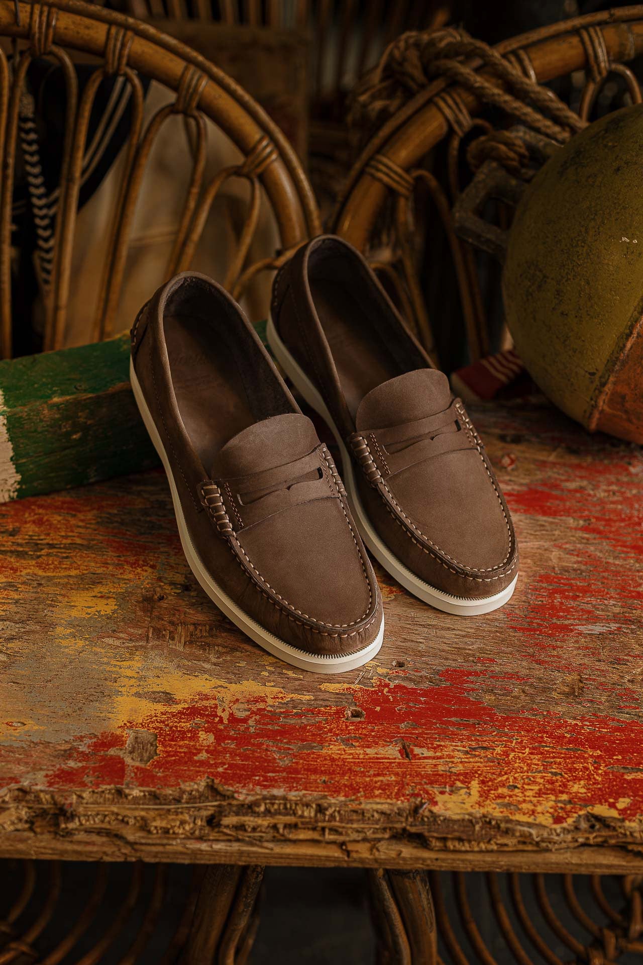The unlined boat shoes with mask, in nubuck calfskin. The white rubber sole, as per sailor tradition, gives a good grip to these shoes with a delicate pitch. They're dark brown: wear them with a cream-coloured cotton cardigan with blue piping, a white t-shirt and light blue jeans. Without socks, of course. In the cool walks at sunset, between the sea and the city, when you get lost chatting with your old friends.