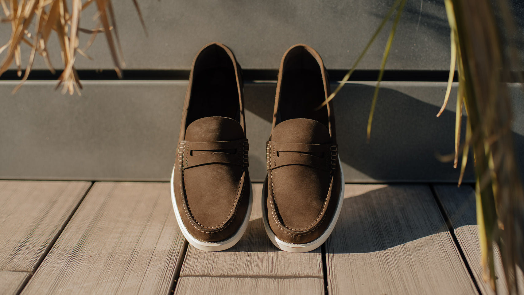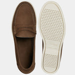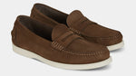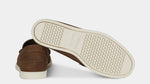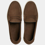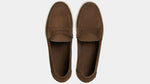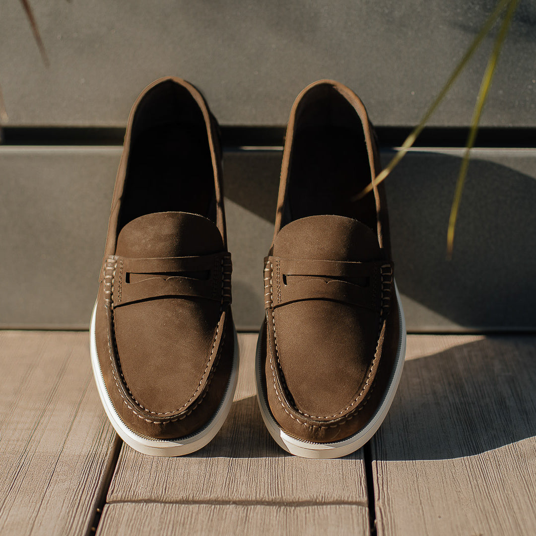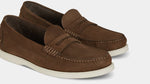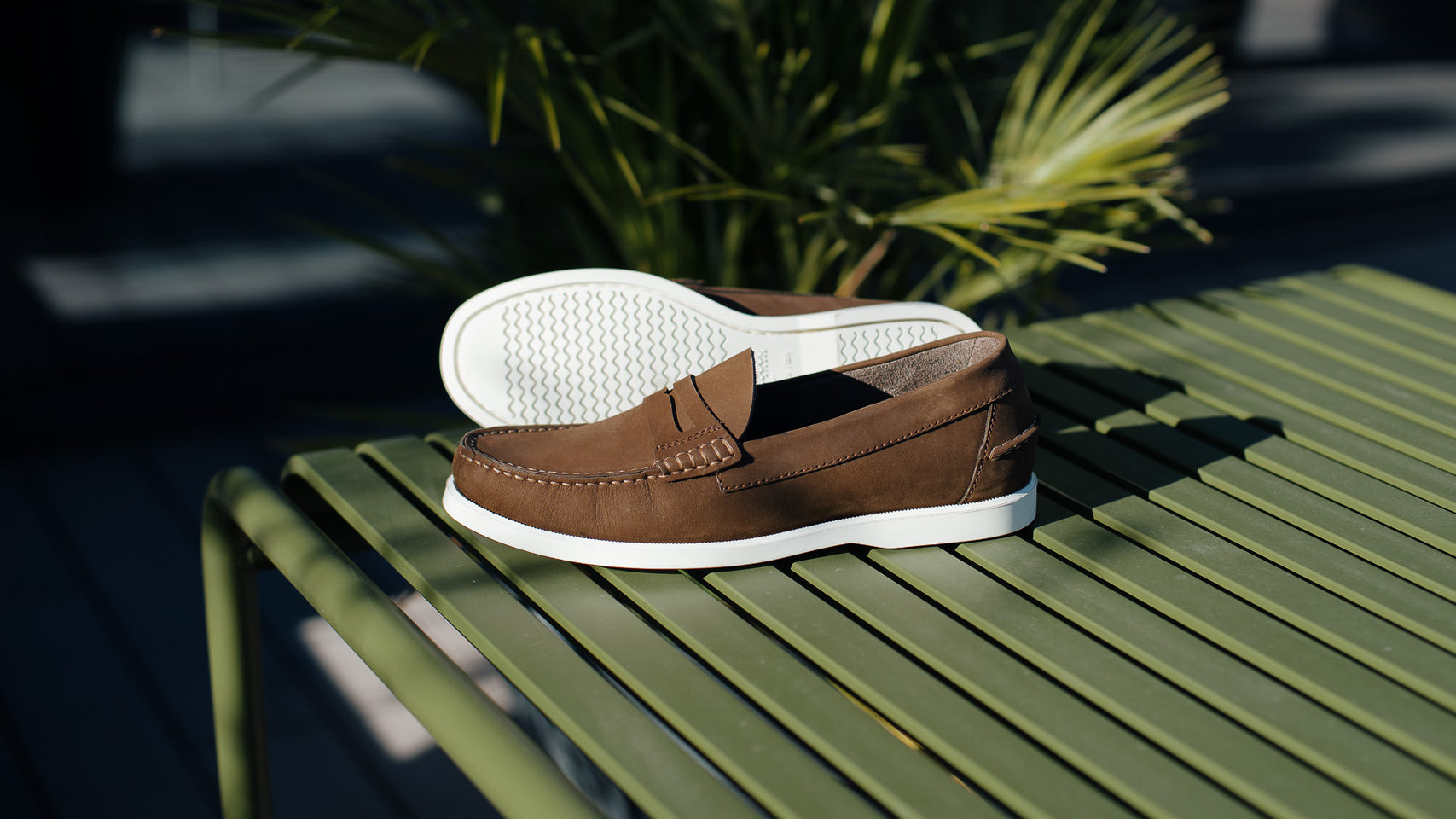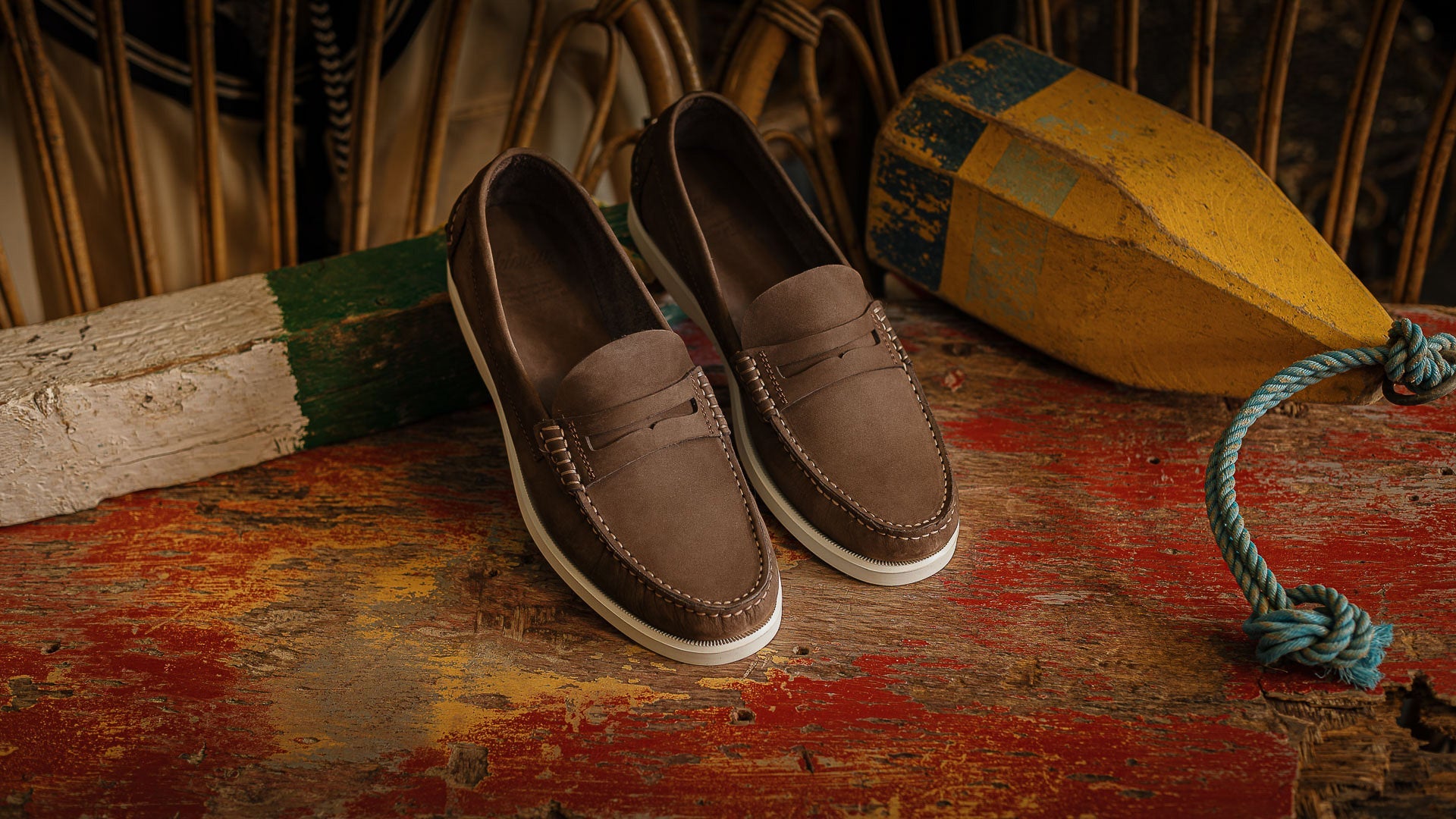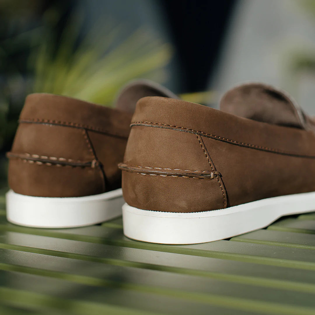 The unlined boat shoes with mask, in nubuck calfskin. The white rubber sole, as per sailor tradition, gives a good grip to these shoes with a delicate pitch. They're dark brown: wear them with a cream-coloured cotton cardigan with blue piping, a white t-shirt and light blue jeans. Without socks, of course. In the cool walks at sunset, between the sea and the city, when you get lost chatting with your old friends.
