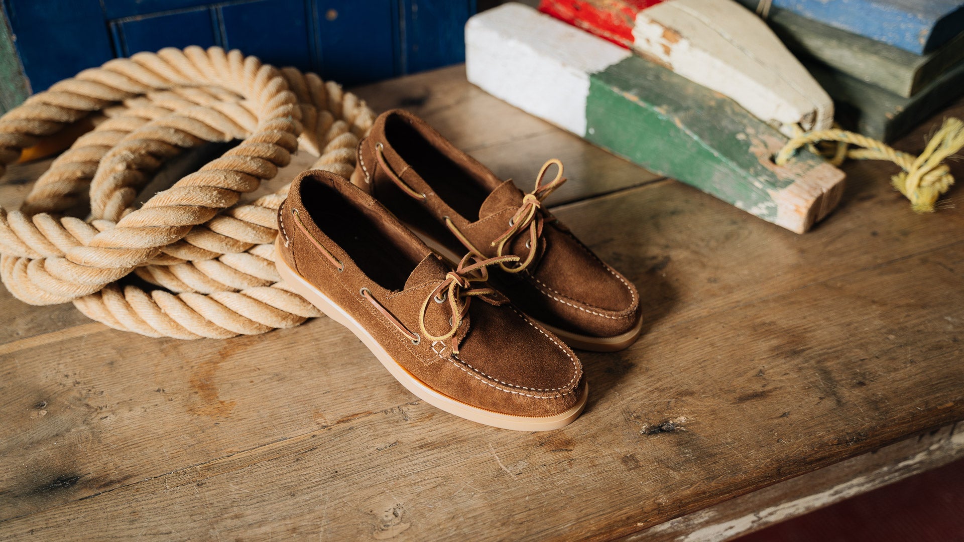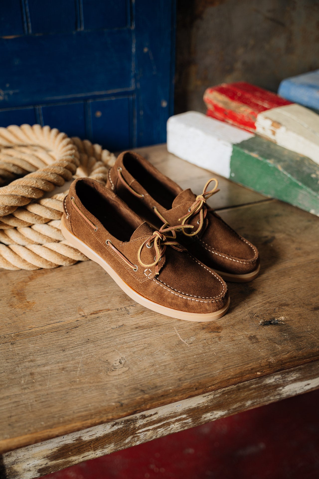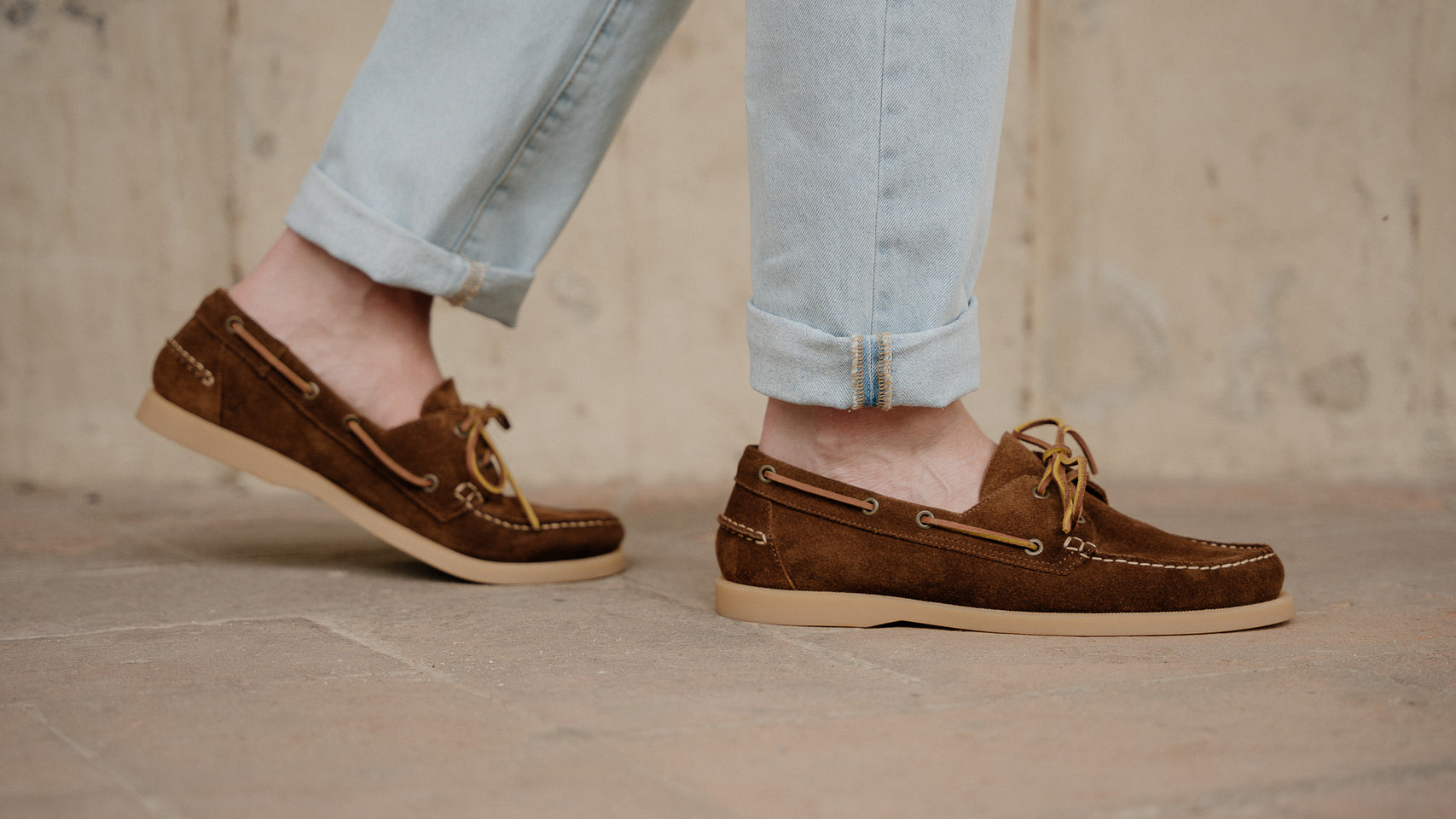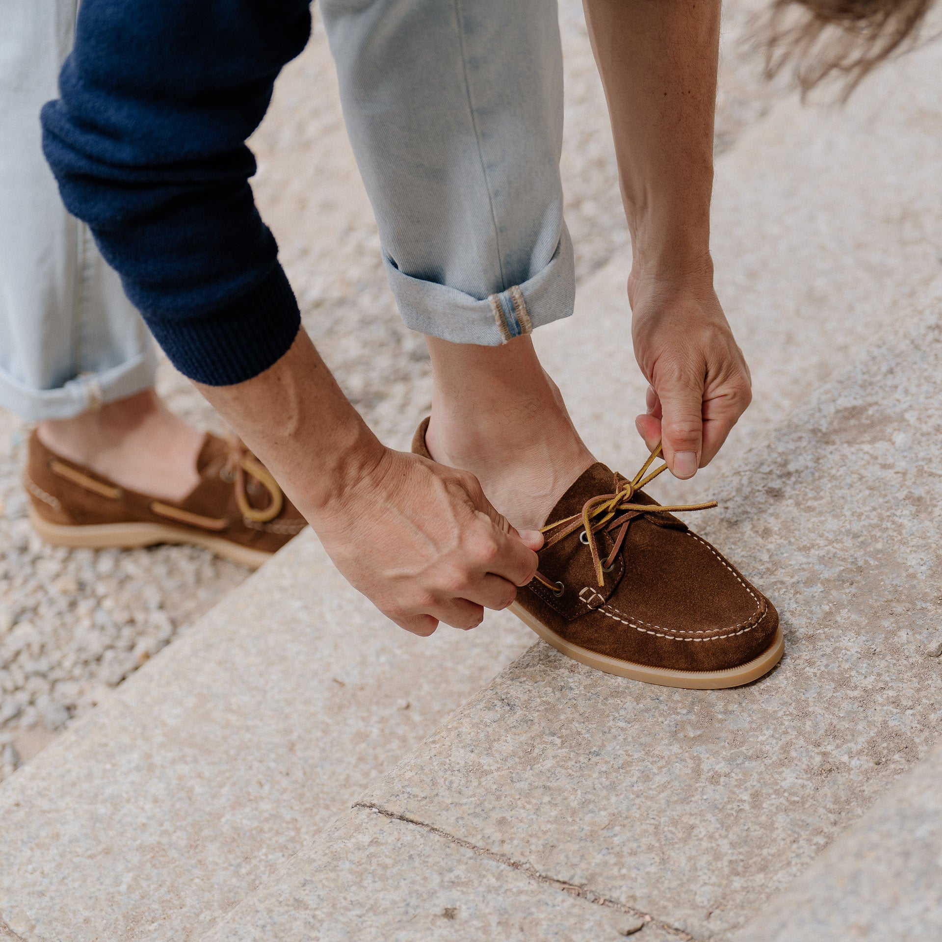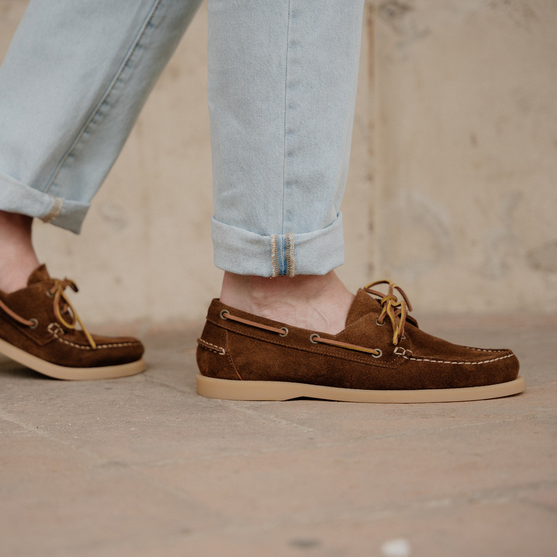 Boat shoes from the sailing tradition, in tobacco suede calfskin leather with a non-slip white rubber sole. Light and unlined, they’re at their best when paired with a pair of soft purple linen trousers - turned up - a beige t-shirt and an open faded green shirt. No socks, thanks.