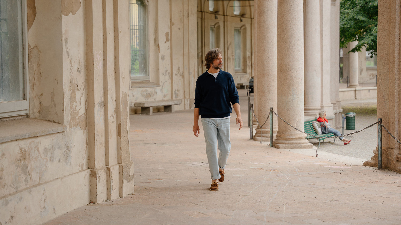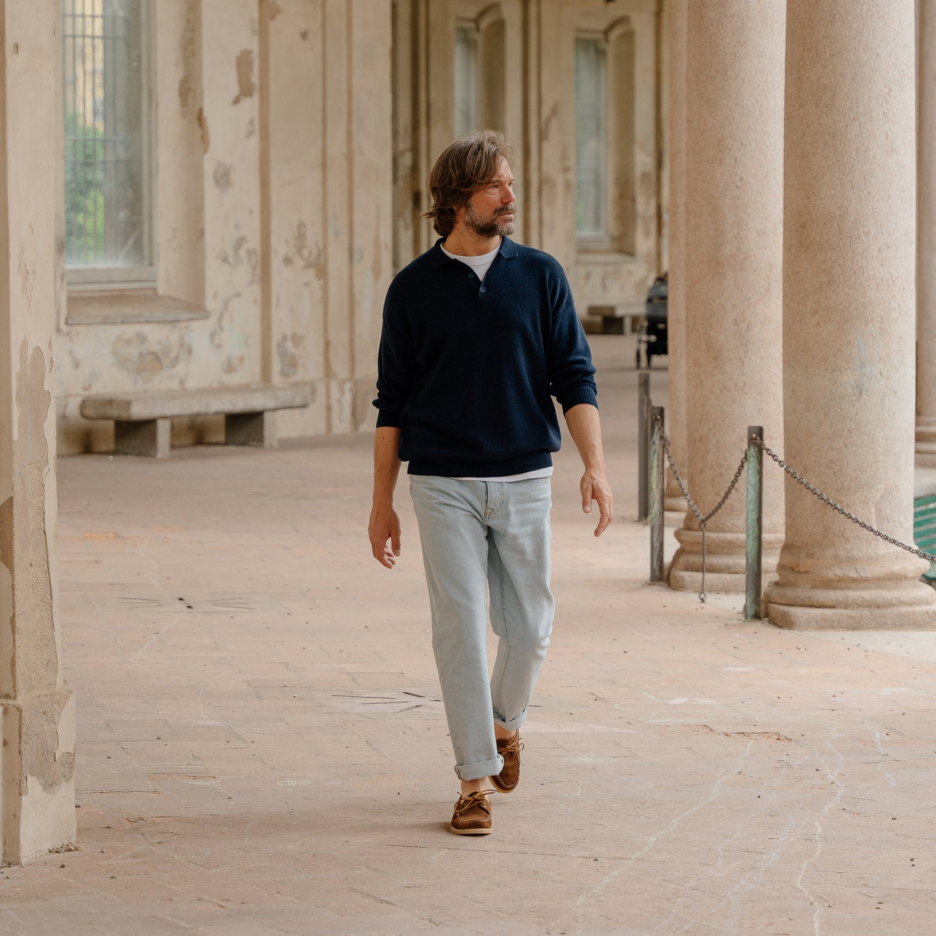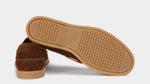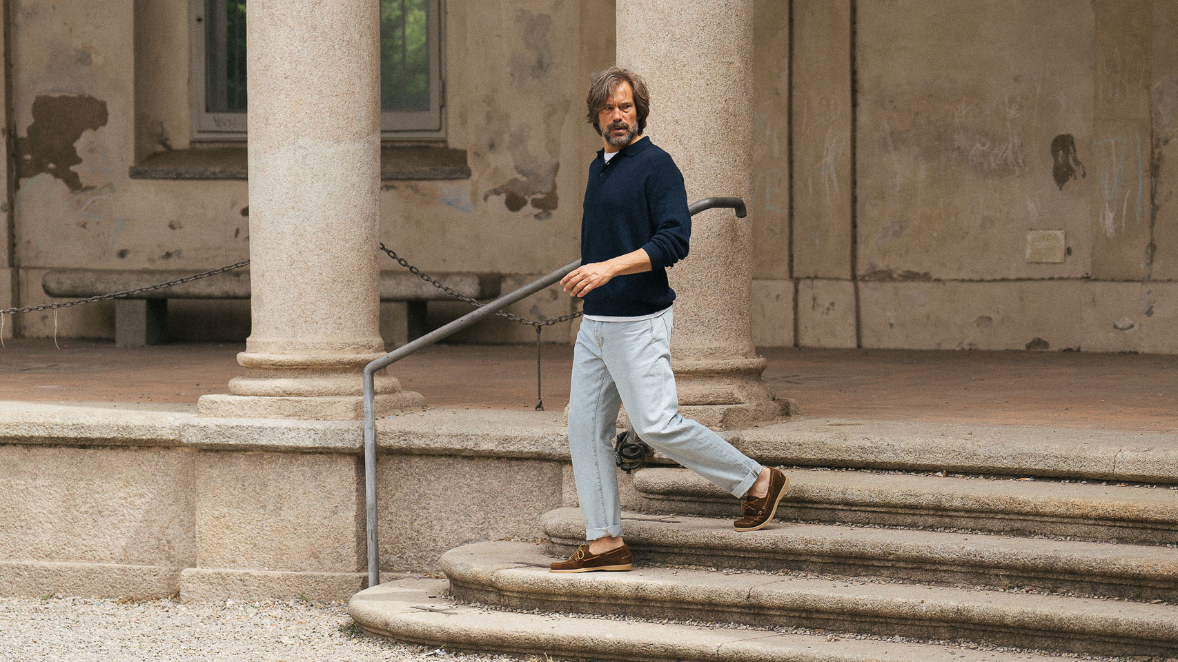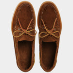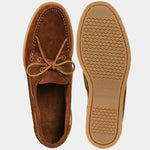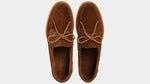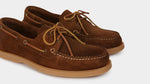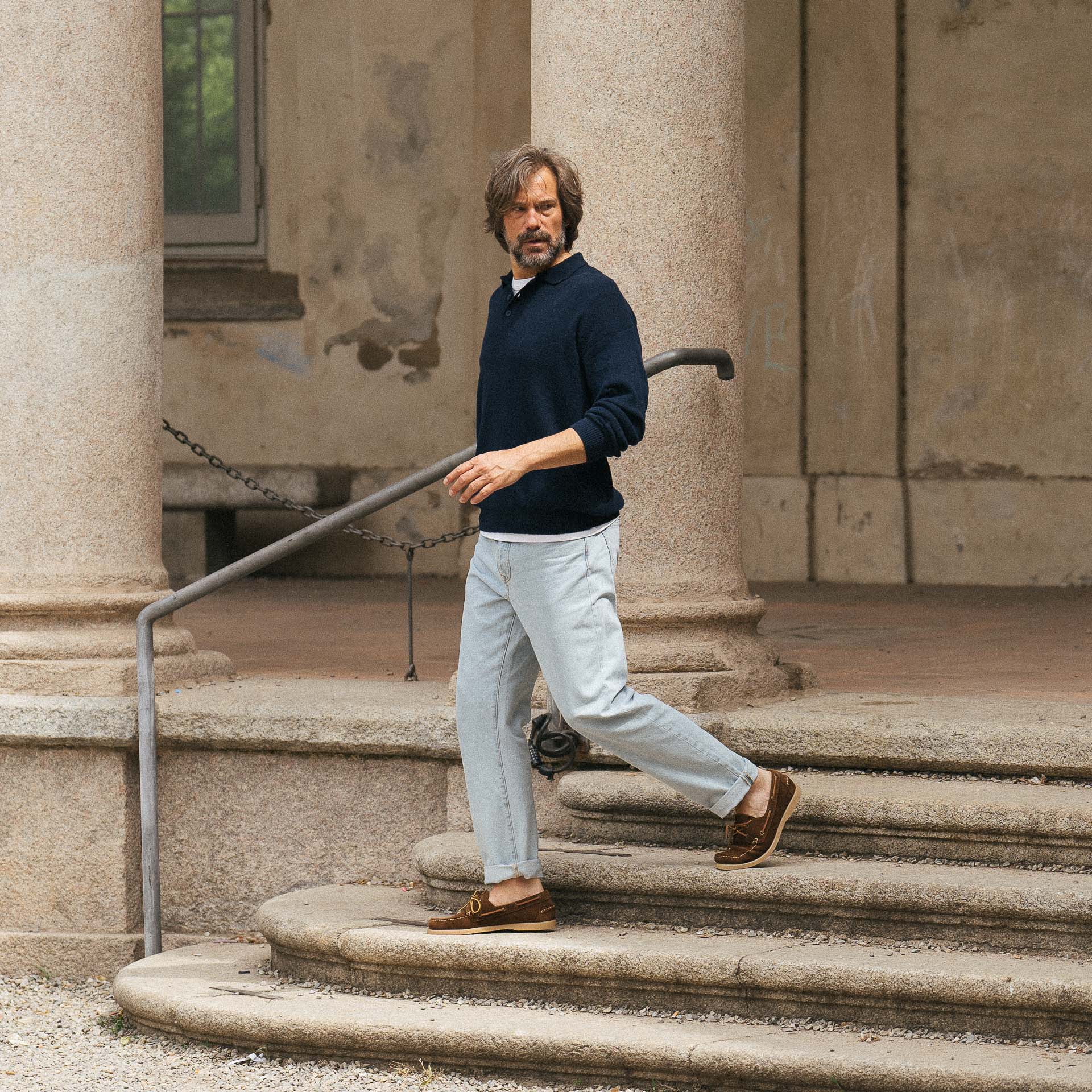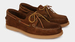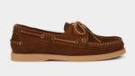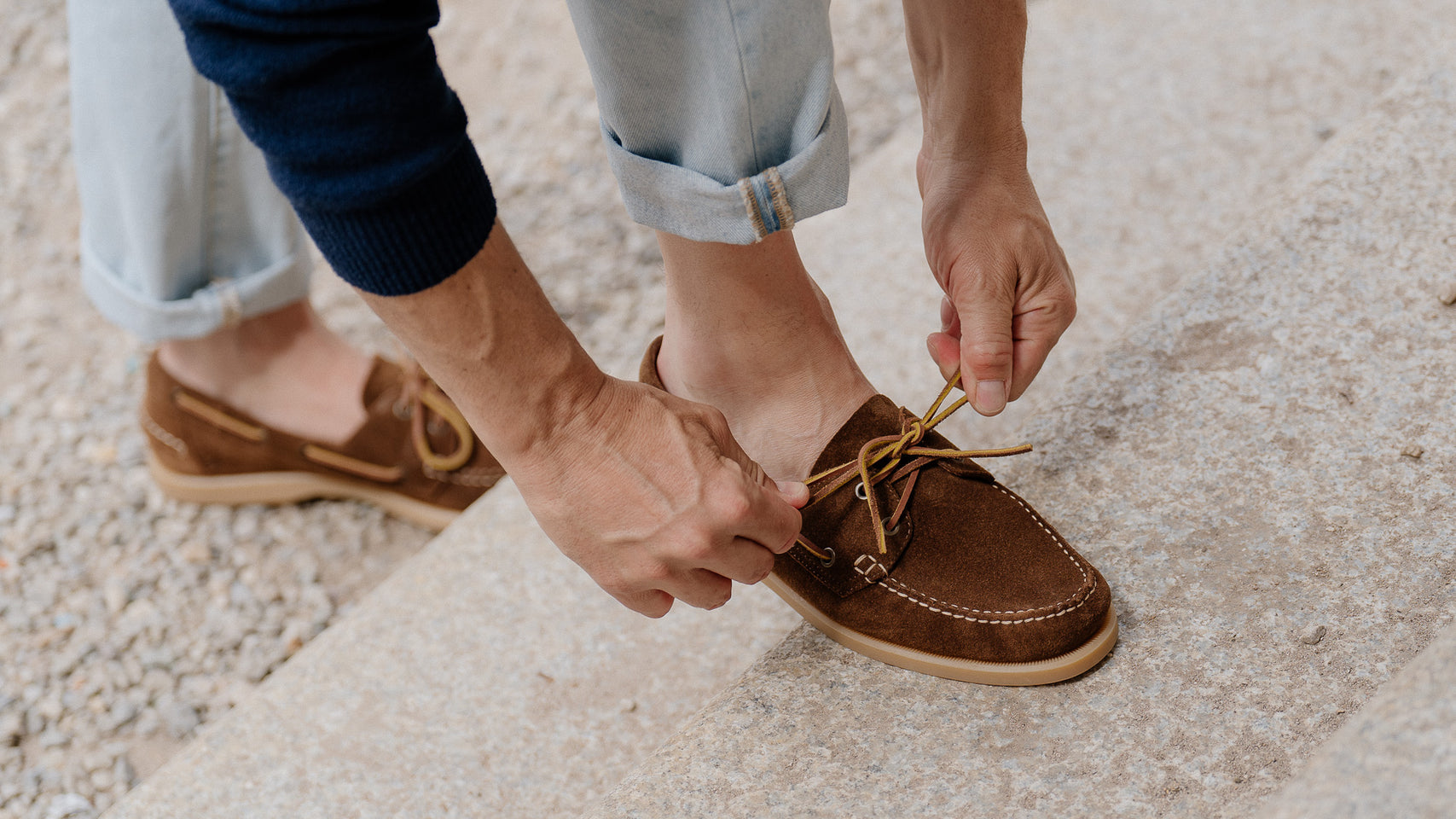 Boat shoes from the sailing tradition, in tobacco suede calfskin leather with a non-slip white rubber sole. Light and unlined, they’re at their best when paired with a pair of soft purple linen trousers - turned up - a beige t-shirt and an open faded green shirt. No socks, thanks.