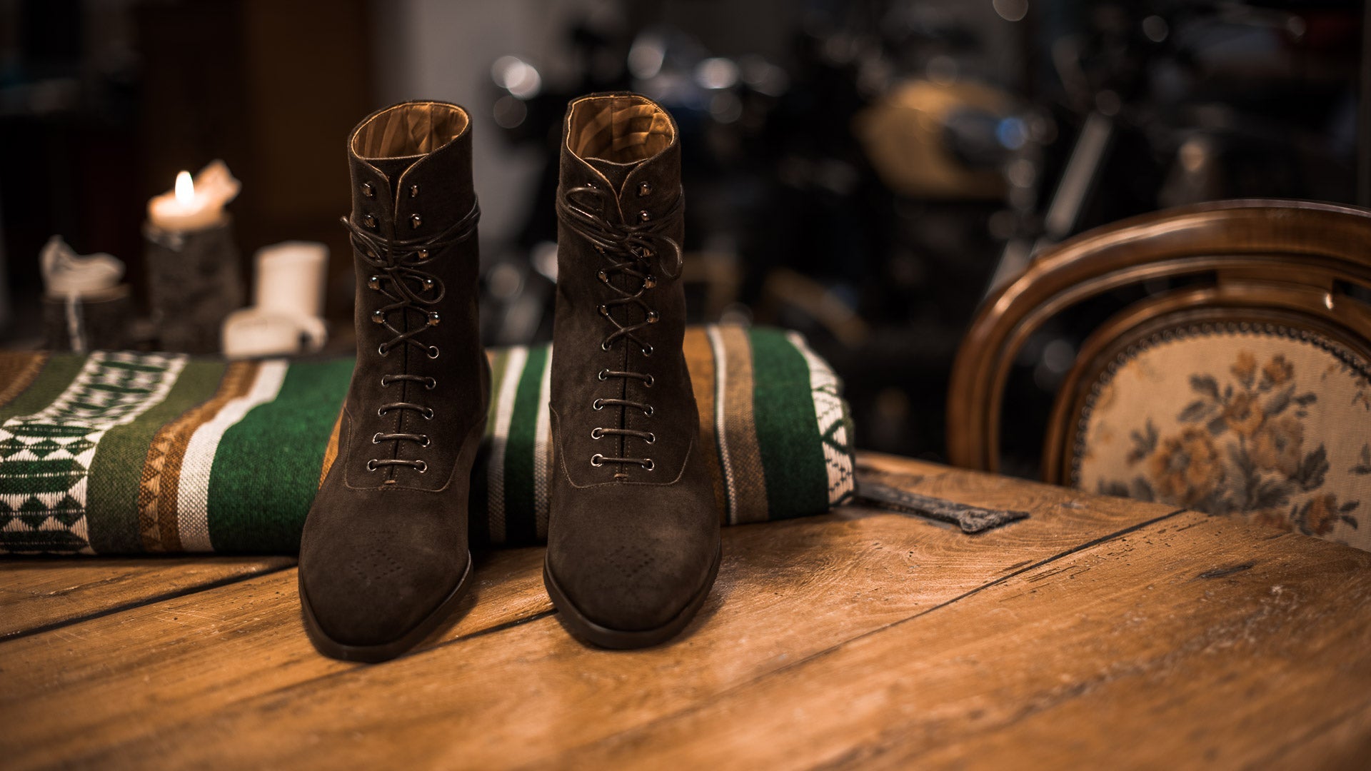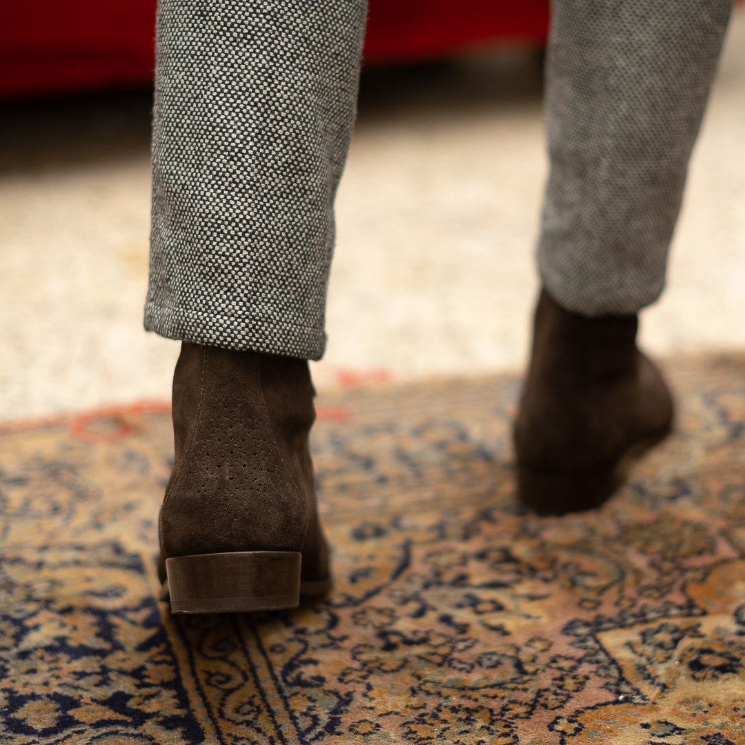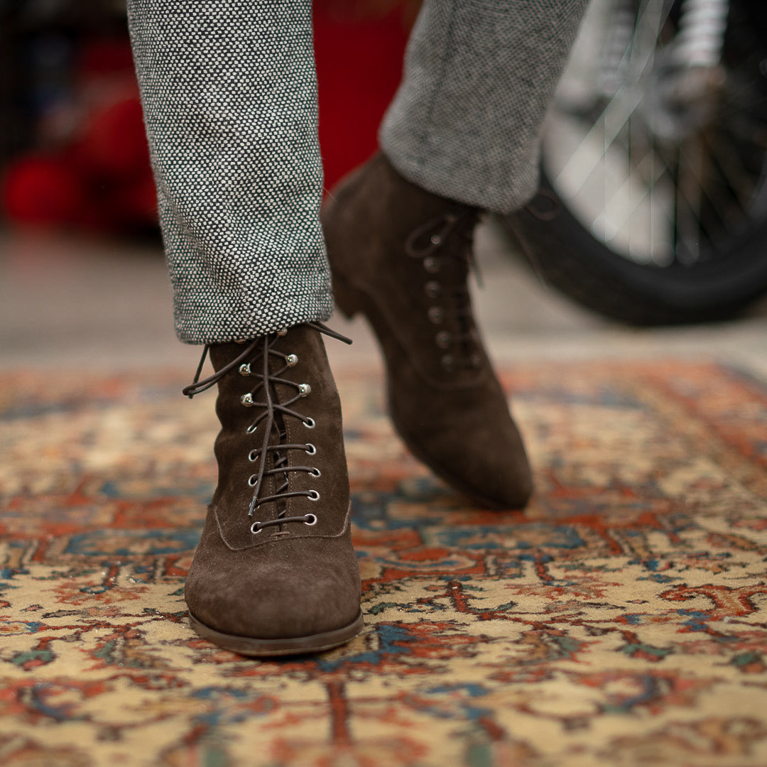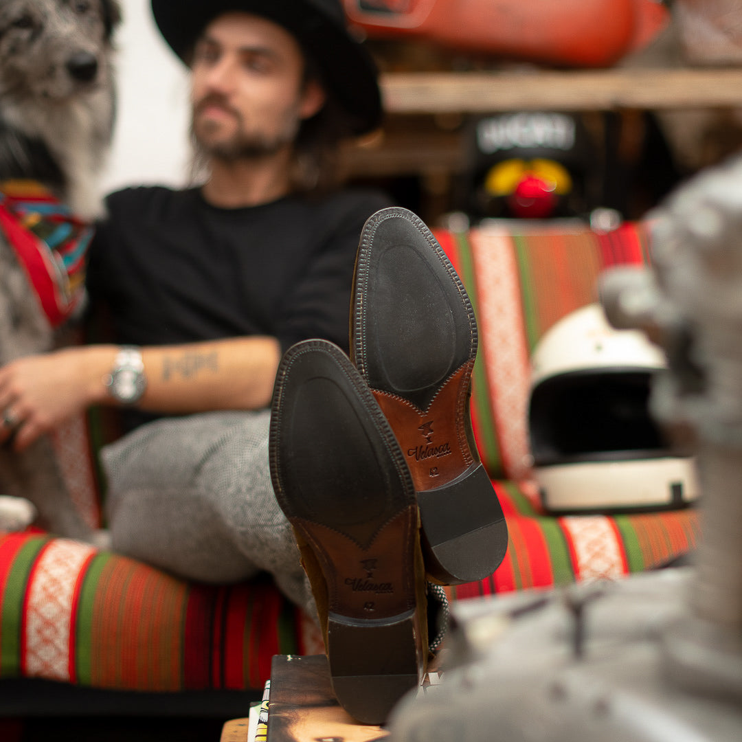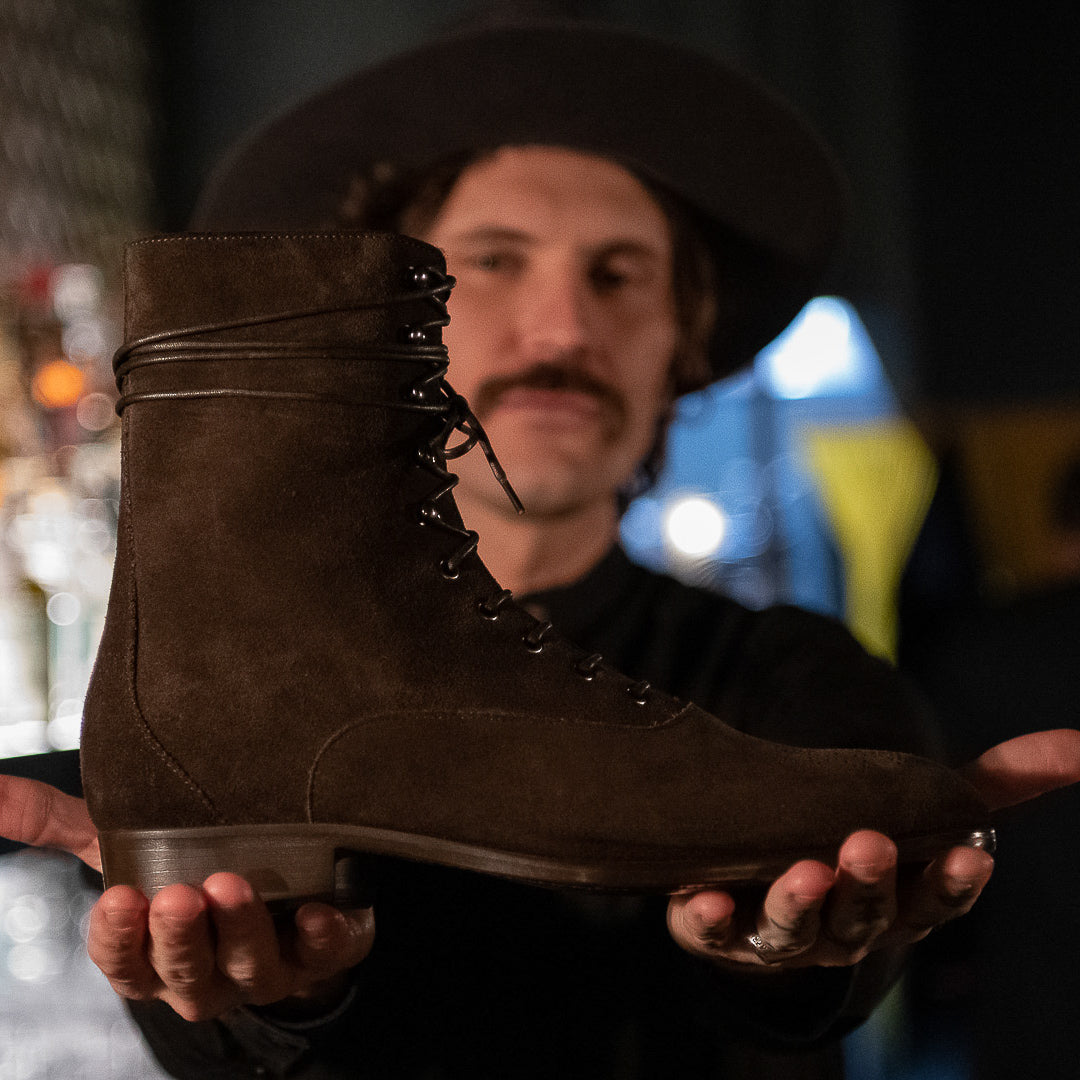 The lace-up boots born from Anvil x Velasca, in dark brown suede leather. On the sole, the leather is combined with rubber for a comfortable step always. The tapered shape extends towards the flower pattern designed by Phonz and San Marco, to experience the urban atmosphere with character.
