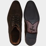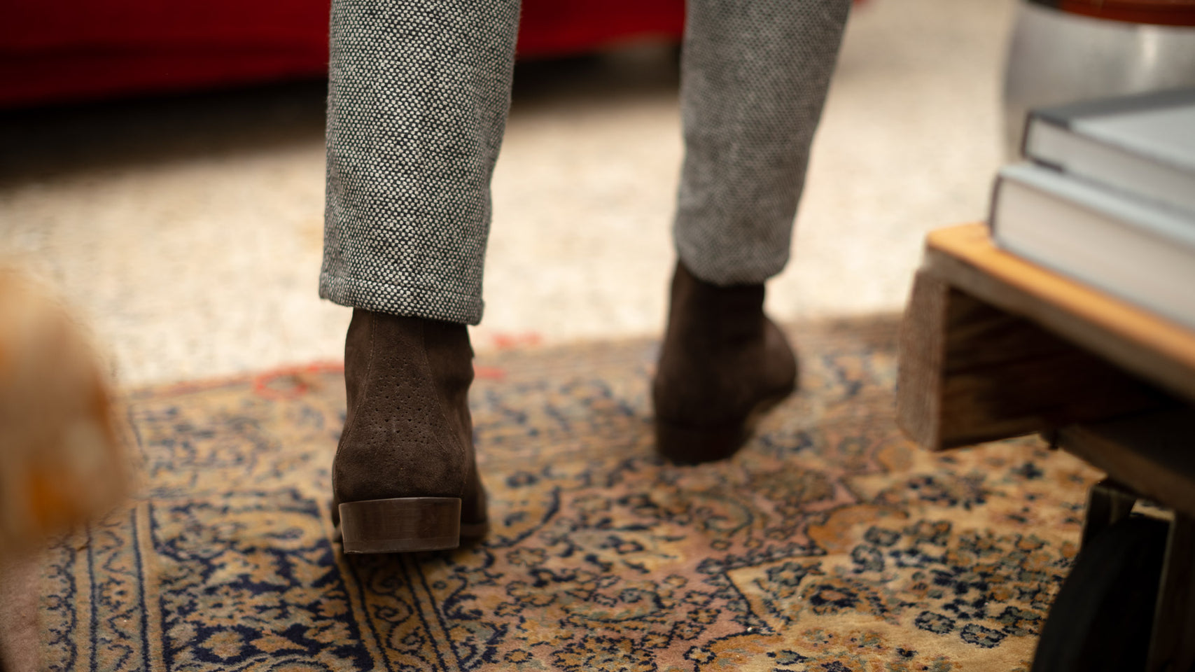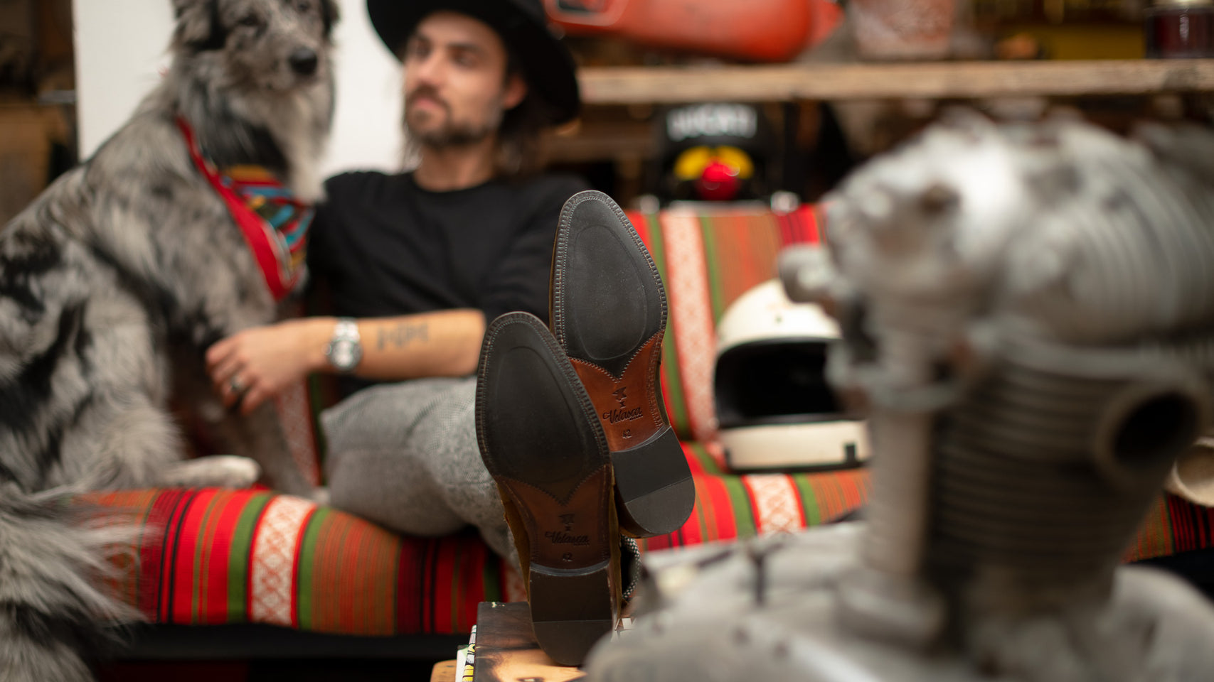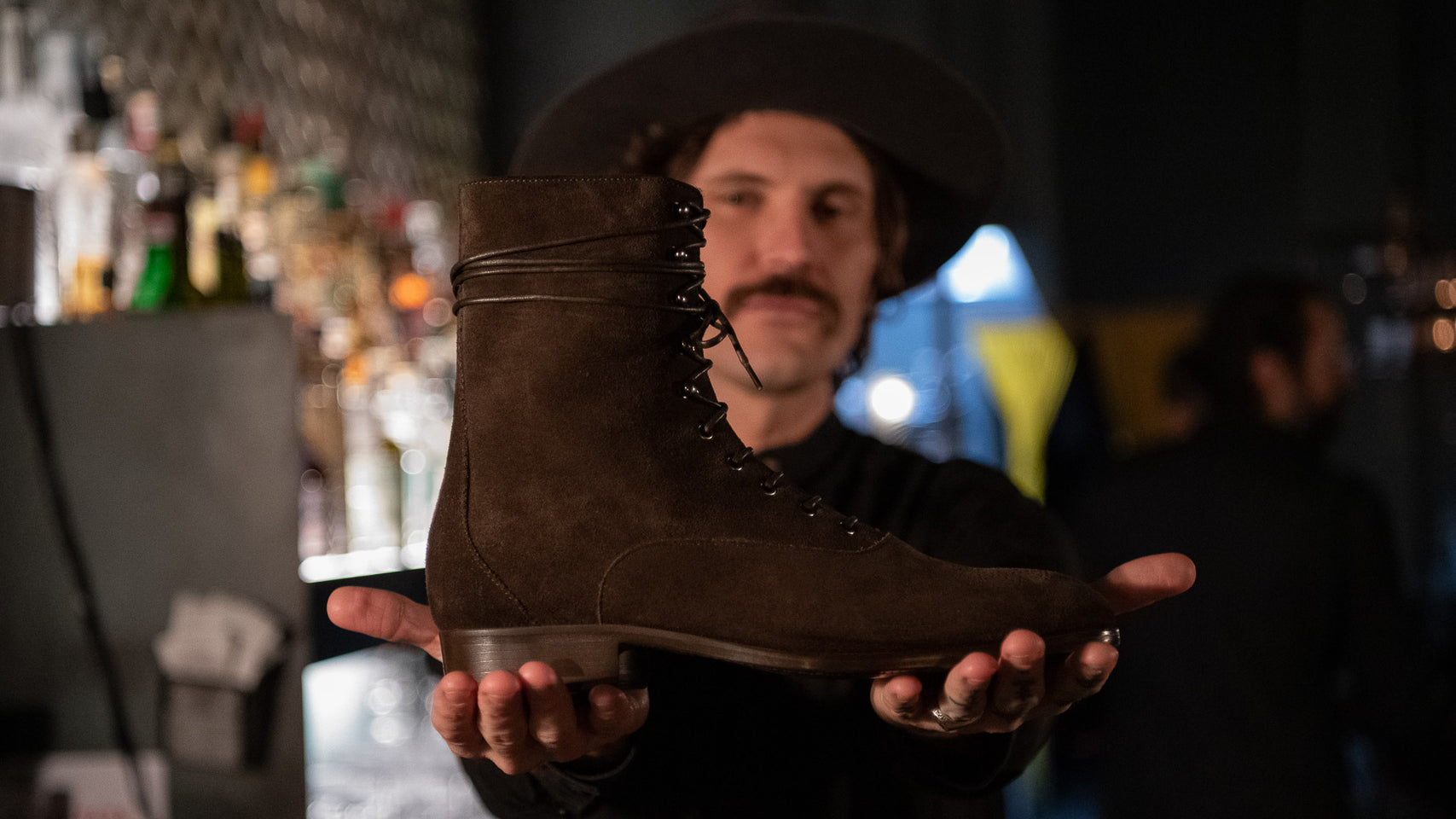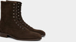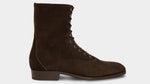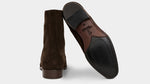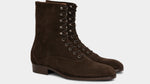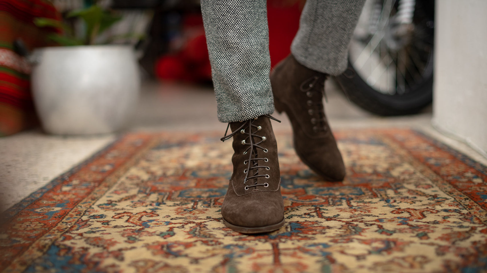 The lace-up boots born from Anvil x Velasca, in dark brown suede leather. On the sole, the leather is combined with rubber for a comfortable step always. The tapered shape extends towards the flower pattern designed by Phonz and San Marco, to experience the urban atmosphere with character.