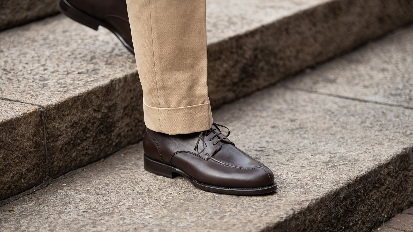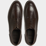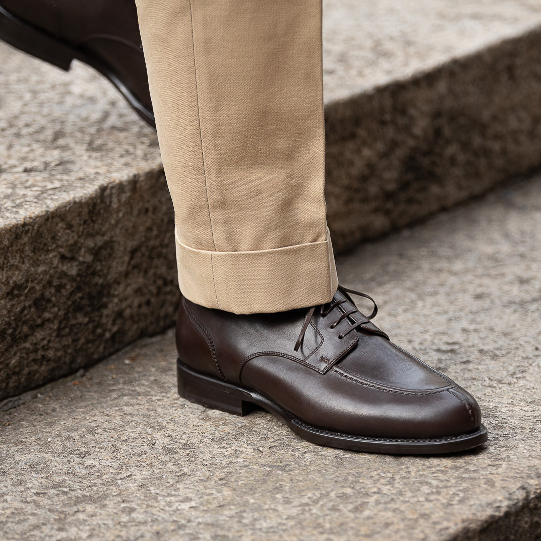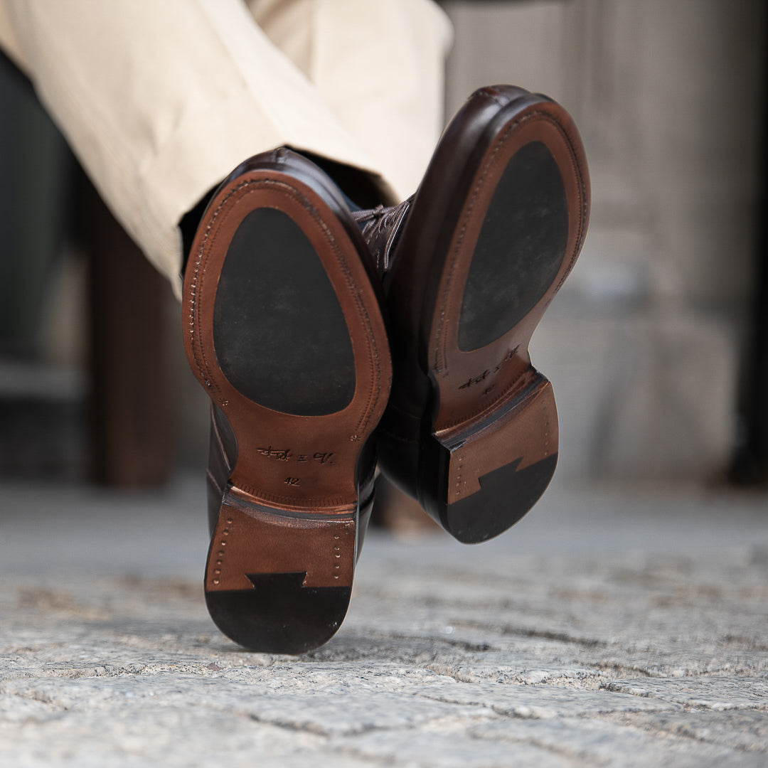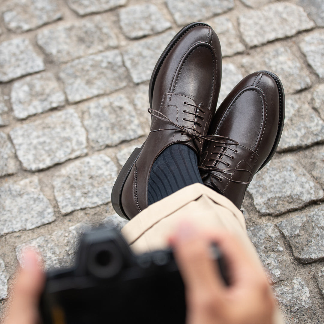 This is the derby designed by Fabio Attanasio for Velasca in brushed calf leather. The leather sole has a small rubber island so, together with the integrated sole, each step will be more comfortable. On the toe, this shoe flaunts elegant stitching: cotton trousers and a blue blazer, ready for the weekend.