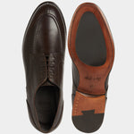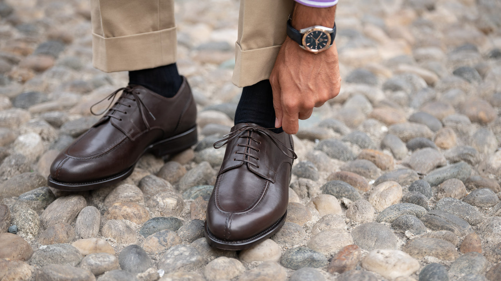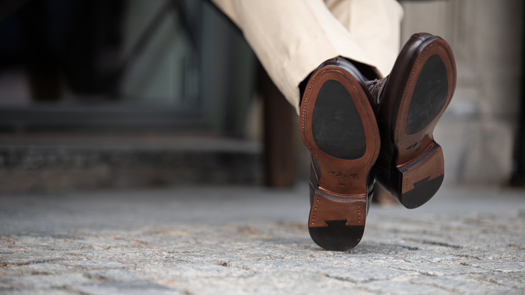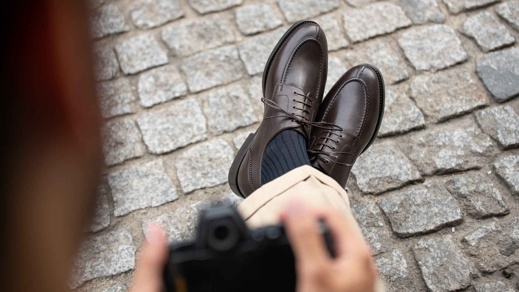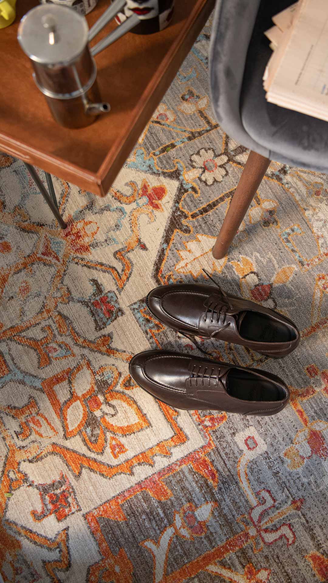 This is the derby designed by Fabio Attanasio for Velasca in brushed calf leather. The leather sole has a small rubber island so, together with the integrated sole, each step will be more comfortable. On the toe, this shoe flaunts elegant stitching: cotton trousers and a blue blazer, ready for the weekend.