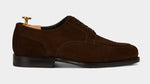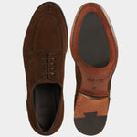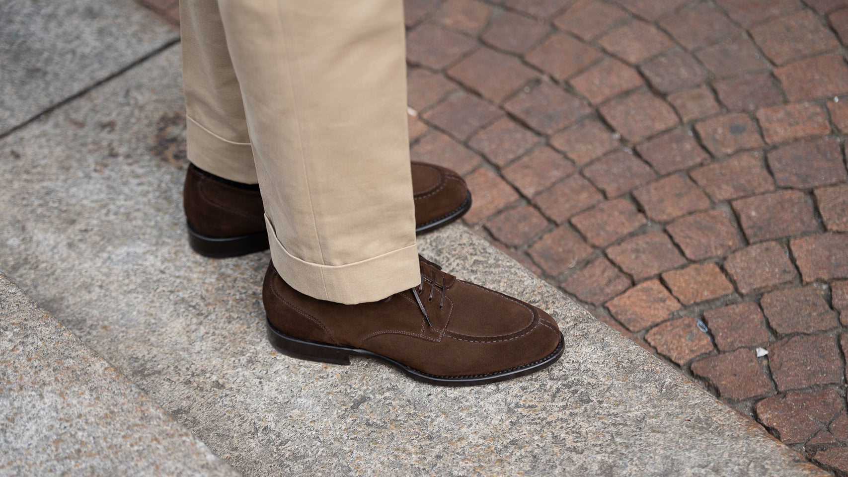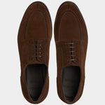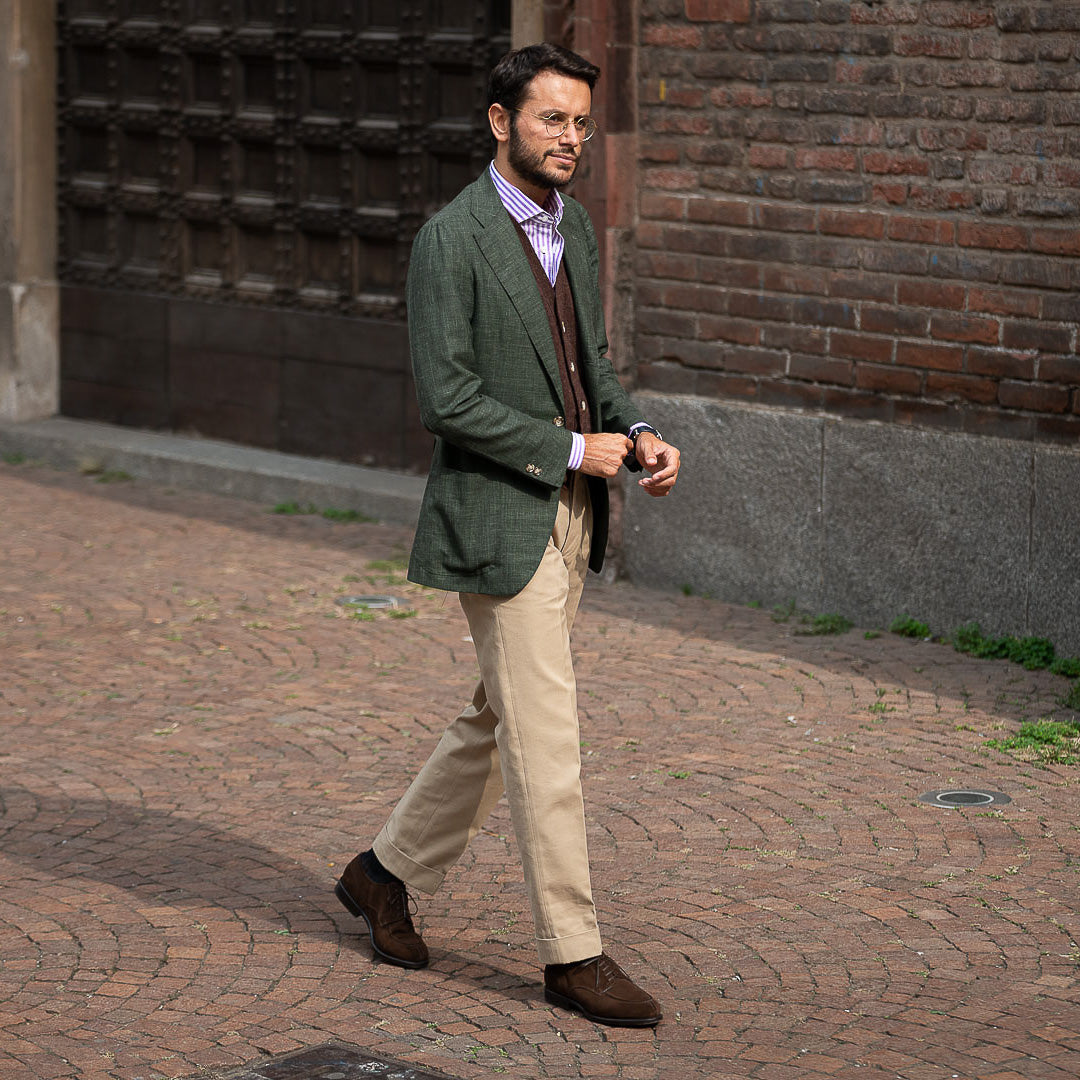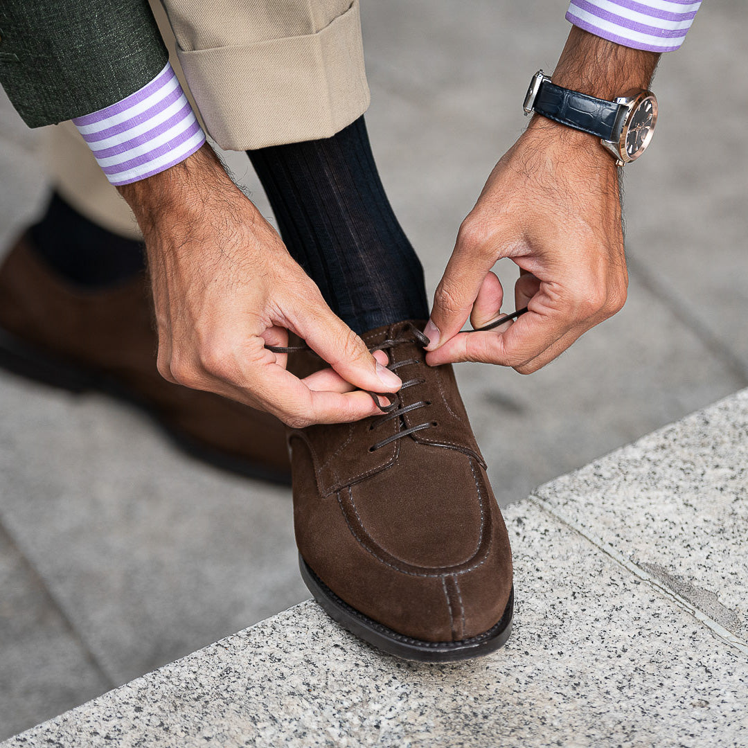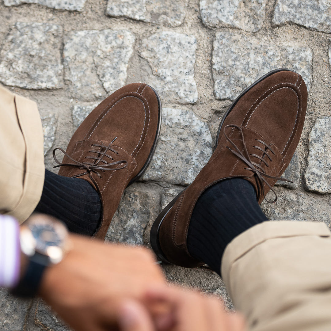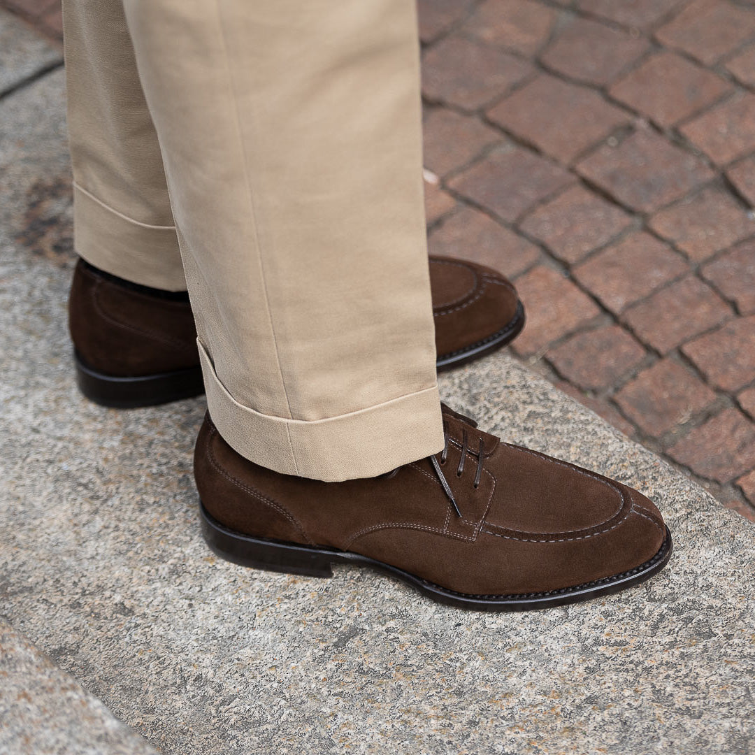 The suede derby designed by Fabio Attanasio for Velasca. Suede is made from the crust of calfskin (which is the softest layer) from English tanneries: it is silky-smooth when you touch it. The leather sole has a small rubber island so, together with the integrated insole, every step will be more comfortable. On the toe, this shoe flaunts its elegant stitching. Cashmere turtleneck and corduroy pants, and you’re ready for the weekend.