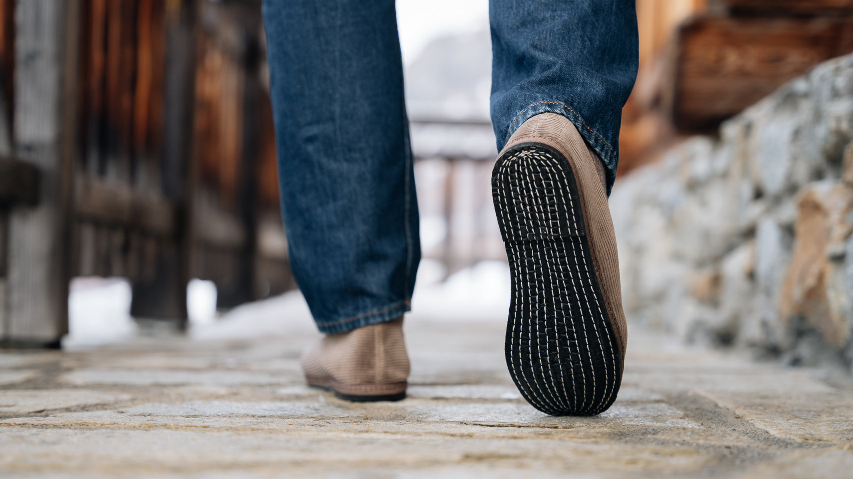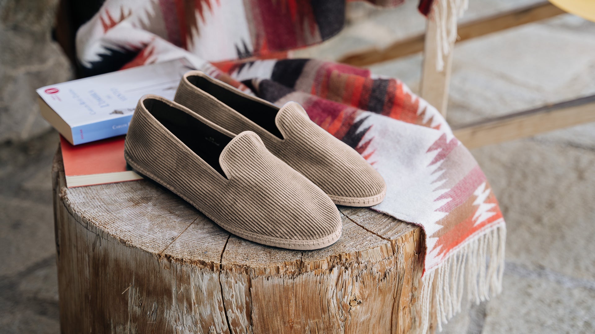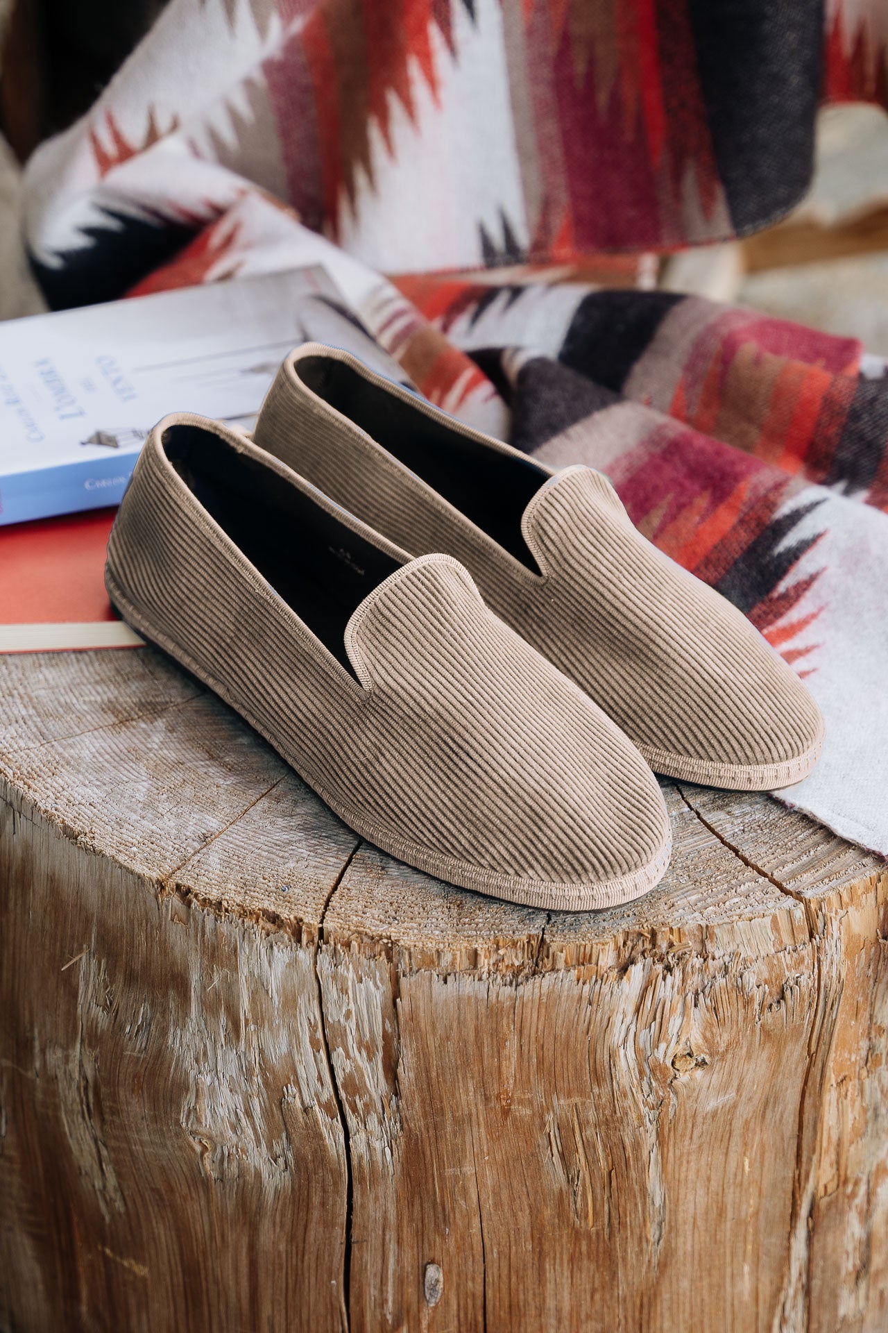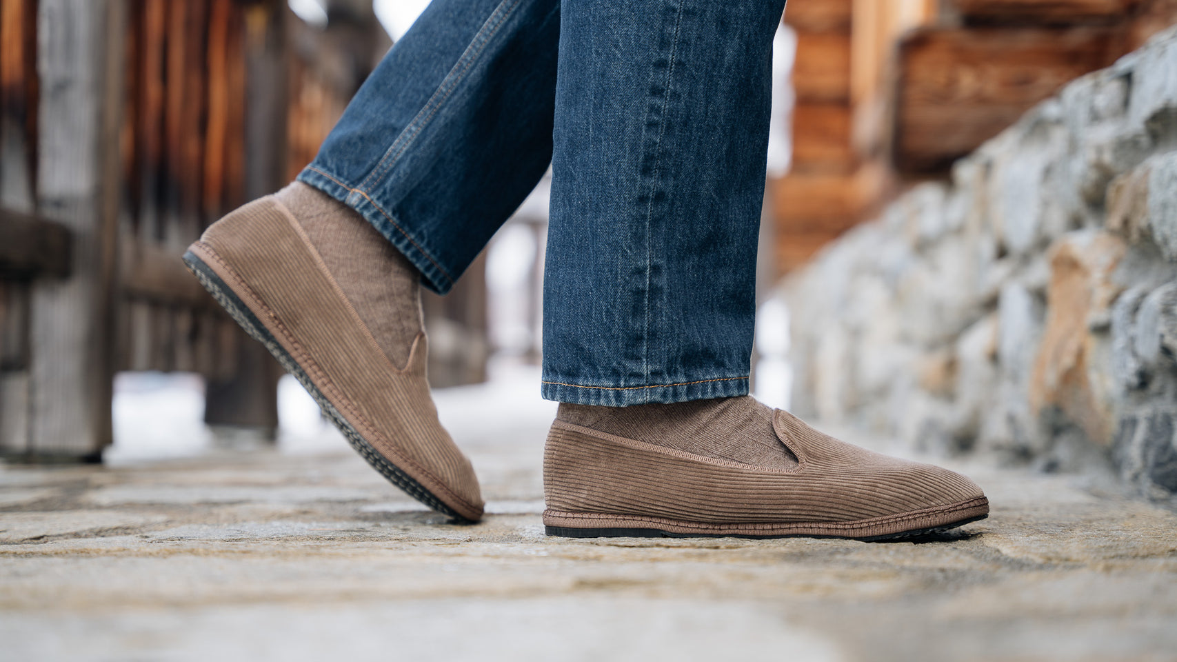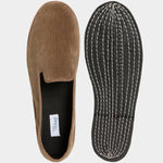 The Friulane in beige velvet corduroy fabric and a rubber sole with visible stitching. They are traditional Friuli shoes that were originally made at home by ladies in mountain villages, then found new life in the Venetian canals: the gondoliers needed a comfortable and stable shoe that was also delicate on the wood. The hand stitching, with its irregularities, makes each shoe a unique piece. Comfortable and snug, with the tongue which covers up to the instep, you’ll barely feel them; perfect for relaxing at home after a day in the snow.