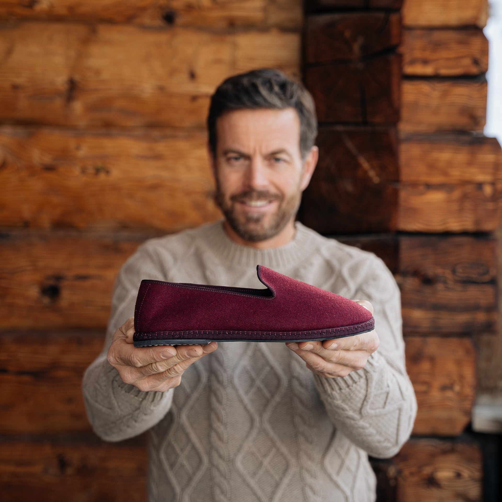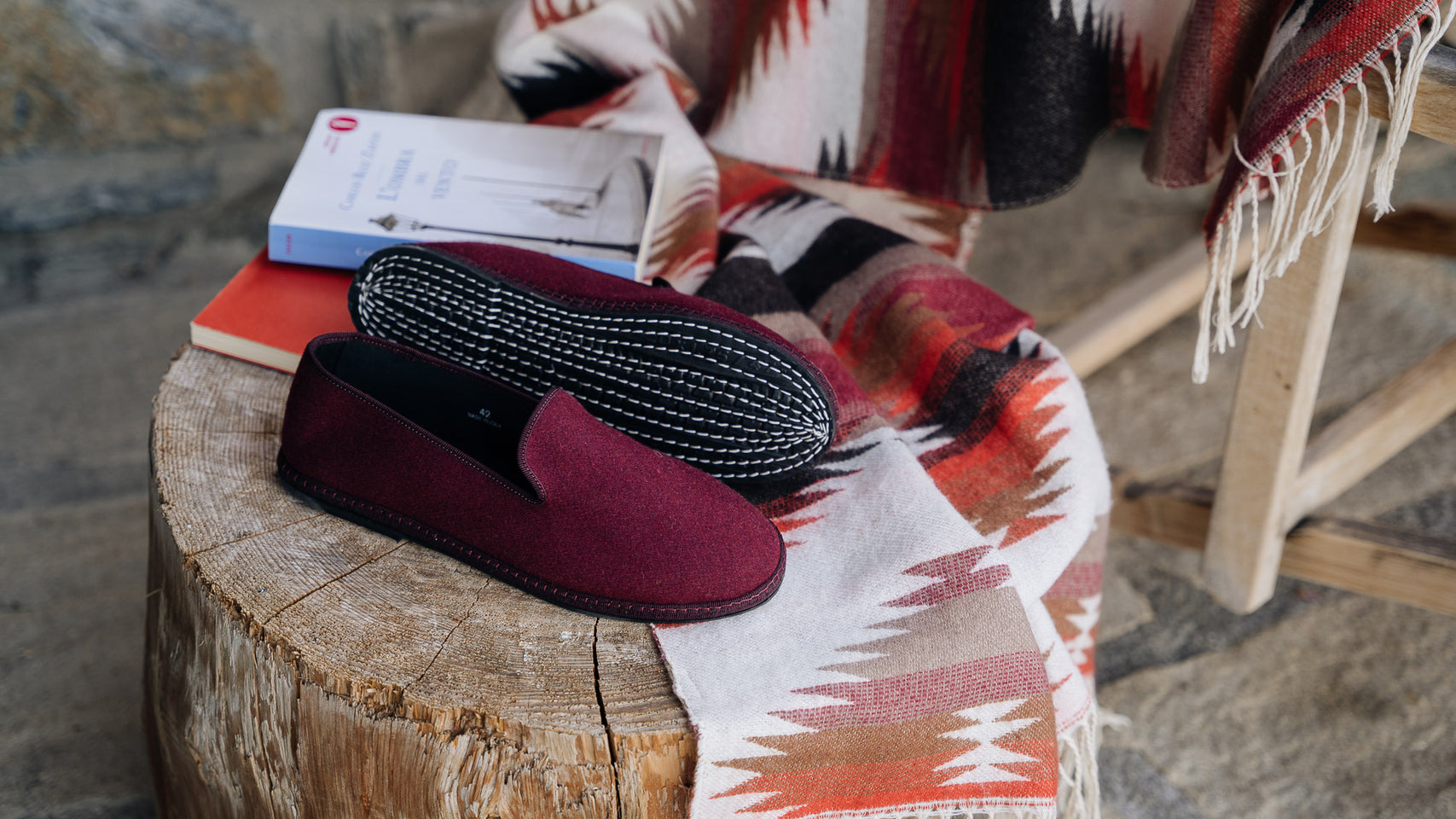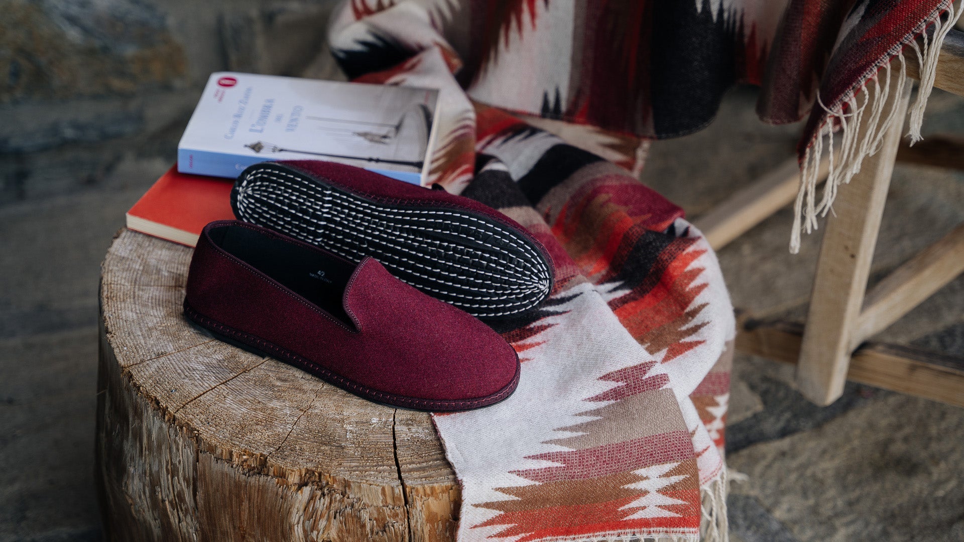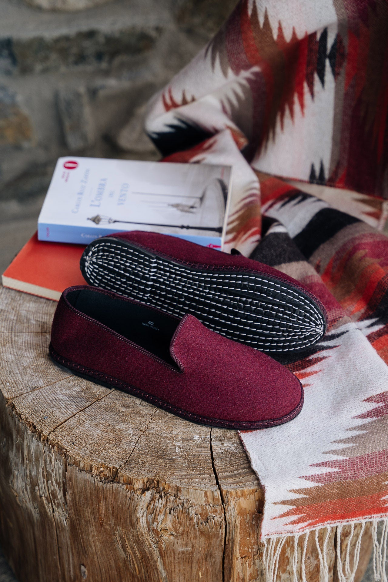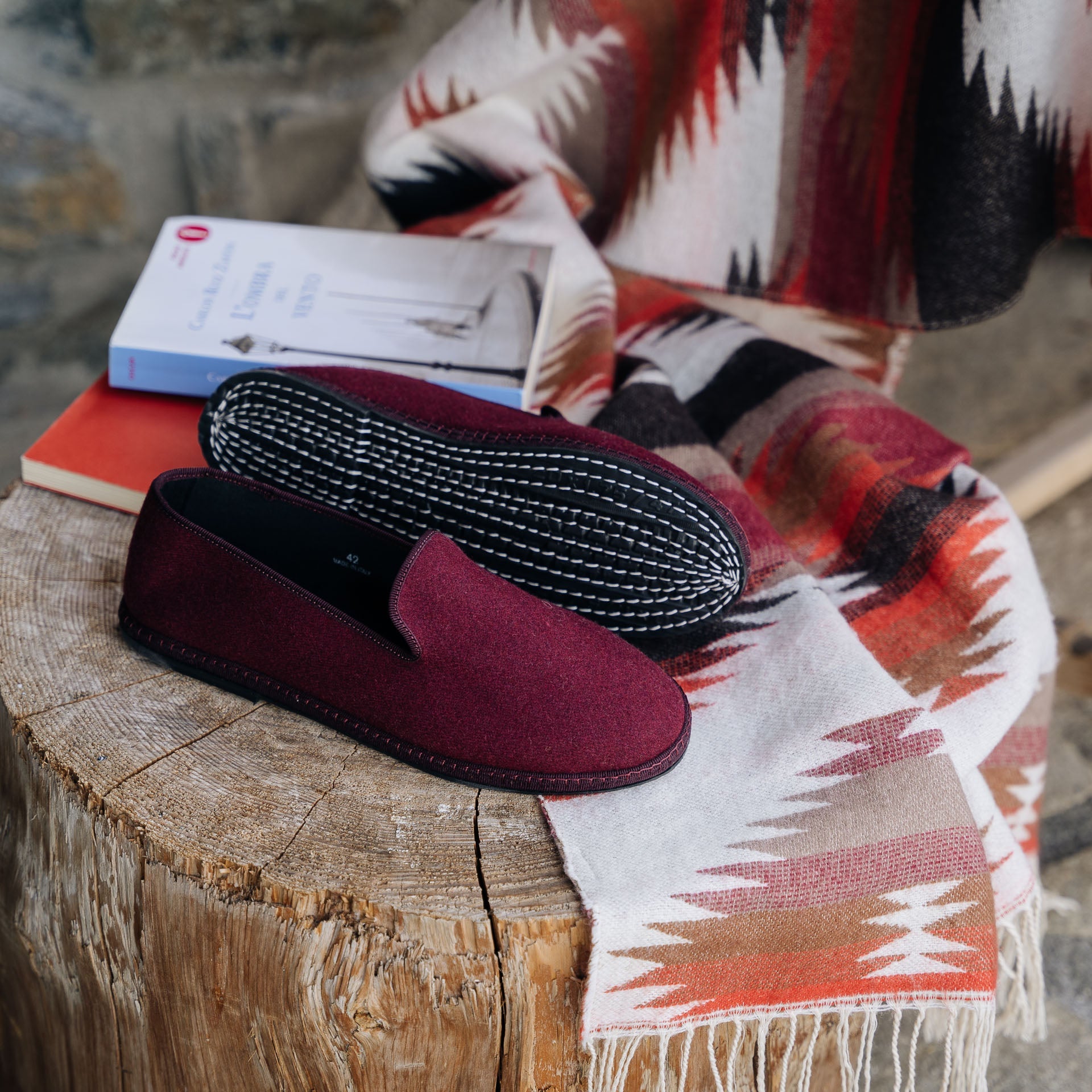 The bordeaux Friulane in ribbed boiled wool and rubber sole with visible stitching. They are traditional Friuli shoes that were originally made at home by ladies in mountain villages, then found new life in the Venetian canals: the gondoliers needed a comfortable and stable shoe that was also delicate on the wood. The hand stitching, with its irregularities, makes each shoe a unique piece. Comfortable and snug, with the tongue which covers up to the instep, you’ll barely feel them; perfect for relaxing at home after a day in the snow.