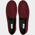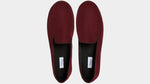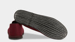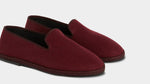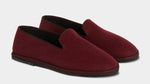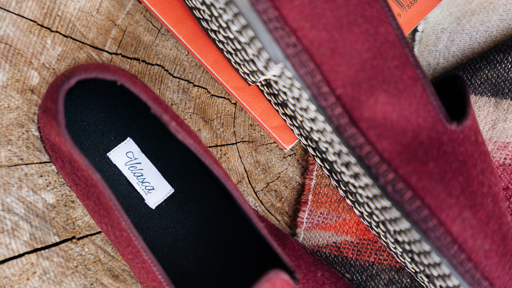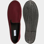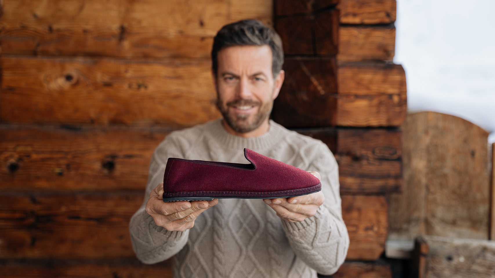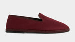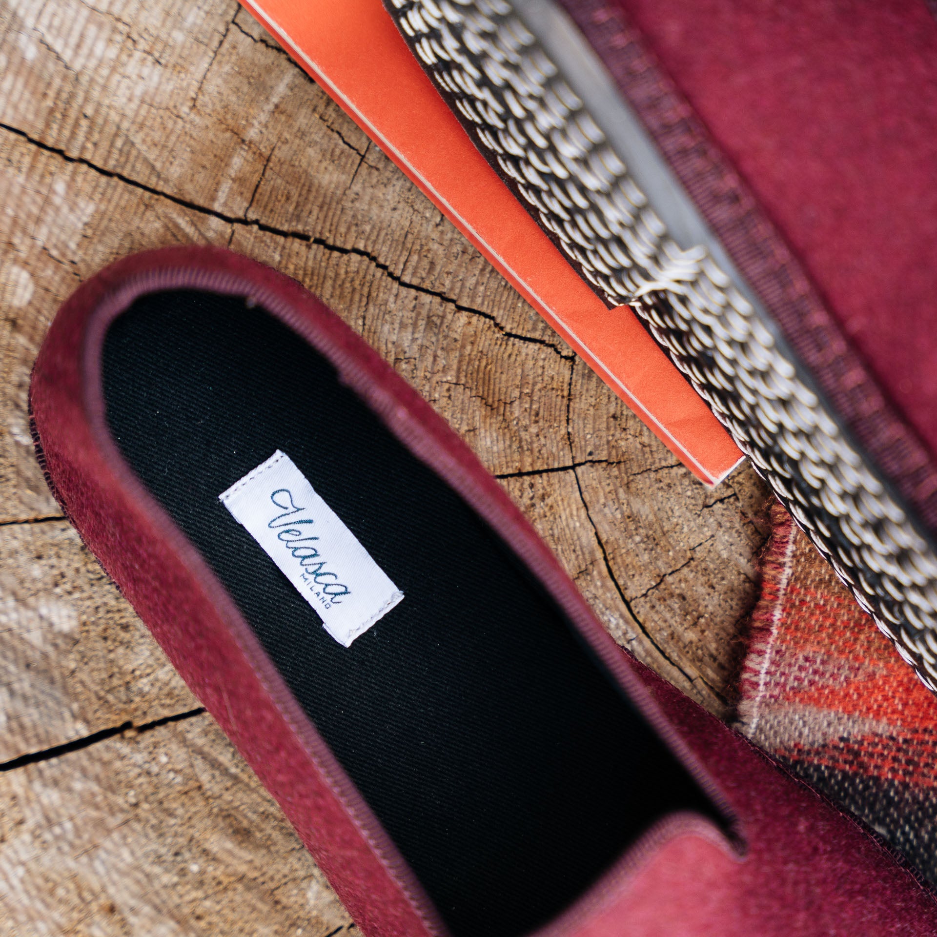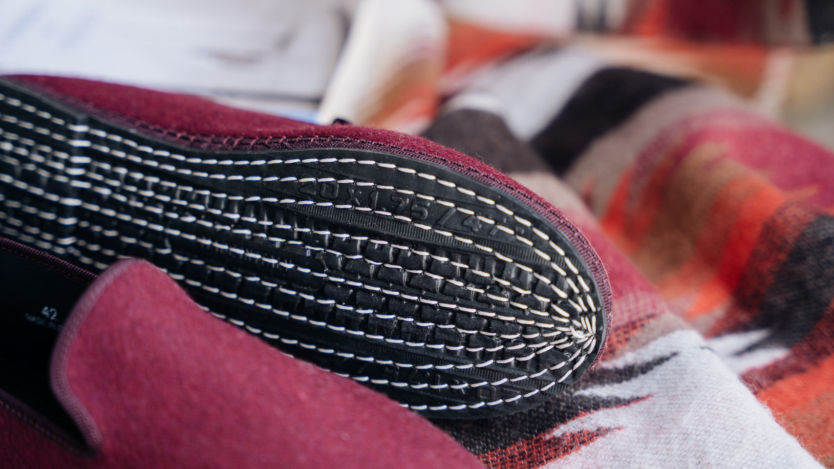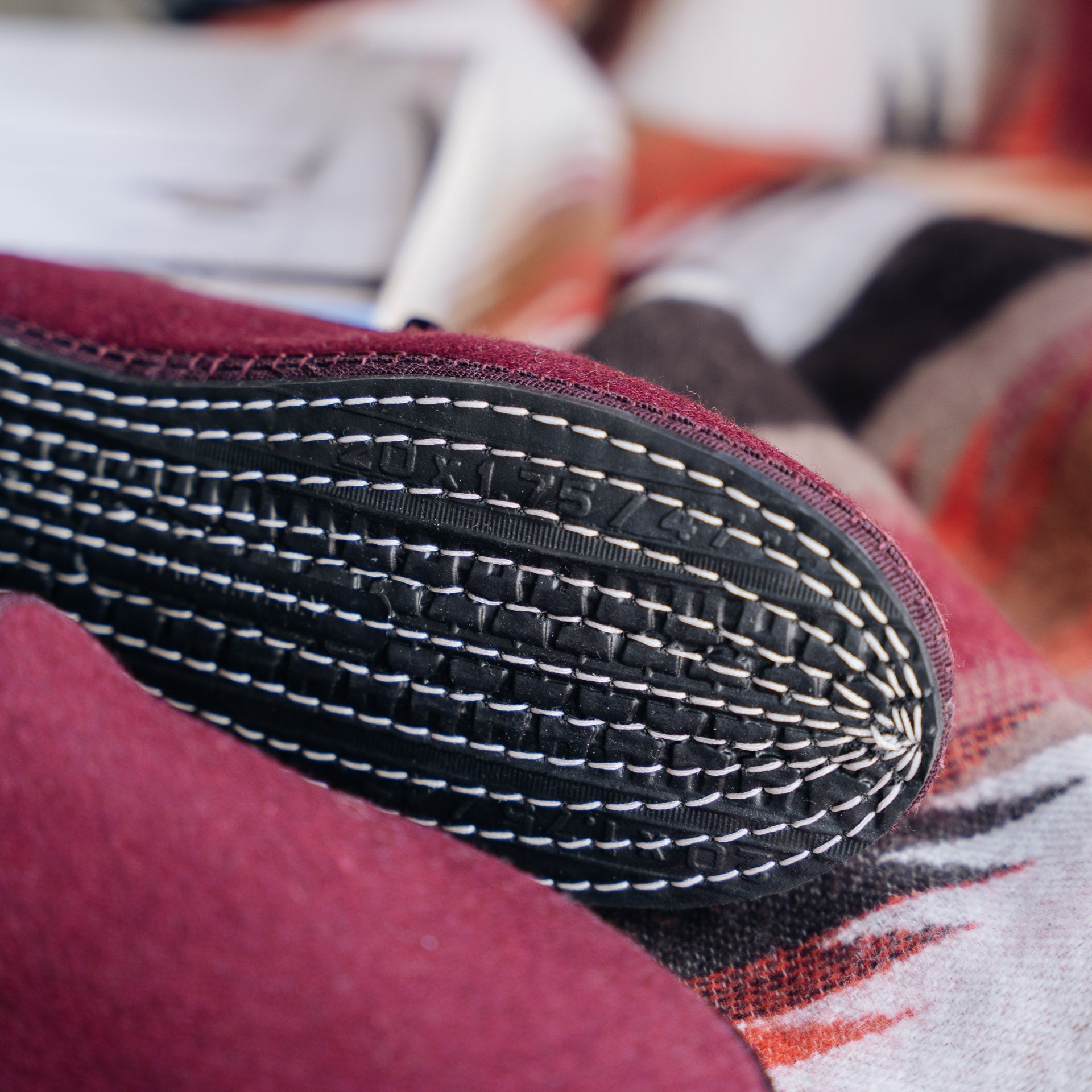 The bordeaux Friulane in ribbed boiled wool and rubber sole with visible stitching. They are traditional Friuli shoes that were originally made at home by ladies in mountain villages, then found new life in the Venetian canals: the gondoliers needed a comfortable and stable shoe that was also delicate on the wood. The hand stitching, with its irregularities, makes each shoe a unique piece. Comfortable and snug, with the tongue which covers up to the instep, you’ll barely feel them; perfect for relaxing at home after a day in the snow.