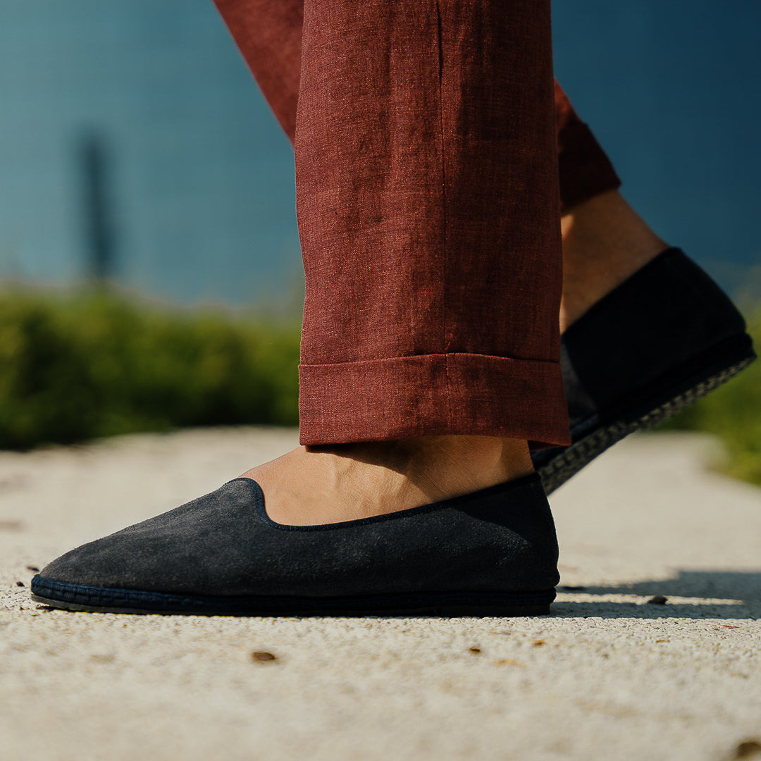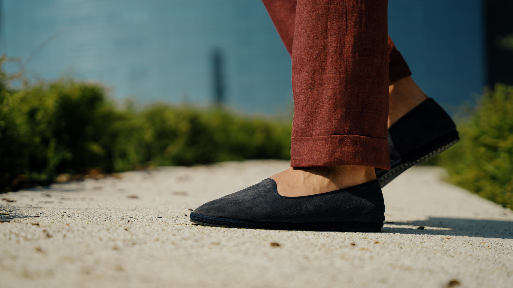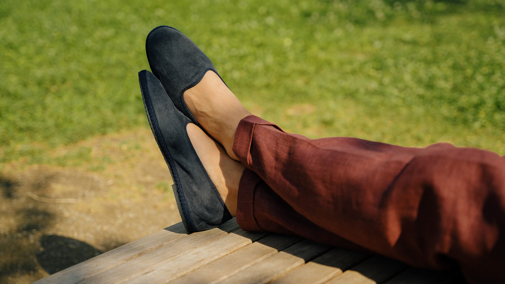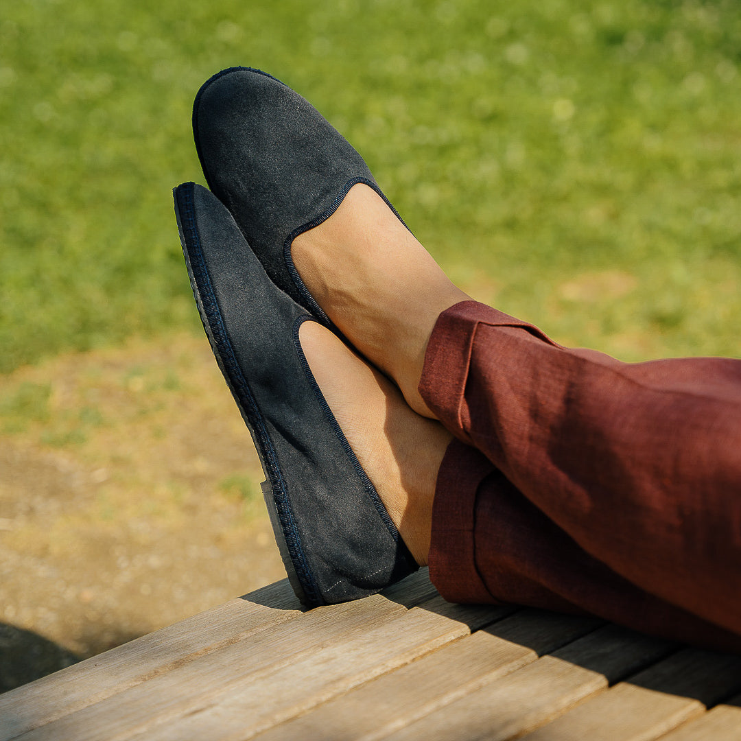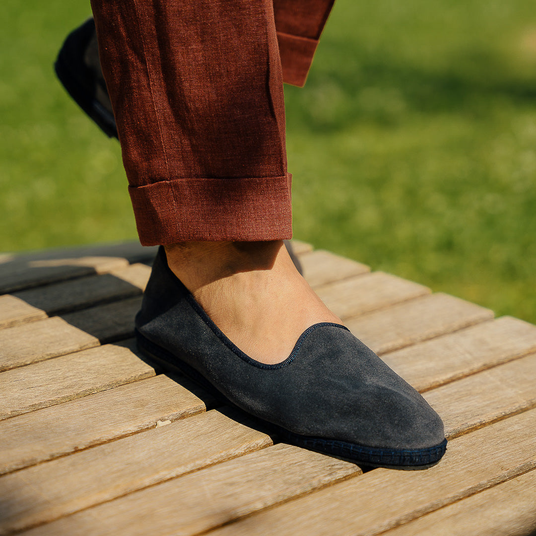 Friulane shoes (or call them Furlanes) are the historical shoes of Friulian tradition: simple lines combined with suede, unlined and with a rubber sole. They were originally homemade by women from villages in the mountains, then they found new life among the Venetian canals: the gondoliers needed a comfortable, stable and delicate shoe on the wood. The hand stitching has remained just as it once was: hands make each shoe a unique piece with their irregular motion. Today these shoes are a symbol of elegance: wear them with burgundy trousers with pleats and a sugar-paper coloured shirt, all in pure linen. A chat in the park.