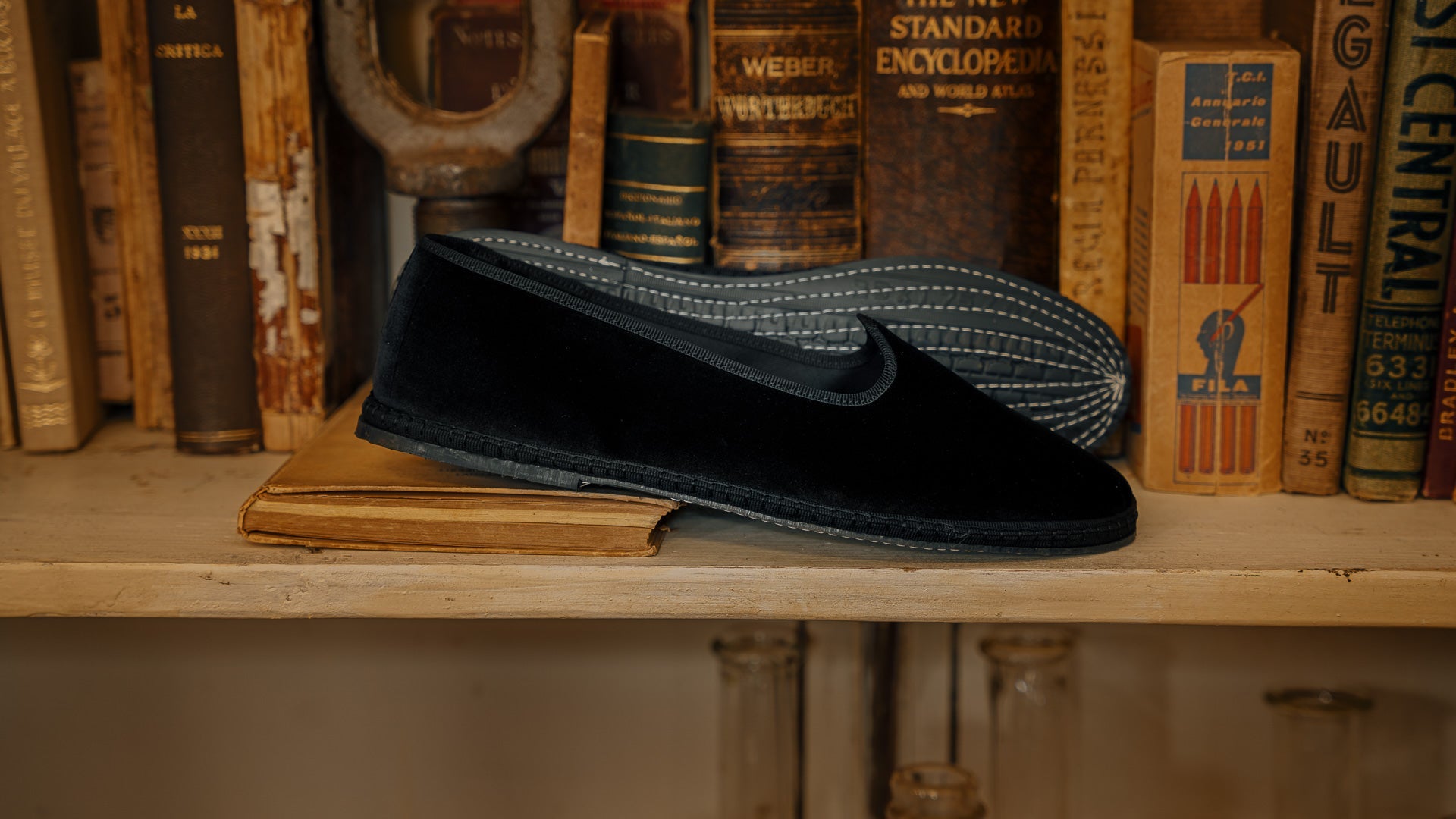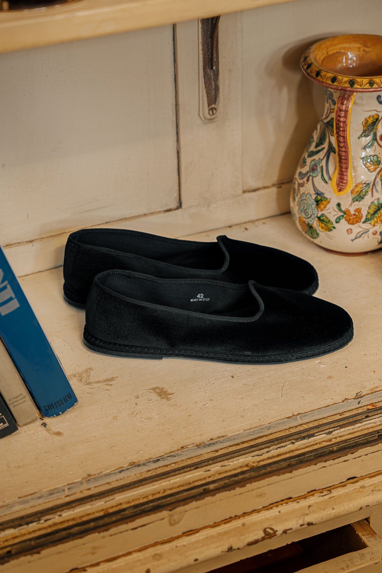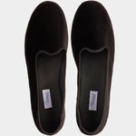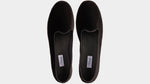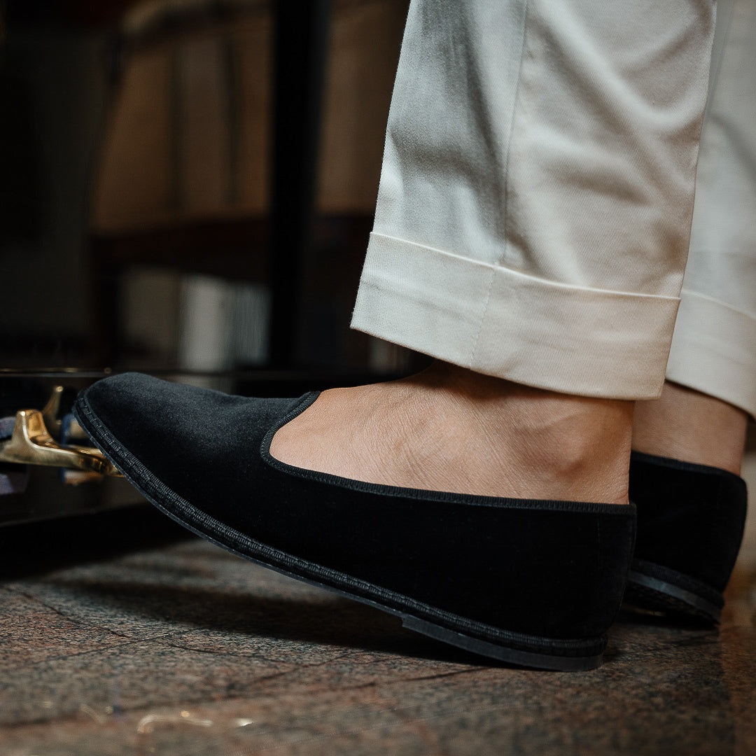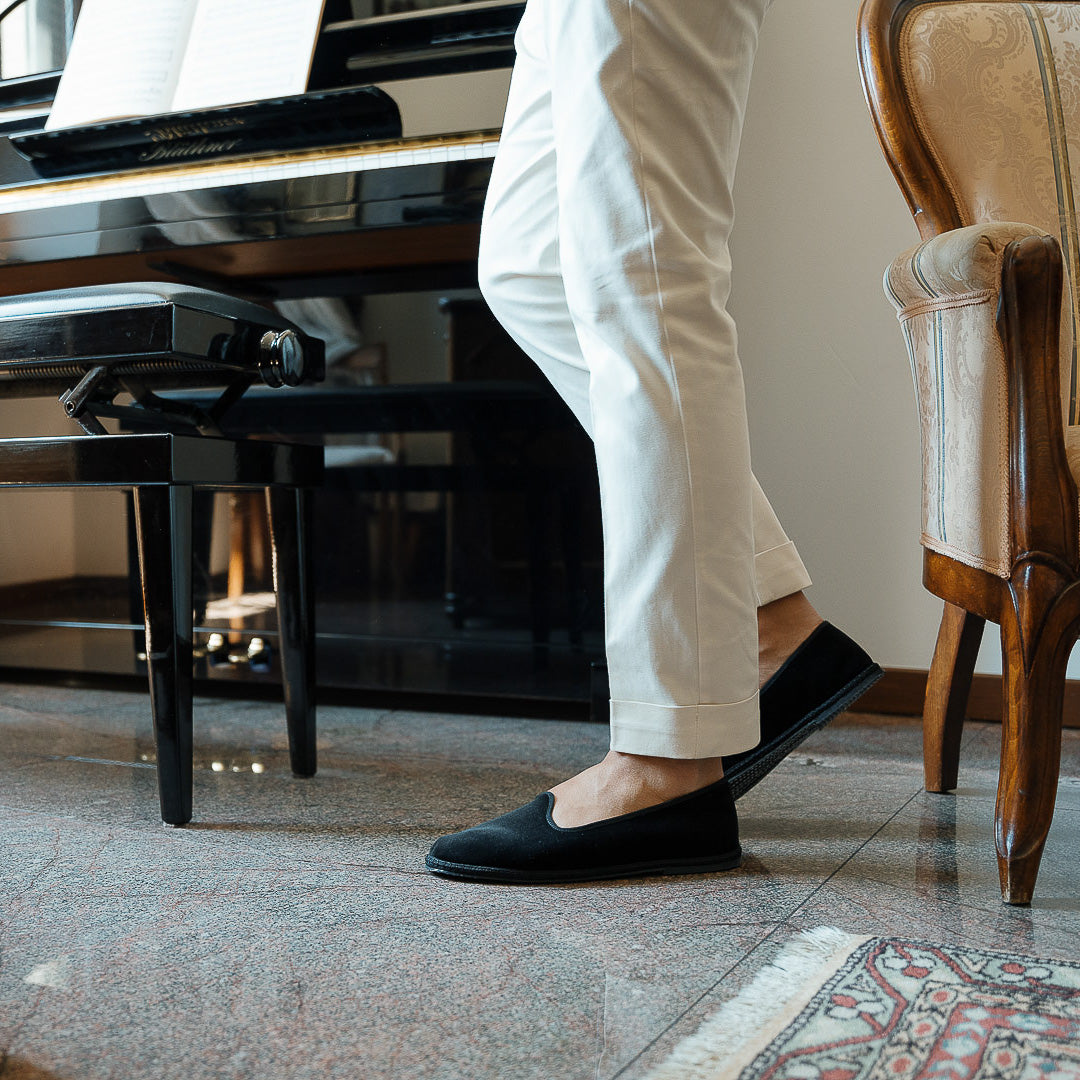 Friulane shoes (or call them Furlanes) are the historical shoes of Friulian tradition: simple lines combined with refined black velvet, fresh cotton lining and rubber sole. They were originally homemade by women from villages in the mountains, then they found new life among the Venetian canals: the gondoliers needed a comfortable, stable and delicate shoe on the wood. The hand stitching has remained just as it once was: hands make each shoe a unique piece with their irregular motion. Today these shoes are a symbol of elegance: wear them with cotton and cream-coloured linen trousers, with pleats, and jersey polo shirts in peach tones. Let them be your slippers at home, if you are one of those who never give up class.