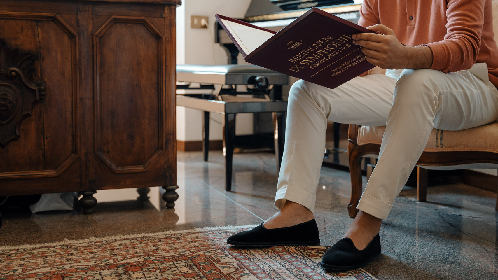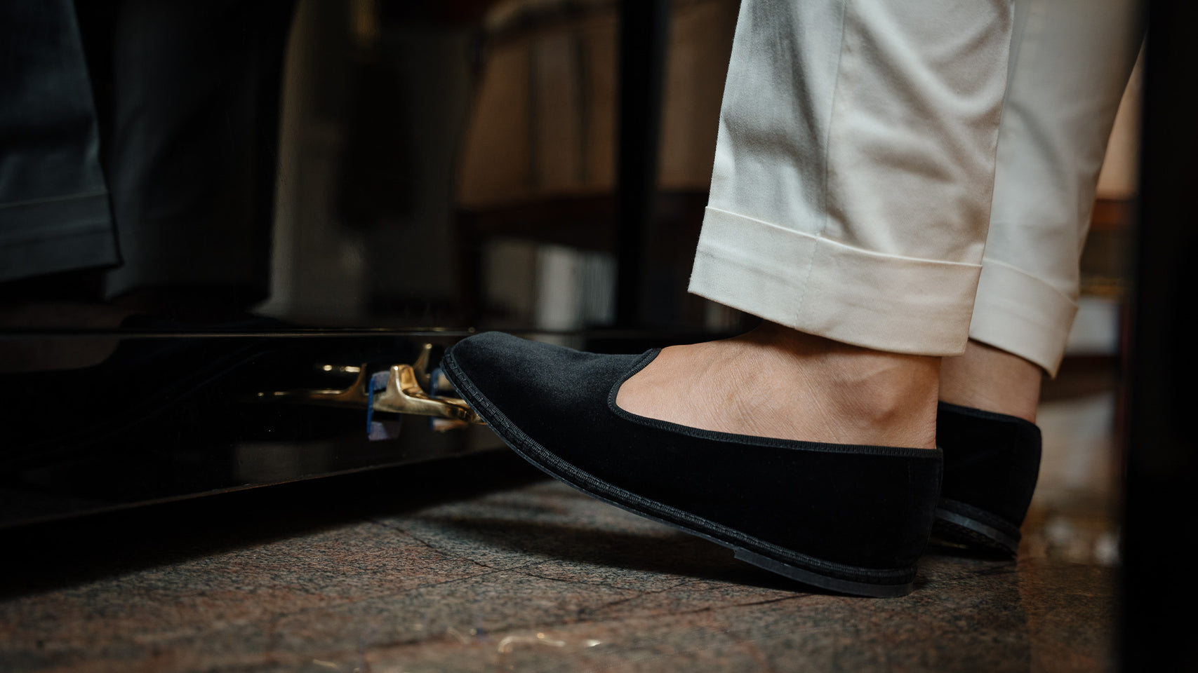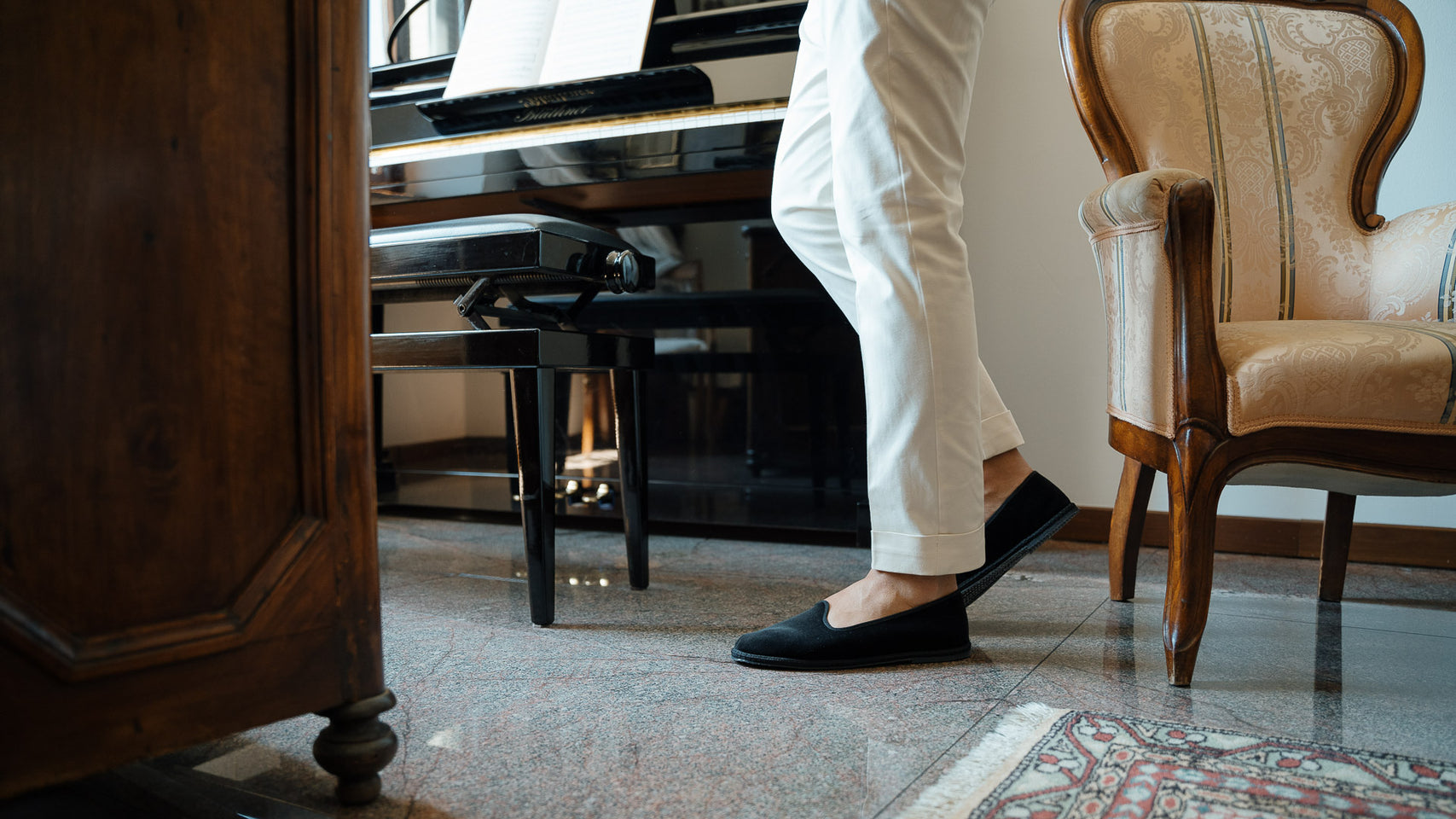 Friulane shoes (or call them Furlanes) are the historical shoes of Friulian tradition: simple lines combined with refined black velvet, fresh cotton lining and rubber sole. They were originally homemade by women from villages in the mountains, then they found new life among the Venetian canals: the gondoliers needed a comfortable, stable and delicate shoe on the wood. The hand stitching has remained just as it once was: hands make each shoe a unique piece with their irregular motion. Today these shoes are a symbol of elegance: wear them with cotton and cream-coloured linen trousers, with pleats, and jersey polo shirts in peach tones. Let them be your slippers at home, if you are one of those who never give up class.