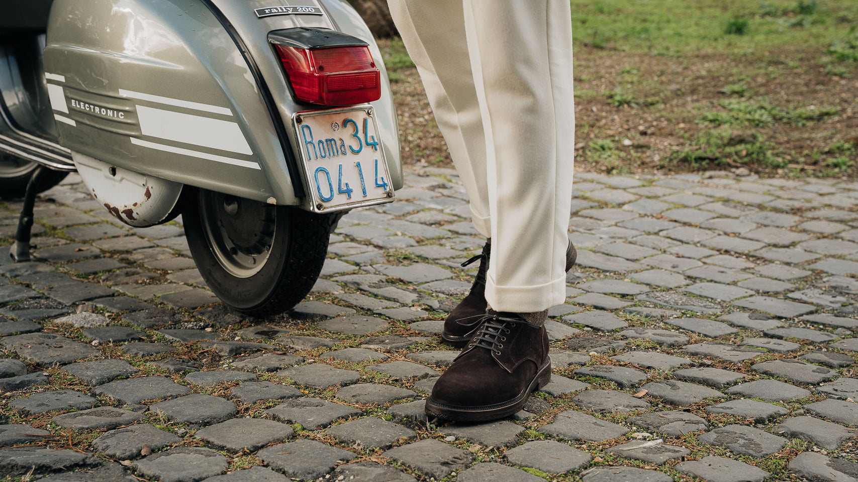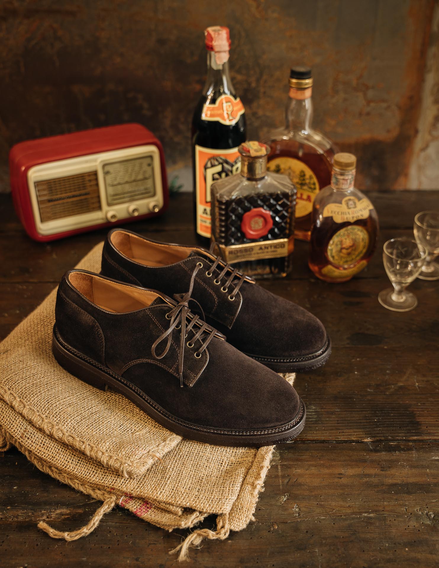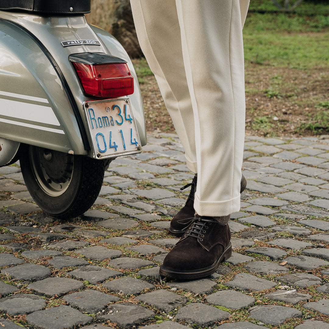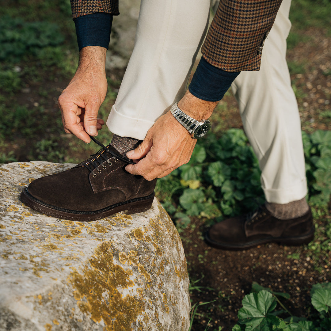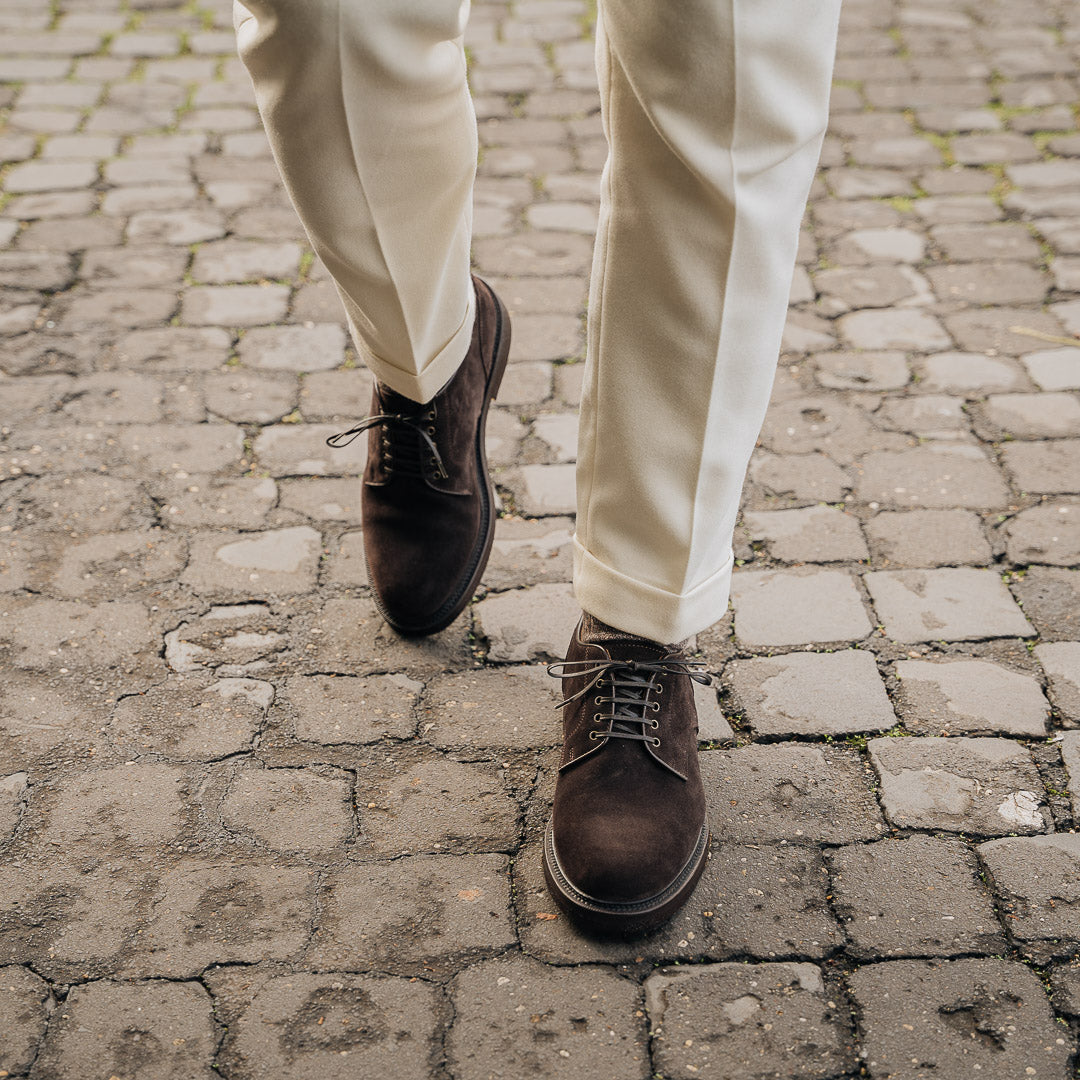 Derbies with para sole, made of suede calfskin, complete a relaxed style, inspired by the bohemian way of life. Inside, the integrated insole follows the shape of your foot to give you comfort at every step; under the insole, the craftsman has inserted another soft layer to insulate the foot and make them even more comfortable. Wear them with double pleated wool-and-cashmere trousers, a woven Velasca belt, a denim shirt and a vintage jacket.