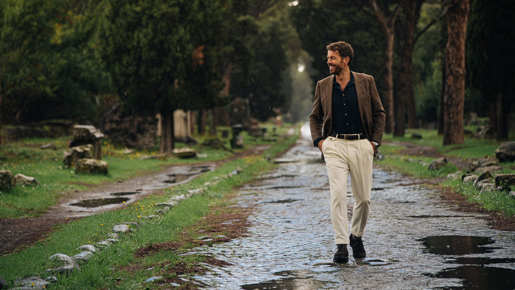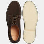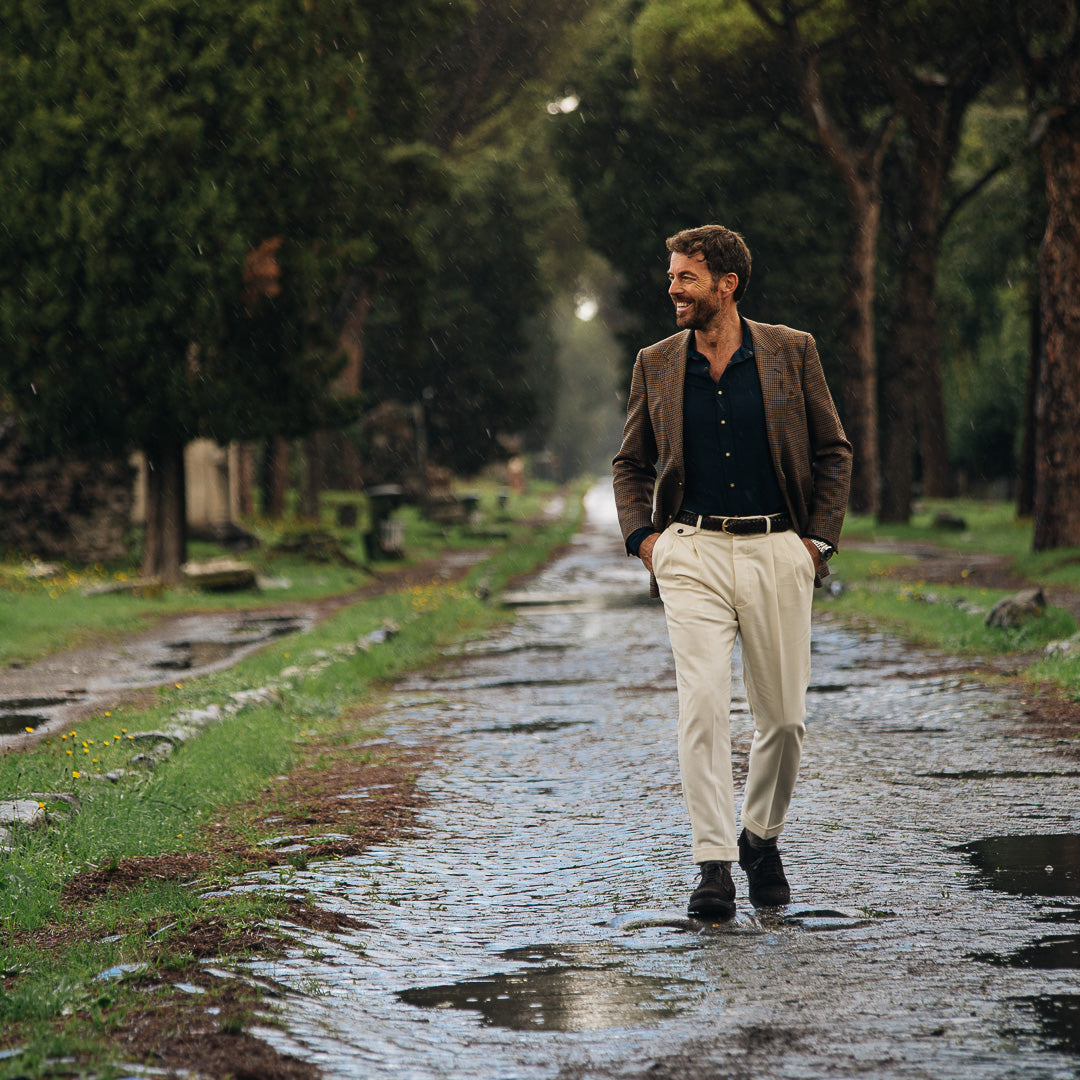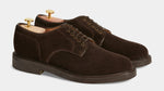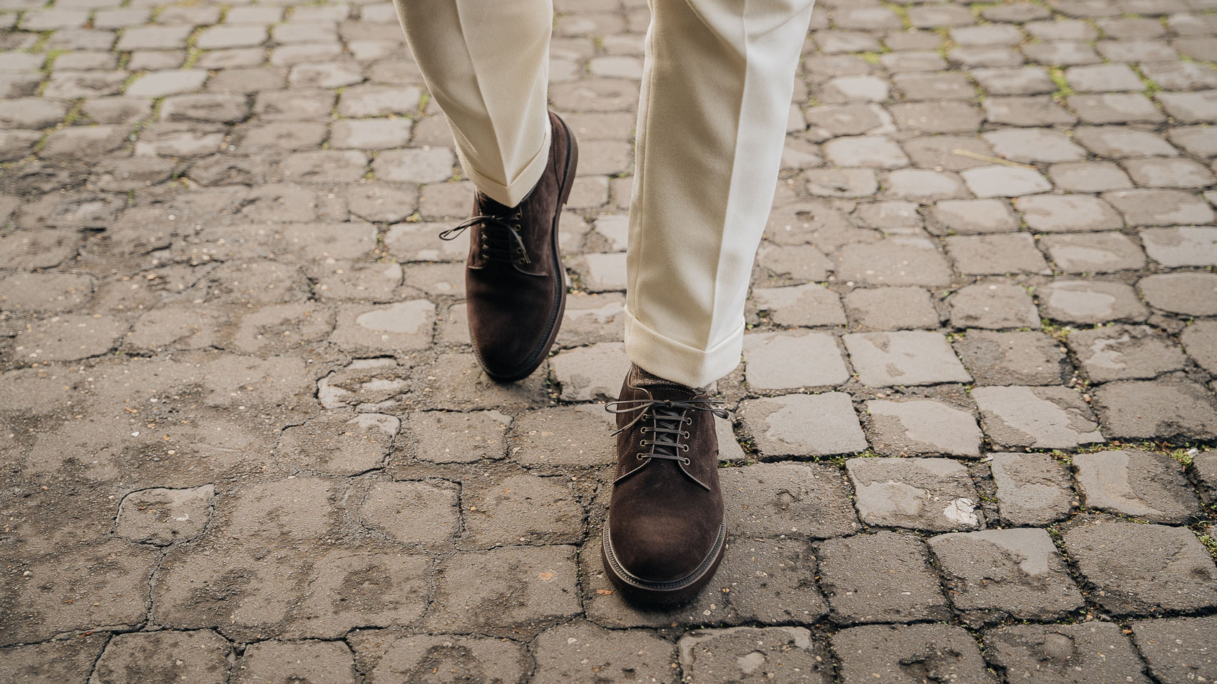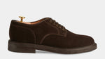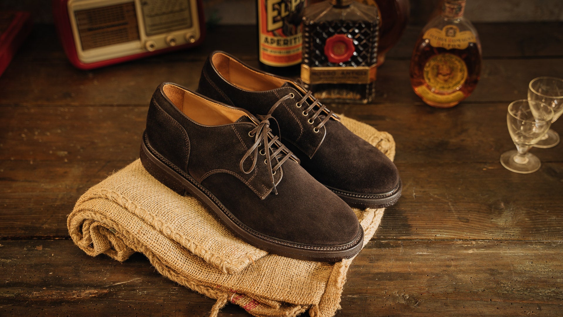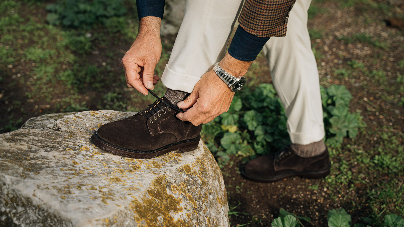 Derbies with para sole, made of suede calfskin, complete a relaxed style, inspired by the bohemian way of life. Inside, the integrated insole follows the shape of your foot to give you comfort at every step; under the insole, the craftsman has inserted another soft layer to insulate the foot and make them even more comfortable. Wear them with double pleated wool-and-cashmere trousers, a woven Velasca belt, a denim shirt and a vintage jacket.