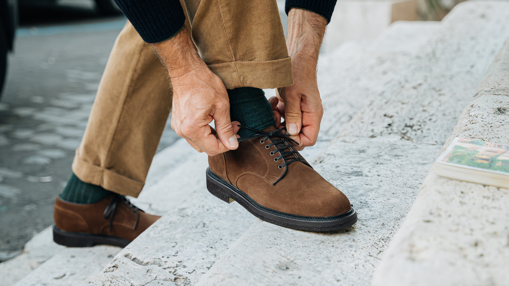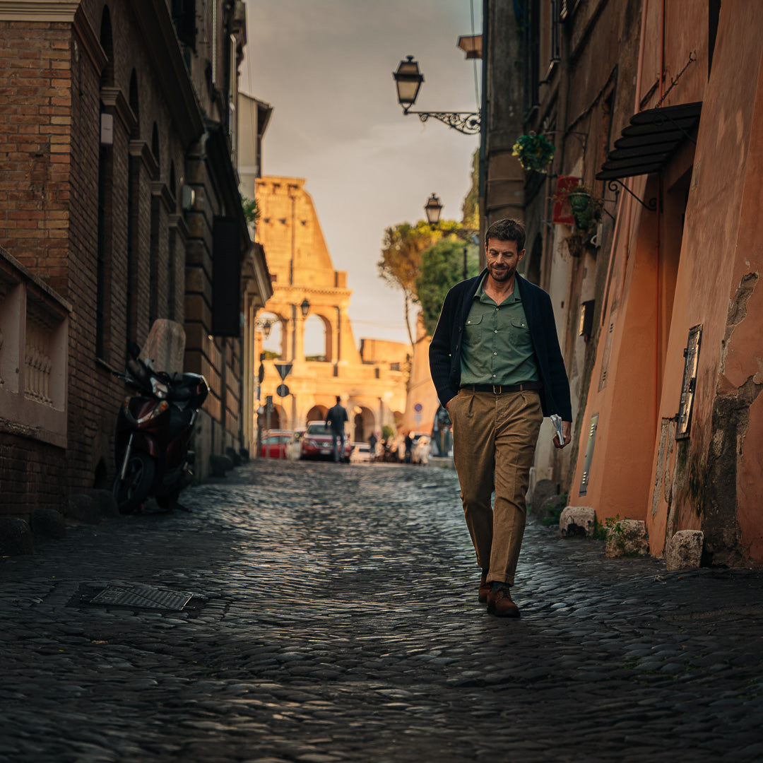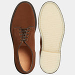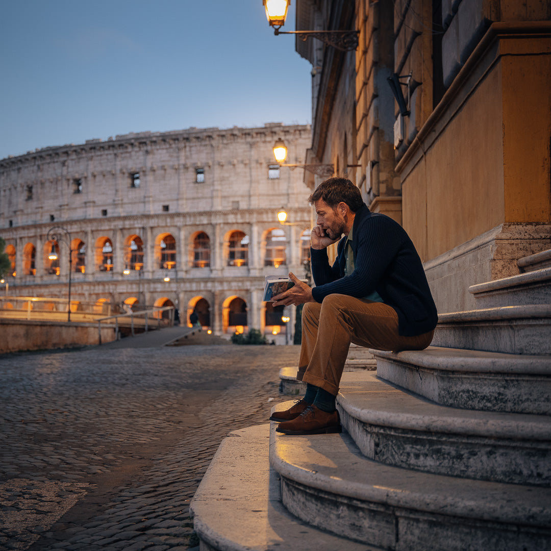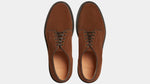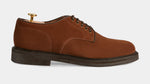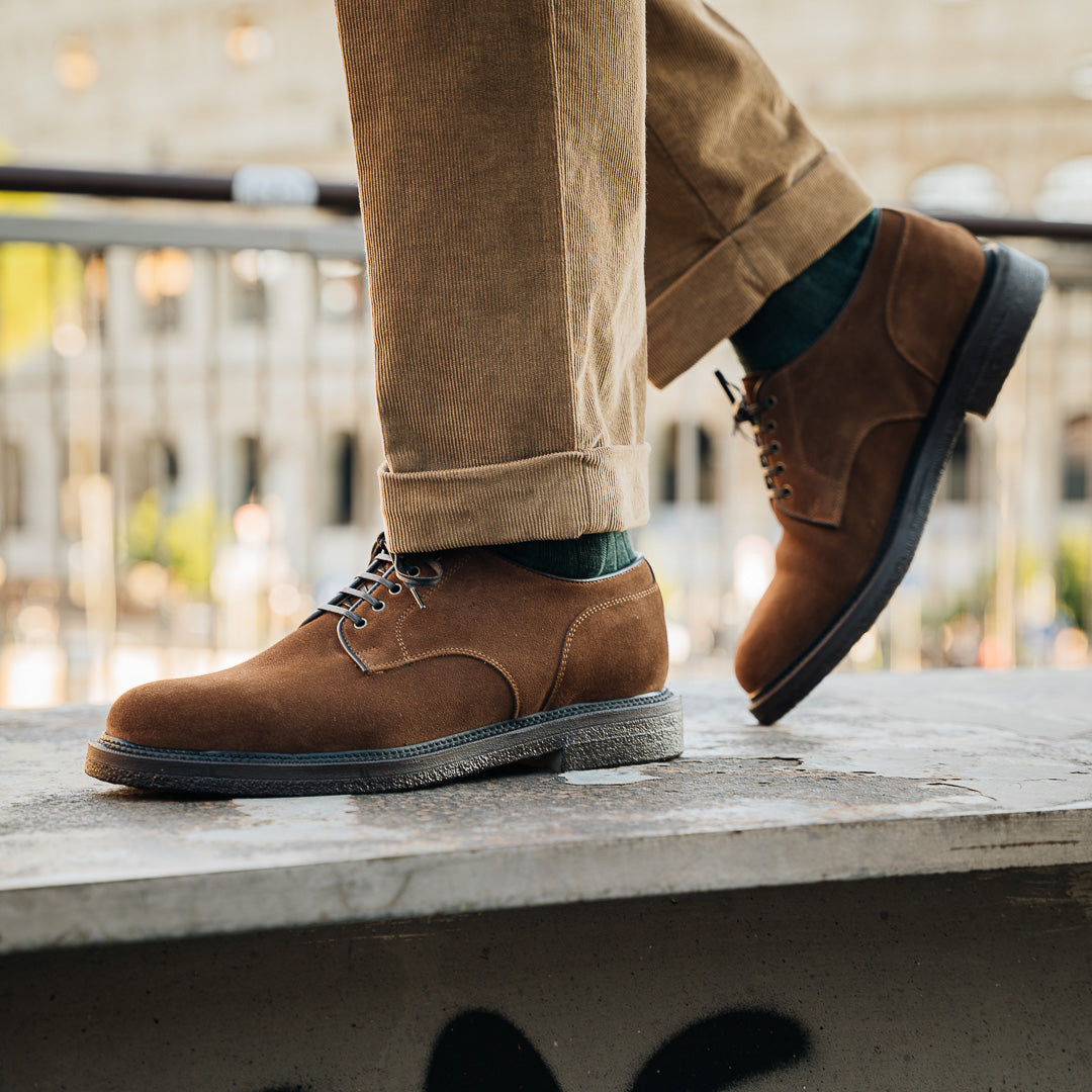 Derbies with para sole, made of suede calfskin, complete a relaxed style, inspired by the bohemian way of life. Inside, the integrated insole follows the shape of your foot to give you comfort at every step; under the insole, the craftsman has inserted another soft layer to insulate the foot and make them even more comfortable. Wear them with velvet trousers with pleats, a woven Velasca belt, a Hawaiian-style shirt and a corduroy cardigan with a shawl collar.