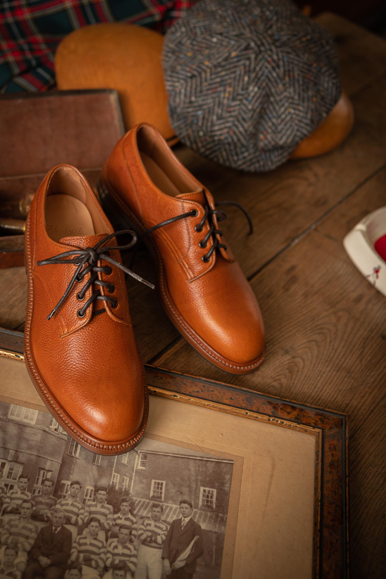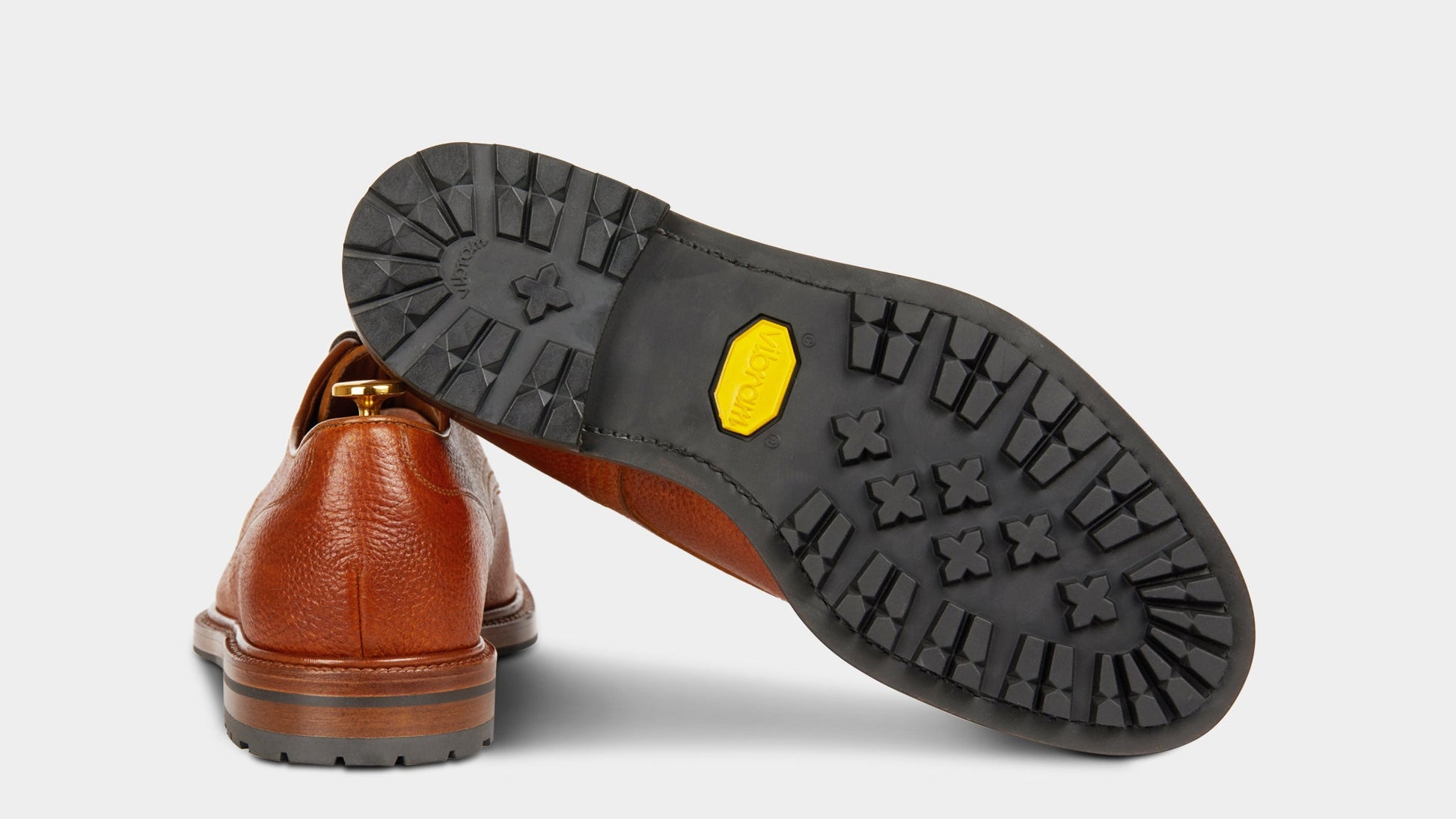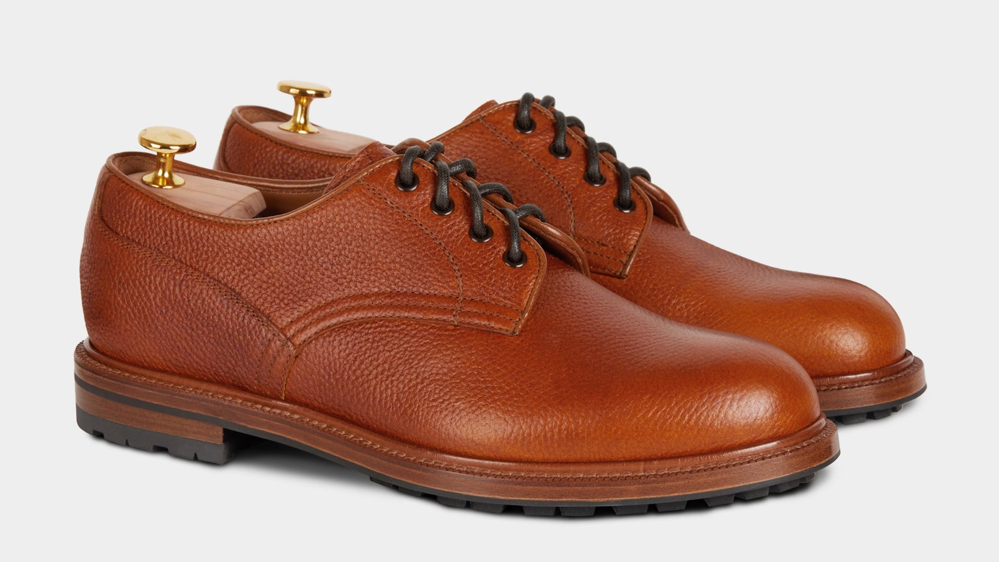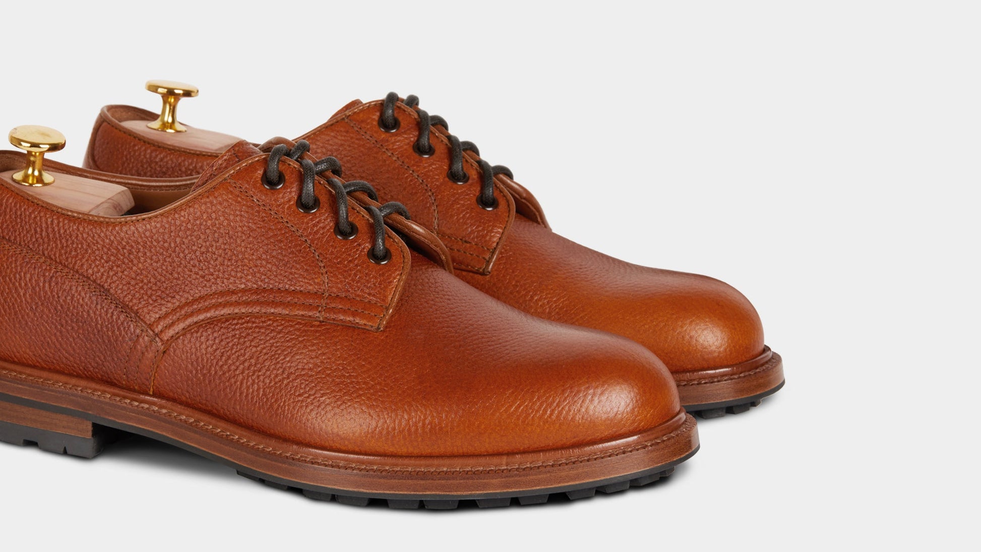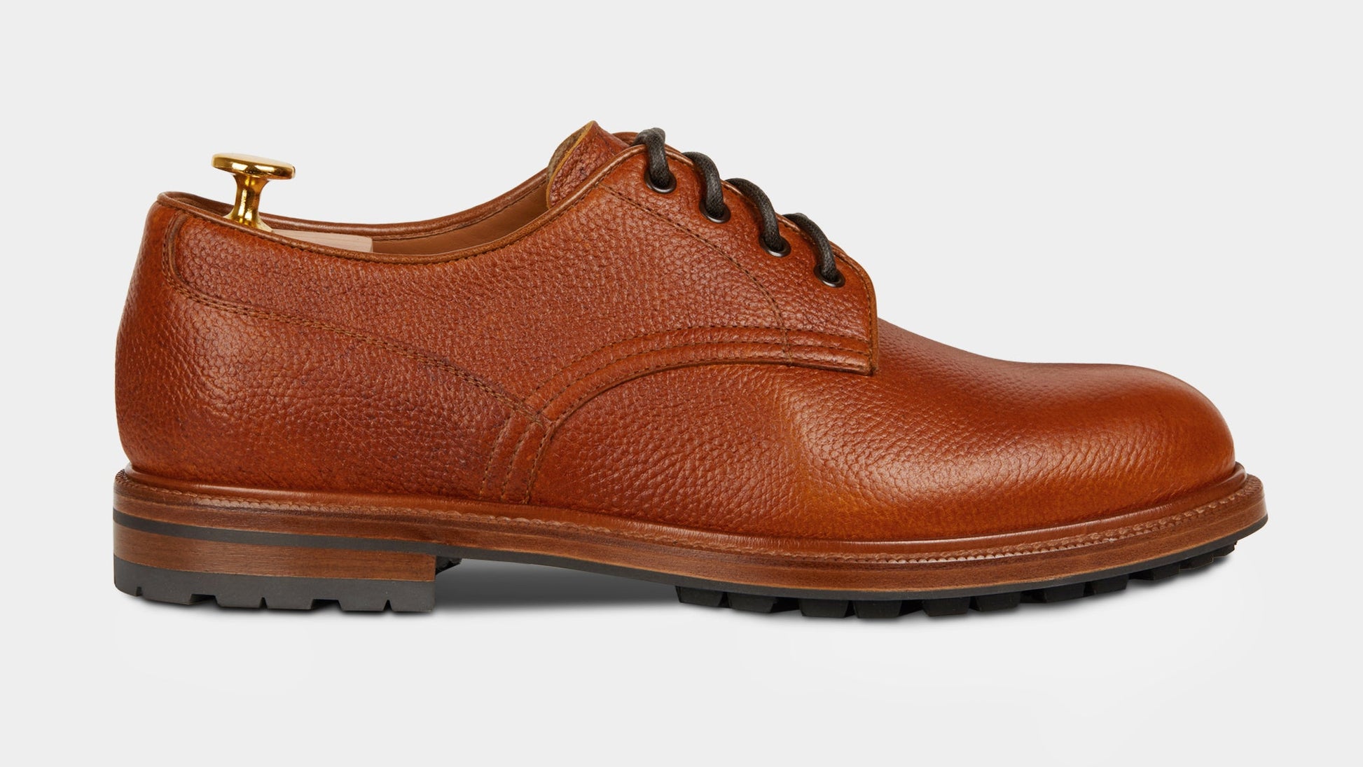 The casual derby with kudu grain leather, exhibiting this wild animal's small imperfections and expressing its country soul. The simplicity of this cognac derby makes it perfect ever with jeans and a denim shirt, you just know that even rainy days are never a problem with a Vibram sole, just like your weekends in the countryside.