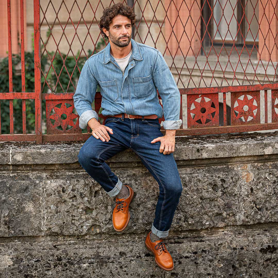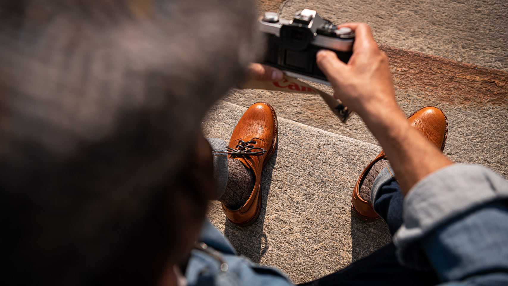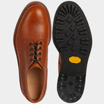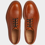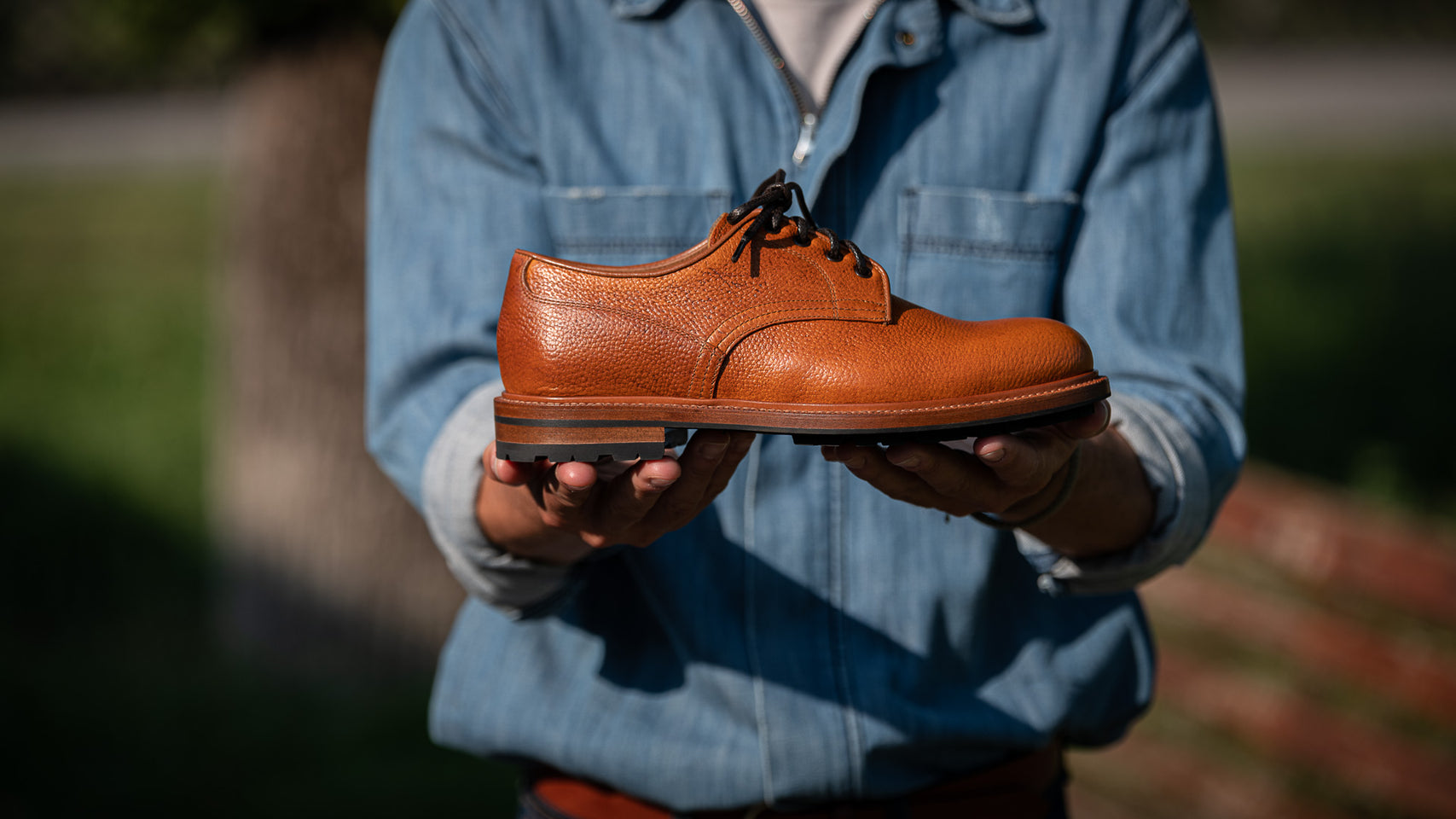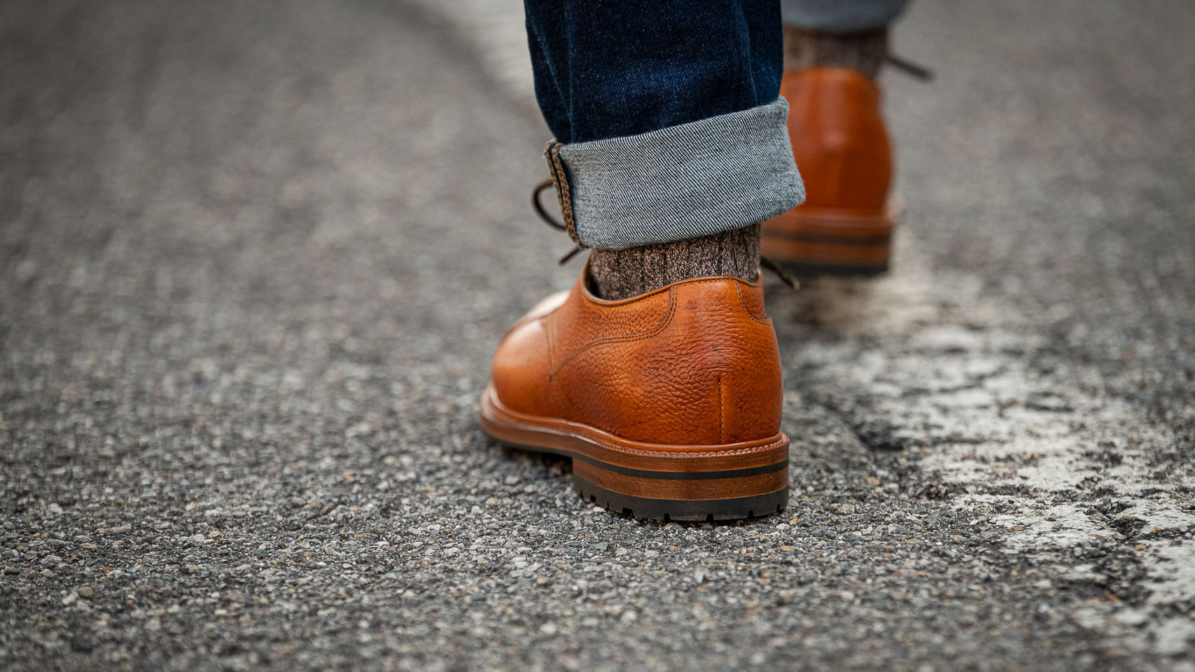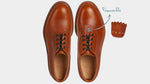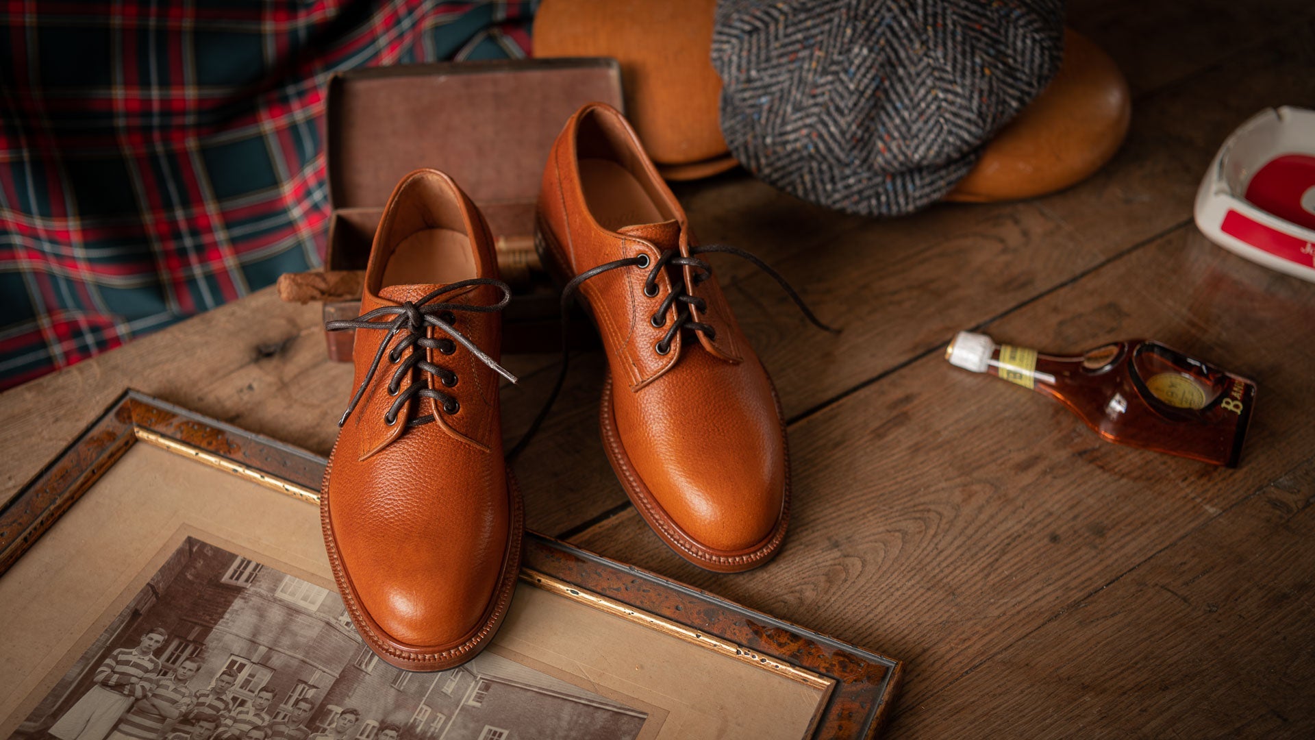 The casual derby with kudu grain leather, exhibiting this wild animal's small imperfections and expressing its country soul. The simplicity of this cognac derby makes it perfect ever with jeans and a denim shirt, you just know that even rainy days are never a problem with a Vibram sole, just like your weekends in the countryside.