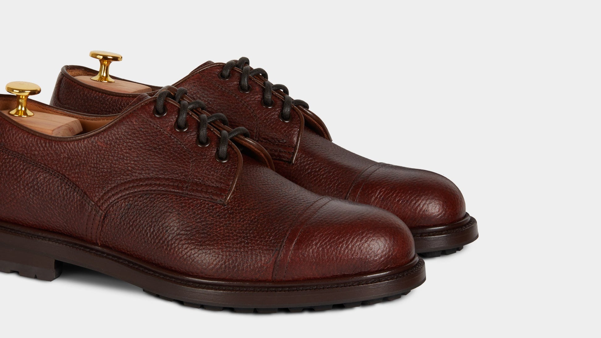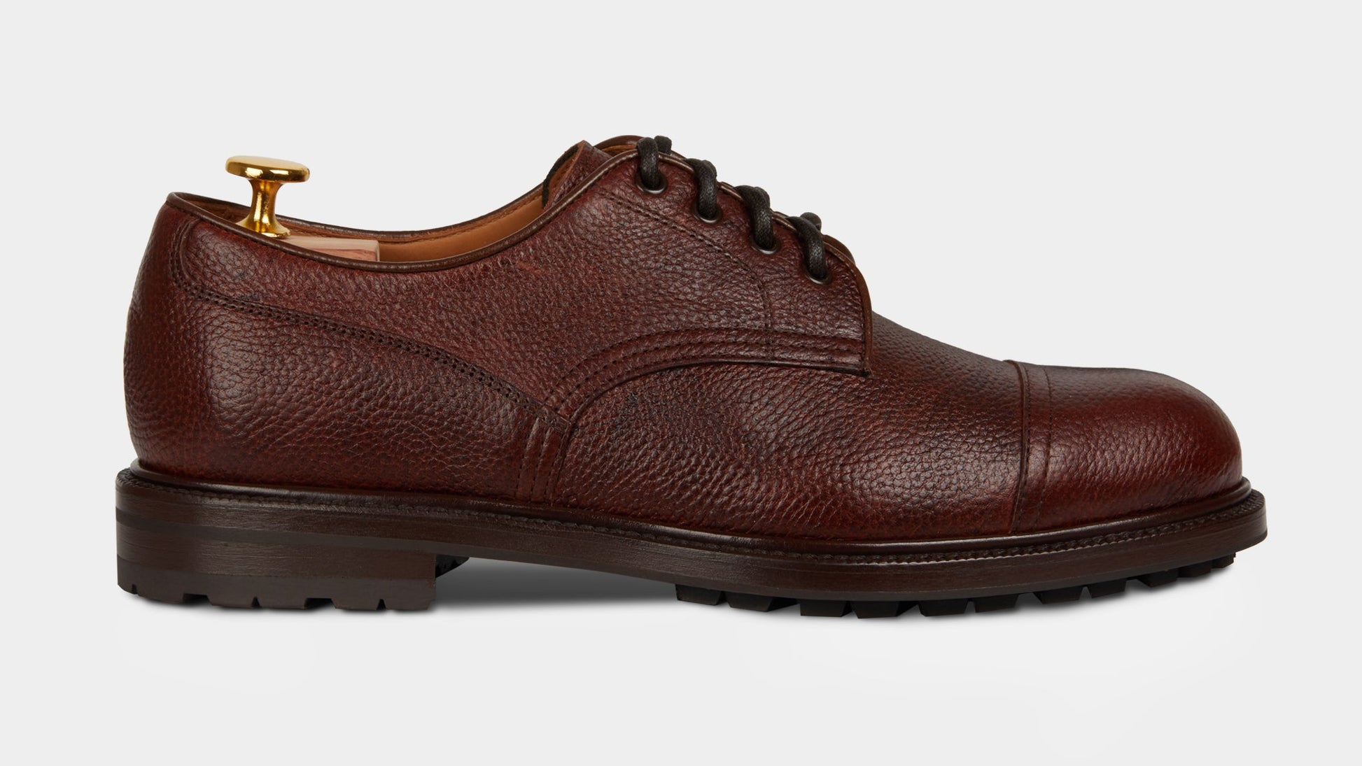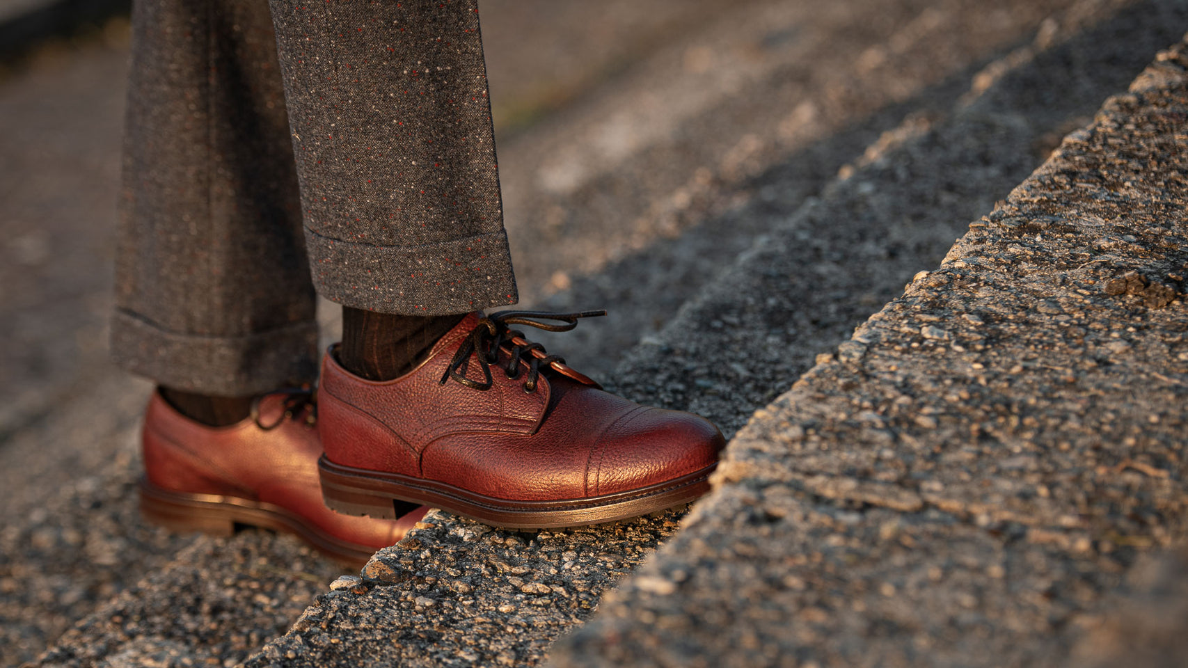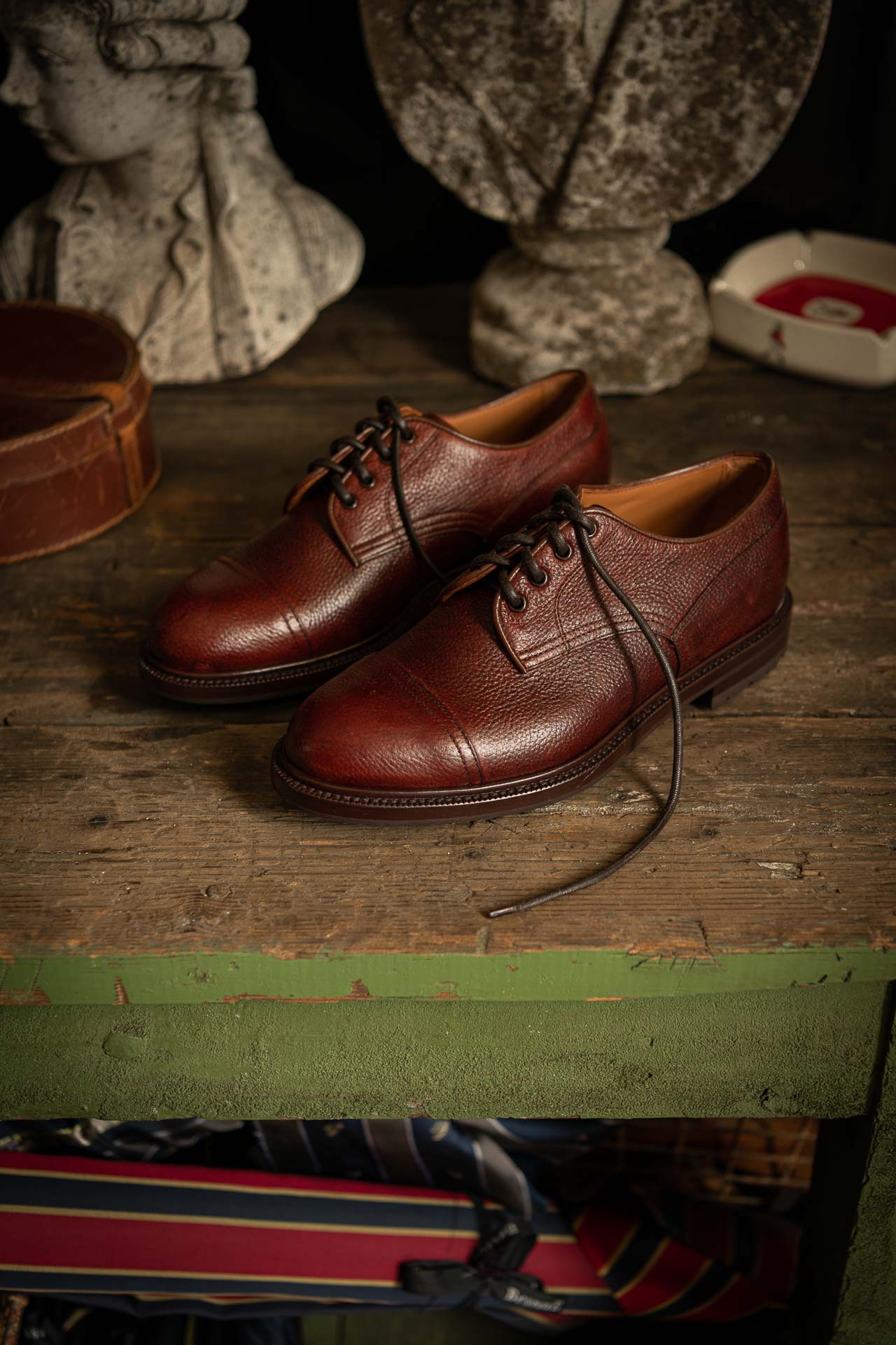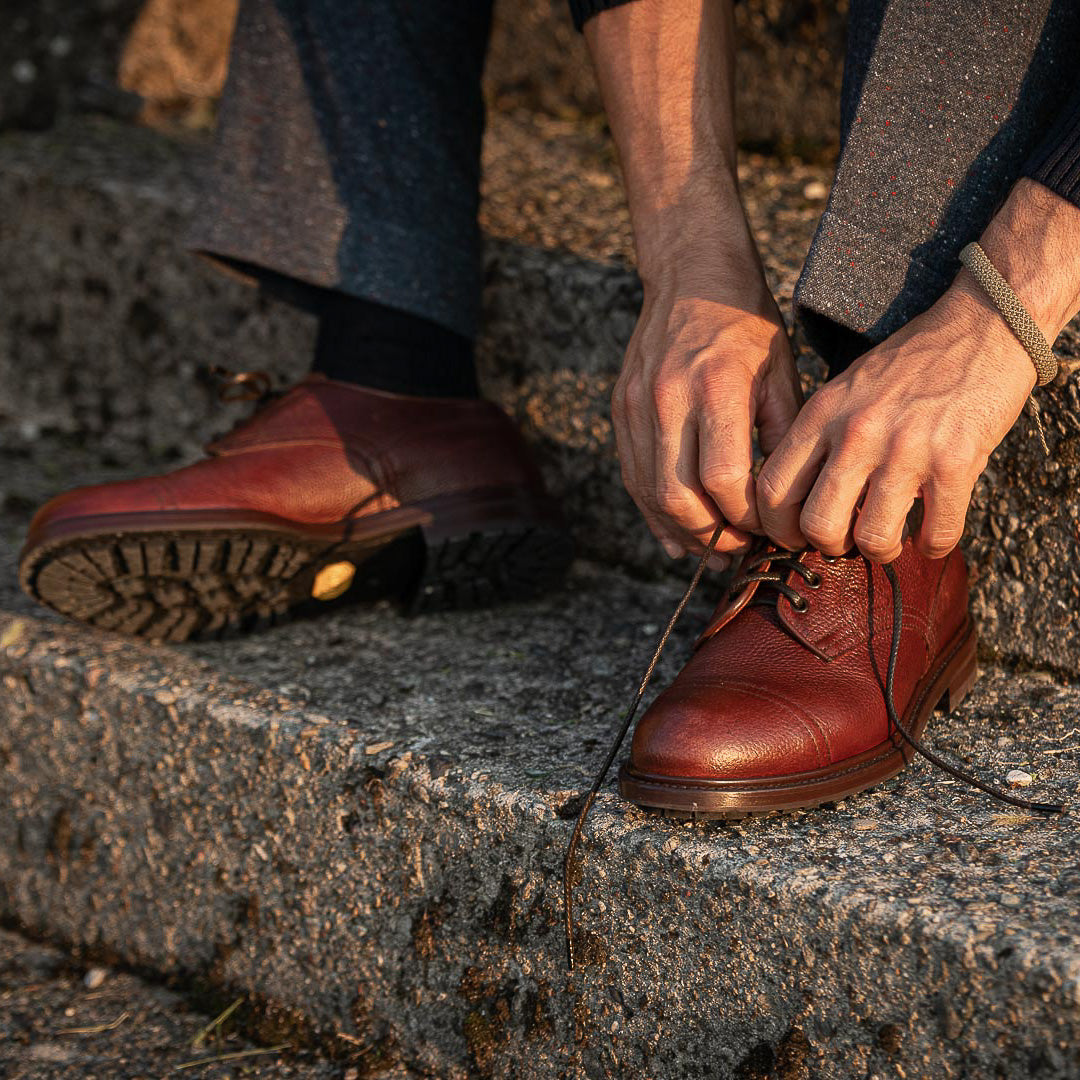 The casual derby with kudu grain leather, exhibiting this wild animal's small imperfections and expressing its country soul. Its elaborate toe box makes it perfect for men who pay attention to details: wear your burgundy derby with a wool trousers, you just know that even rainy days are never a problem with a Vibram sole, just like your weekends in the countryside.