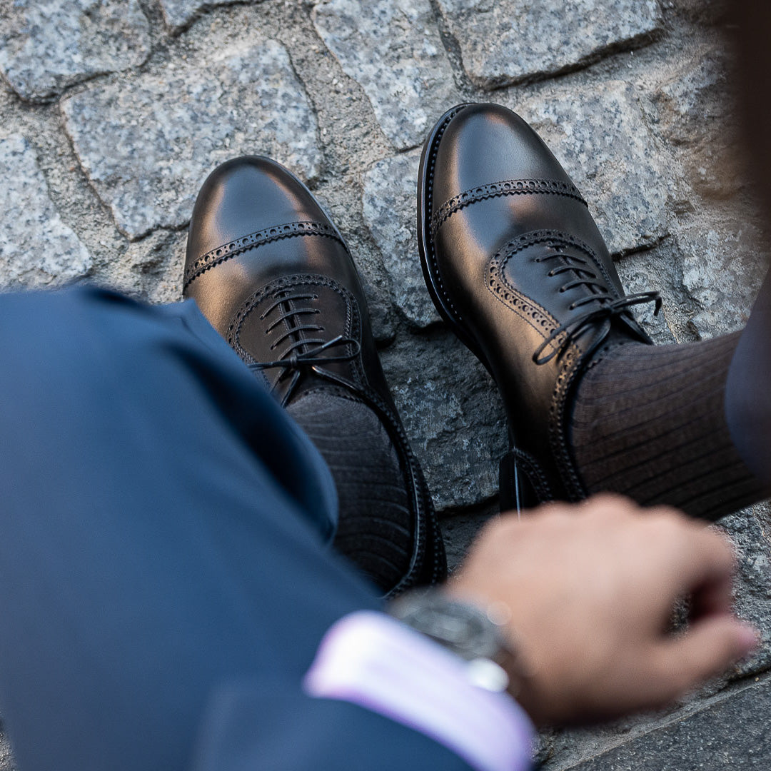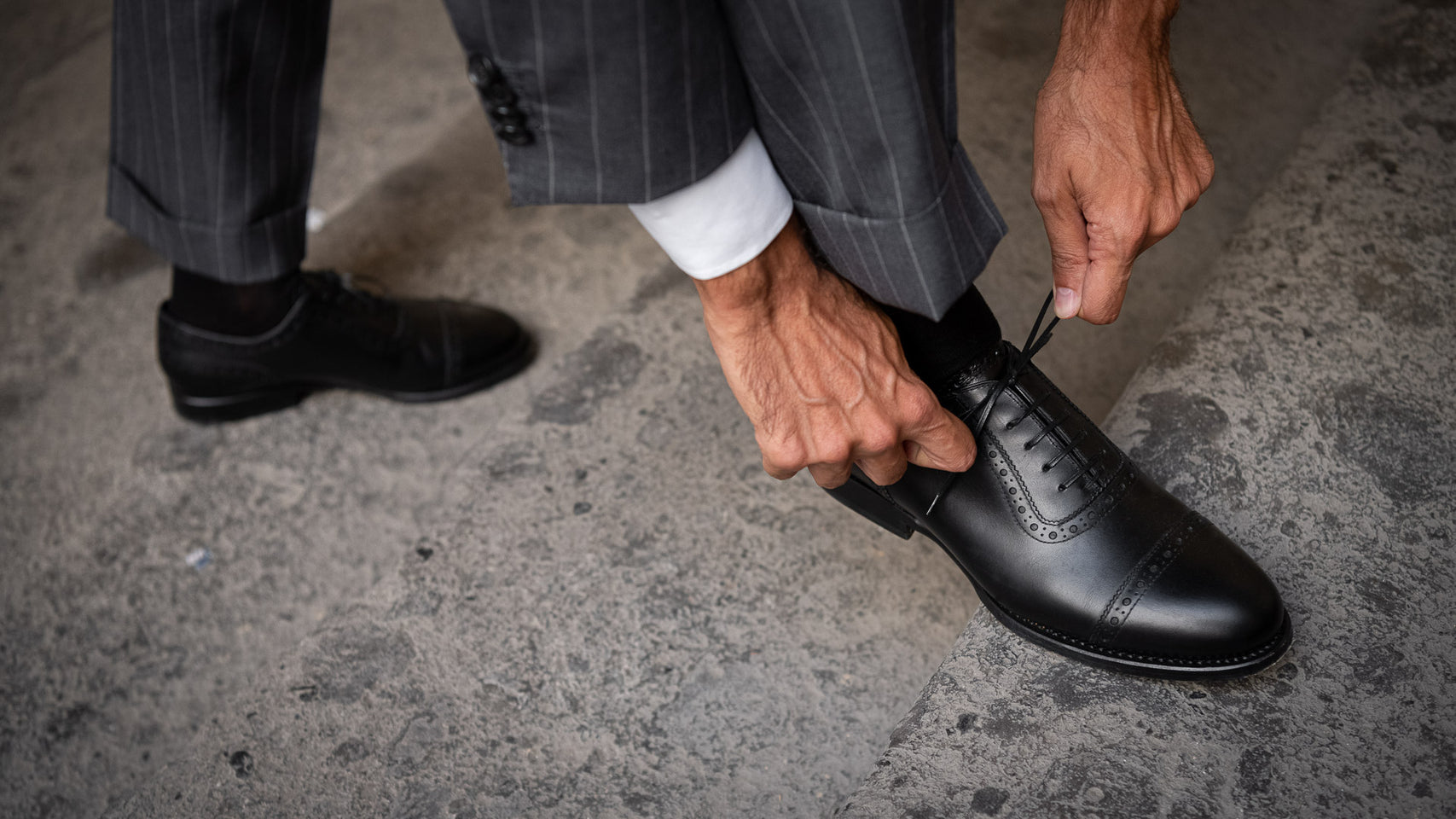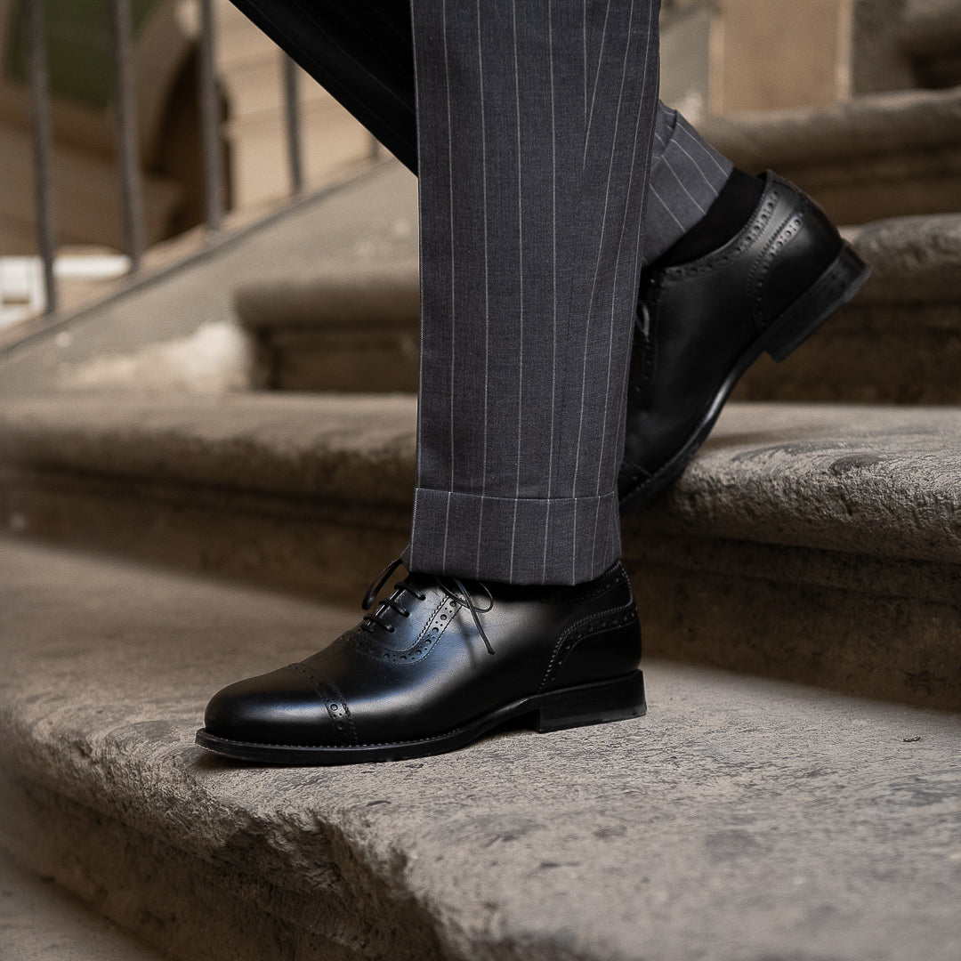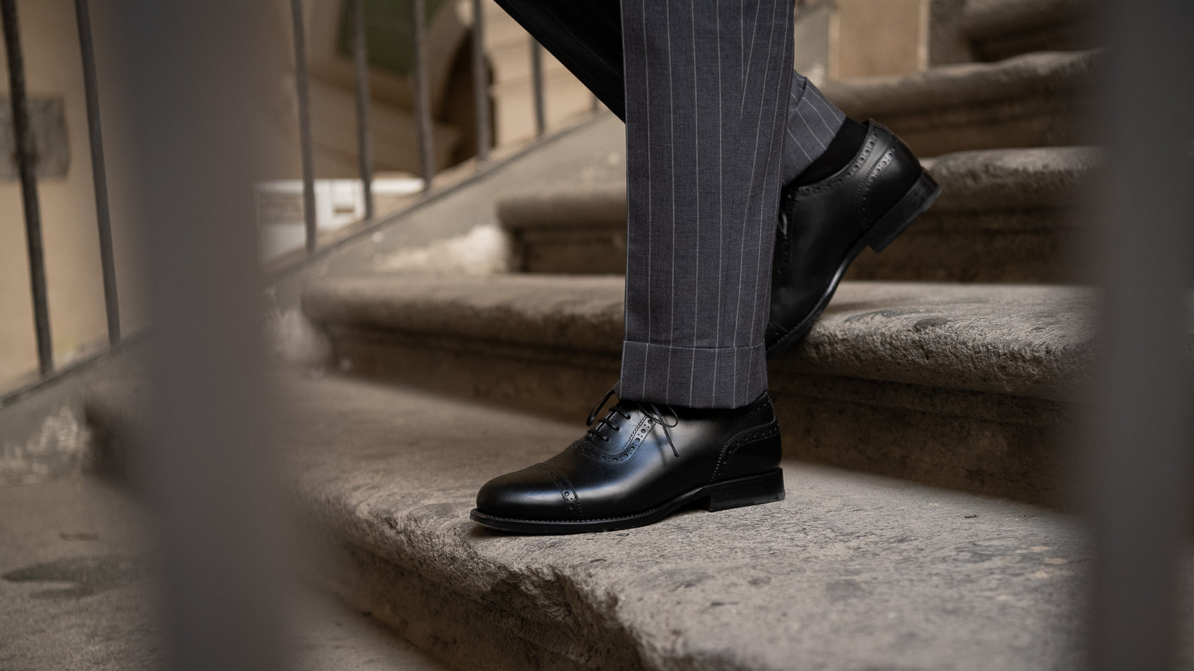 The semi-brogue designed by Fabio Attanasio for Velasca in smooth, fine and resistant calfskin: the older it gets, the better. The leather sole has a small rubber island so, together with the integrated sole, each step will be more comfortable. At a meeting, a light gray elegant suit and a shirt with an Italian collar.