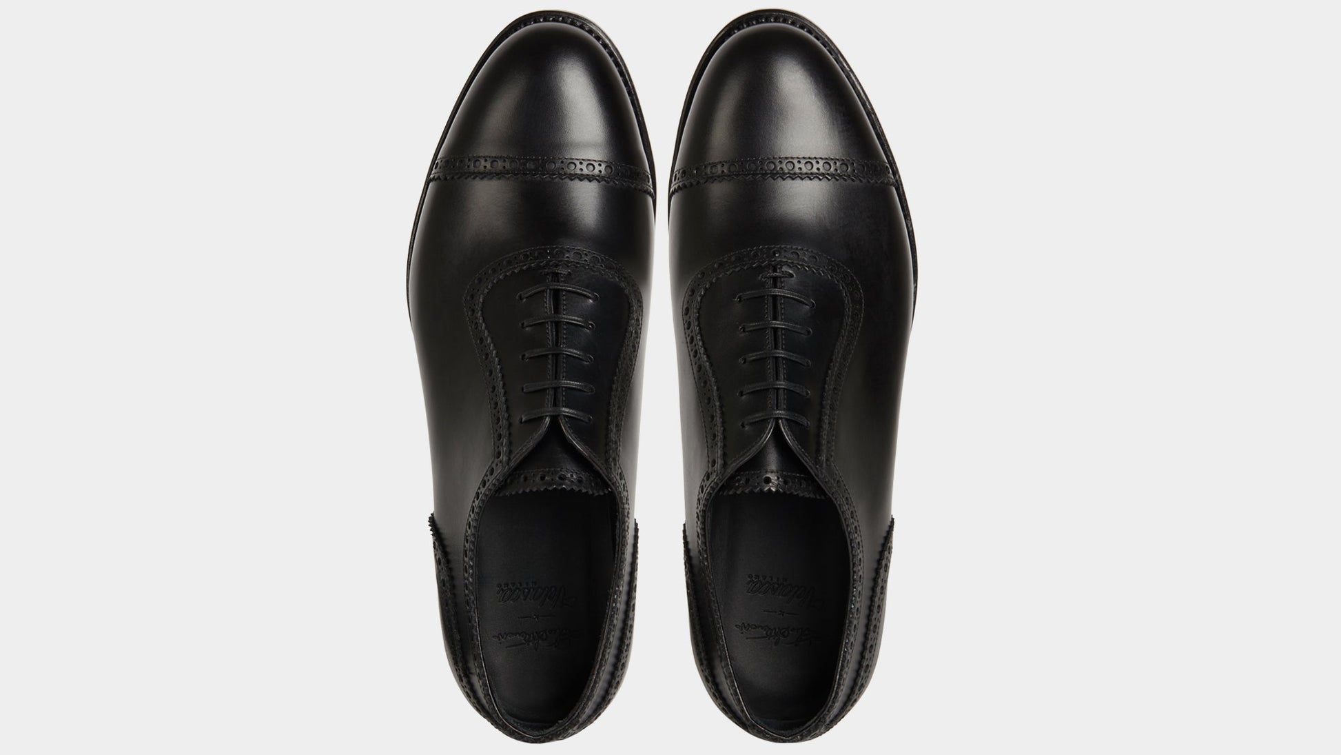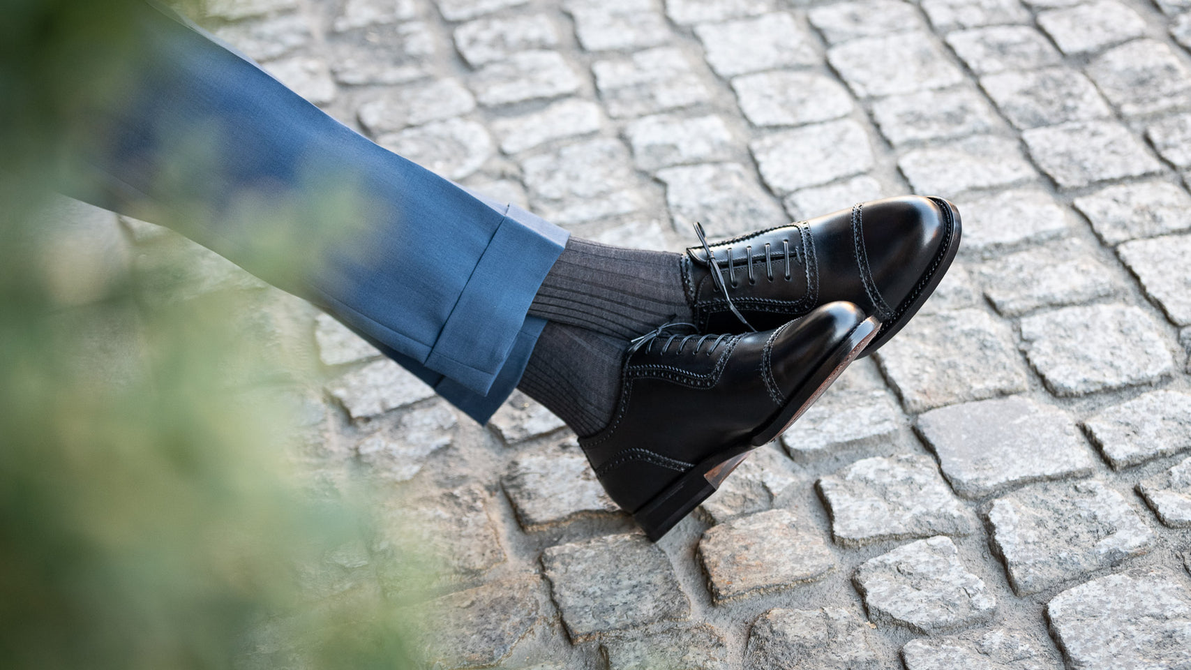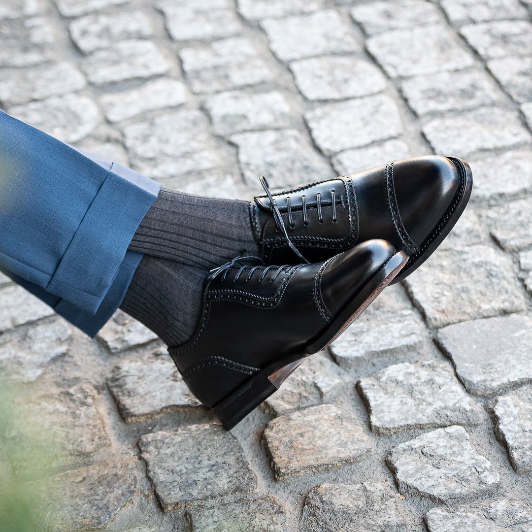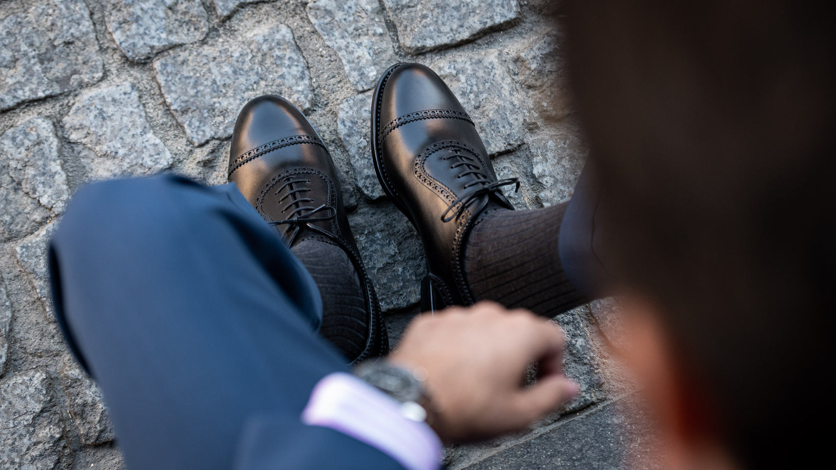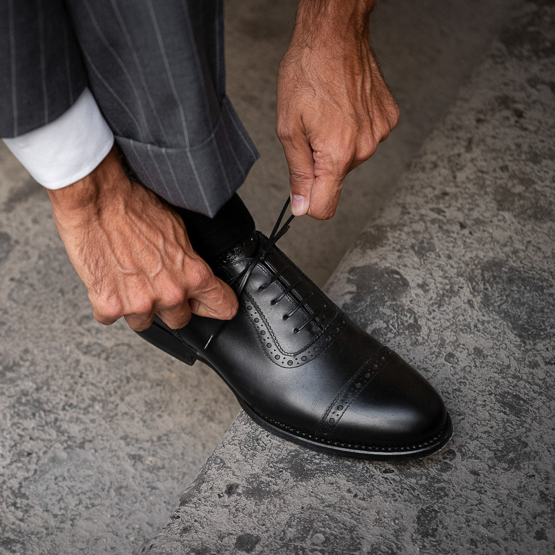 The semi-brogue designed by Fabio Attanasio for Velasca in smooth, fine and resistant calfskin: the older it gets, the better. The leather sole has a small rubber island so, together with the integrated sole, each step will be more comfortable. At a meeting, a light gray elegant suit and a shirt with an Italian collar.