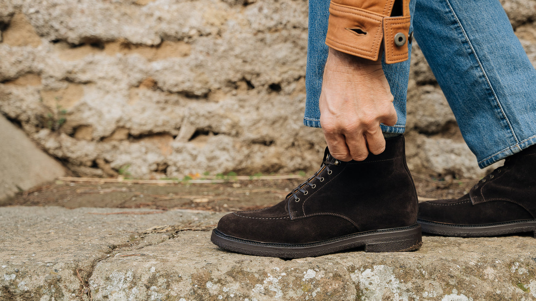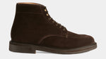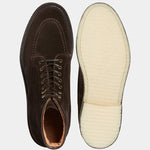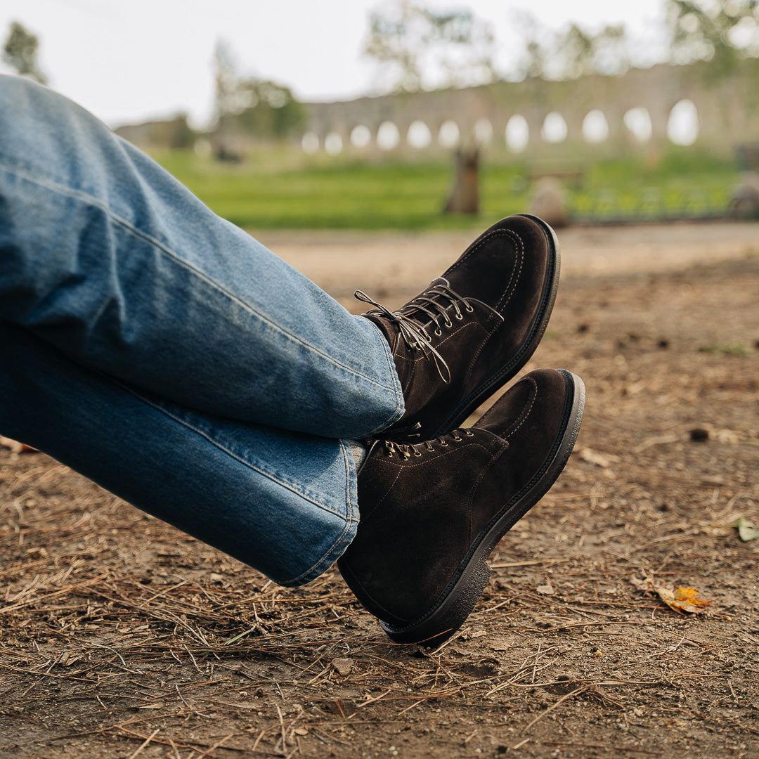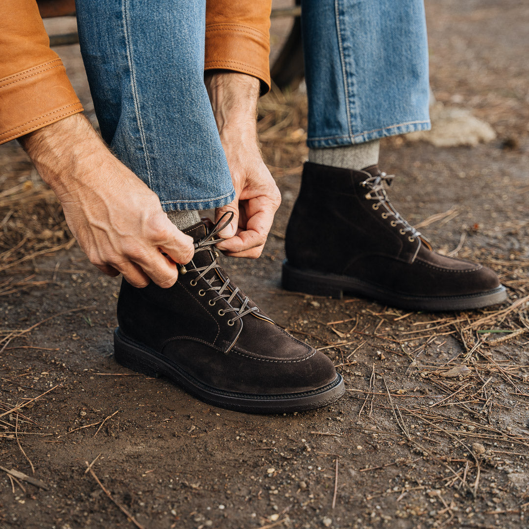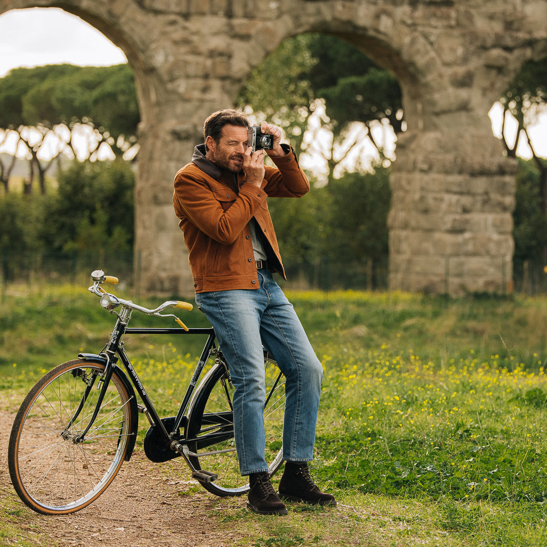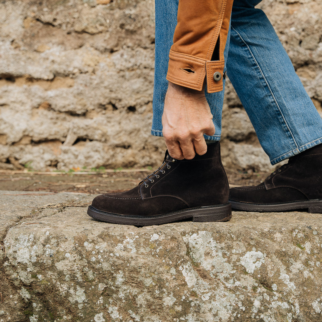 Laced boots with para sole, made in suede calfskin, complete a relaxed style, inspired by the bohemian way of life. Inside, the integrated insole follows the shape of your foot to give you comfort at every step; under the insole, the craftsman has inserted another soft layer to insulate the foot and make them even more comfortable. The eyelets are brass-coloured, but instead of the classic eyelets on the end of the throatline, you will find four refined hooks: they will make your boot as informal as it is memorable. Wear them with light-coloured jeans, a leather belt, a melange grey Velasca t-shirt and a suede beige jacket with dark brown trimmings.
