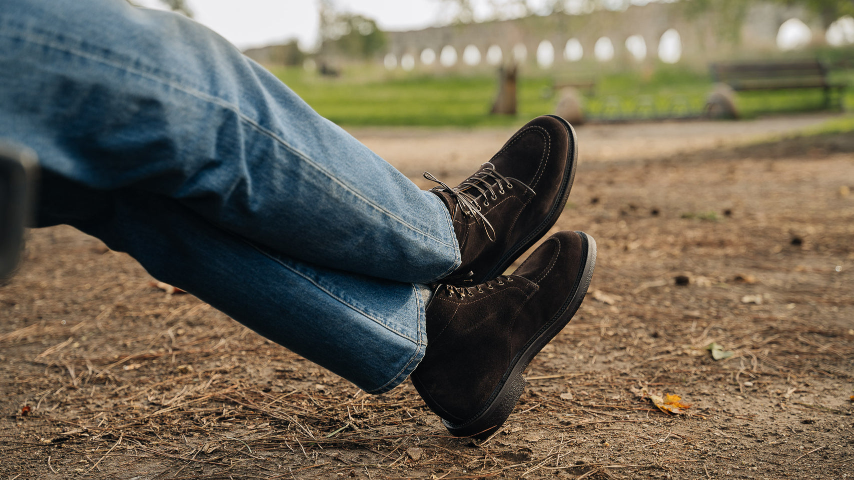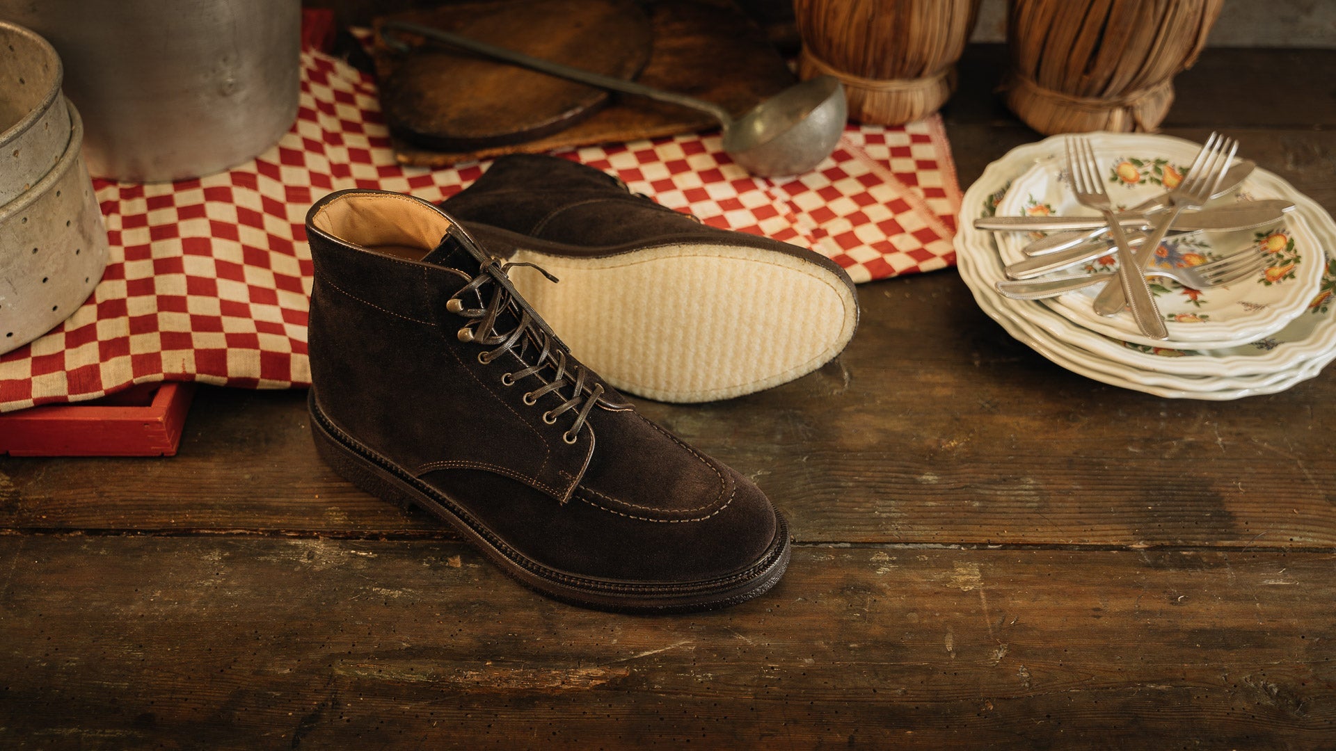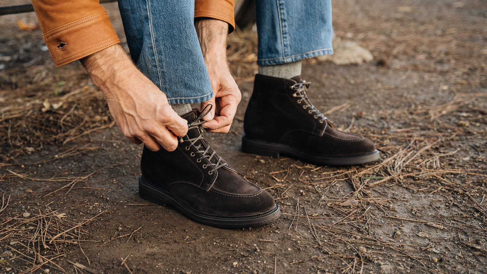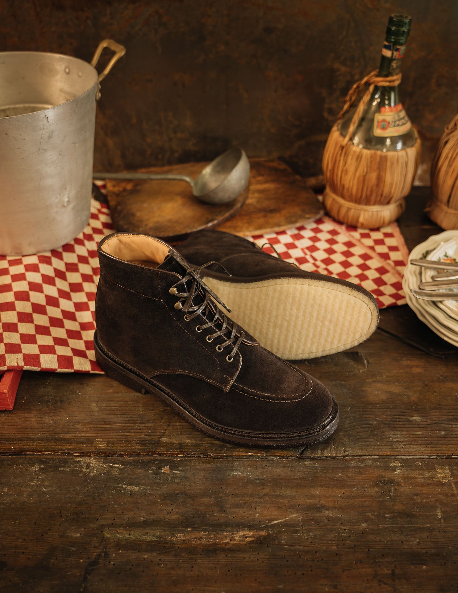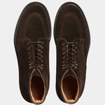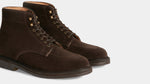 Laced boots with para sole, made in suede calfskin, complete a relaxed style, inspired by the bohemian way of life. Inside, the integrated insole follows the shape of your foot to give you comfort at every step; under the insole, the craftsman has inserted another soft layer to insulate the foot and make them even more comfortable. The eyelets are brass-coloured, but instead of the classic eyelets on the end of the throatline, you will find four refined hooks: they will make your boot as informal as it is memorable. Wear them with light-coloured jeans, a leather belt, a melange grey Velasca t-shirt and a suede beige jacket with dark brown trimmings.