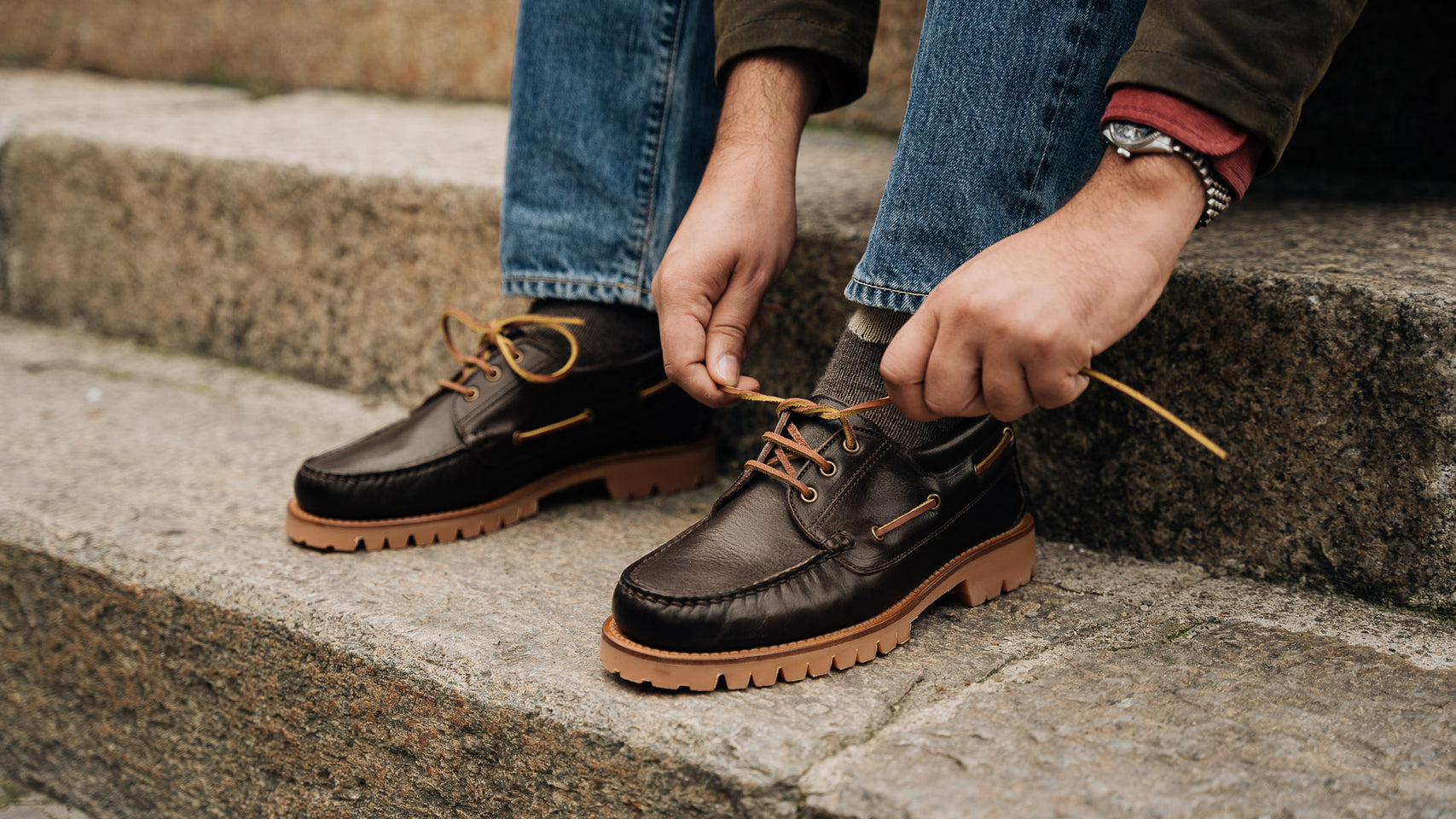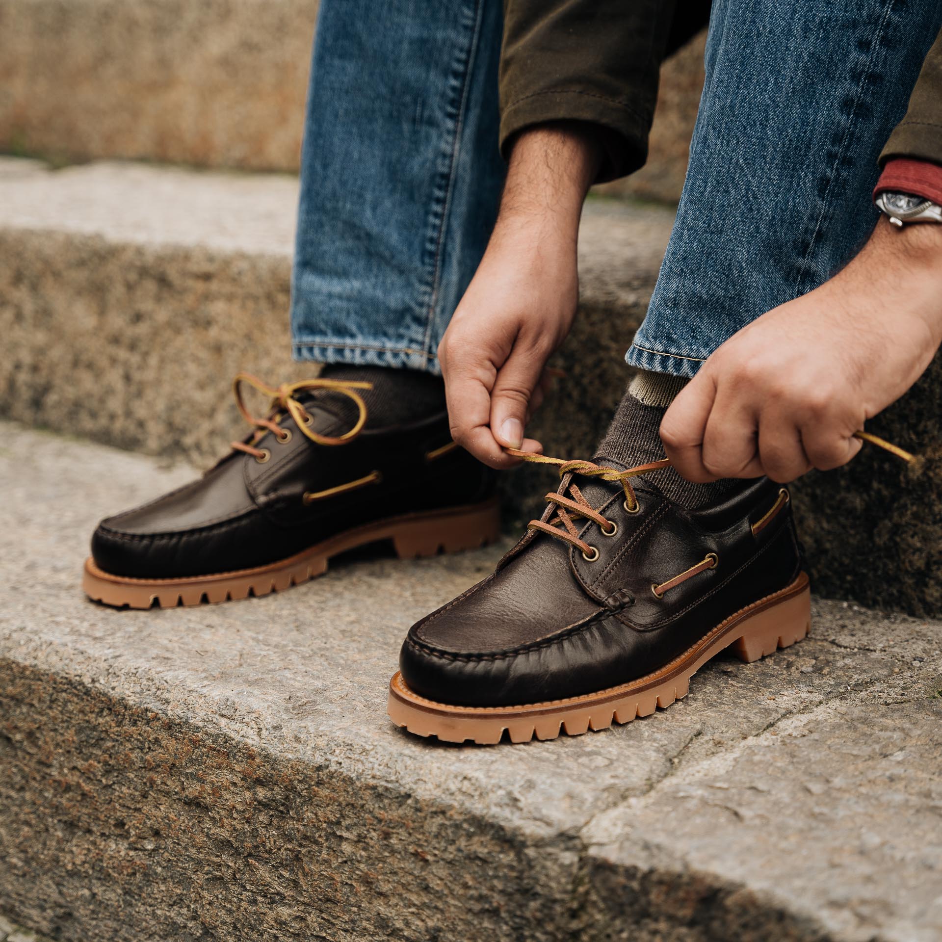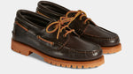 The boat shoes of your summer memories: you can wear them in autumn and winter in this version with a Vibram "Carrarmato" rubber sole. We designed them for you, who love this great classic that should never be out of season. Made with full-grain leather with an "antique" effect, they have a lived-in look, almost familiar if you think they wrap around your foot with extreme comfort. Wear them with denim, diamond socks, a lobster-coloured velvet overshirt and a barbour.