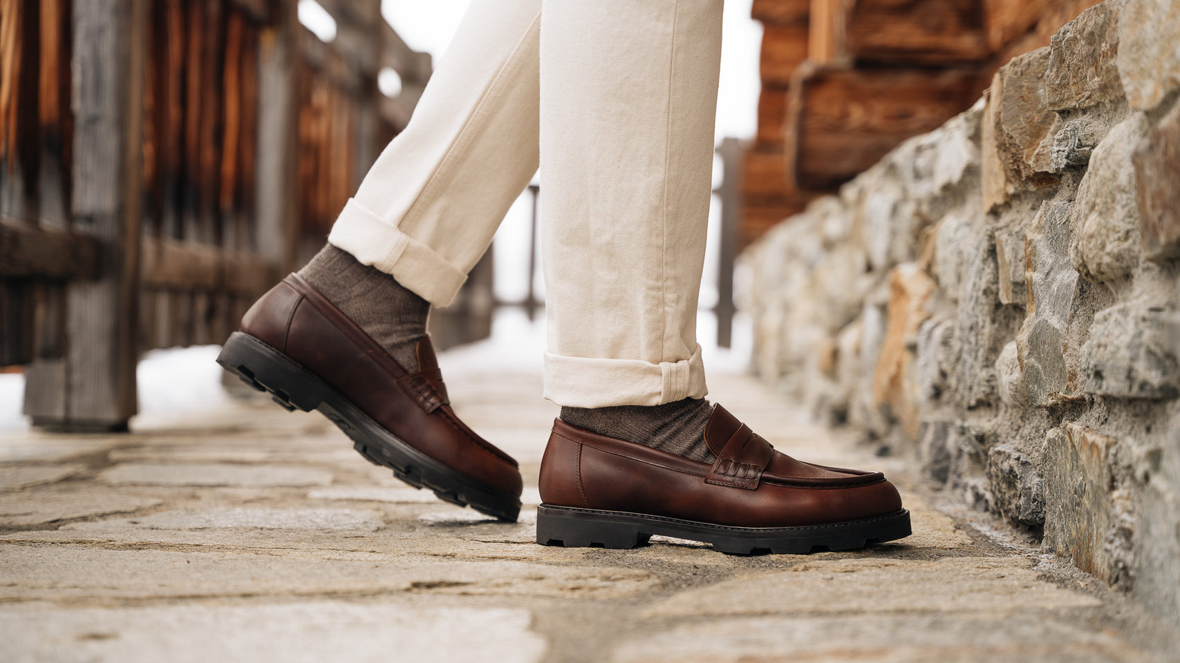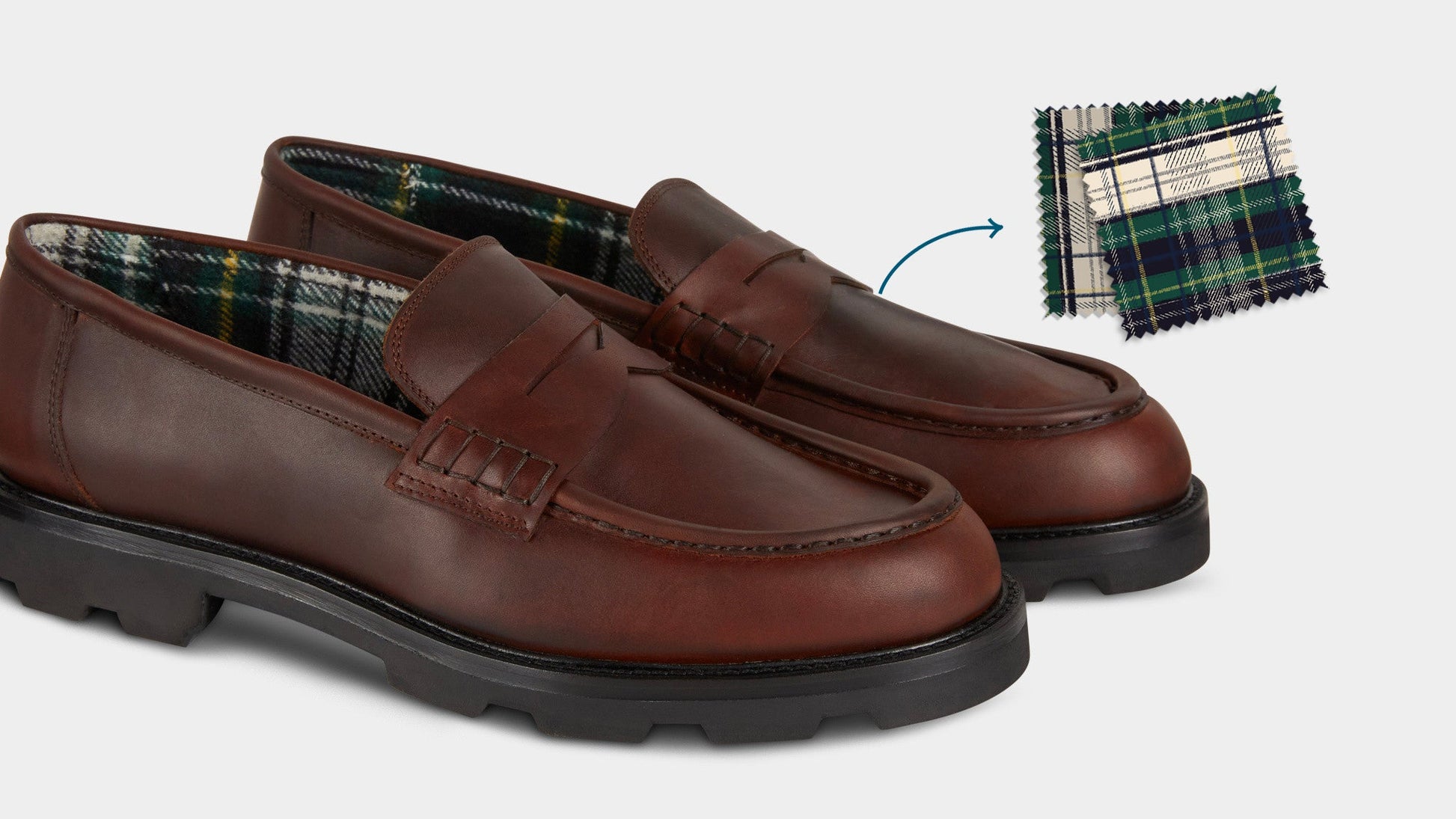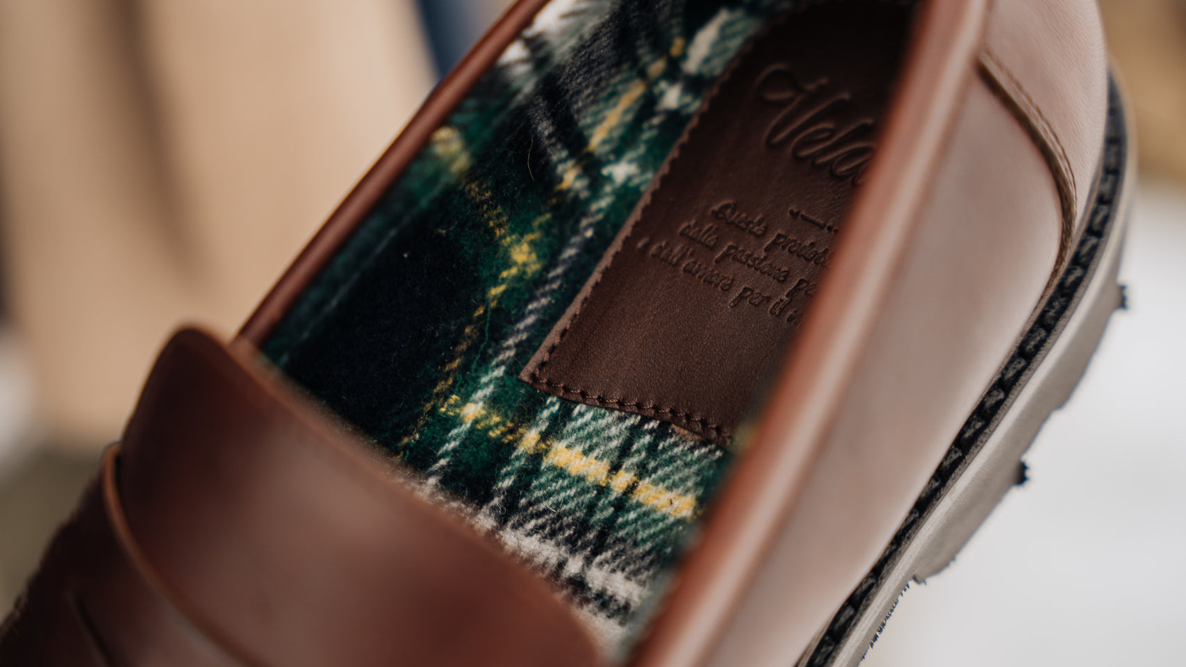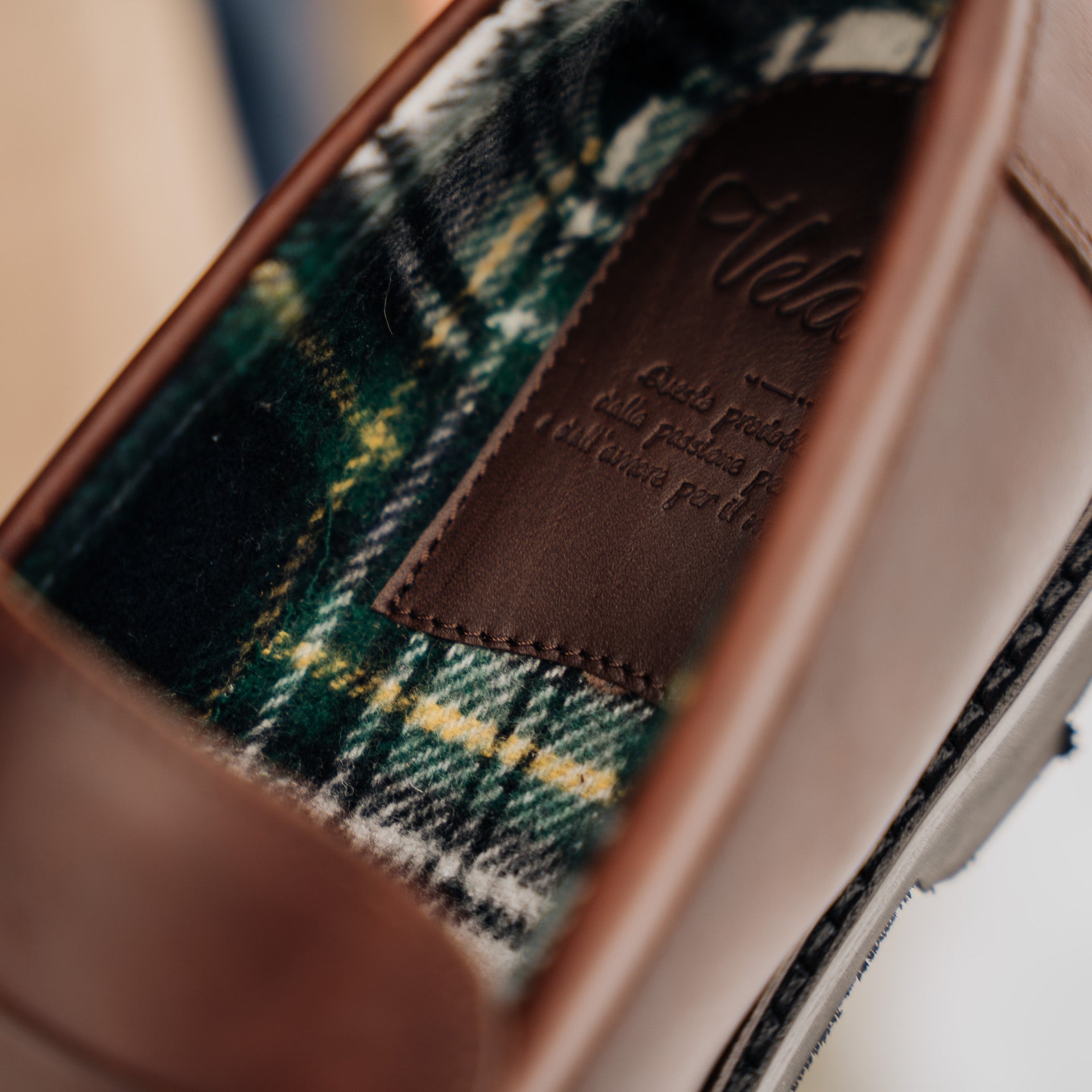 The loafers, in smooth brown leather, pure wool lining and Vibram Carrarmato rubber sole. The lining is embellished with a tartan wool coating, which recalls the elegance of the British countryside and provides warmth and comfort in every step. We paired them with a quilted western with forest green leather shoulder pads, a cream wool jumper and jeans.