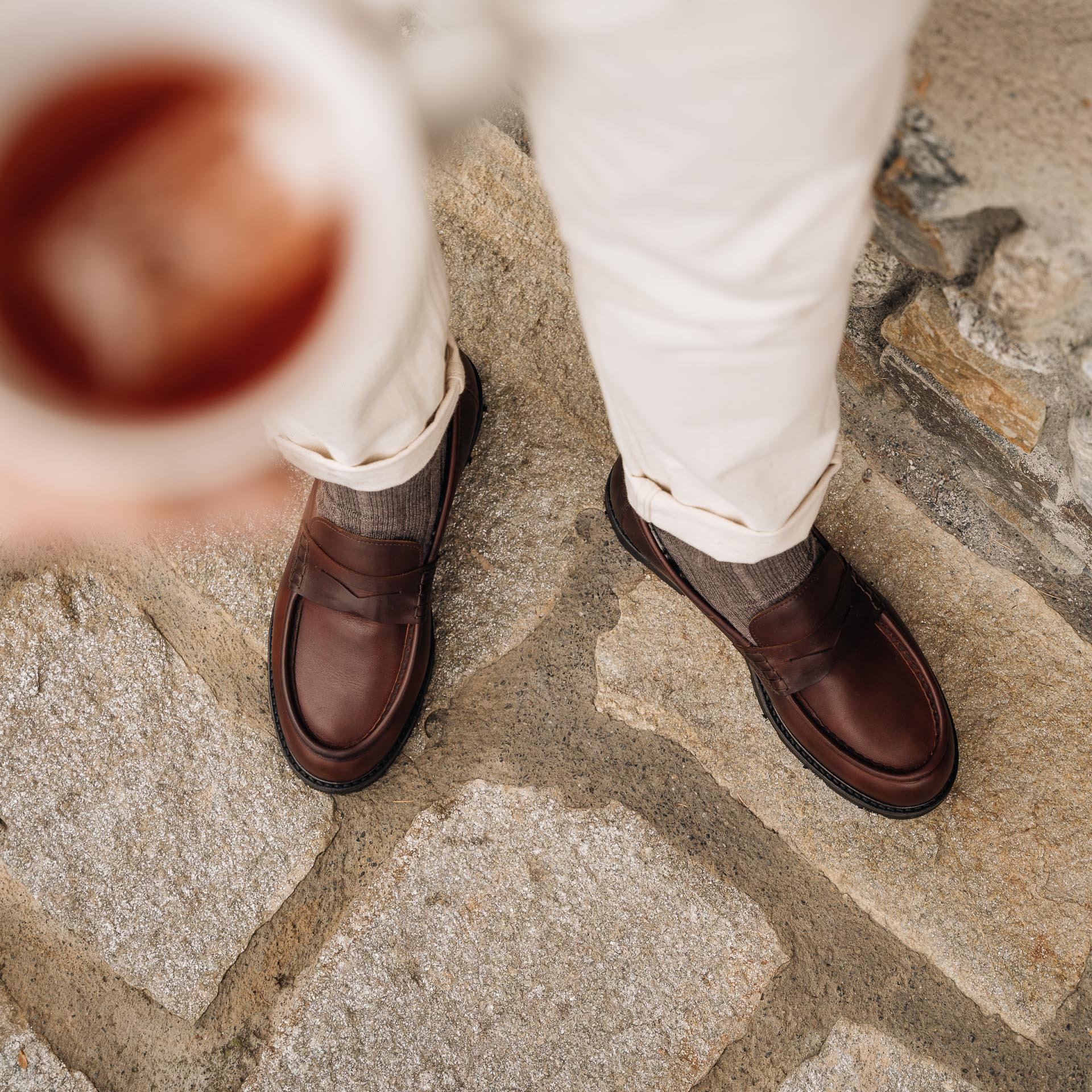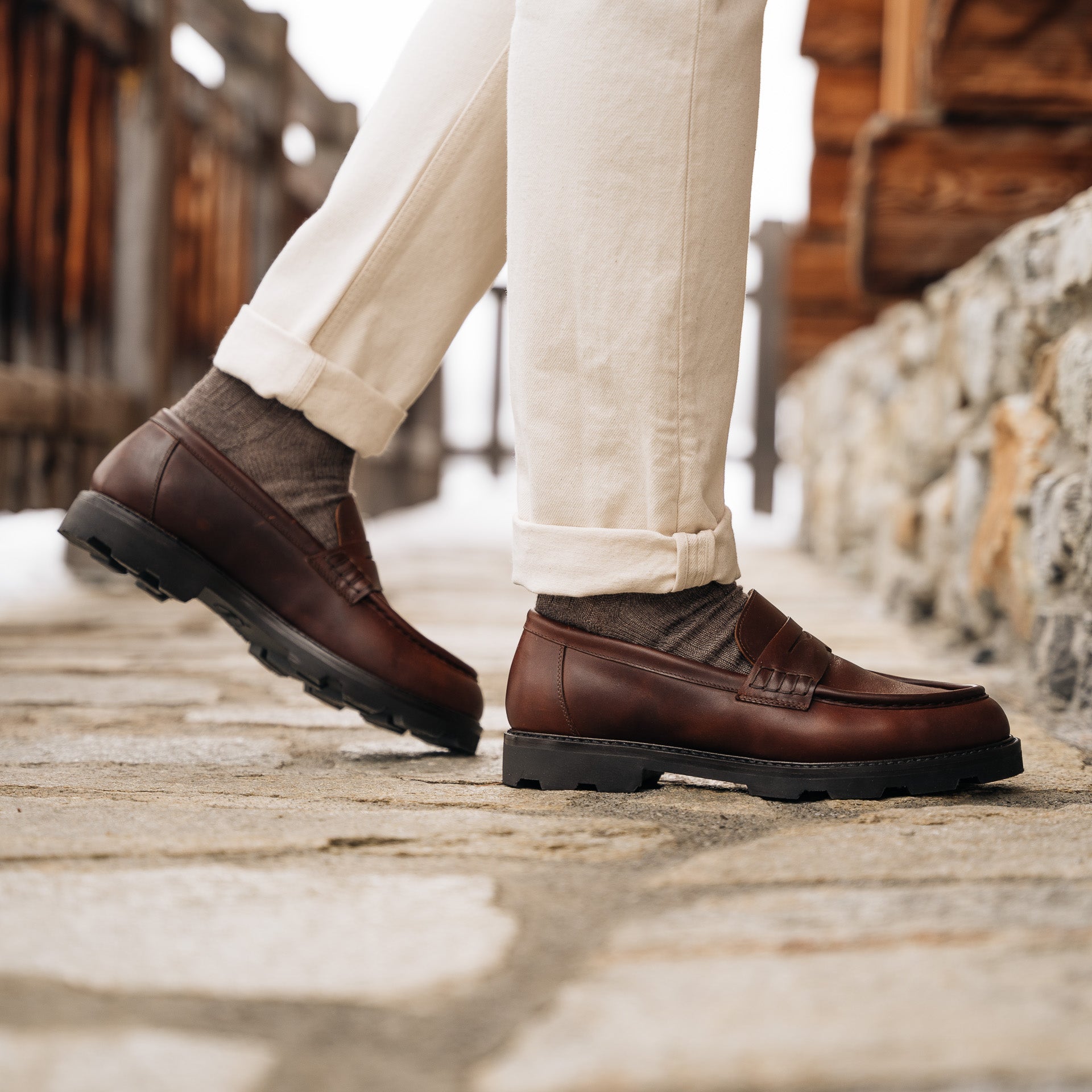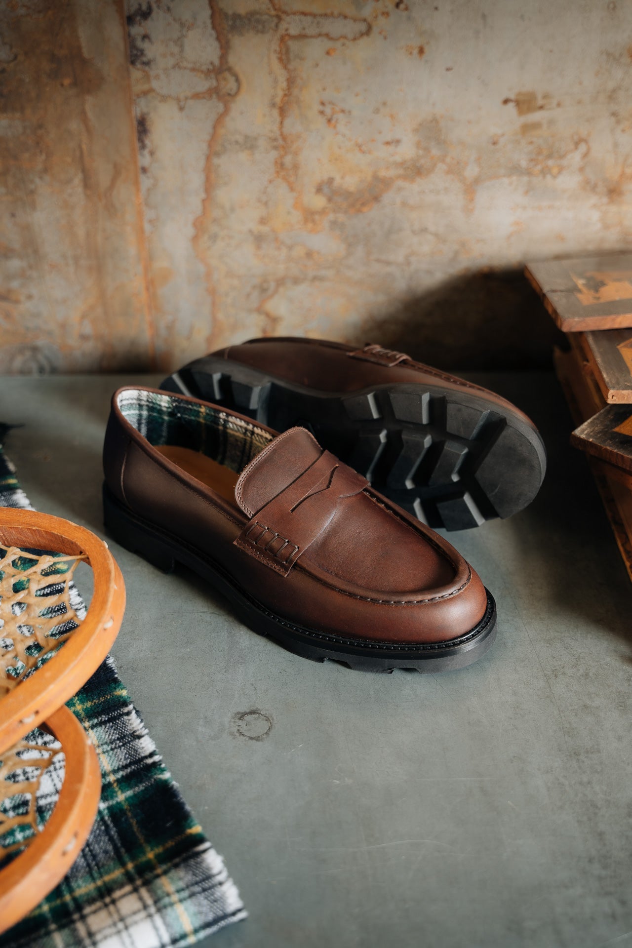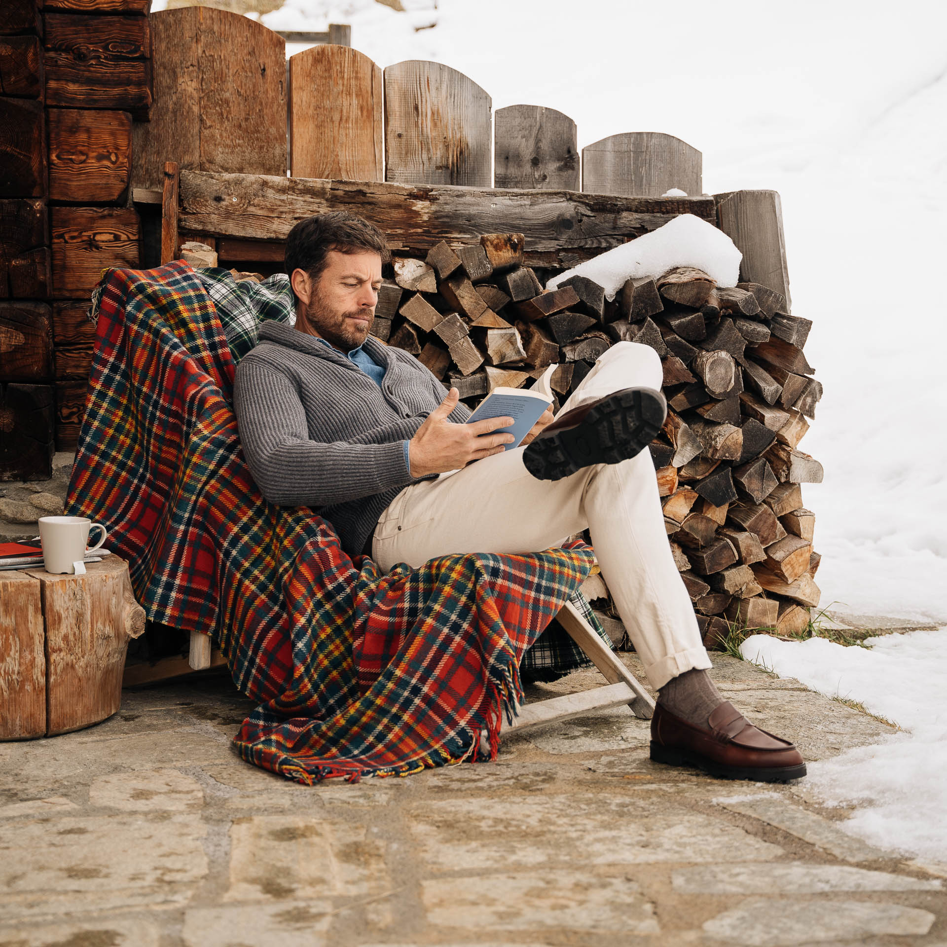 The loafers, in smooth brown leather, pure wool lining and Vibram Carrarmato rubber sole. The lining is embellished with a tartan wool coating, which recalls the elegance of the British countryside and provides warmth and comfort in every step. We paired them with a quilted western with forest green leather shoulder pads, a cream wool jumper and jeans.