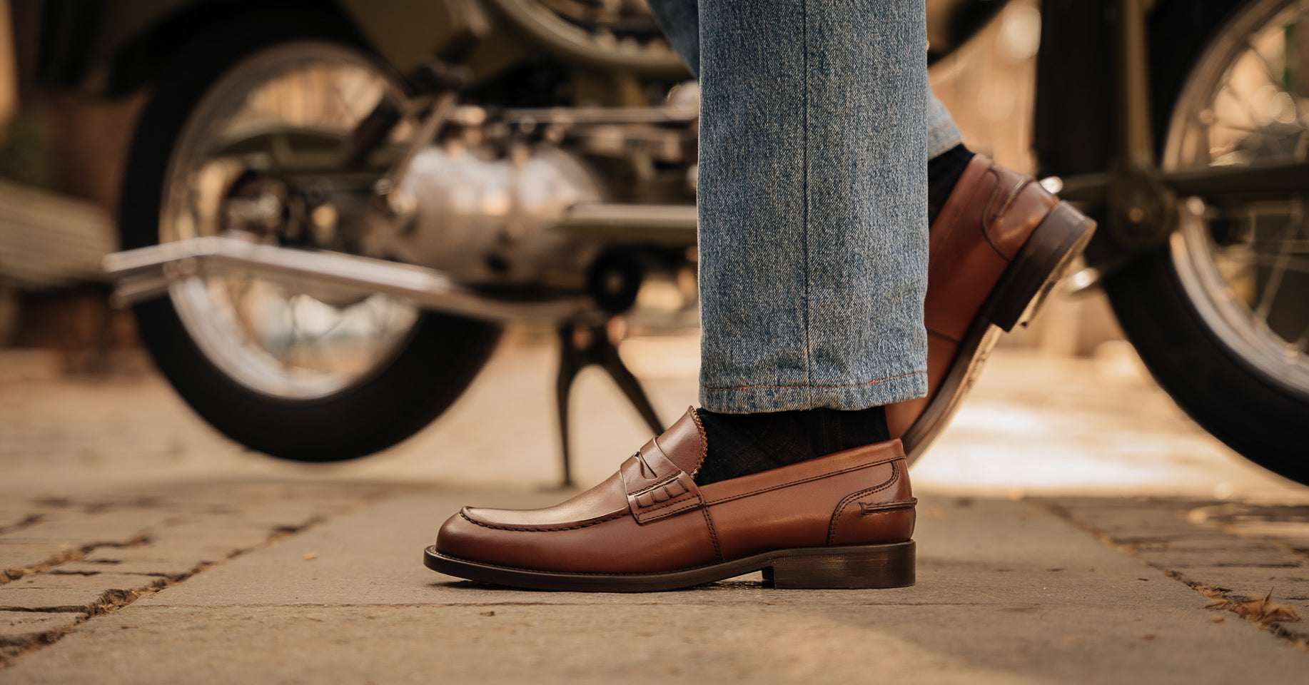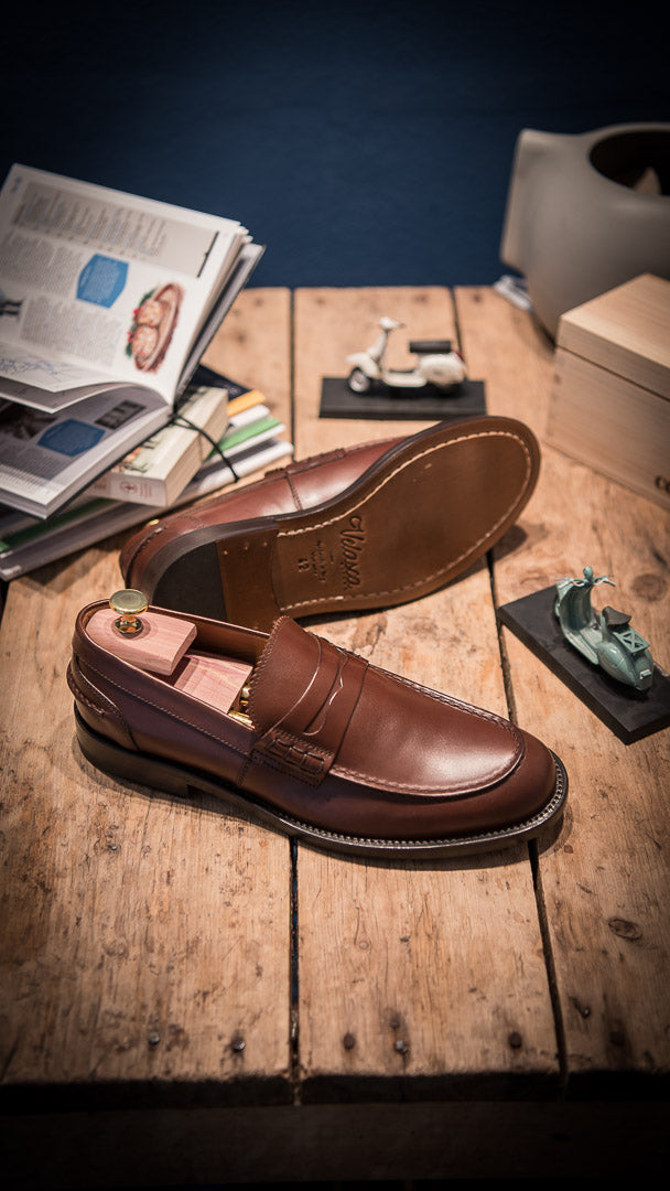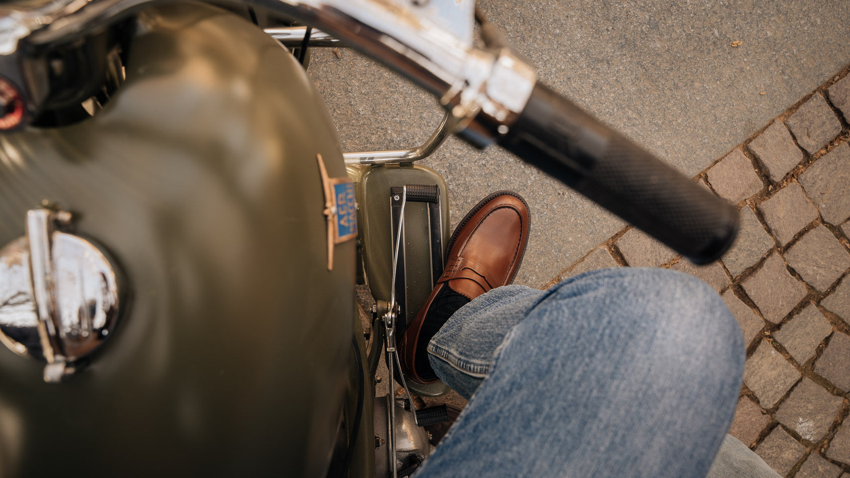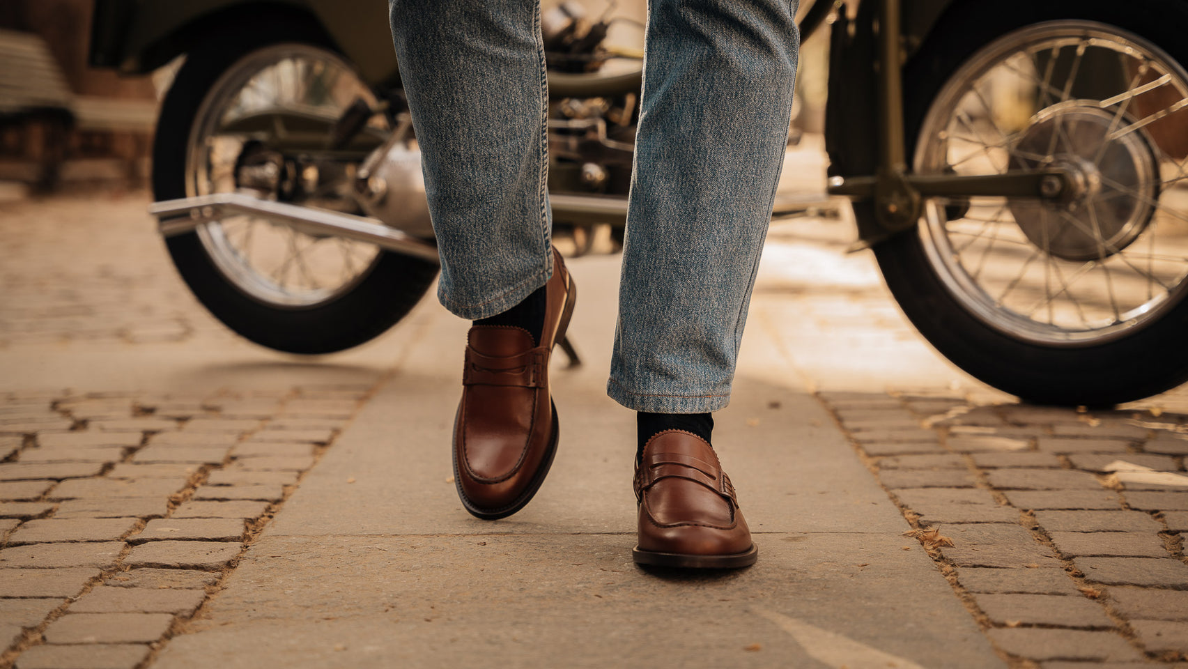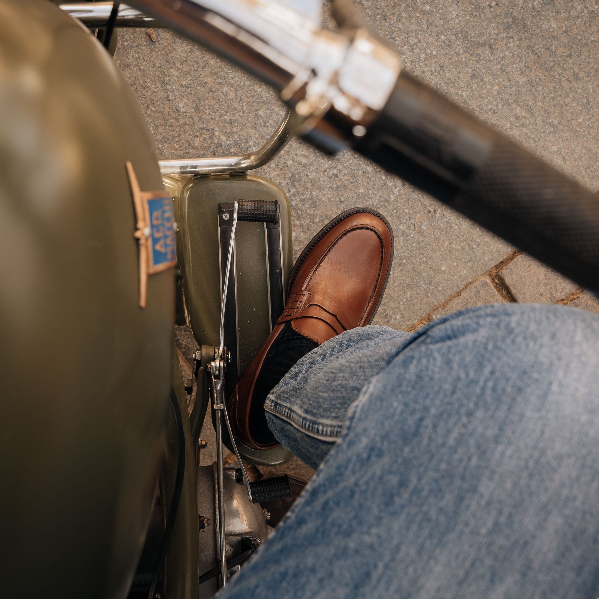 The Penny Loafer with the traditional toe, made from smooth calfskin with a classic leather sole. Wear this simple shoe effortlessly with casual or more formal outfits - it remains iconic. We, for example, paired it with a blue merino crew-neck and light denim trousers.