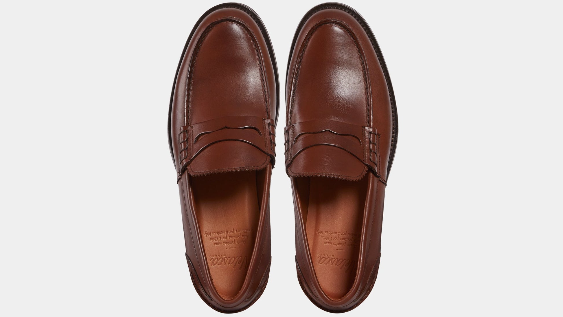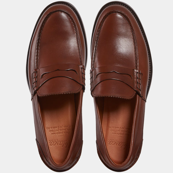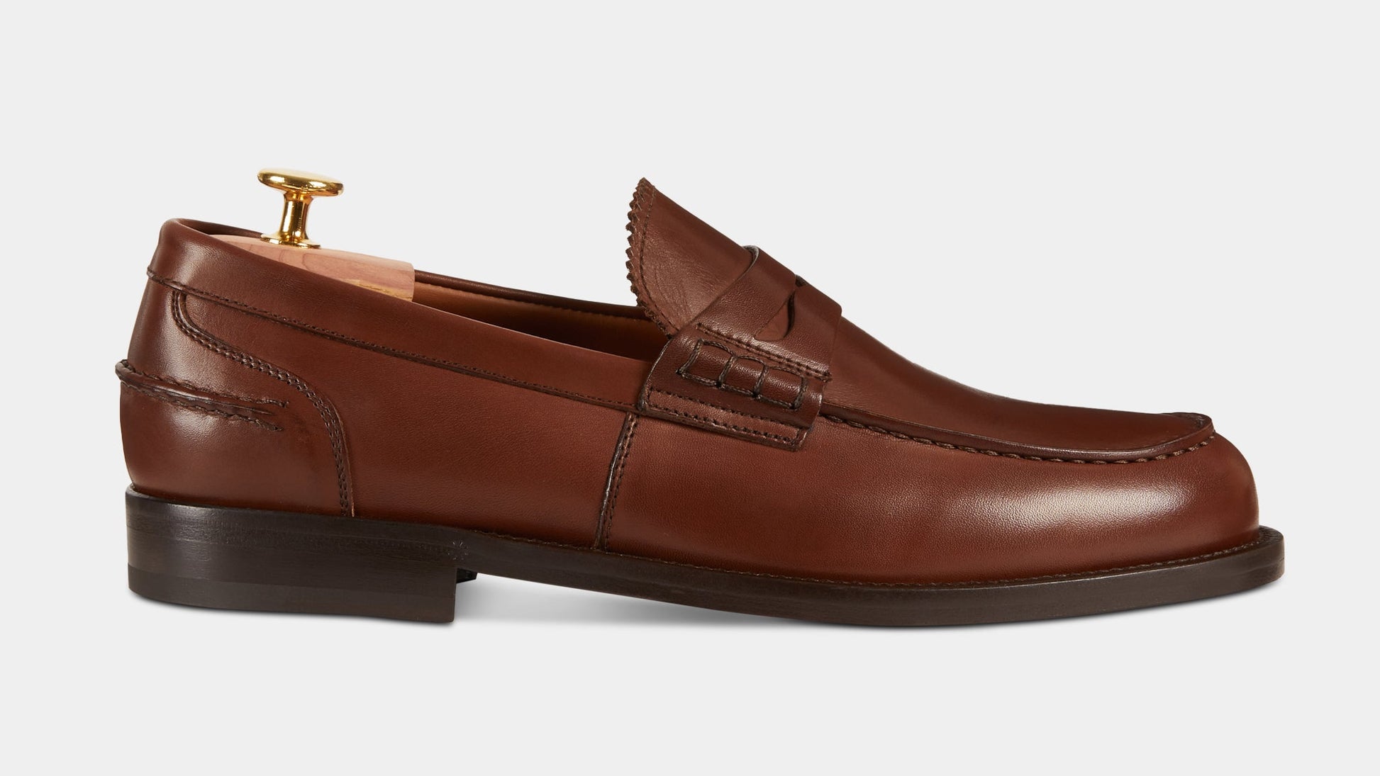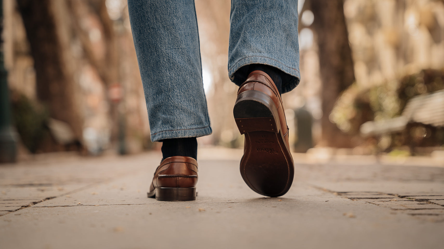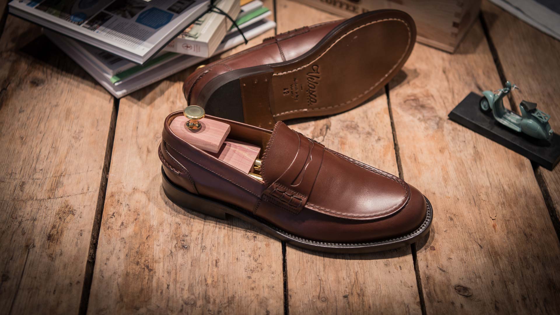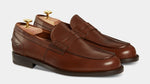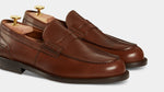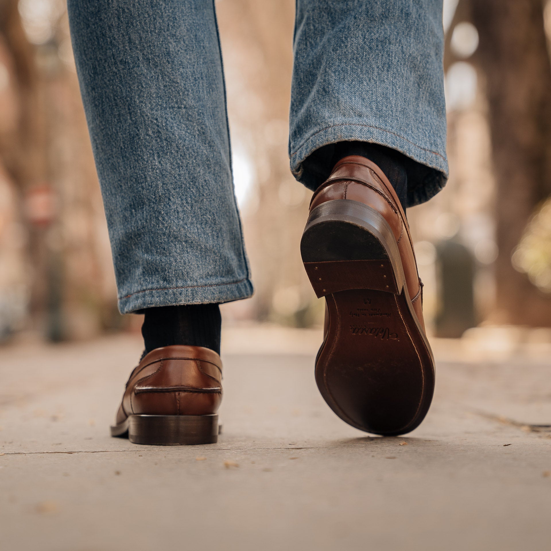The Penny Loafer with the traditional toe, made from smooth calfskin with a classic leather sole. Wear this simple shoe effortlessly with casual or more formal outfits - it remains iconic. We, for example, paired it with a blue merino crew-neck and light denim trousers.