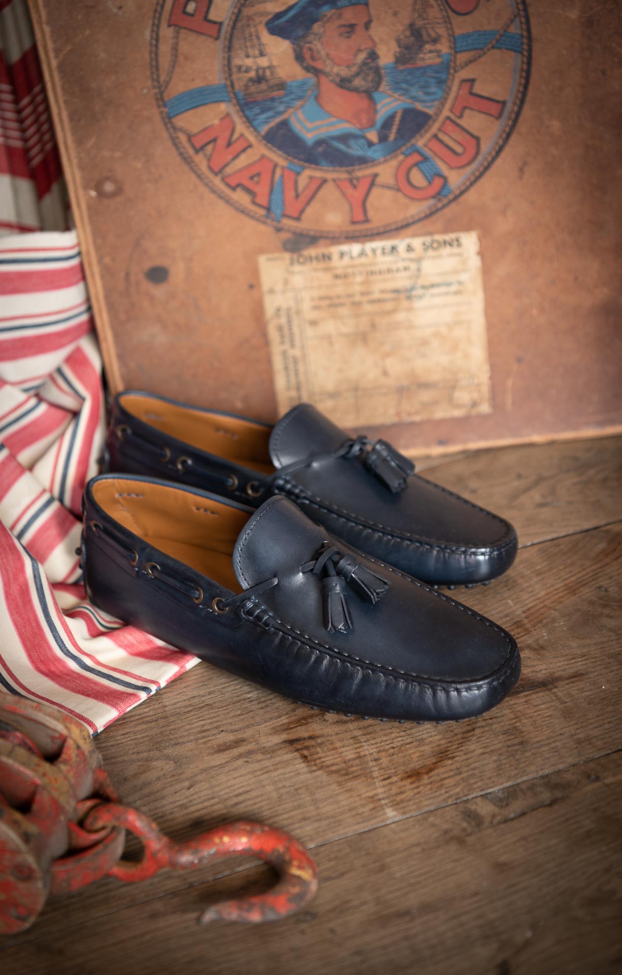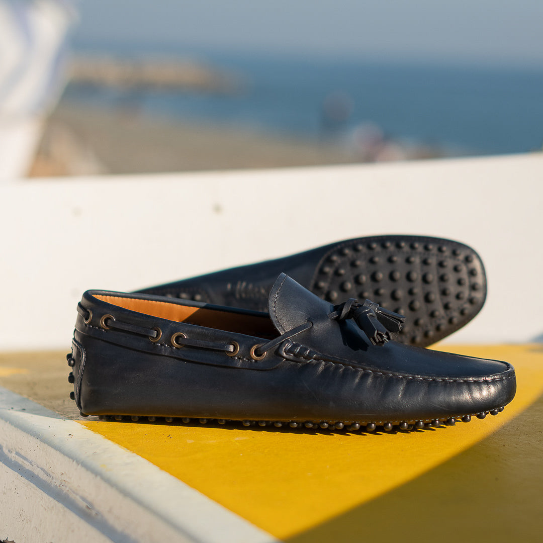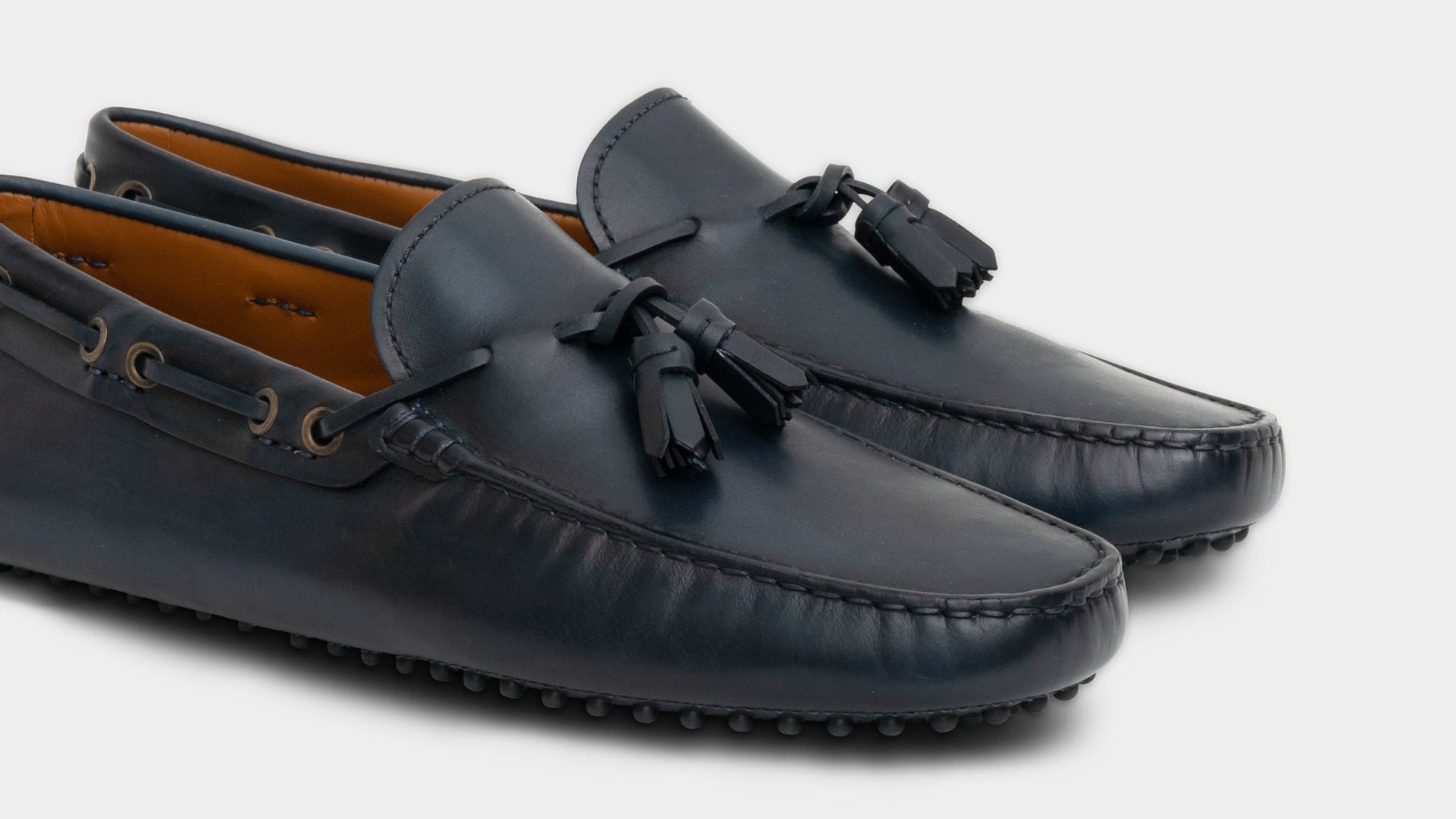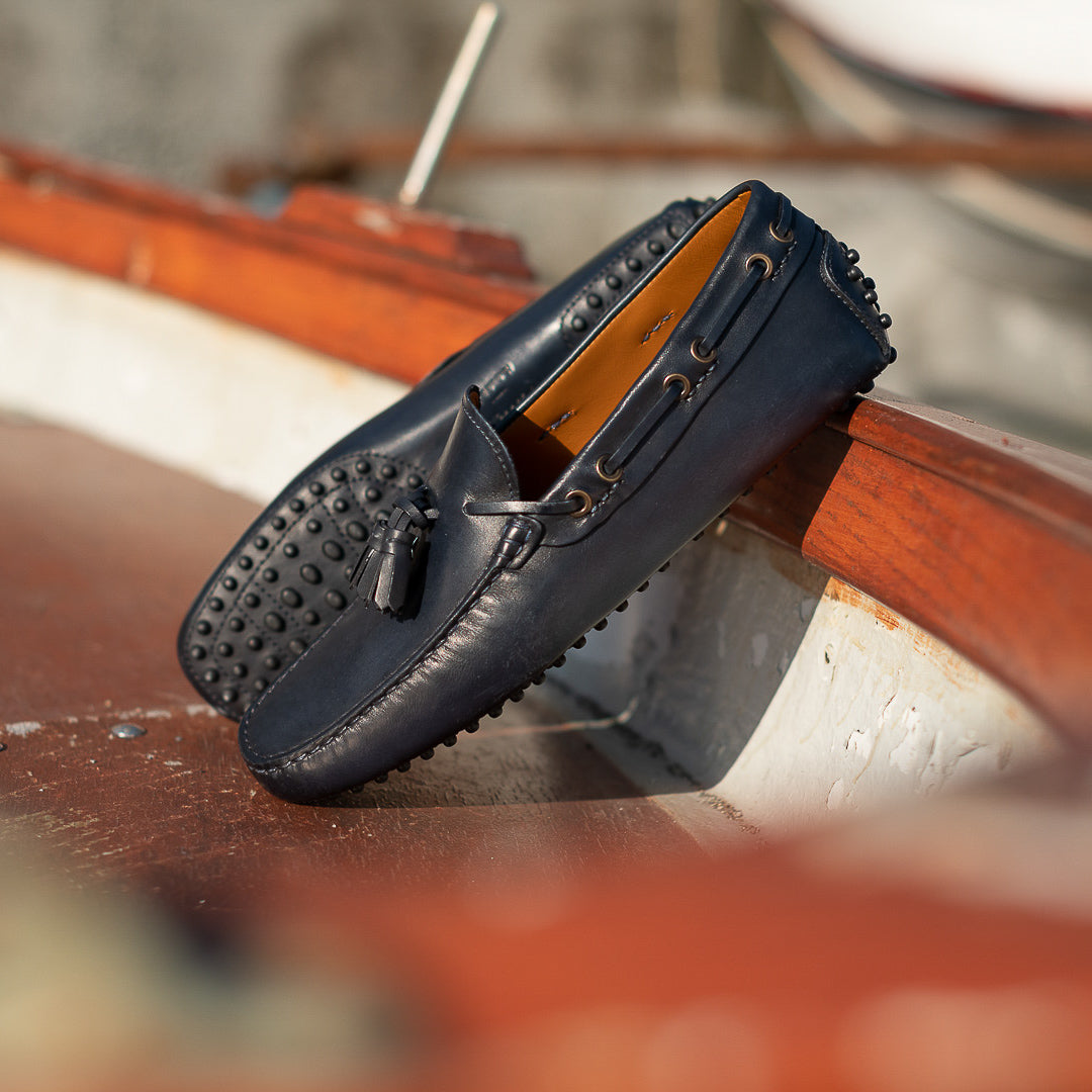 They the Moccasin you weren’t ready for: instead of laces, we apply a tassel. With its antiqued leather and studded rubber sole, it’s a blue shoe with a same color tassel to show off on summer social occasions. As with all Moccasins, they’re handmade with the prestigious tubular technique to give you softness and flexibility. They’re as comfy as slippers.