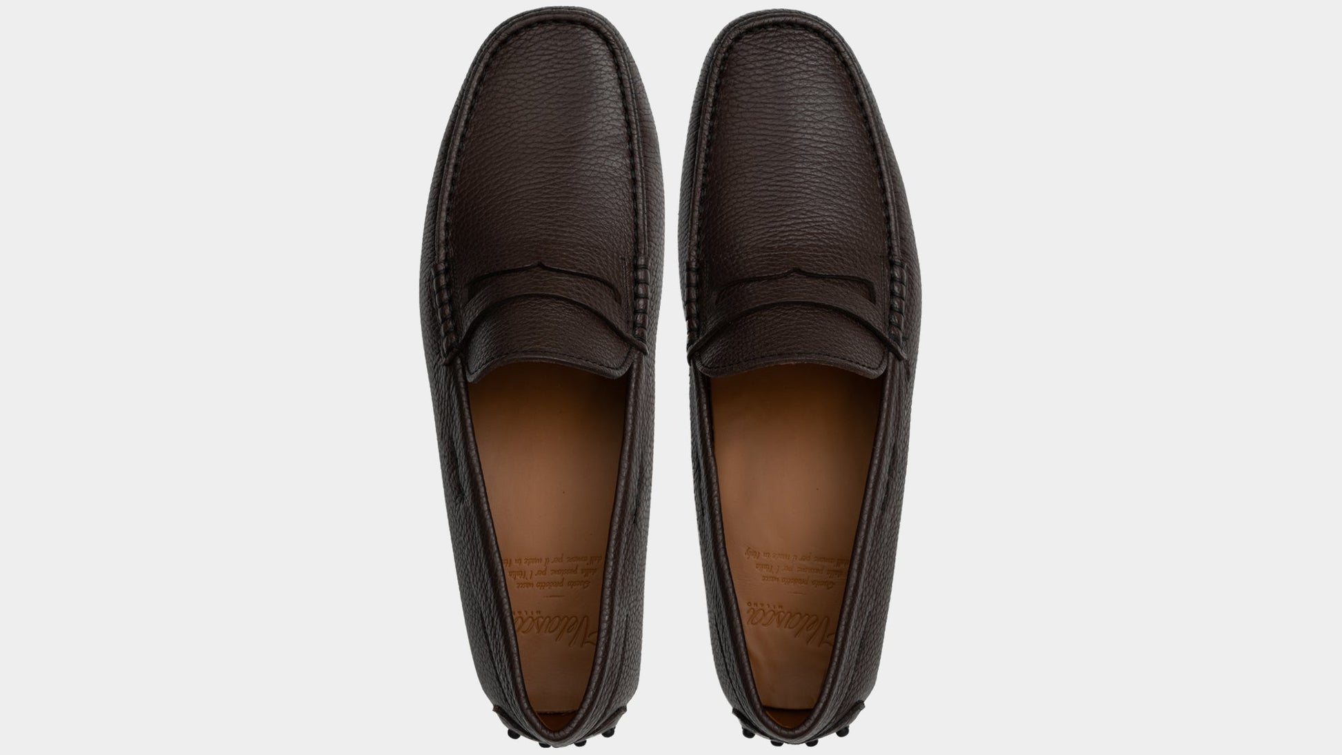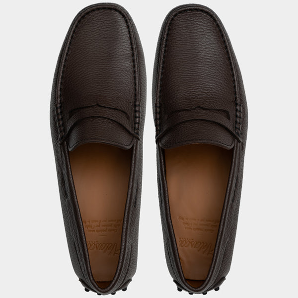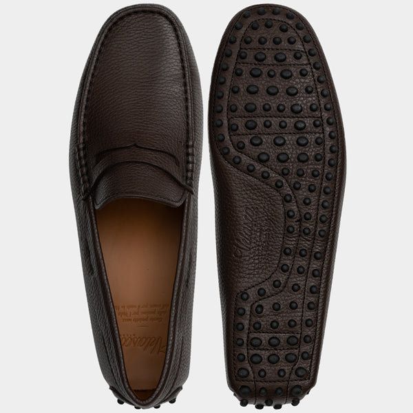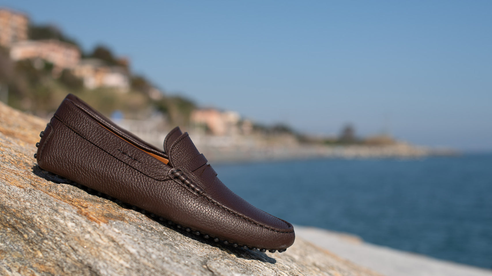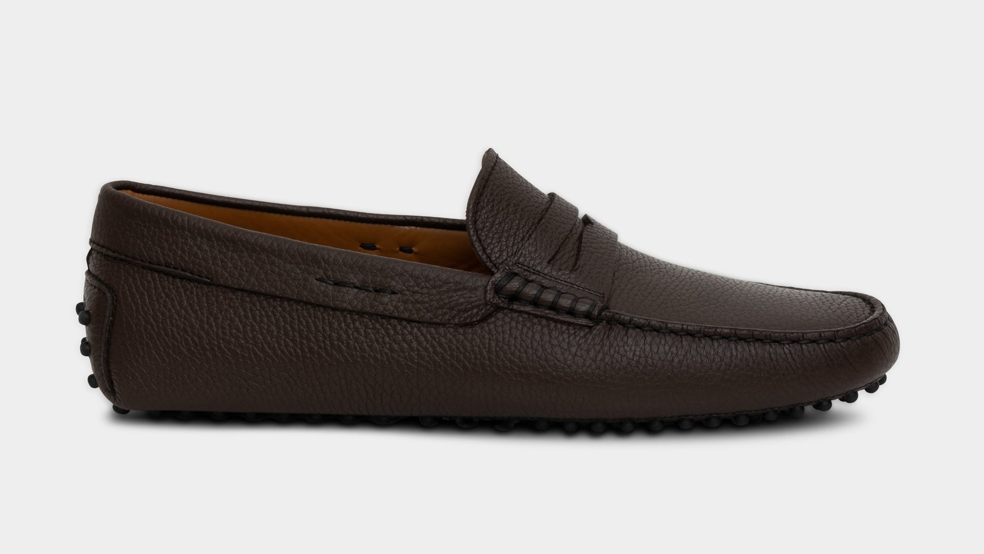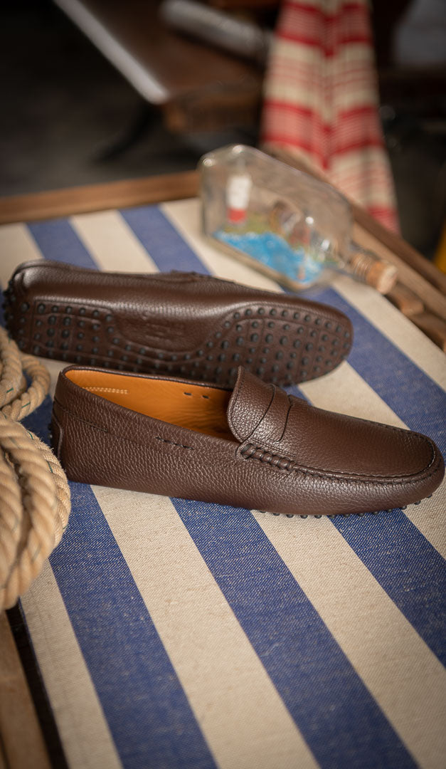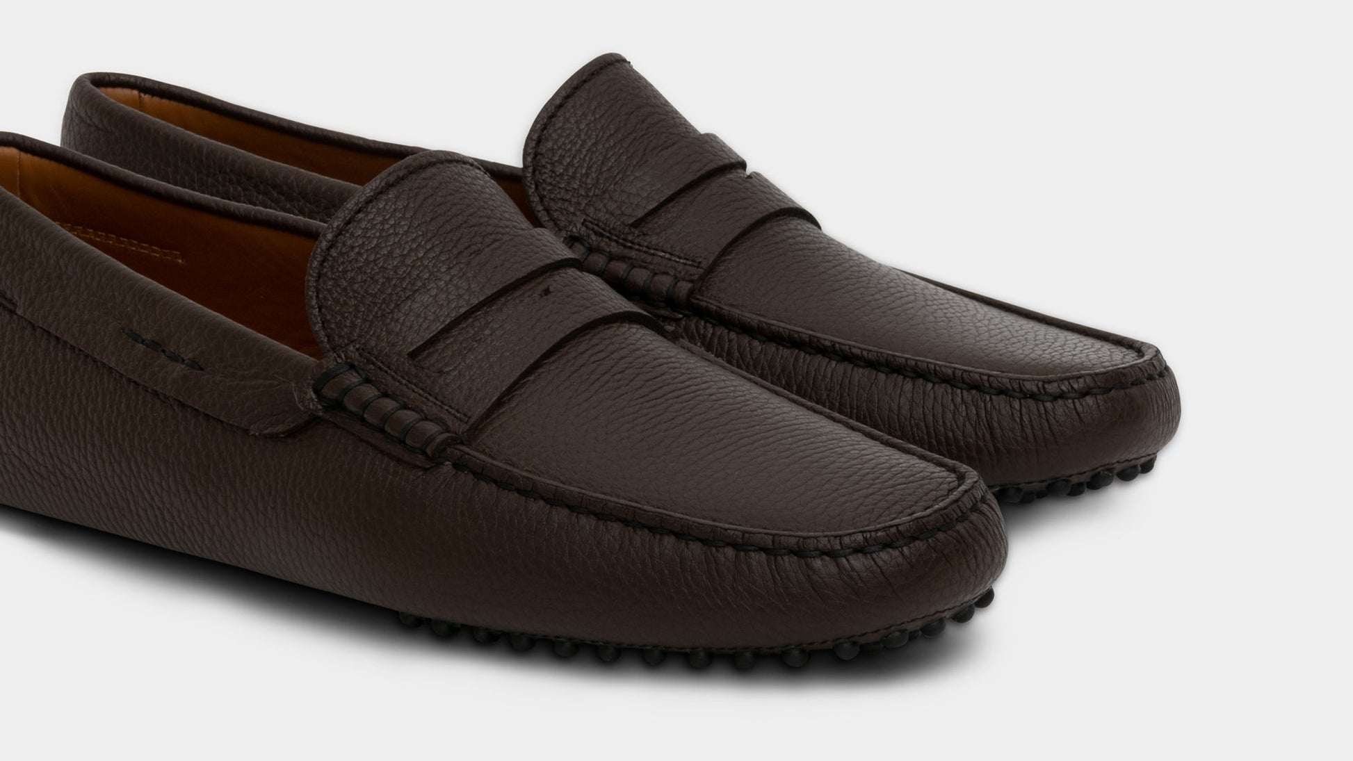 It’s the Moccasin with a slotted leather strap that you usually see on Penny Loafers. With its tumbled leather and studded rubber sole, it’s the dark brown shoe for the chilled and versatile man.