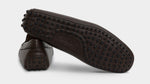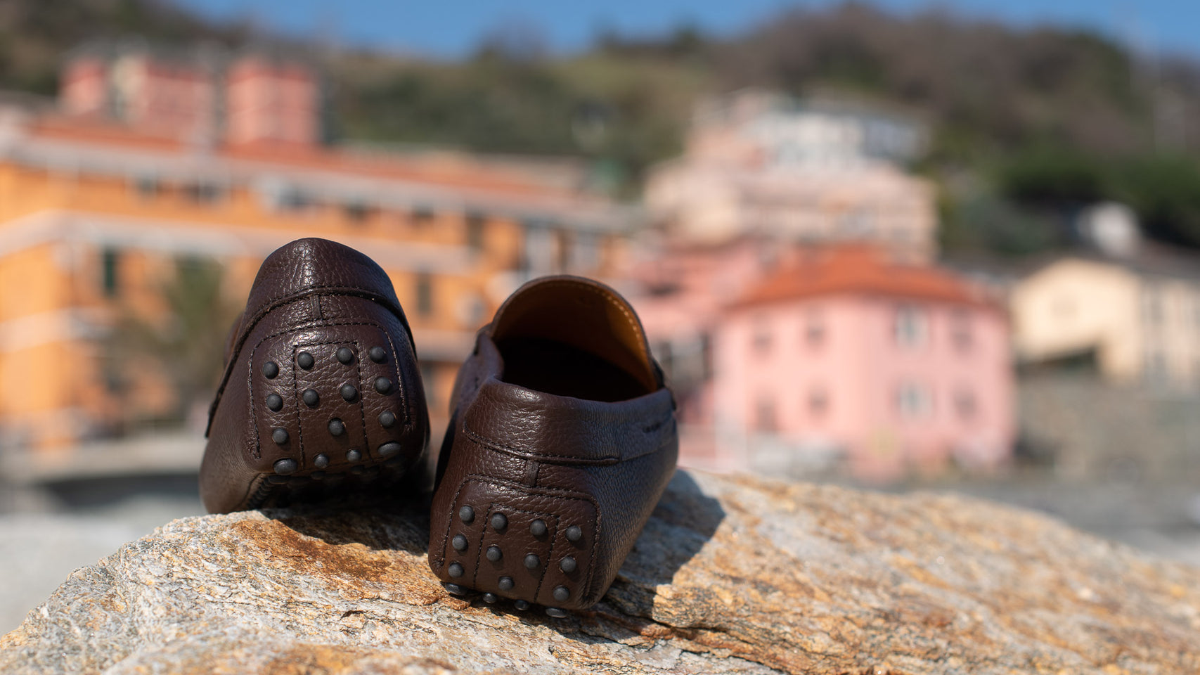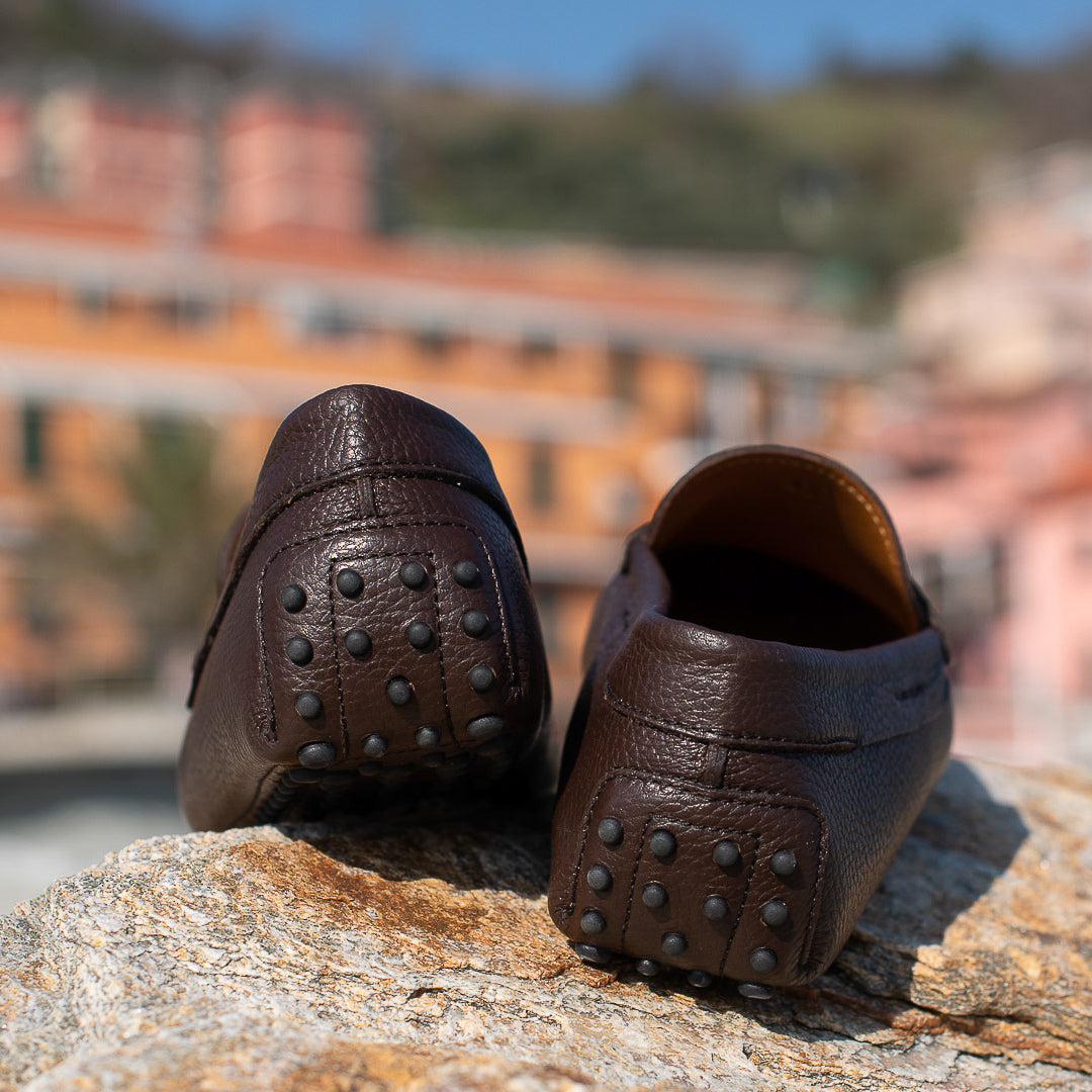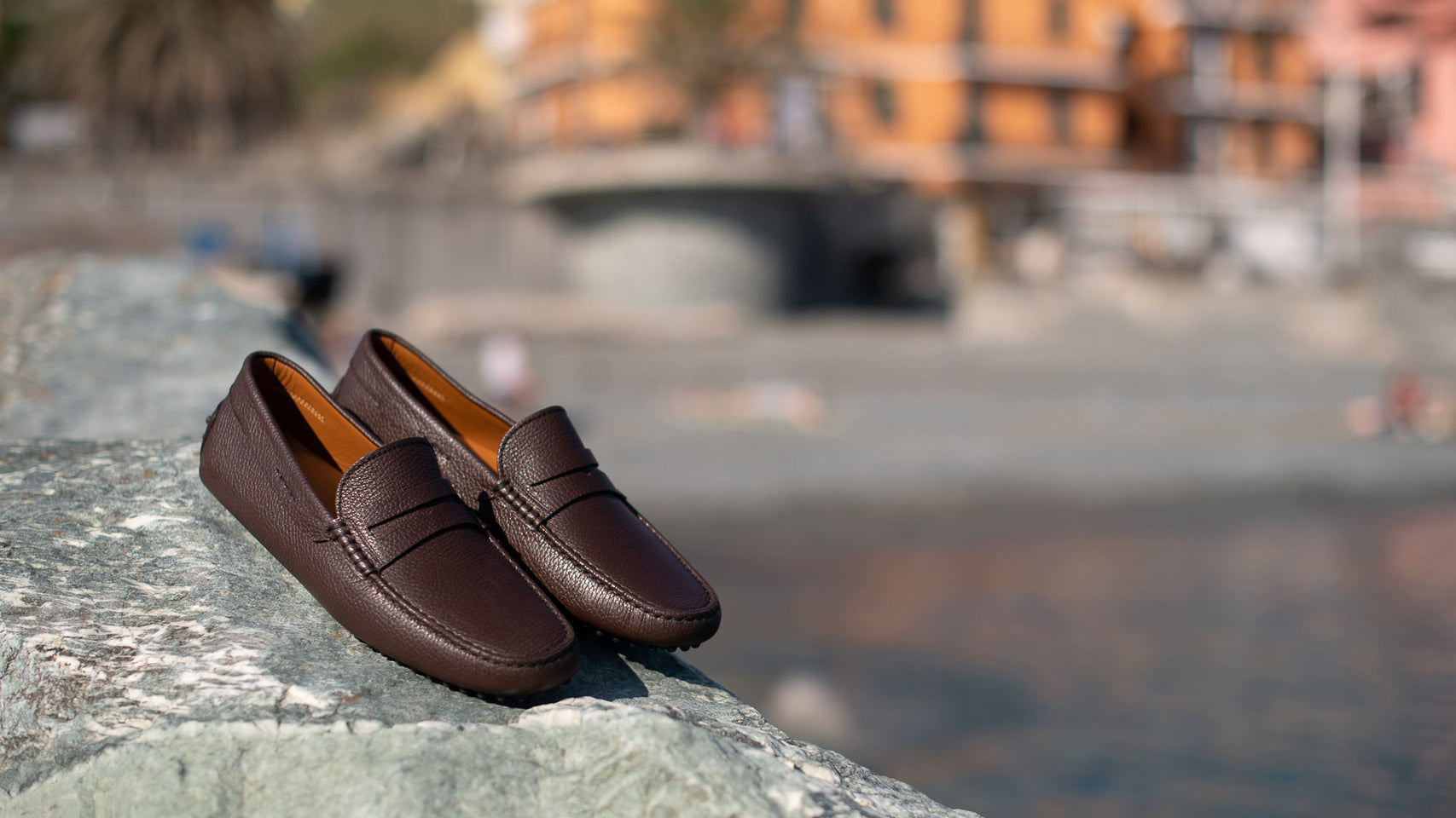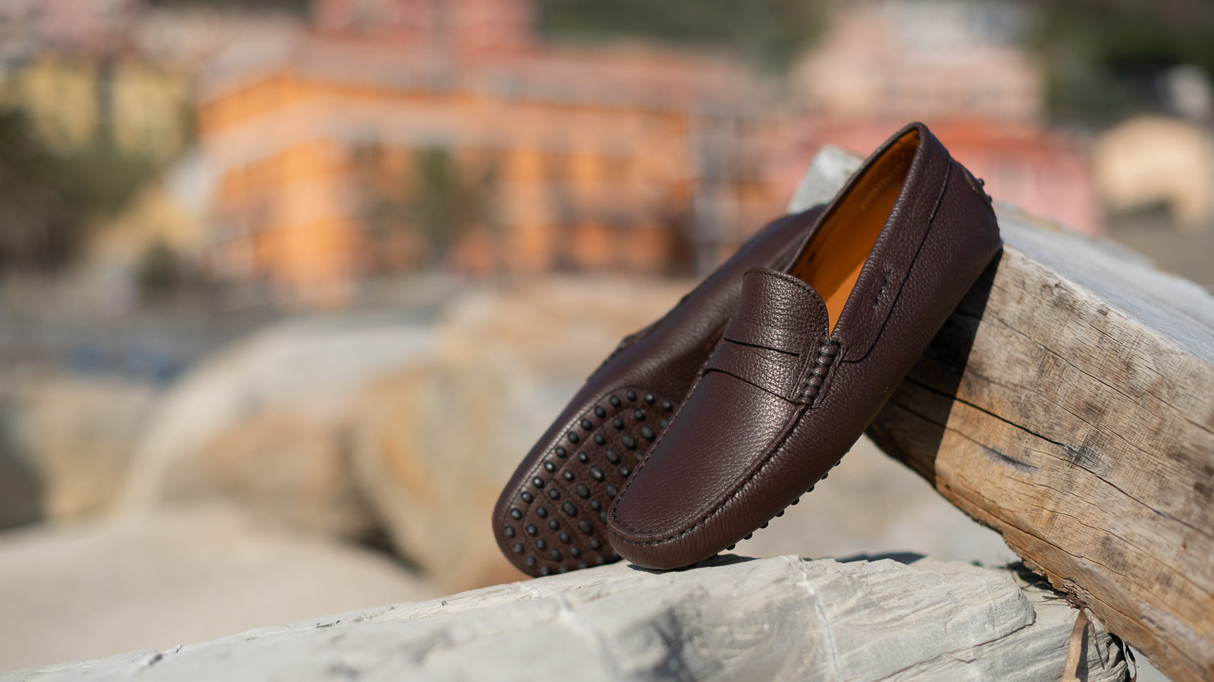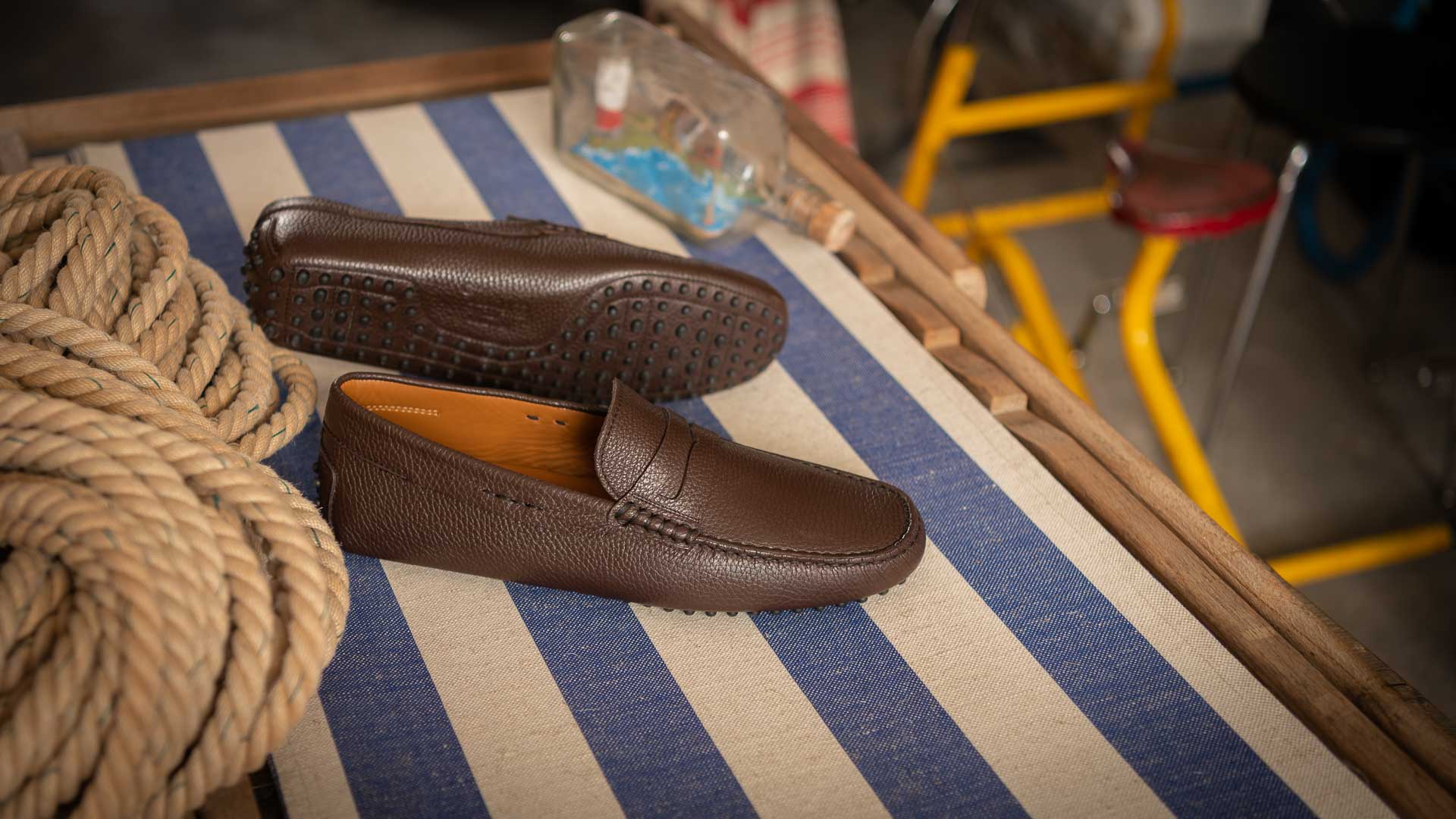 It’s the Moccasin with a slotted leather strap that you usually see on Penny Loafers. With its tumbled leather and studded rubber sole, it’s the dark brown shoe for the chilled and versatile man.