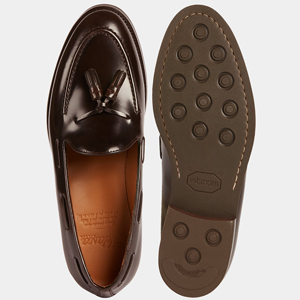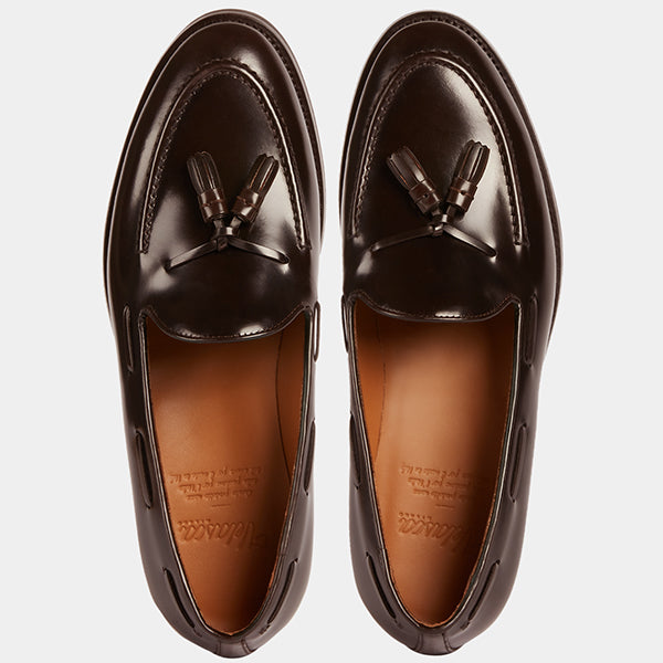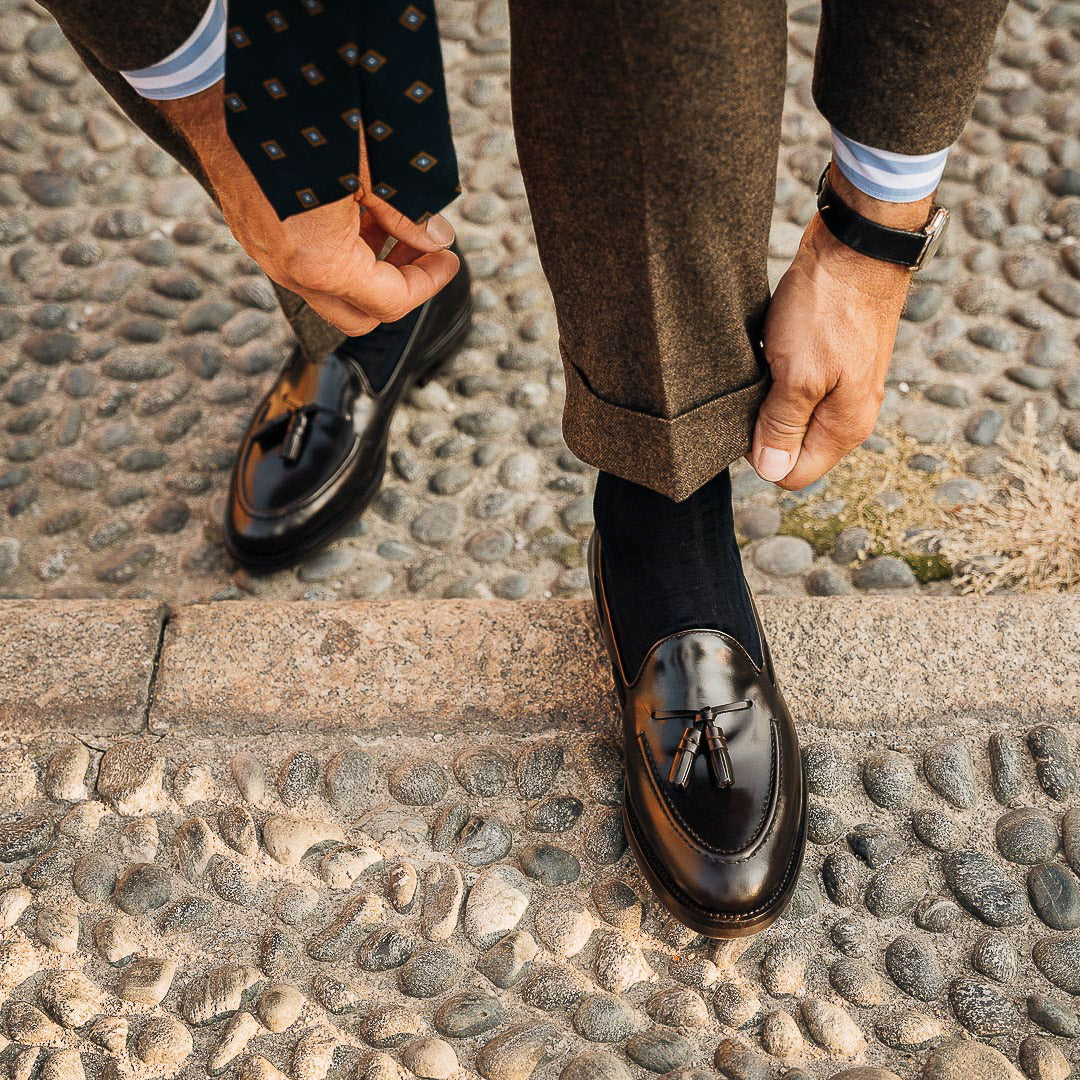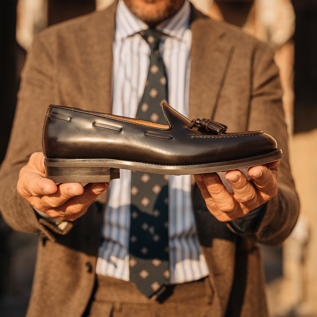 These are the Loafers with tassels, in smooth brushed calf leather and Vibram rubber sole. They could remind you of a dandy style, but who said you have to be a real dandy to wear them? We’re for details: if these Loafers struck you at first sight, they’ll be your best touch of elegance under a warm-toned flannel suit, a white shirt with blue stripes and a silk printed tie, for example. Vibram rubber gives your Tassel Loafers good traction at every step, even when it's wet.