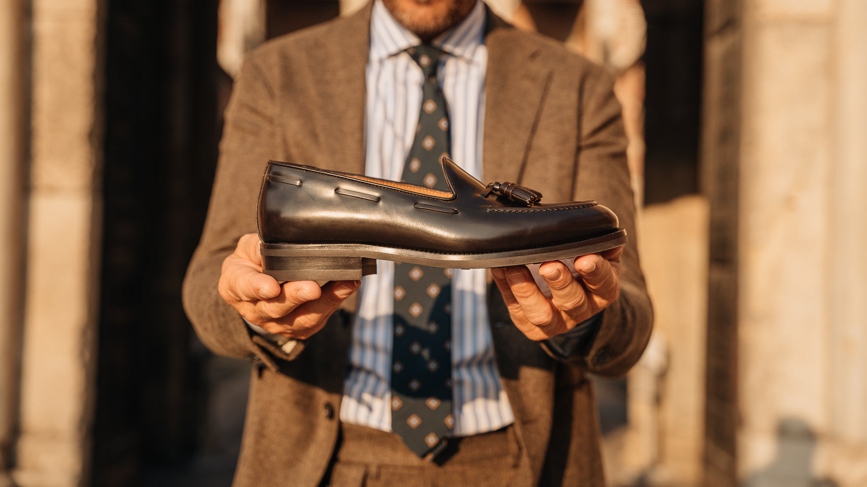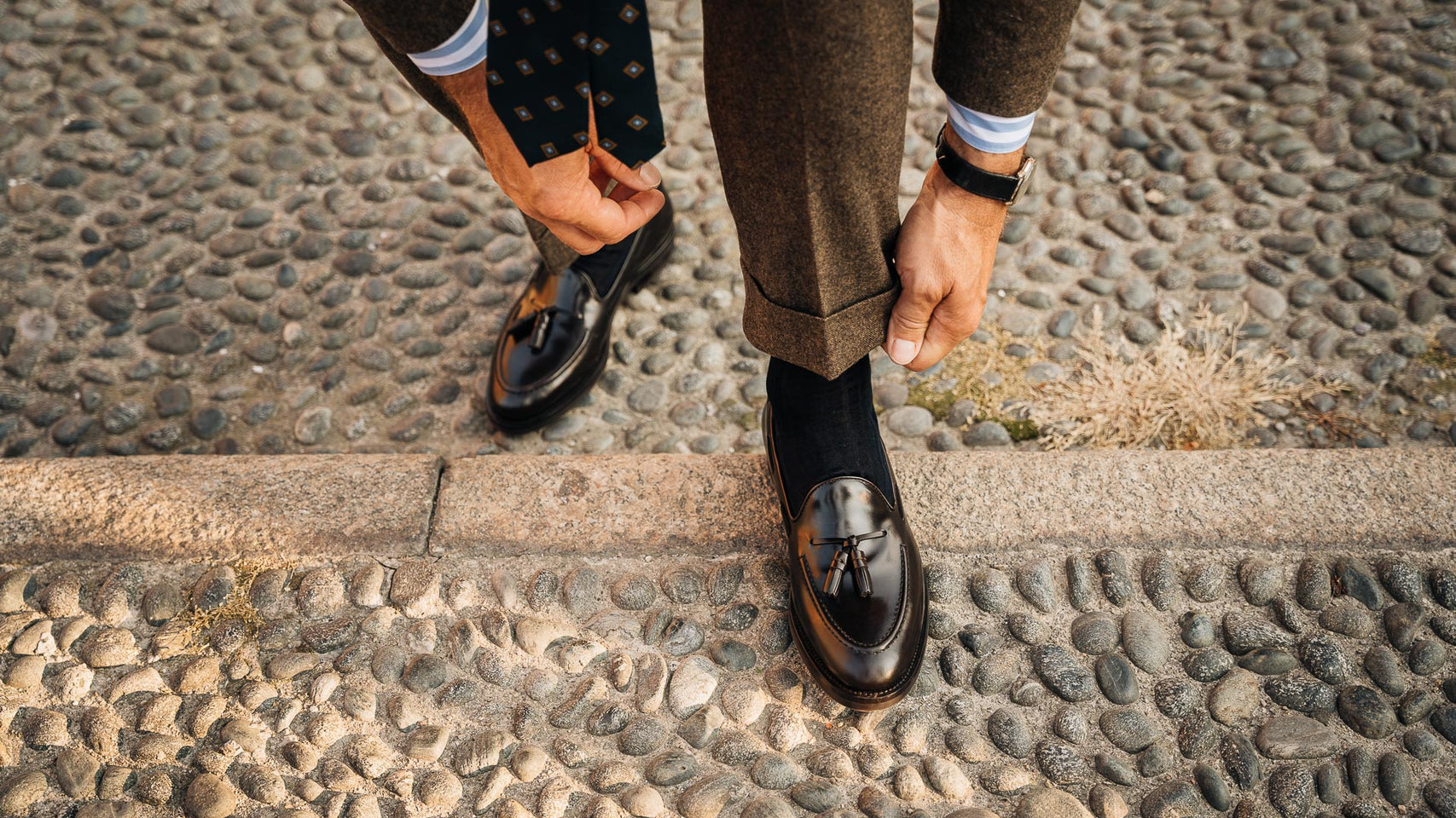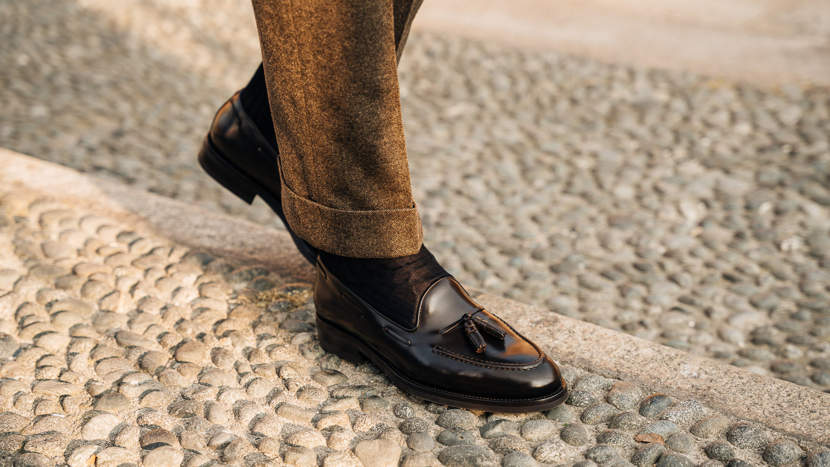 These are the Loafers with tassels, in smooth brushed calf leather and Vibram rubber sole. They could remind you of a dandy style, but who said you have to be a real dandy to wear them? We’re for details: if these Loafers struck you at first sight, they’ll be your best touch of elegance under a warm-toned flannel suit, a white shirt with blue stripes and a silk printed tie, for example. Vibram rubber gives your Tassel Loafers good traction at every step, even when it's wet.