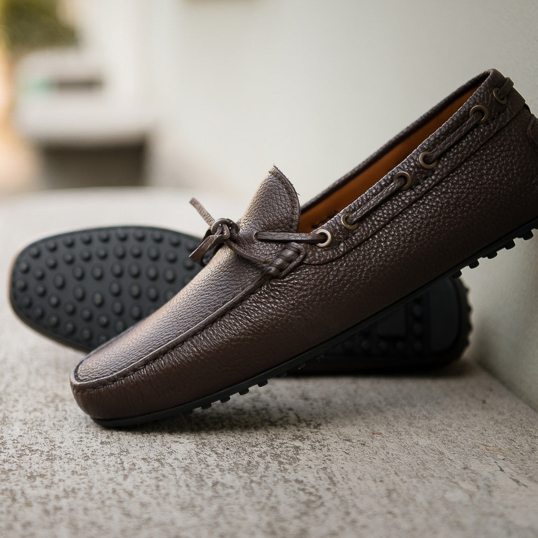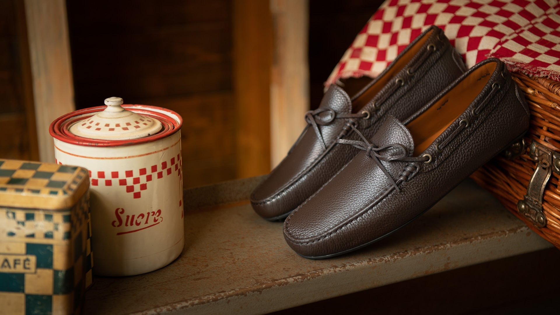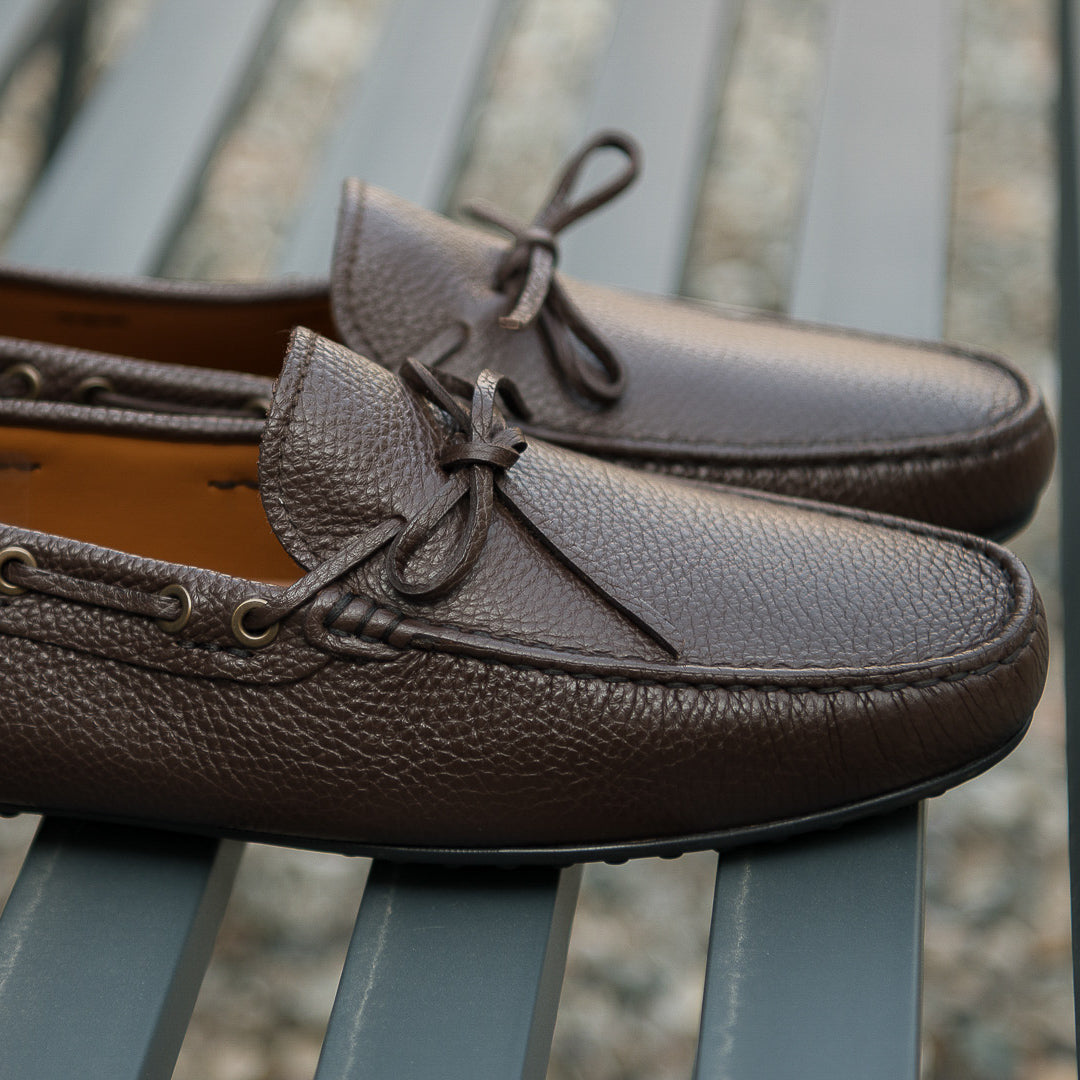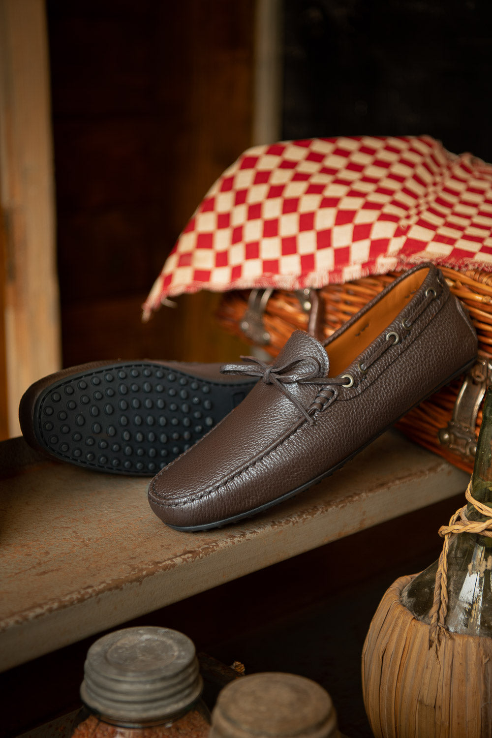 There aren't your typical studded-sole Moccasins with laces. Their rubber soles run the whole length of the shoe, making them somewhat solid. We gave them a new soul, but their lines remain iconic: the laces wrap around the foot and fall casually onto the upper. In full grain hammered-effect calfskin, you can wear them with beige trousers and a dark long-sleeved shirt, all in cool linen fabric. Always without socks. Perfect for weekends out of town when days are ever warmer.