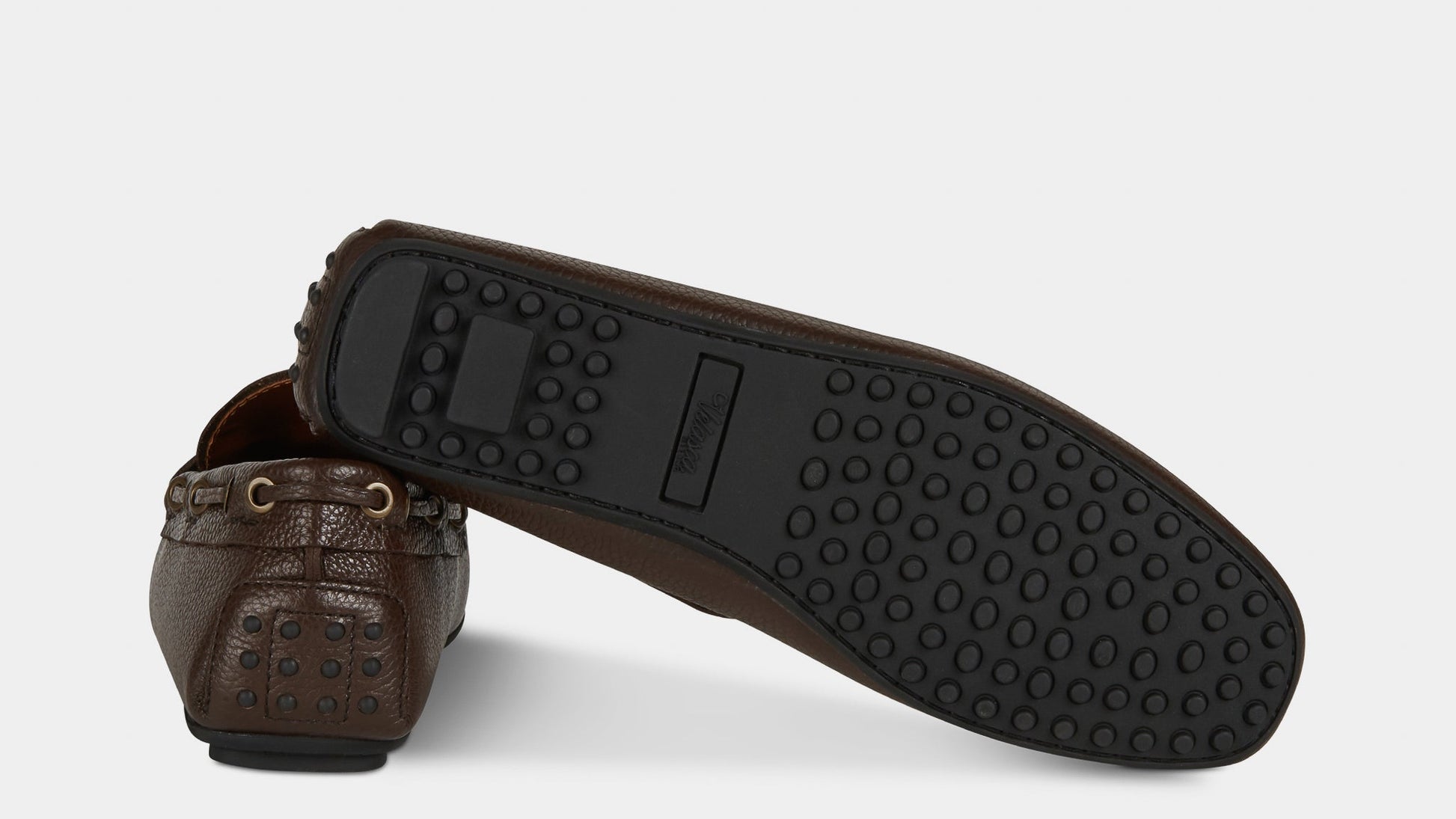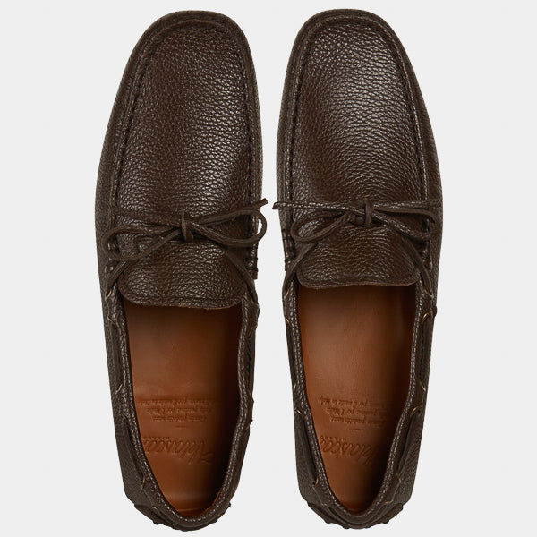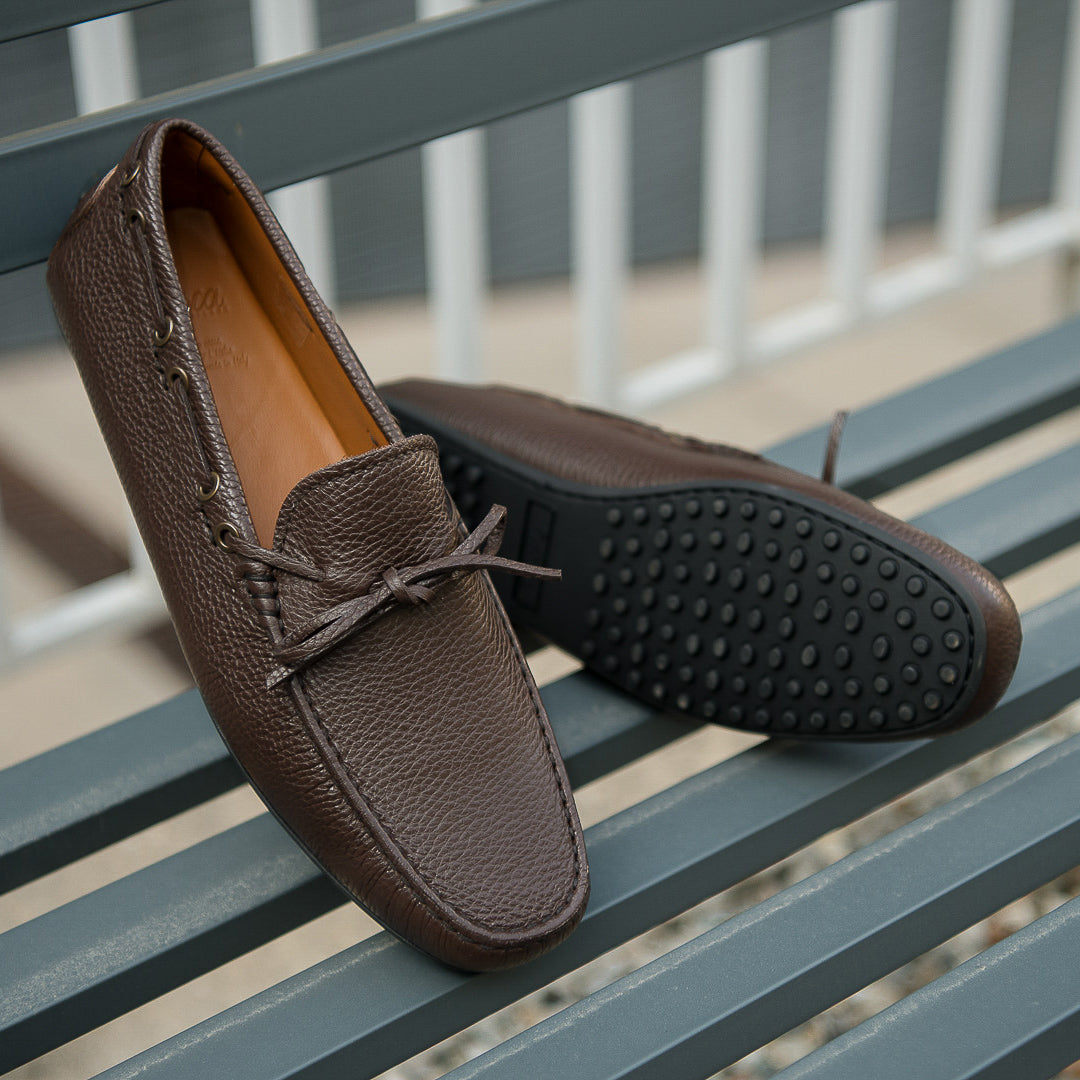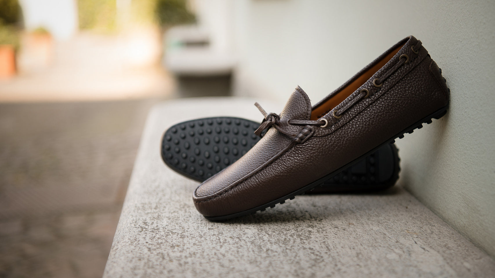There aren't your typical studded-sole Moccasins with laces. Their rubber soles run the whole length of the shoe, making them somewhat solid. We gave them a new soul, but their lines remain iconic: the laces wrap around the foot and fall casually onto the upper. In full grain hammered-effect calfskin, you can wear them with beige trousers and a dark long-sleeved shirt, all in cool linen fabric. Always without socks. Perfect for weekends out of town when days are ever warmer.