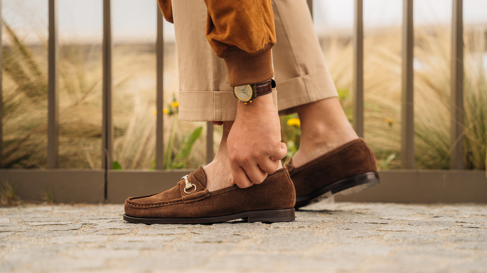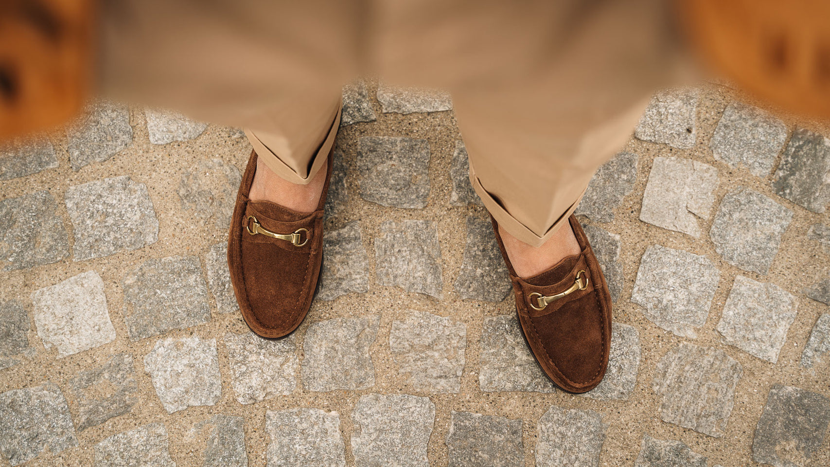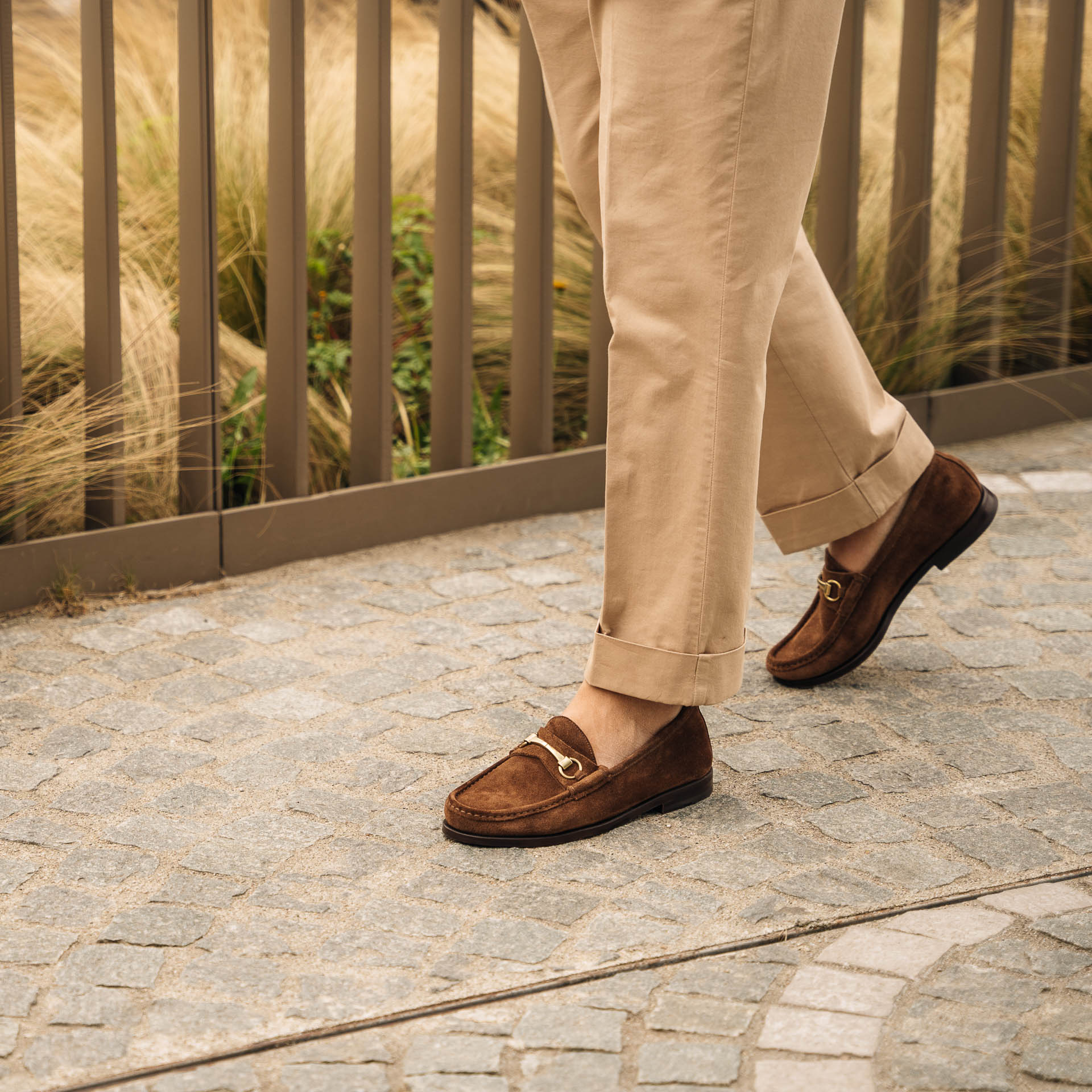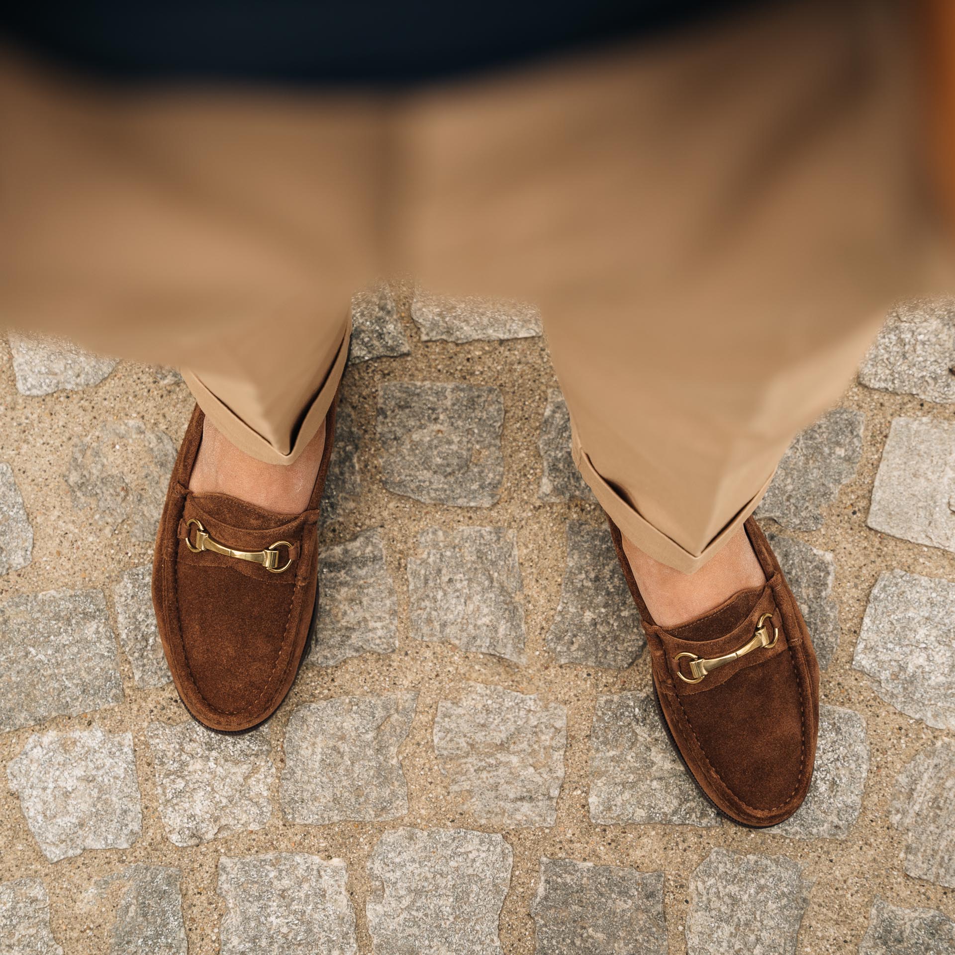 The unlined College is reminiscent of the classic Fifties style, thanks to the horsebit detail applied to the front; this accessory, in brass-coloured electroplating created especially for this model, recalls the Velasca tower in a stylised version - a symbol from Milanese history. In suede calfskin with a light leather sole, you can pair this loafer with a reindeer suède jacket, a khaki T-shirt and beîge cotton trousers with pleats.