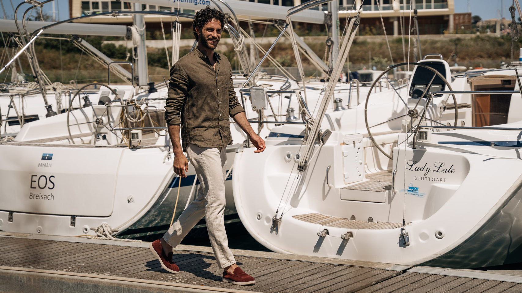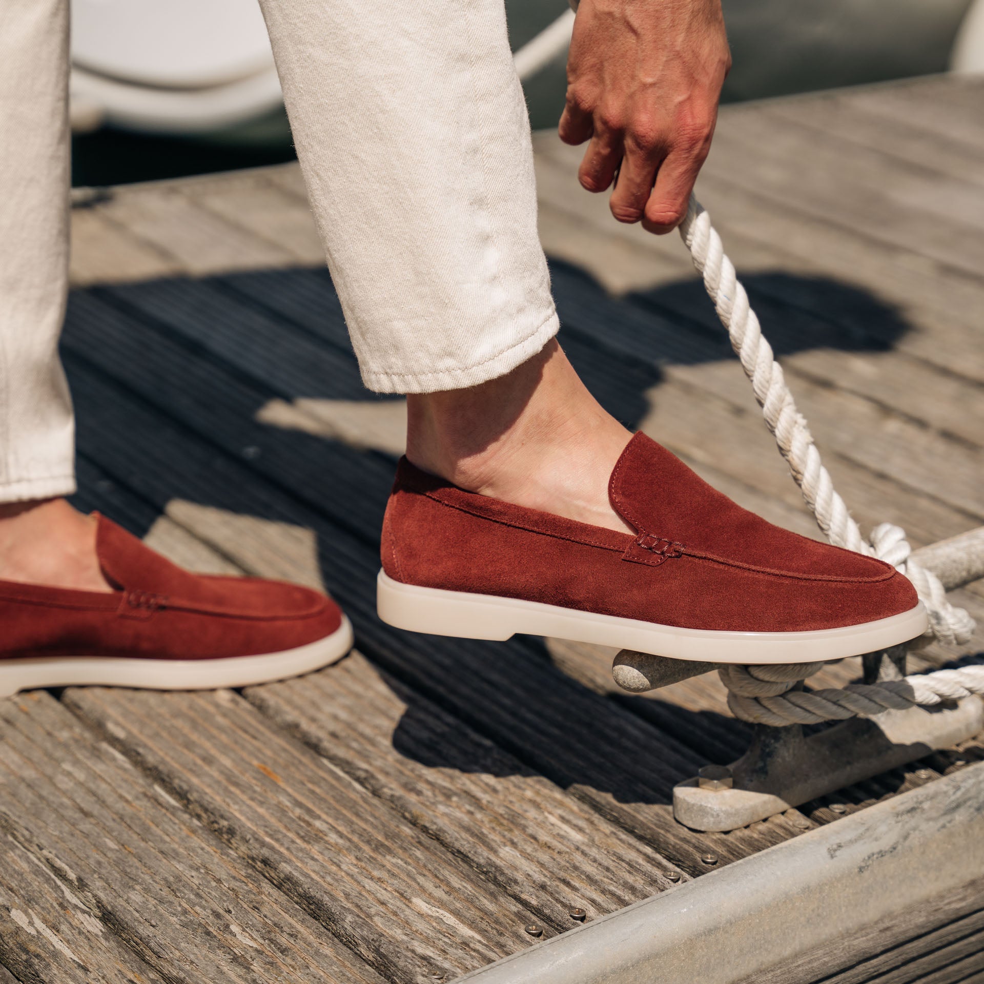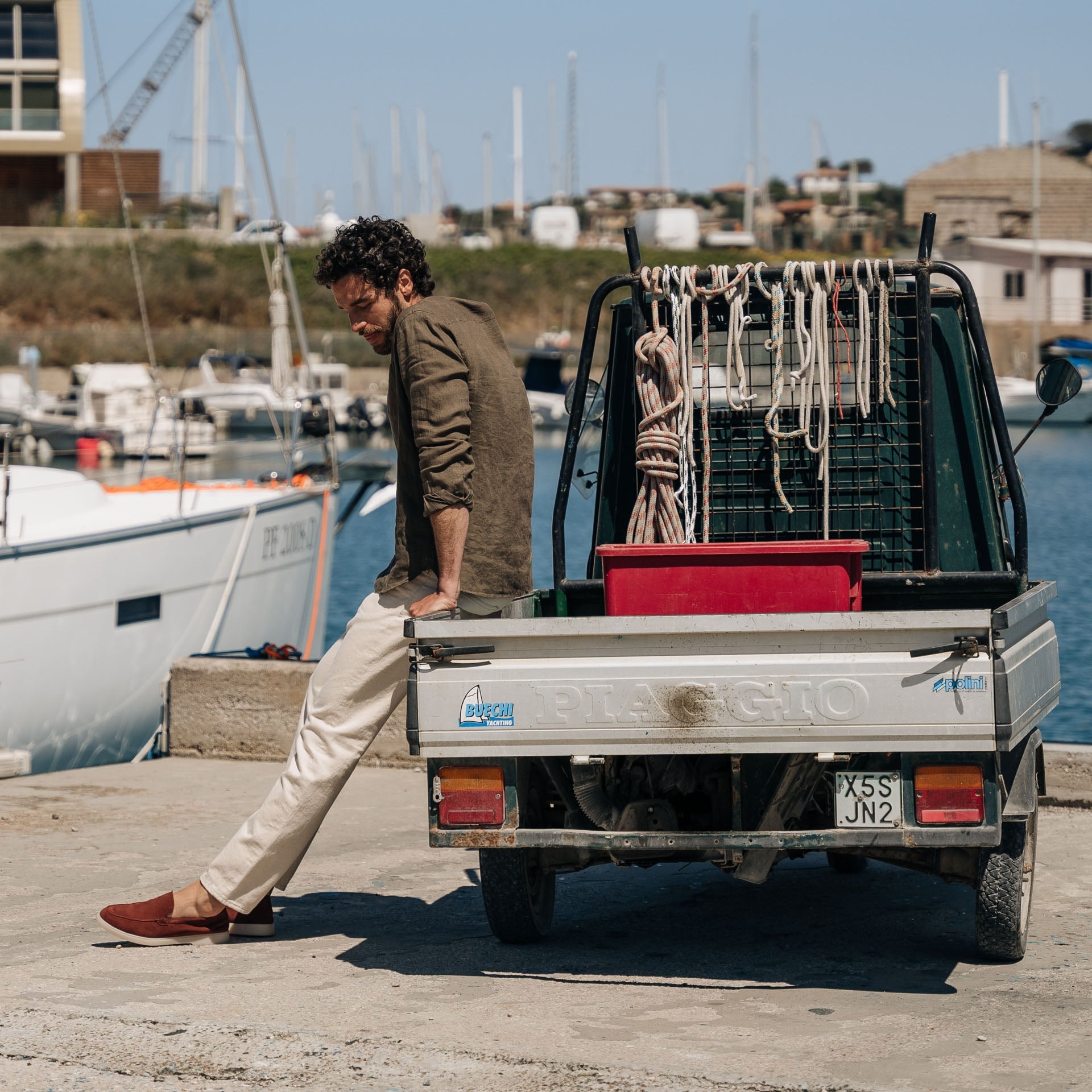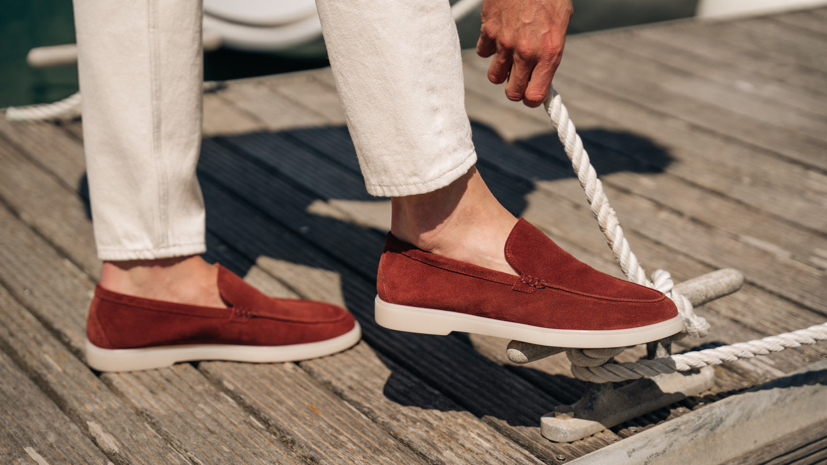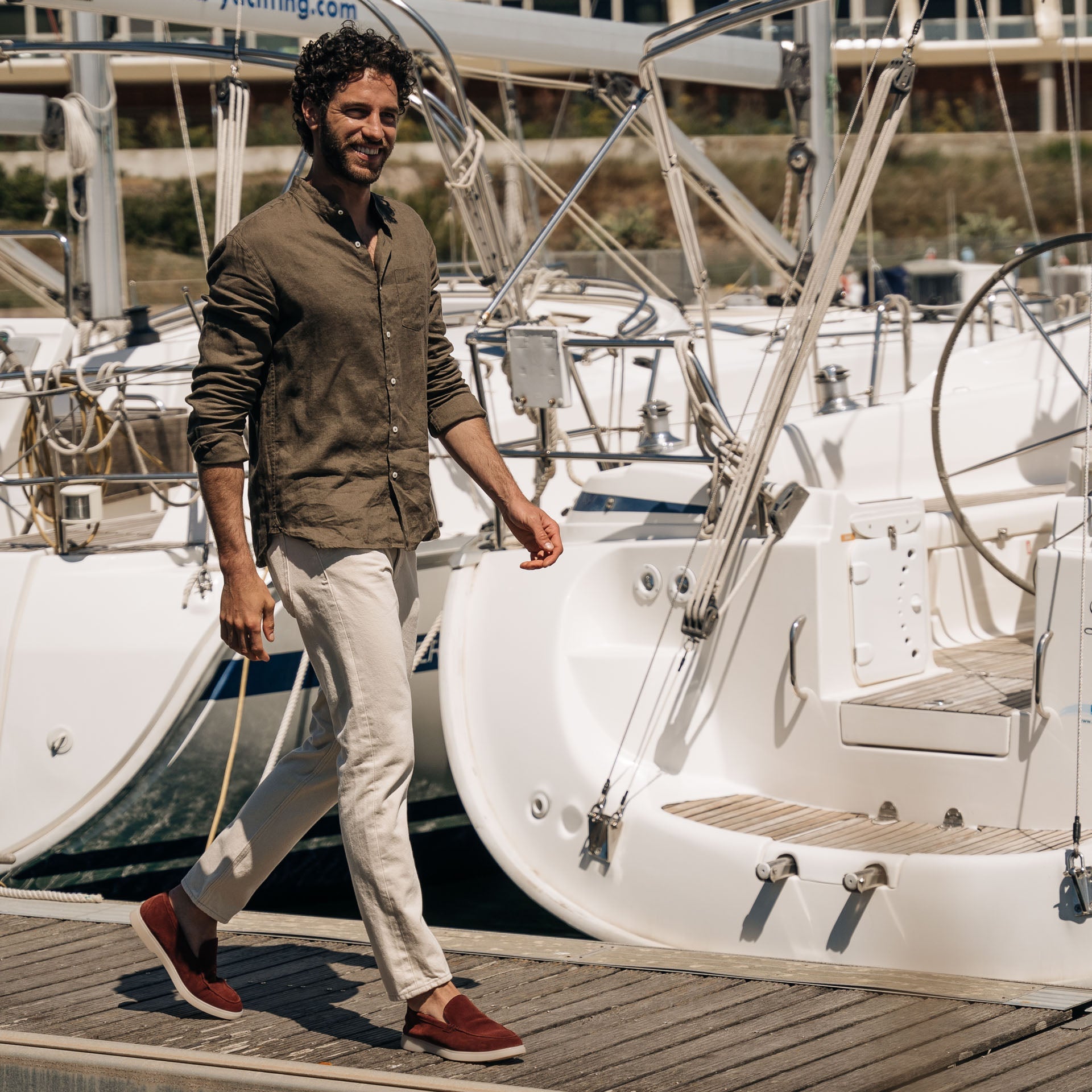 Here is our Docker, halfway between a loafer and a sports shoe: comfortable and practical, but still classy. In suede calfskin with a ridged rubber sole that cushions every step, this shoe should go in your weekend bag along with a green mandarin collar shirt and ecru jeans.