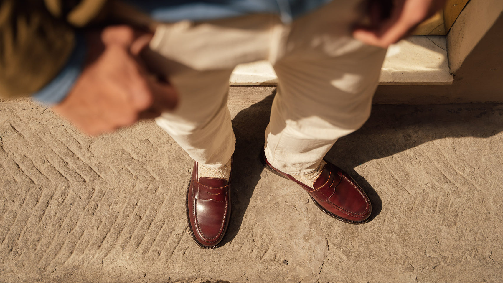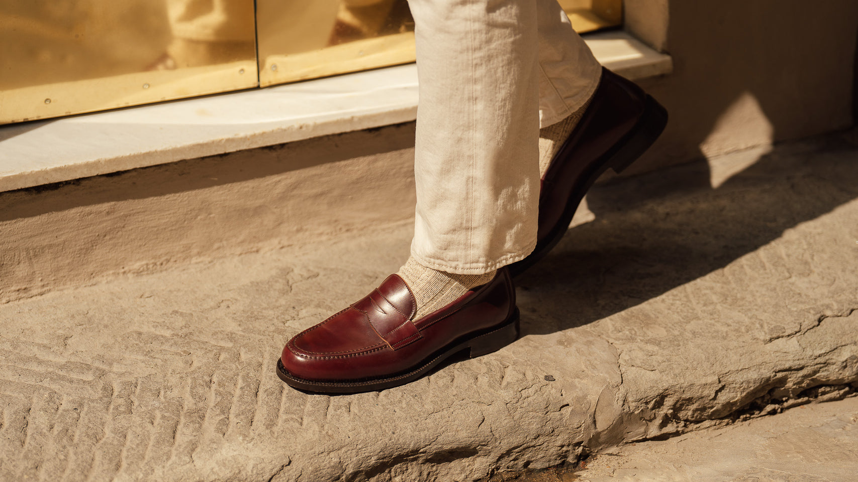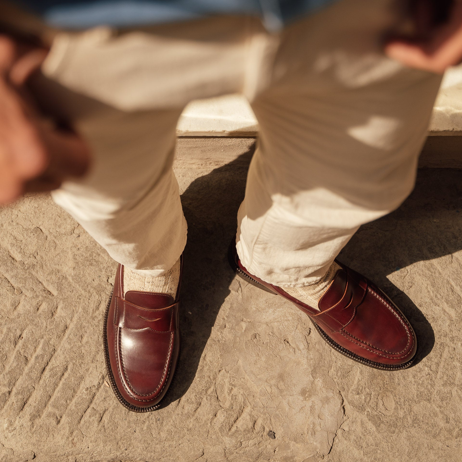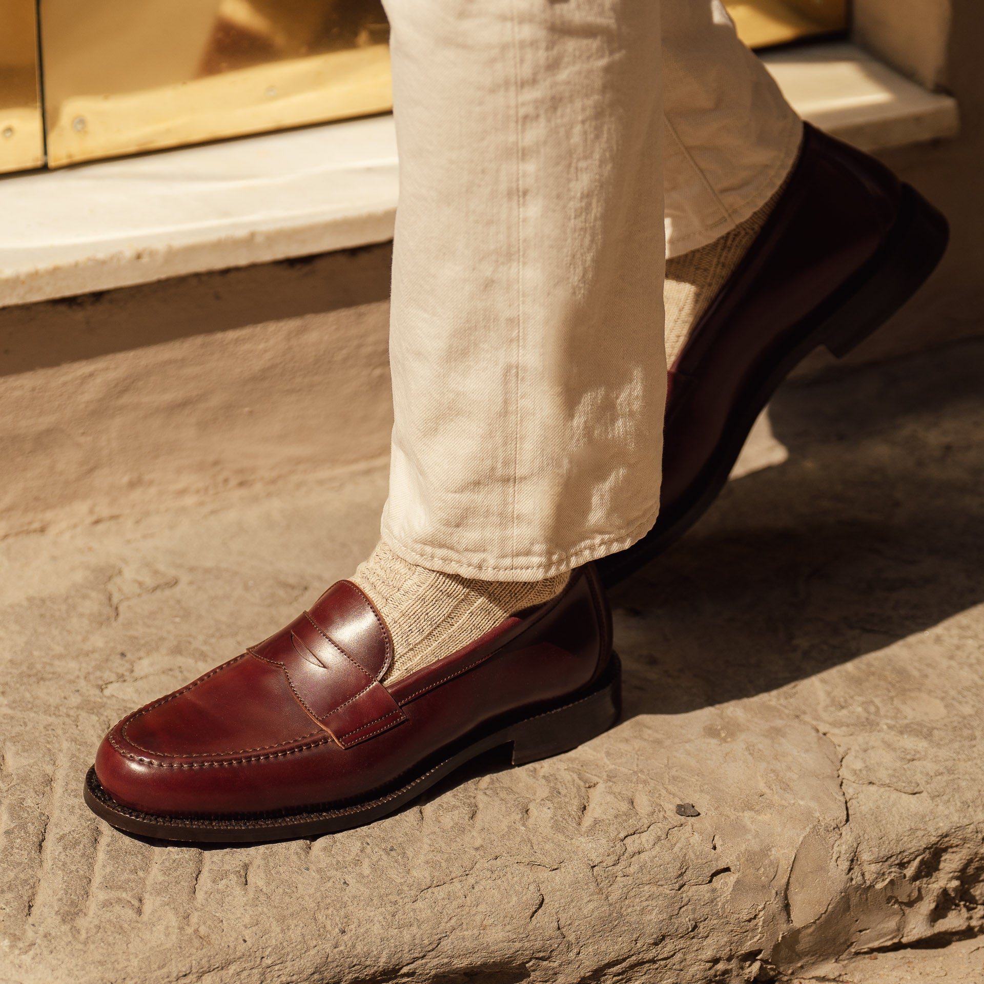 Artisanal Penny Loafers in burgundy cordovan with a waxed leather sole, a timeless classic to stay comfortable all year round. Completed using the Goodyear method, they are made to be long-lasting and durable. The leather is among the finest, requiring slow and precise working techniques, capable of enhancing the raw material. They are made with you in mind; a connoisseur who wants footwear that’s timeless - in all senses of the word.