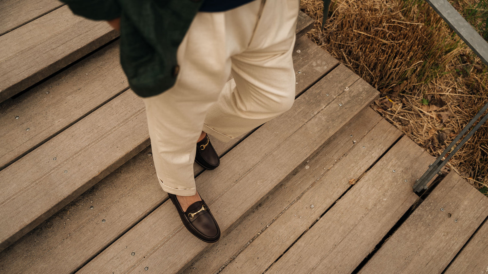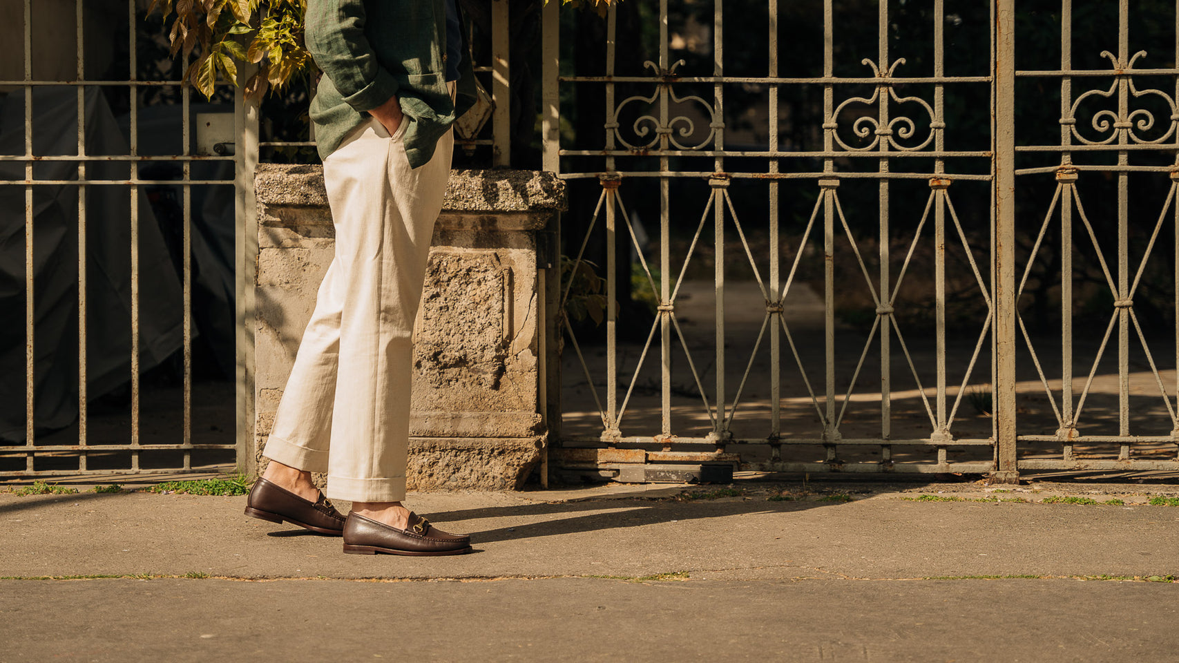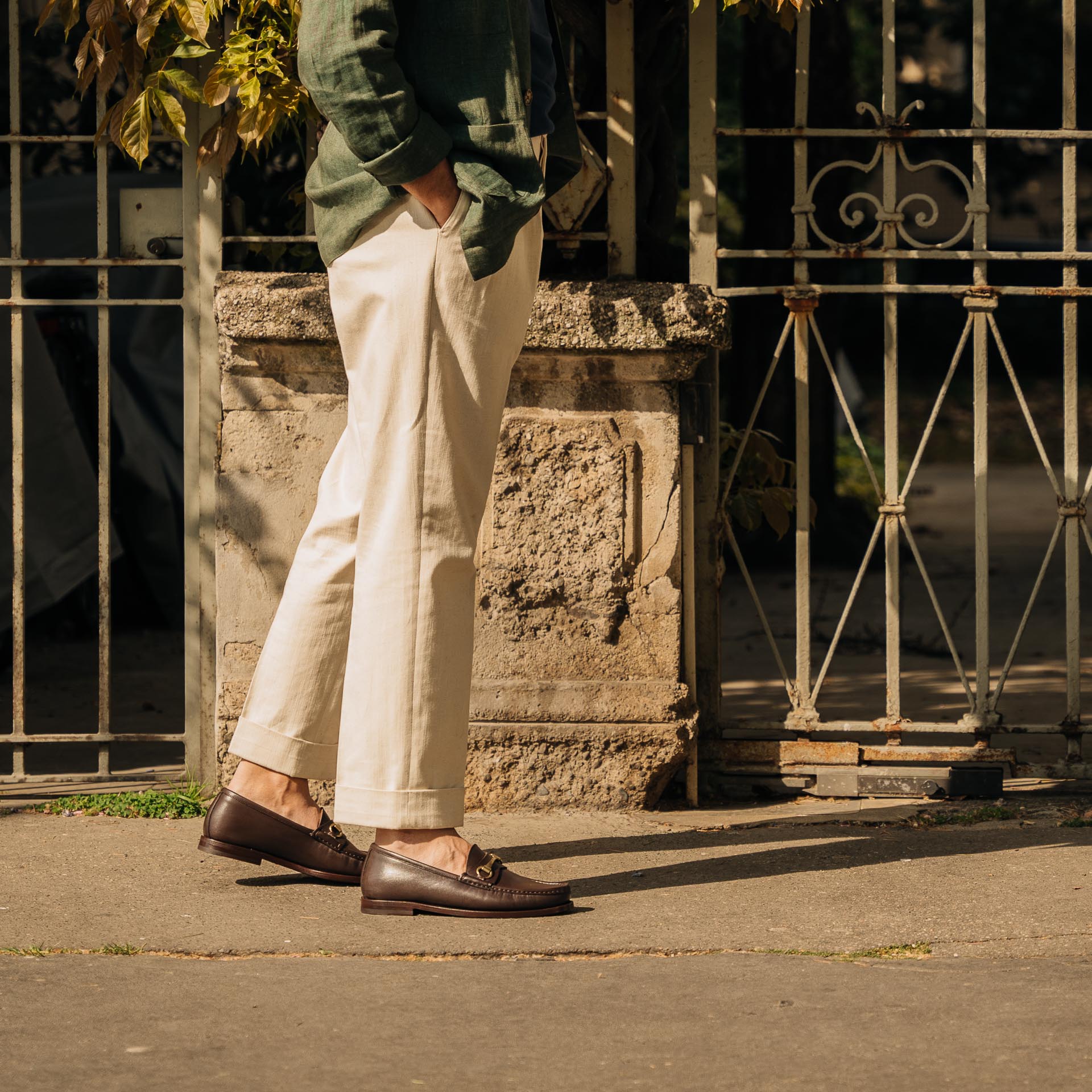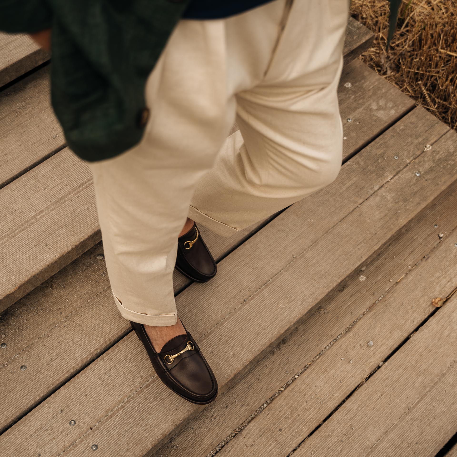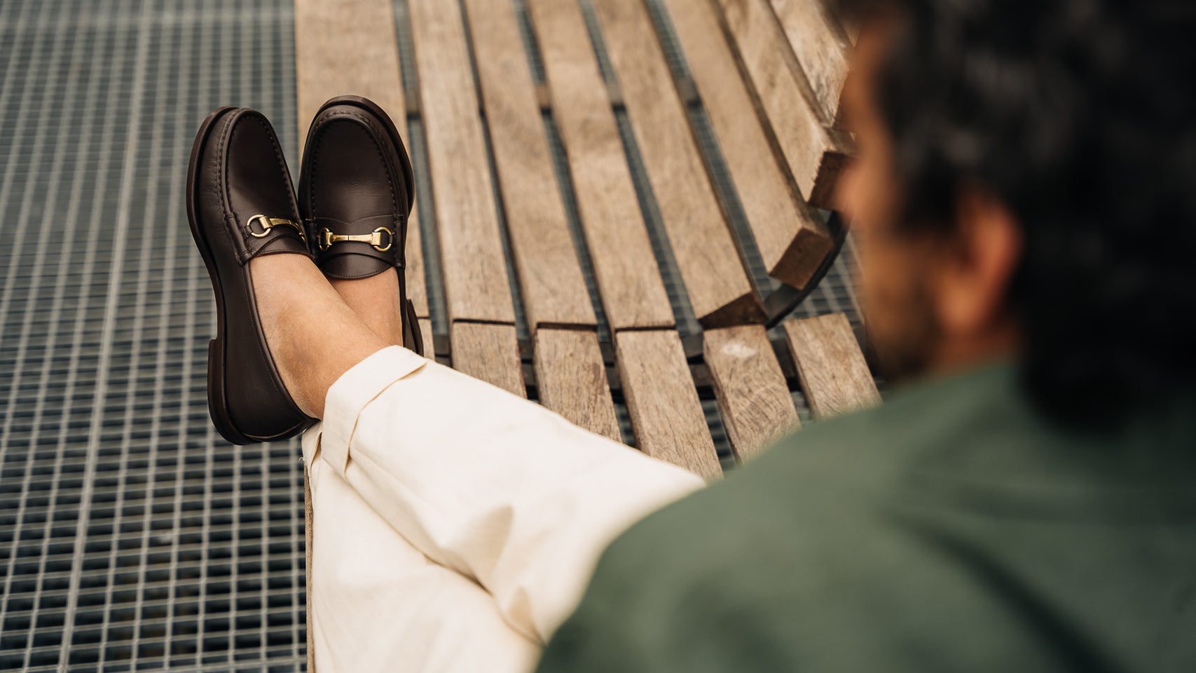 The College is reminiscent of the classic Fifties style, thanks to the horsebit detail applied to the front; this accessory, in brass-coloured electroplating created especially for this model, recalls the Velasca tower in a stylised version - a symbol from Milanese history. In hammered calfskin, with leather lining and a light leather sole, you can pair this loafer with a green safari jacket, a blue T-shirt and cream cotton and linen trousers.