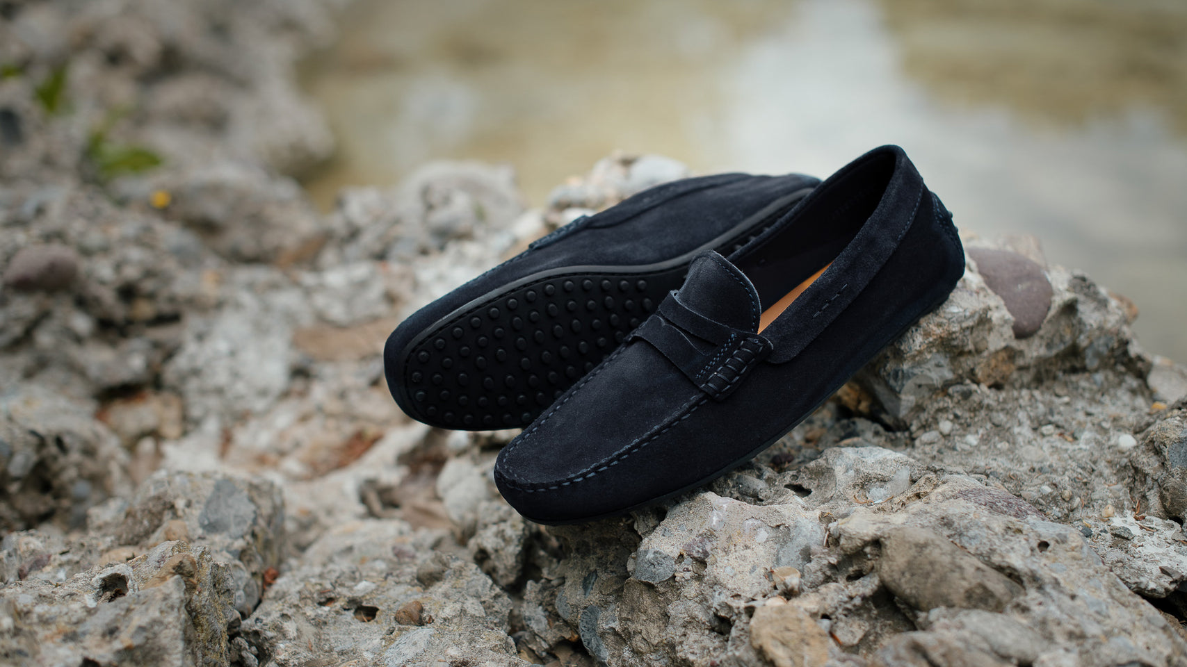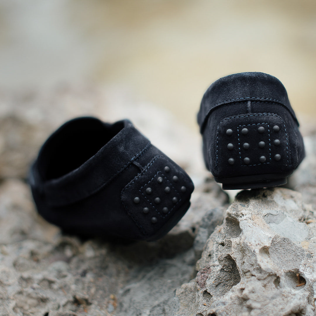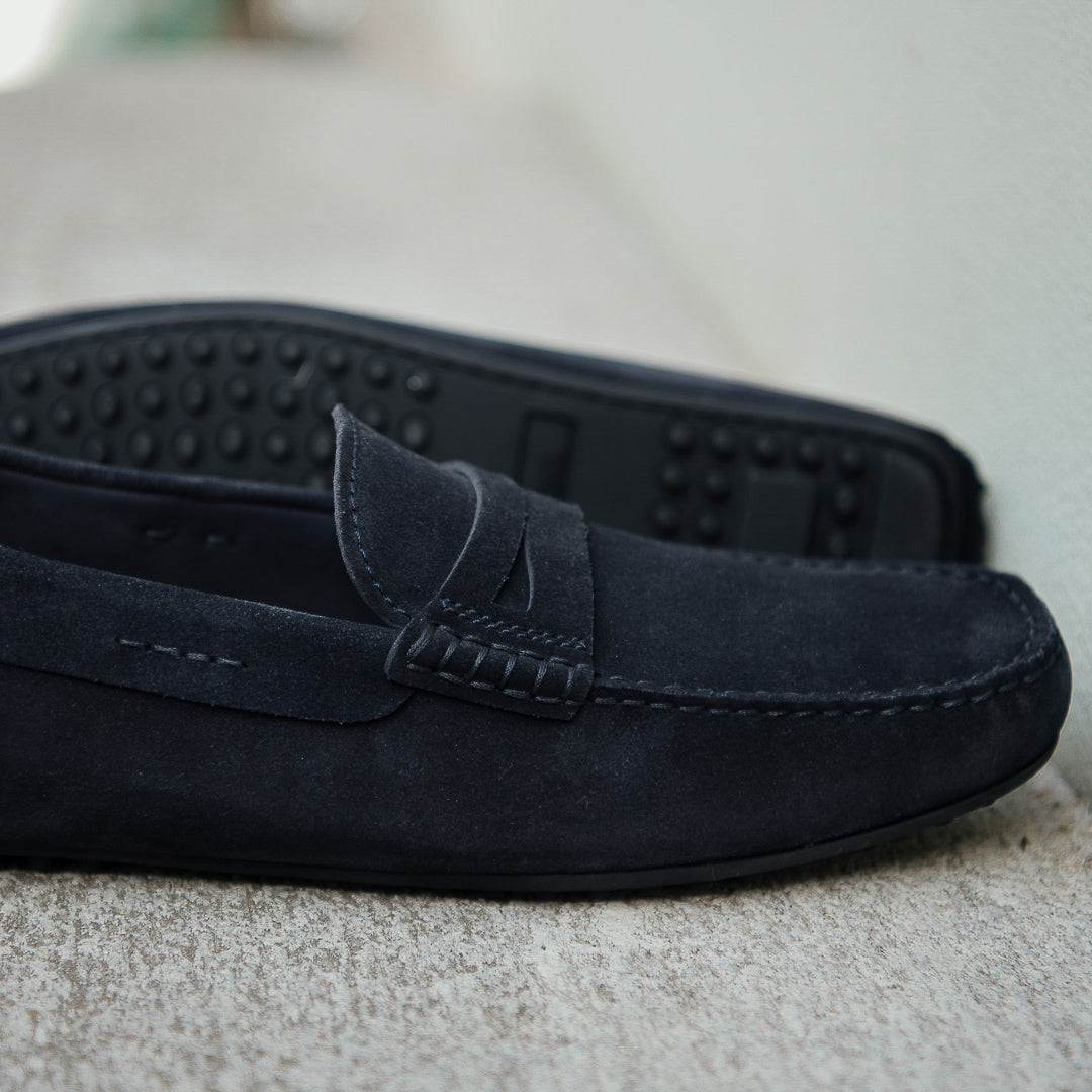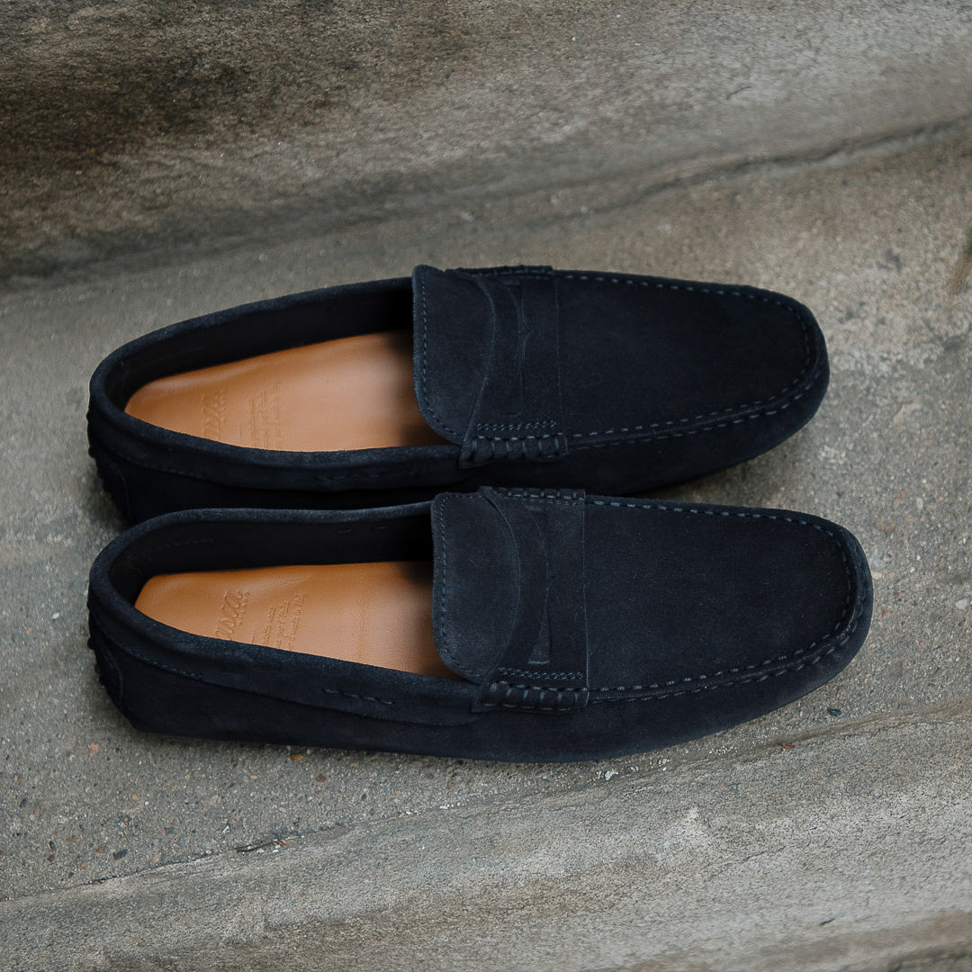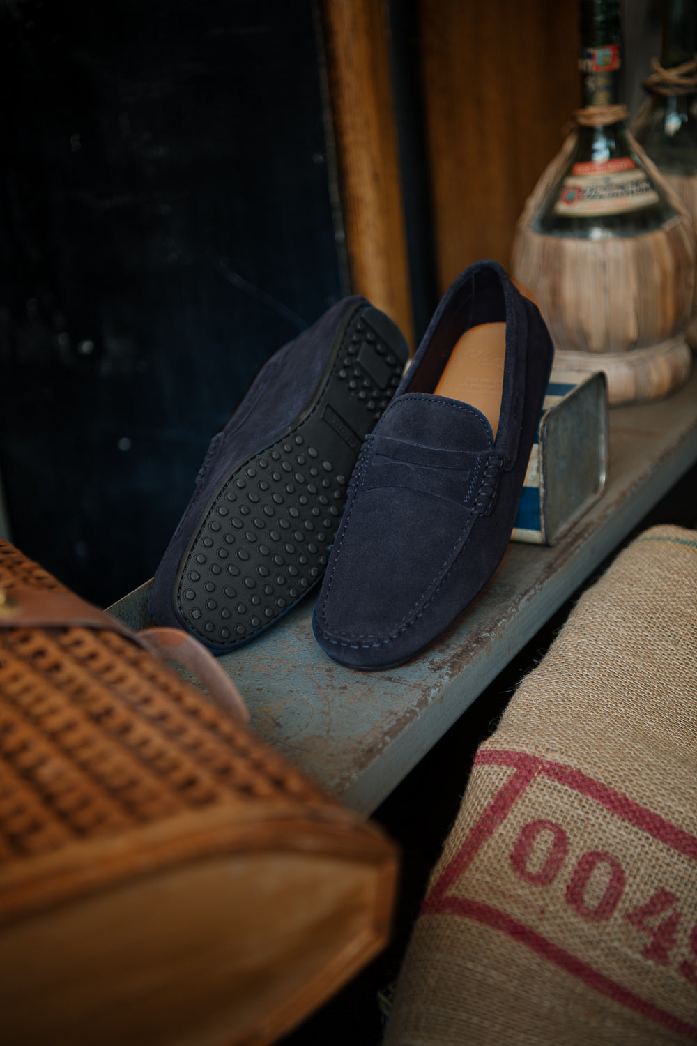 There aren't your typical studded-sole Moccasins. Their rubber soles run the whole length of the shoe, making them somewhat solid. We gave them a new soul, but their lines remain iconic. In suede calfskin, the casual character of these blue moccasins goes perfectly with chinos or jeans and your favourite t-shirt. Always without socks. Perfect for weekends out of town when days are ever warmer.