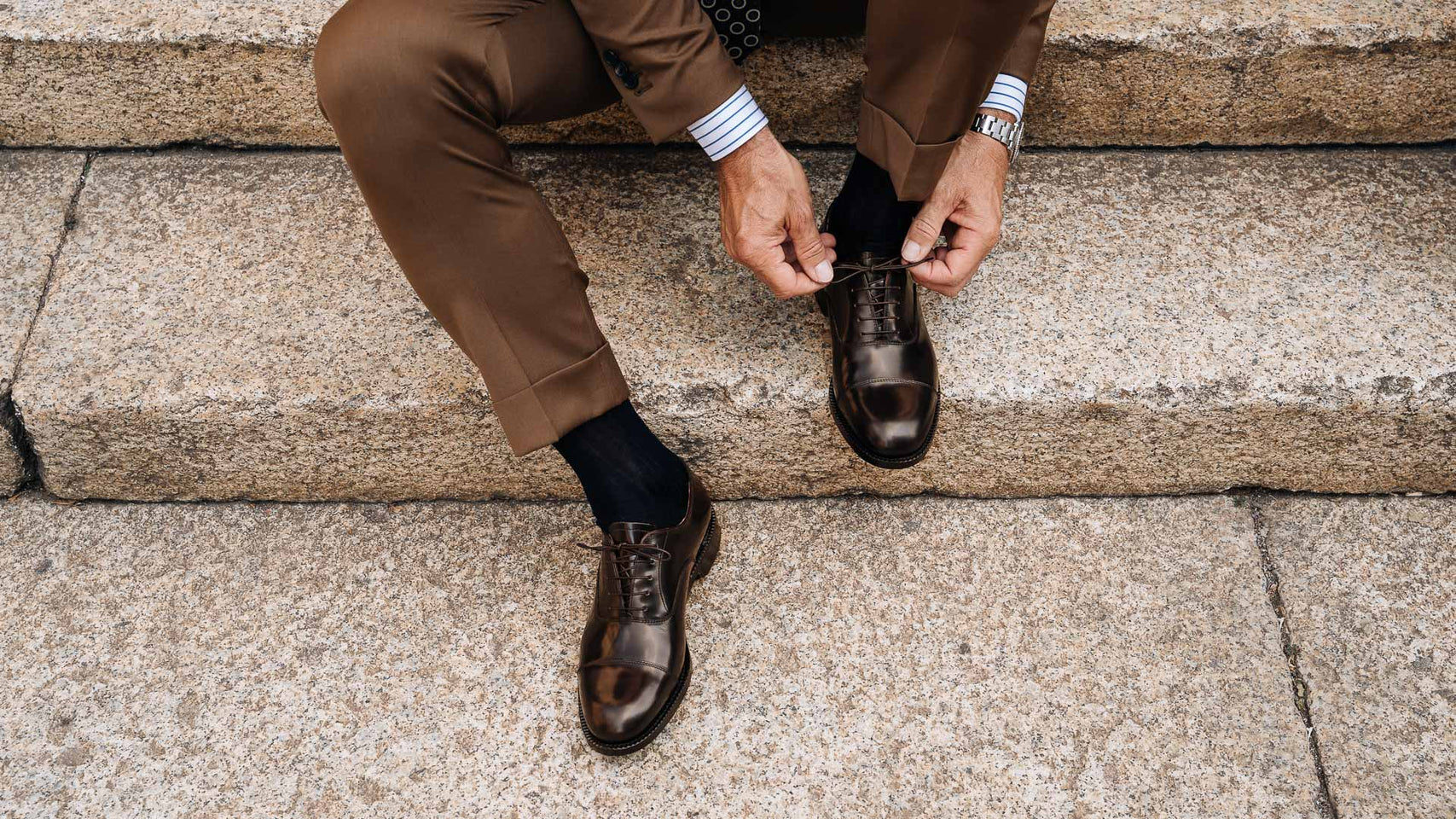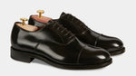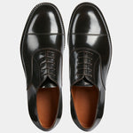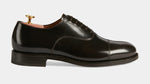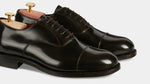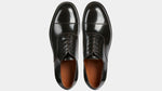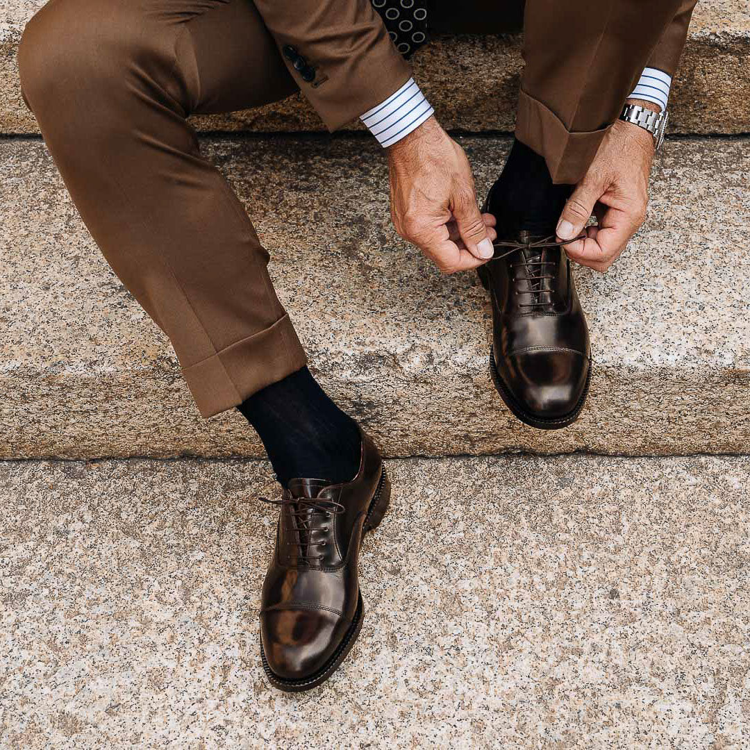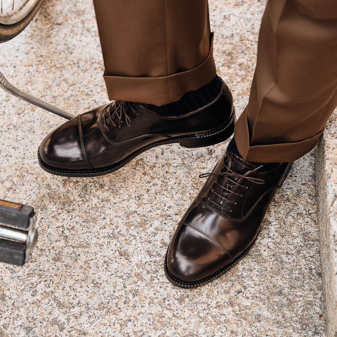 You would recognise these Oxfords anywhere: Goodyear welting. In brushed smooth calf leather, leather sole and with a light punched detail around the toe, it is designed to last over time: the traditional "welt" stitching makes the shoes both resistant and easy to resole. The cork layer between the insole and the sole welcomes your foot: the more you wear them, the more they fit. Wear them with a caramel coloured fresh woollen suit: high-waisted trousers and double dart, a striped shirt and a printed silk tie.
