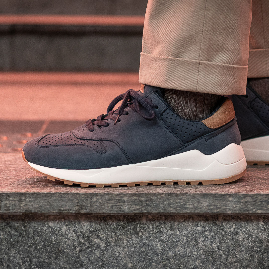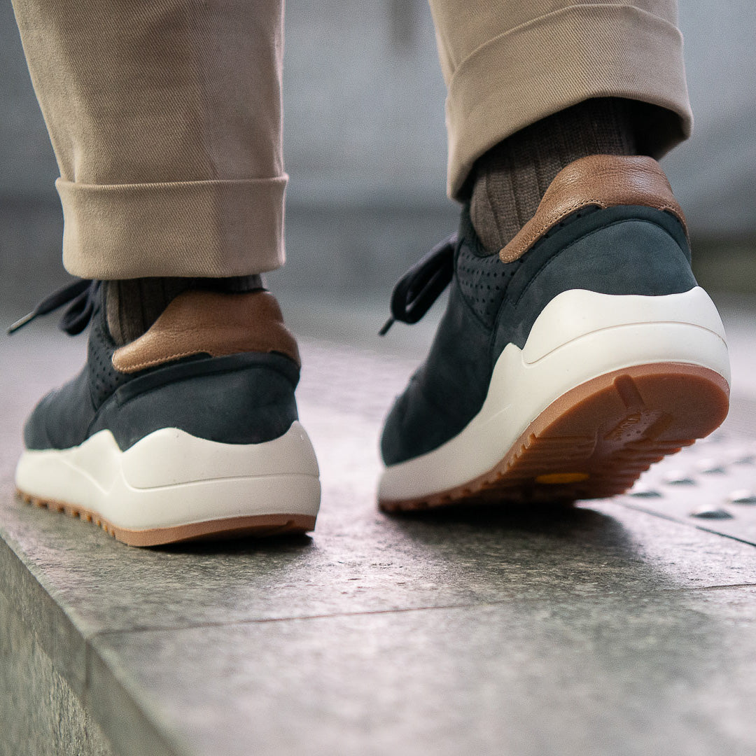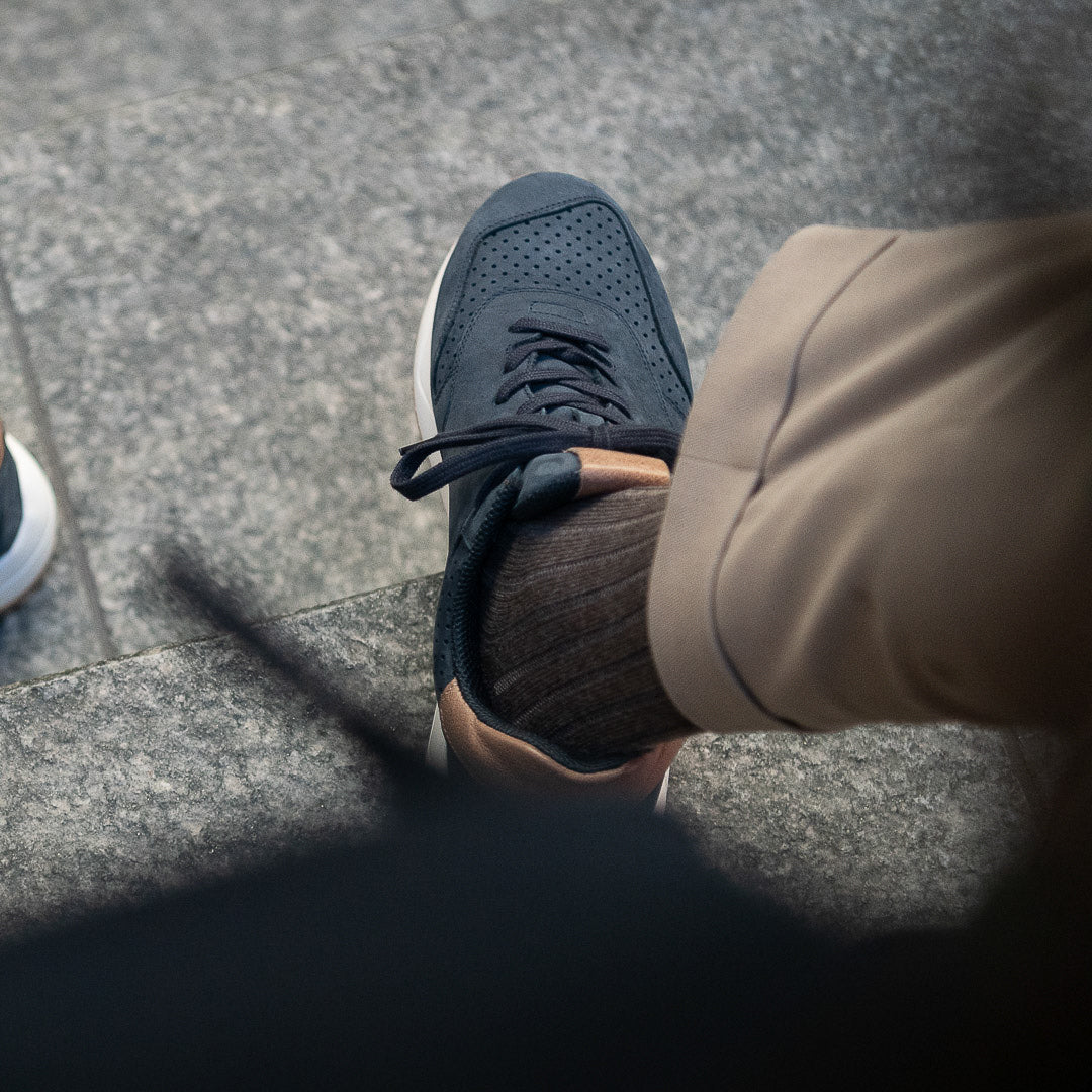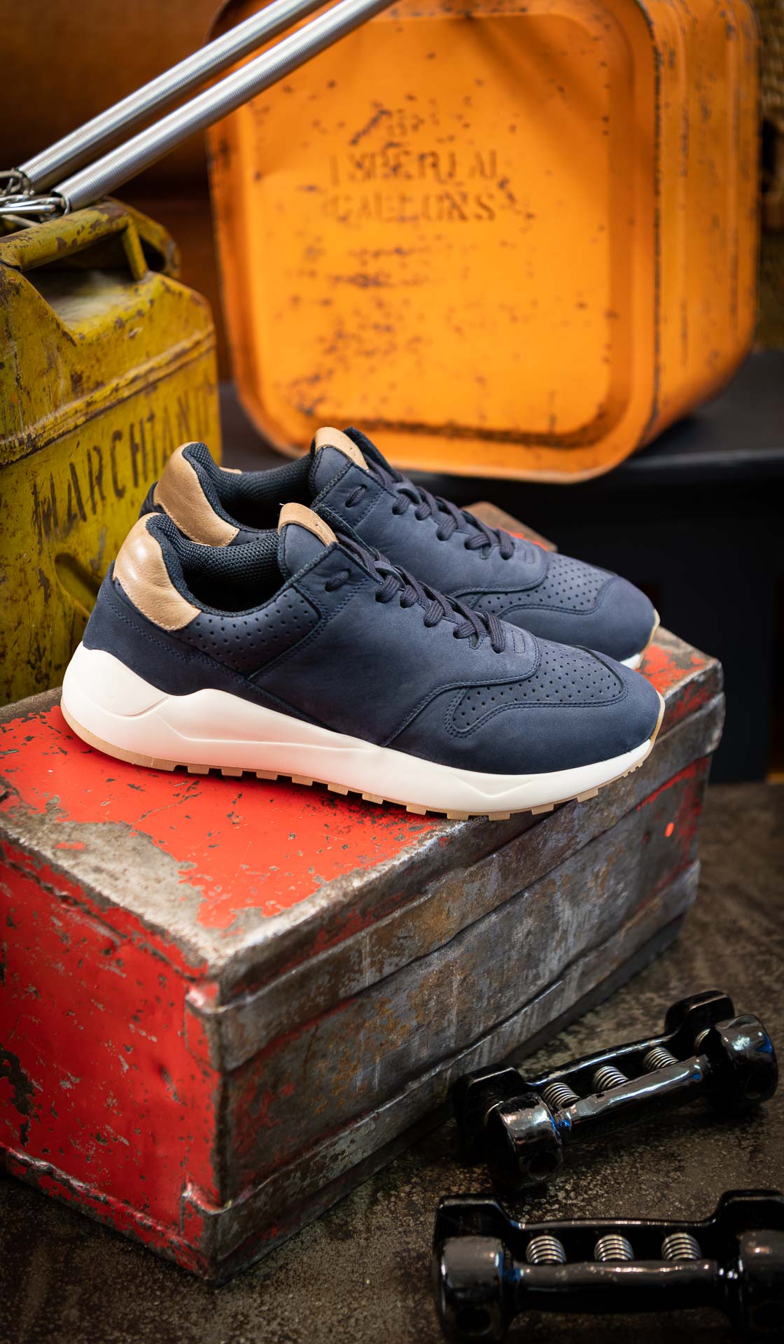 Our Running shoes in blue navy nubuck leather with Vibram rubber outsole. For your sporty – or simply more casual – days. Inside, we've lined them in microfiber to make them breathable and we've inserted a cushioned insole: it's removable, you can wash it easily. Wear your Running shoes with one of our dark grey mélange socks, a green shirt and a blue peacoat, or take them with you in the practical sackpack included in the shoebox.