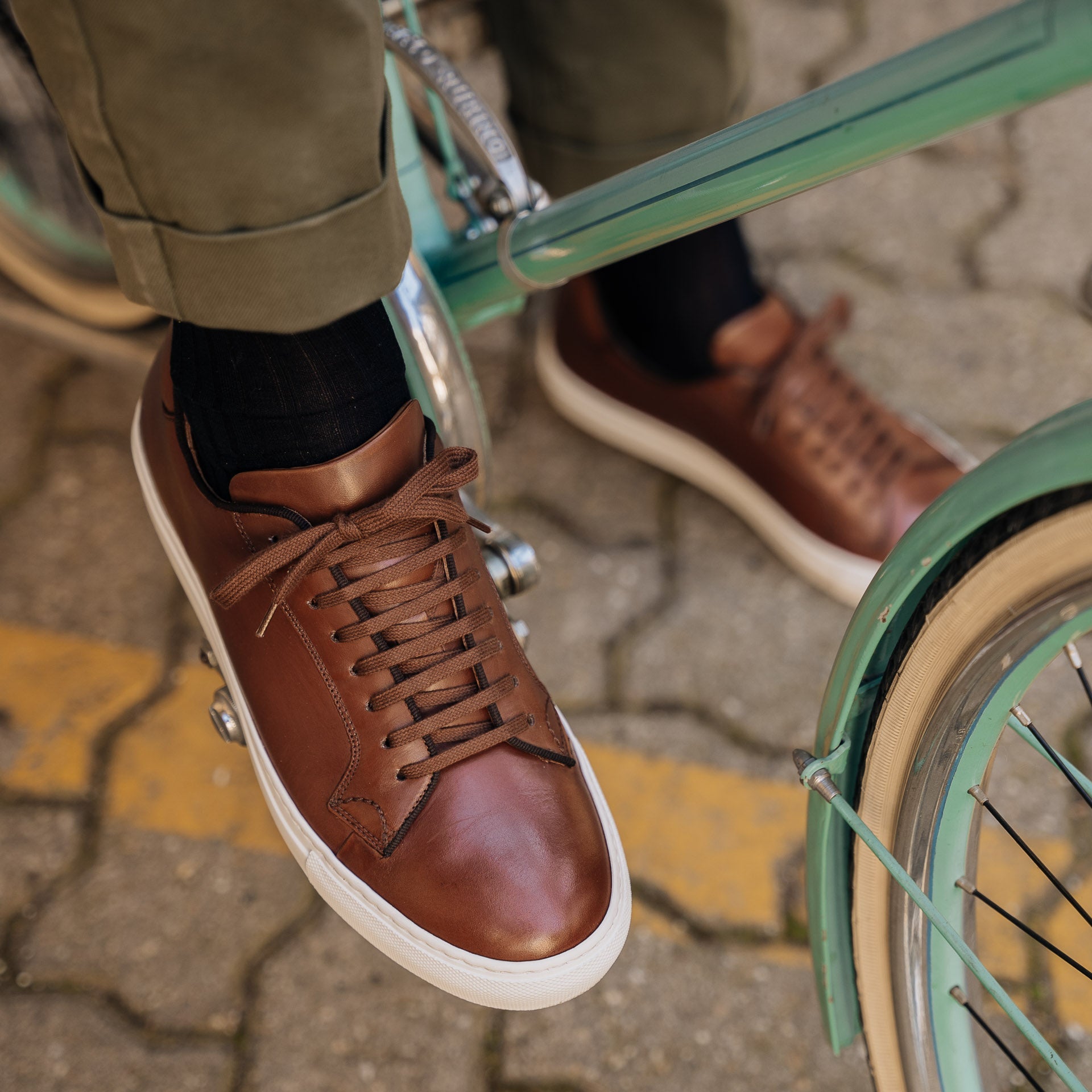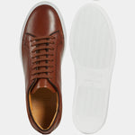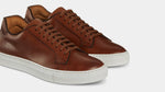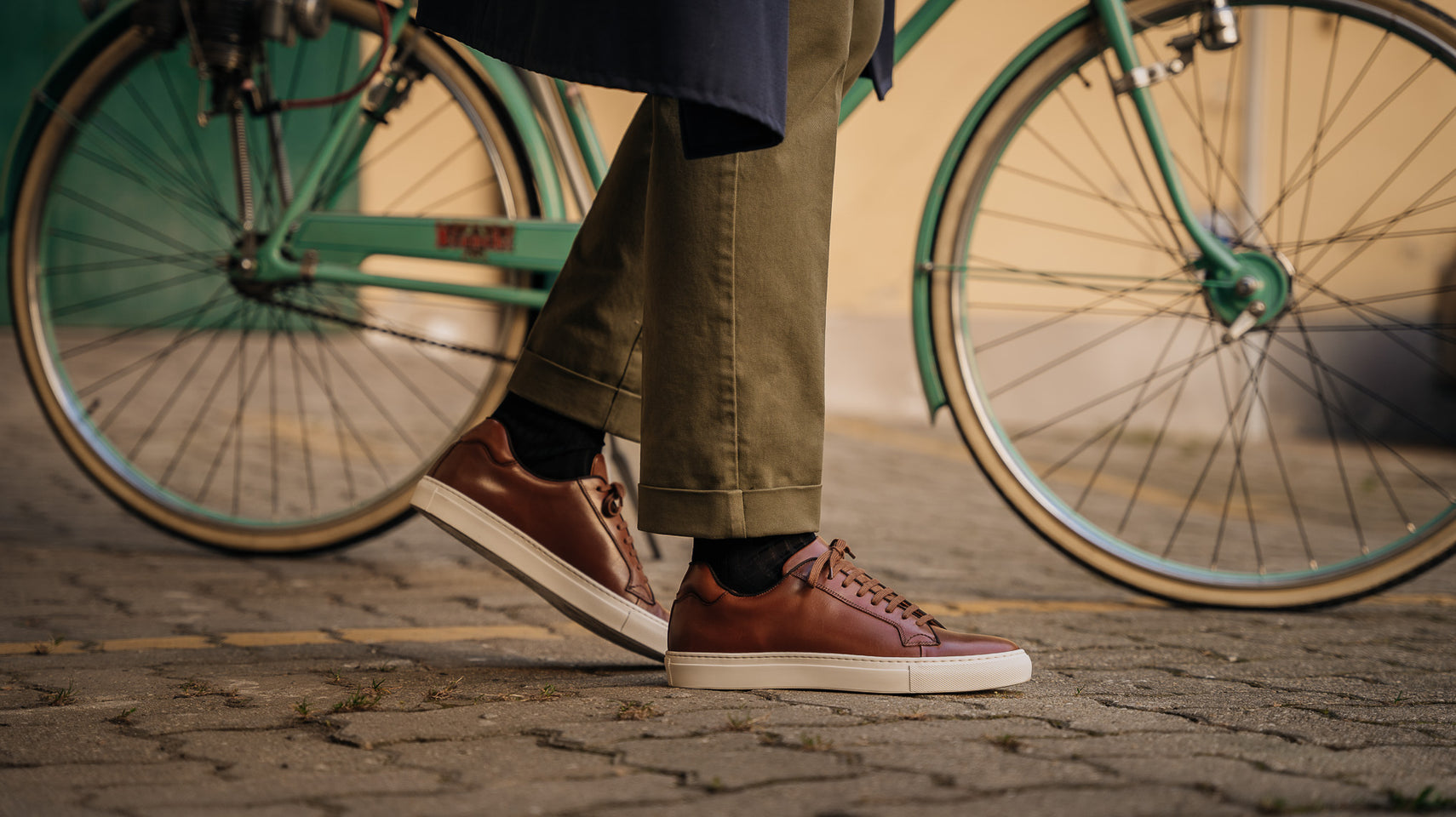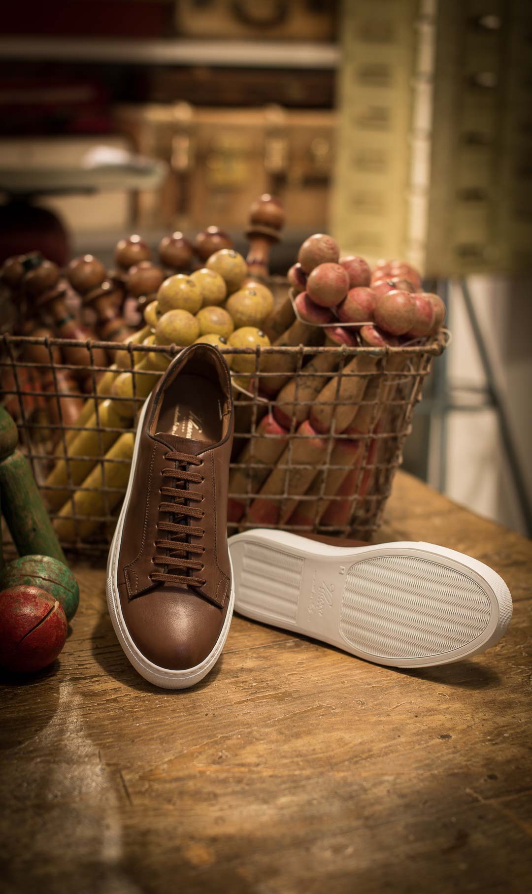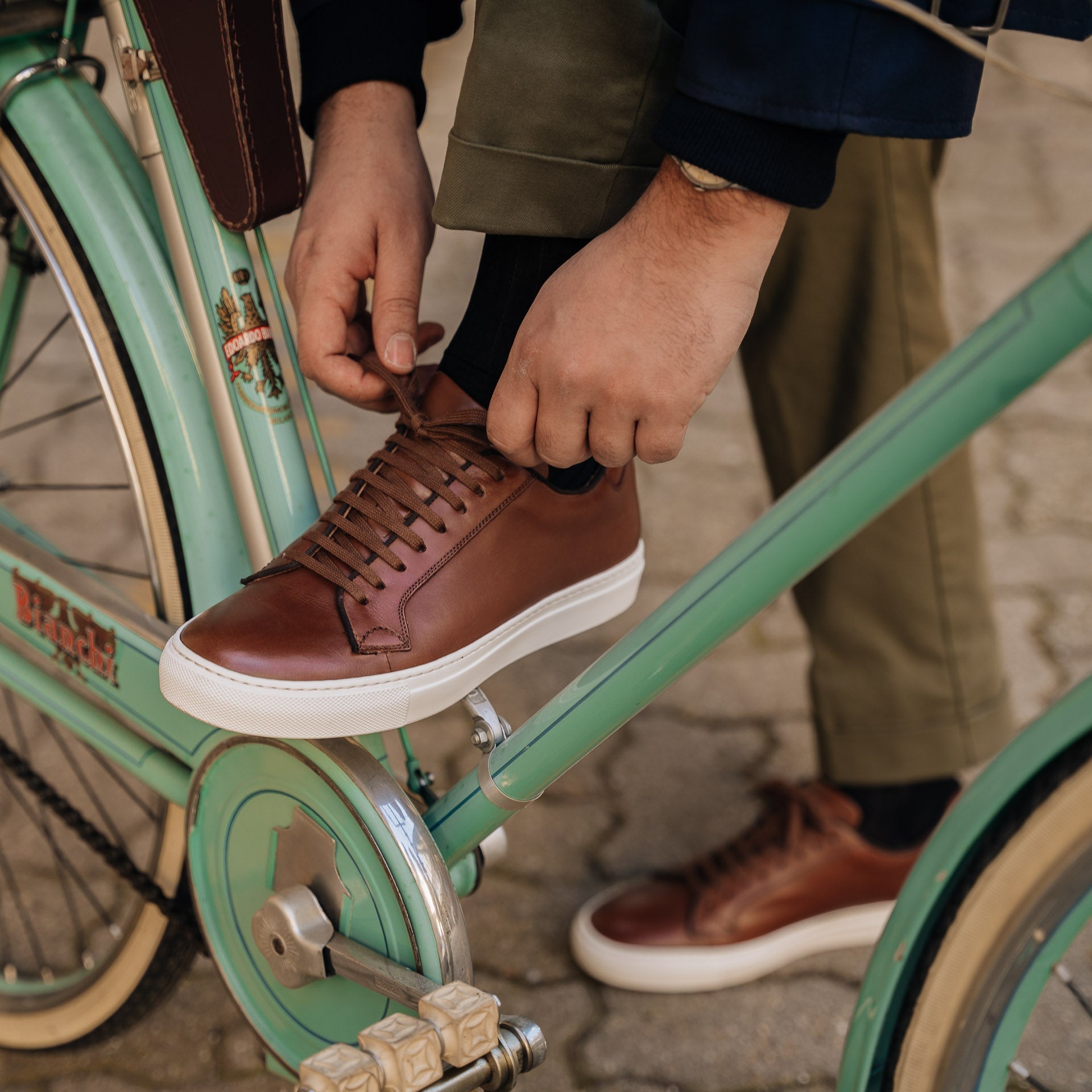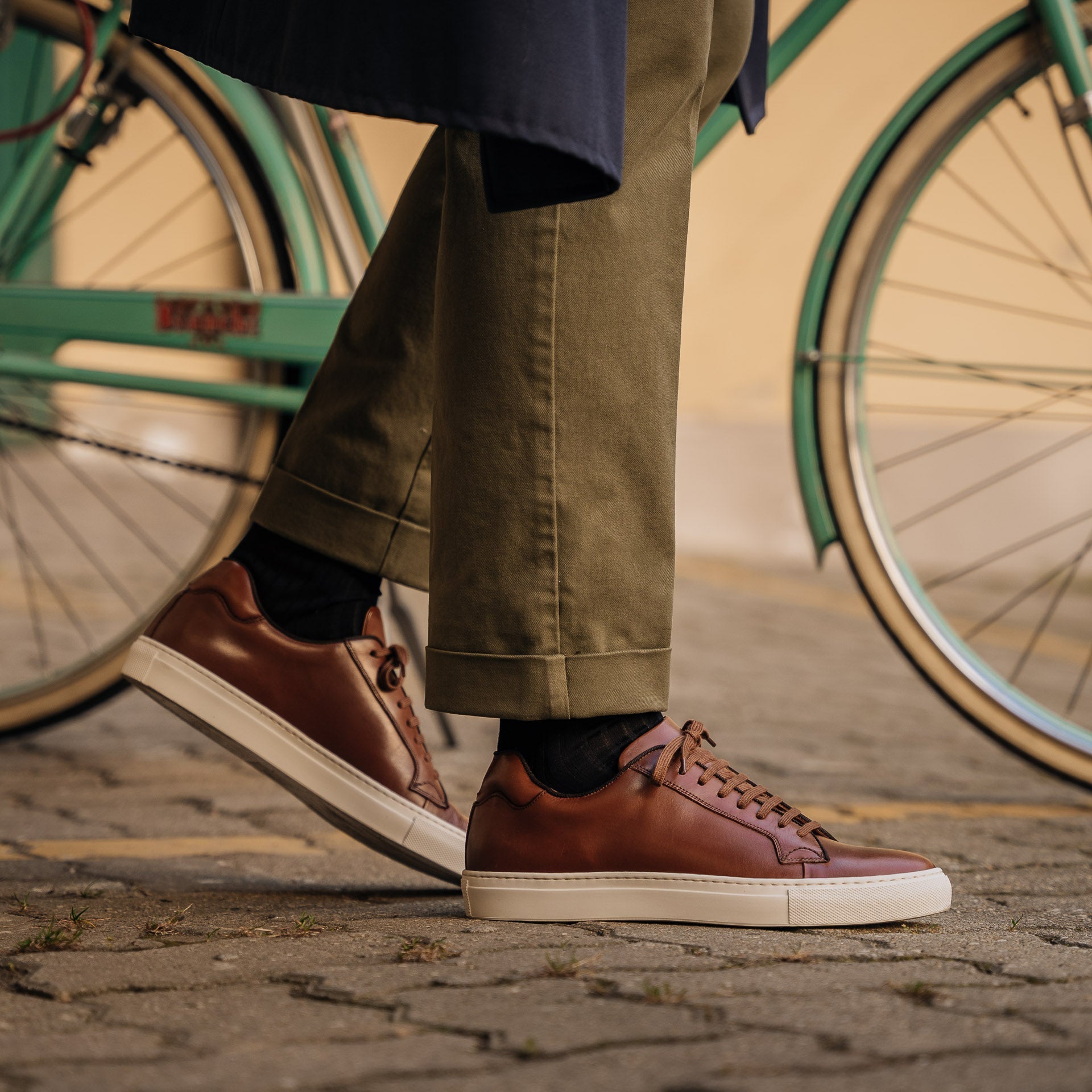 Sneakers with elegant lines and a slightly vintage feel. Made from smooth calfskin leather with a rubber sole, they make your sportswear outfits impeccable and your days in a suit memorable. We wore them with a blue mackintosh in a slightly retro shape, a denim shirt and chinos.